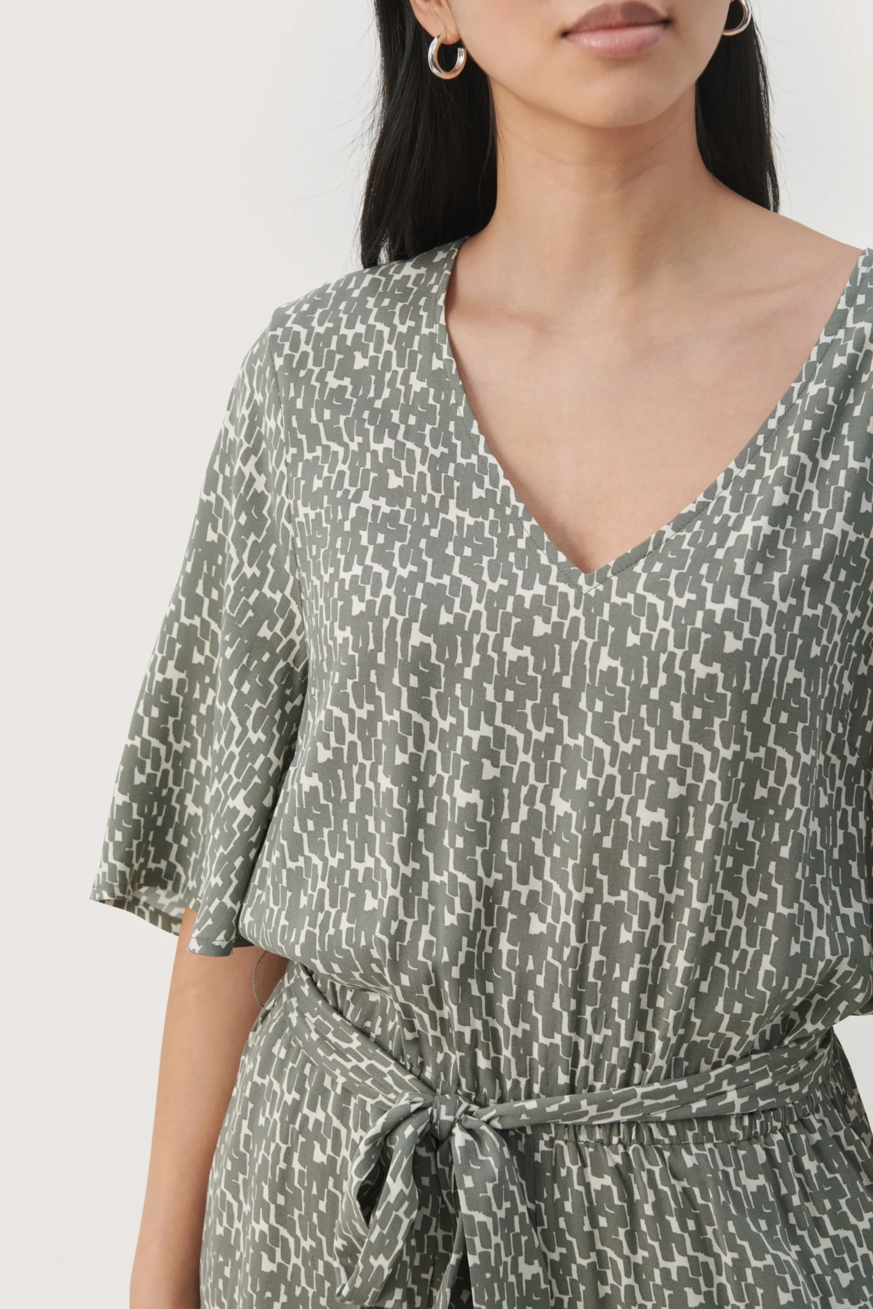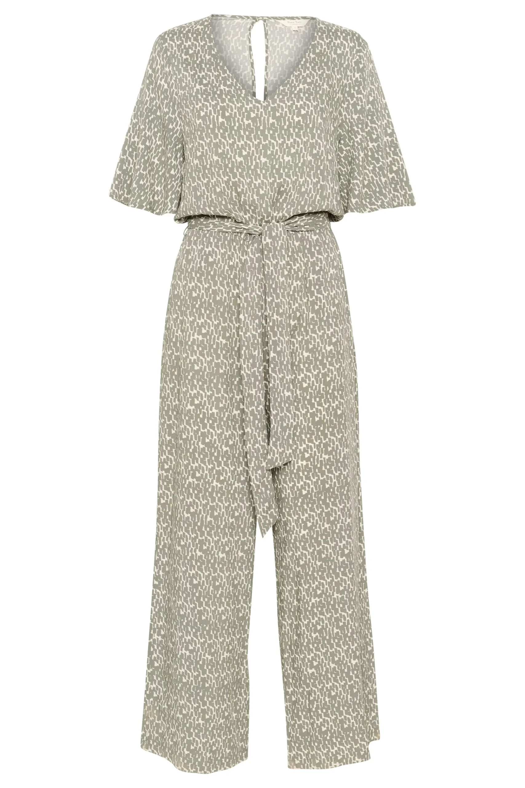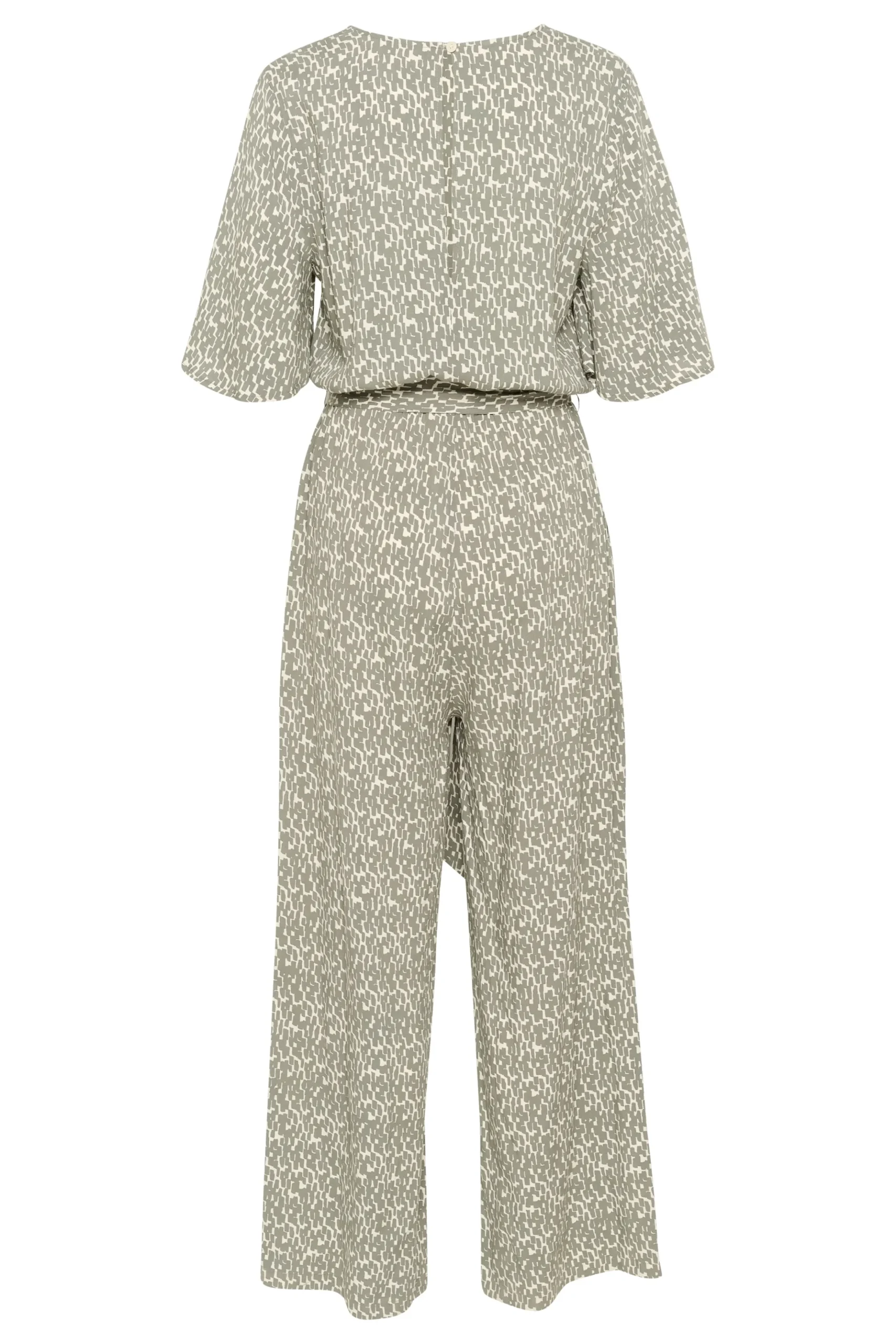 Modellen er 174 cm høj og er iført en størrelse 36.\\n\\nDenne alsidige buksedragt er designet med en afslappet pasform, som tilbyder en ubesværet silhuet. Den har en flatterende V-hals, korte ærmer og en talje med snøre. Fremstillet i et let og åndbart materiale, er den perfekt til både formelle og casual anledninger.
