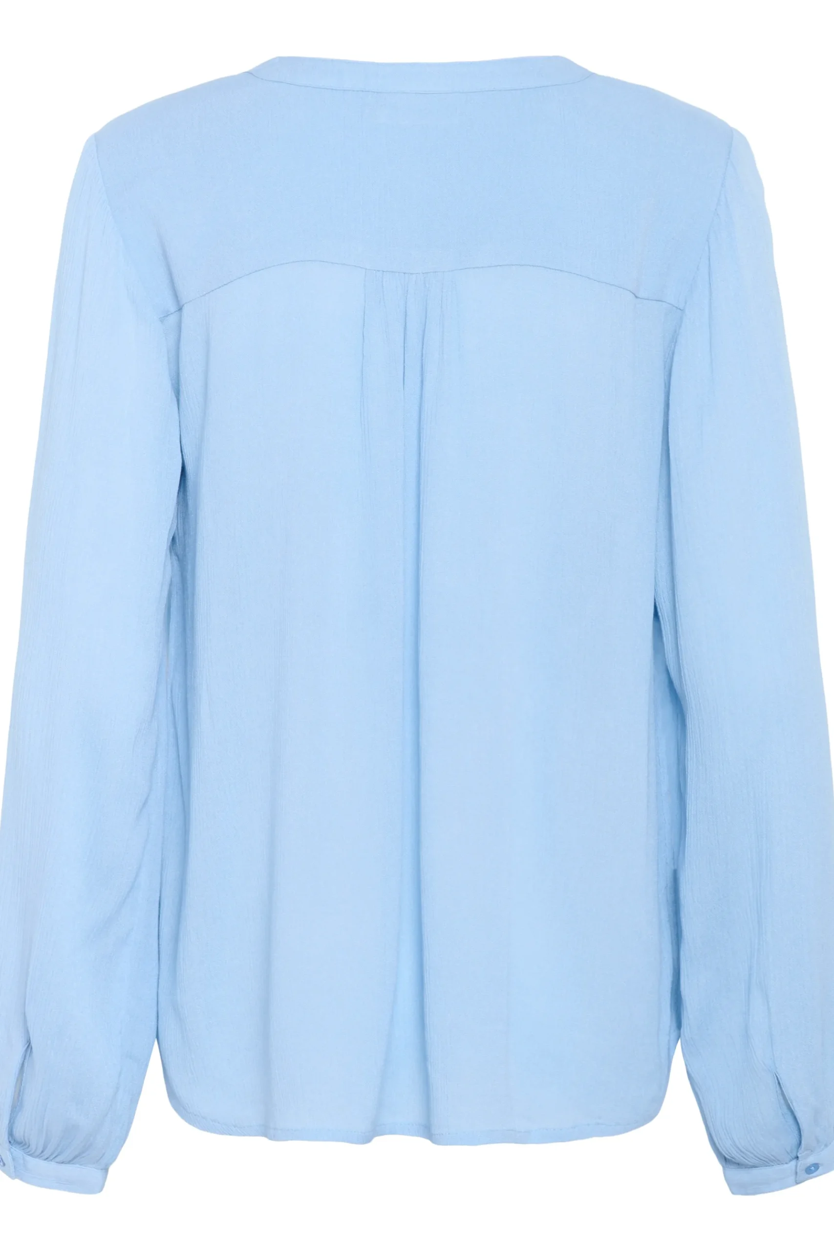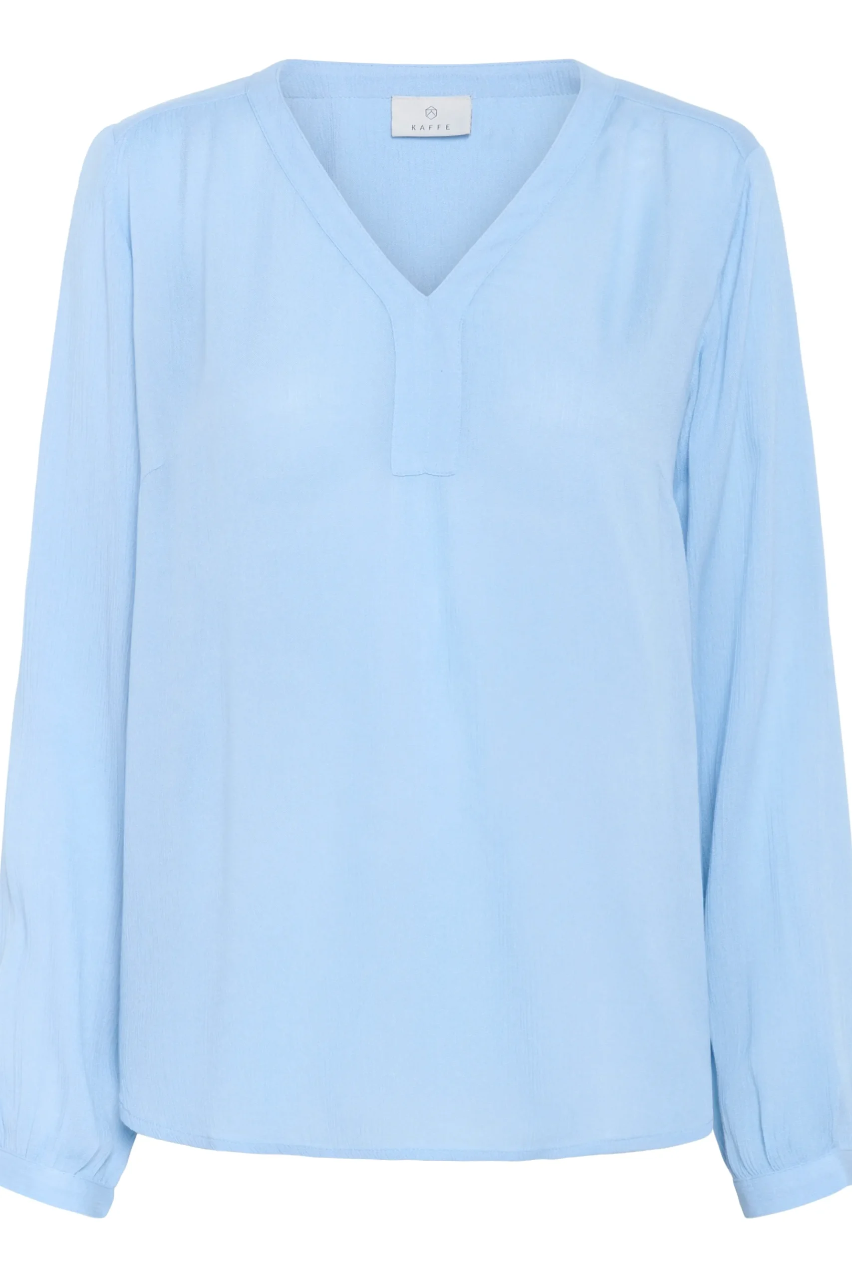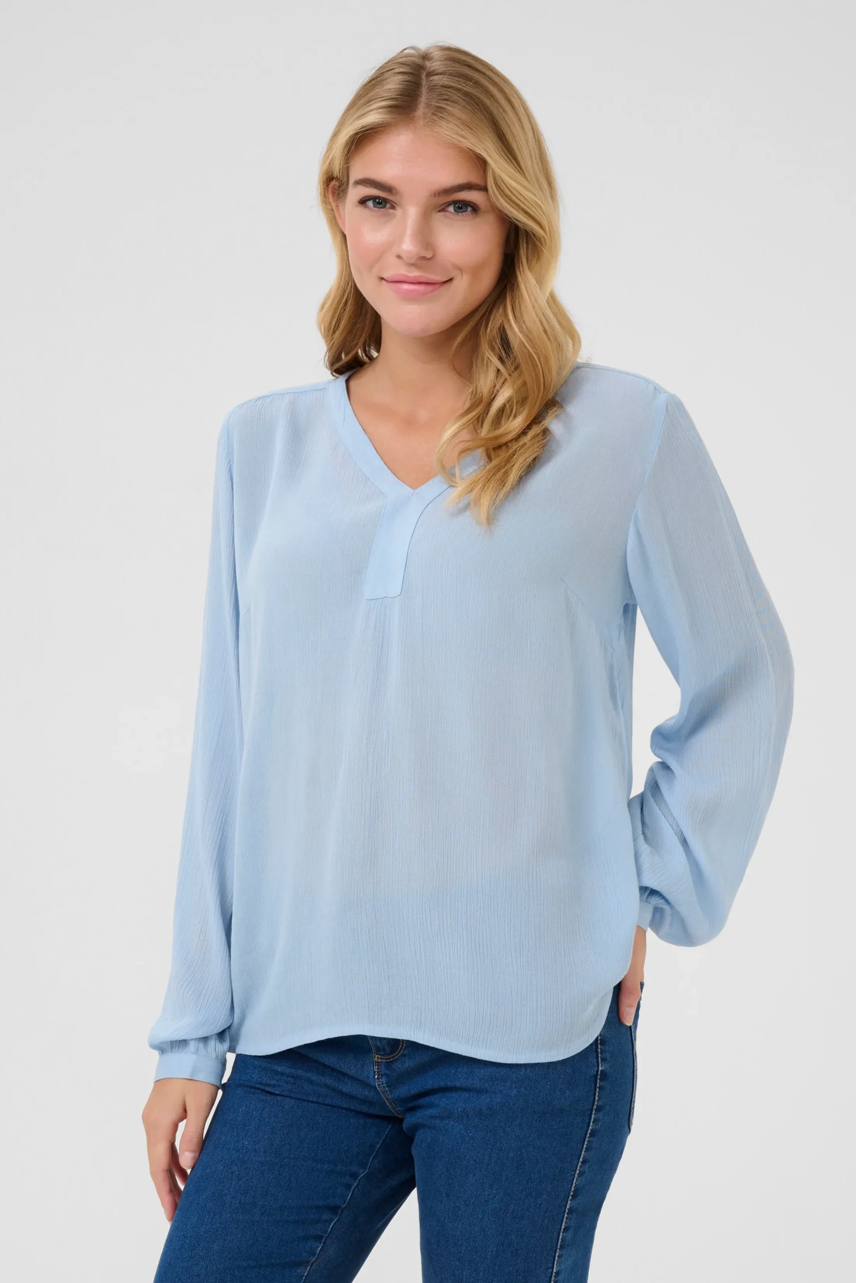 Enkel bluse i let crepekvalitet. V-udskæring. Lange ærmer med smal manchet med knap. Afrundet forneden. Brug denne superbehagelige og skønne bluse til et par smalle habitinspirerede bukser og smarte støvler.