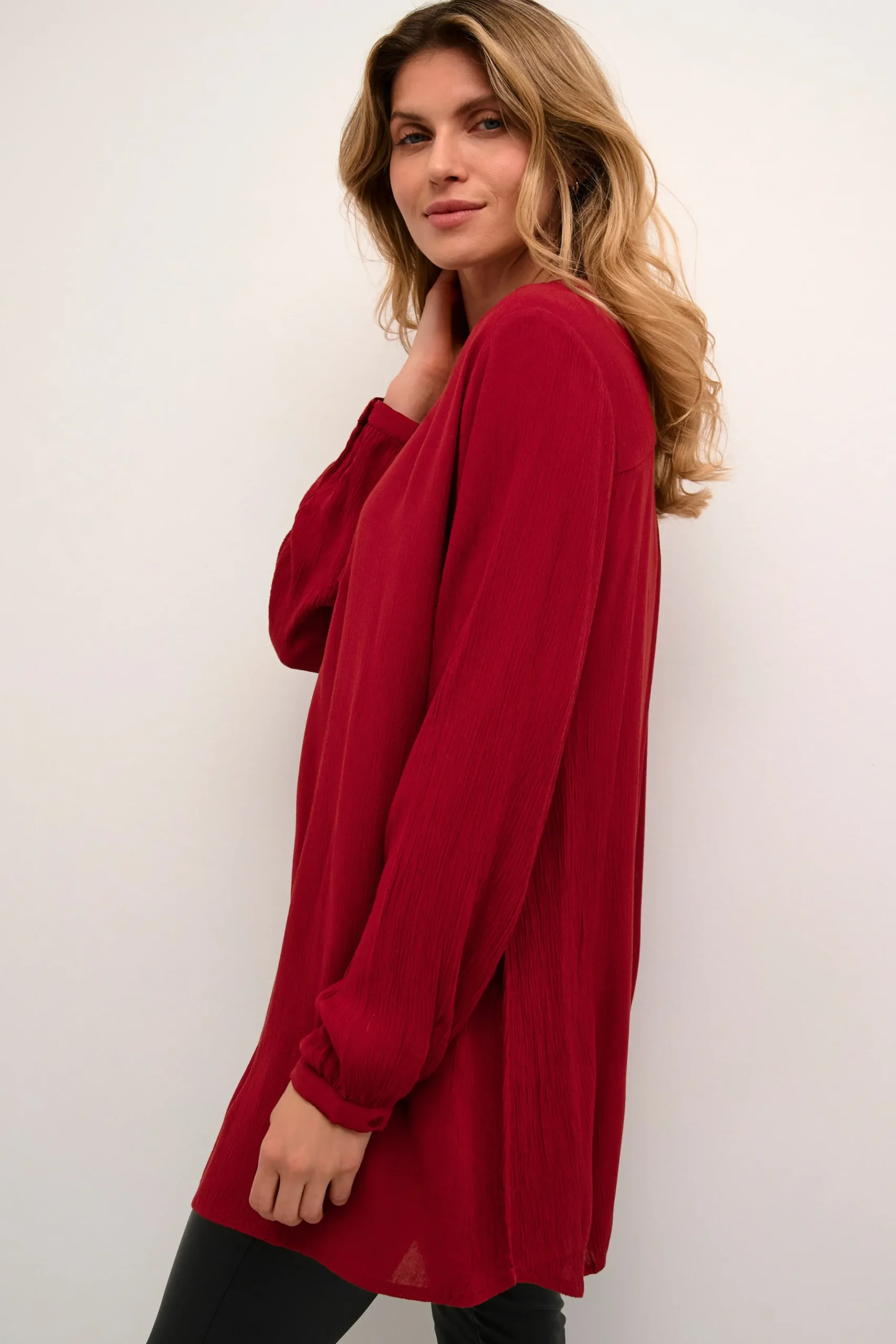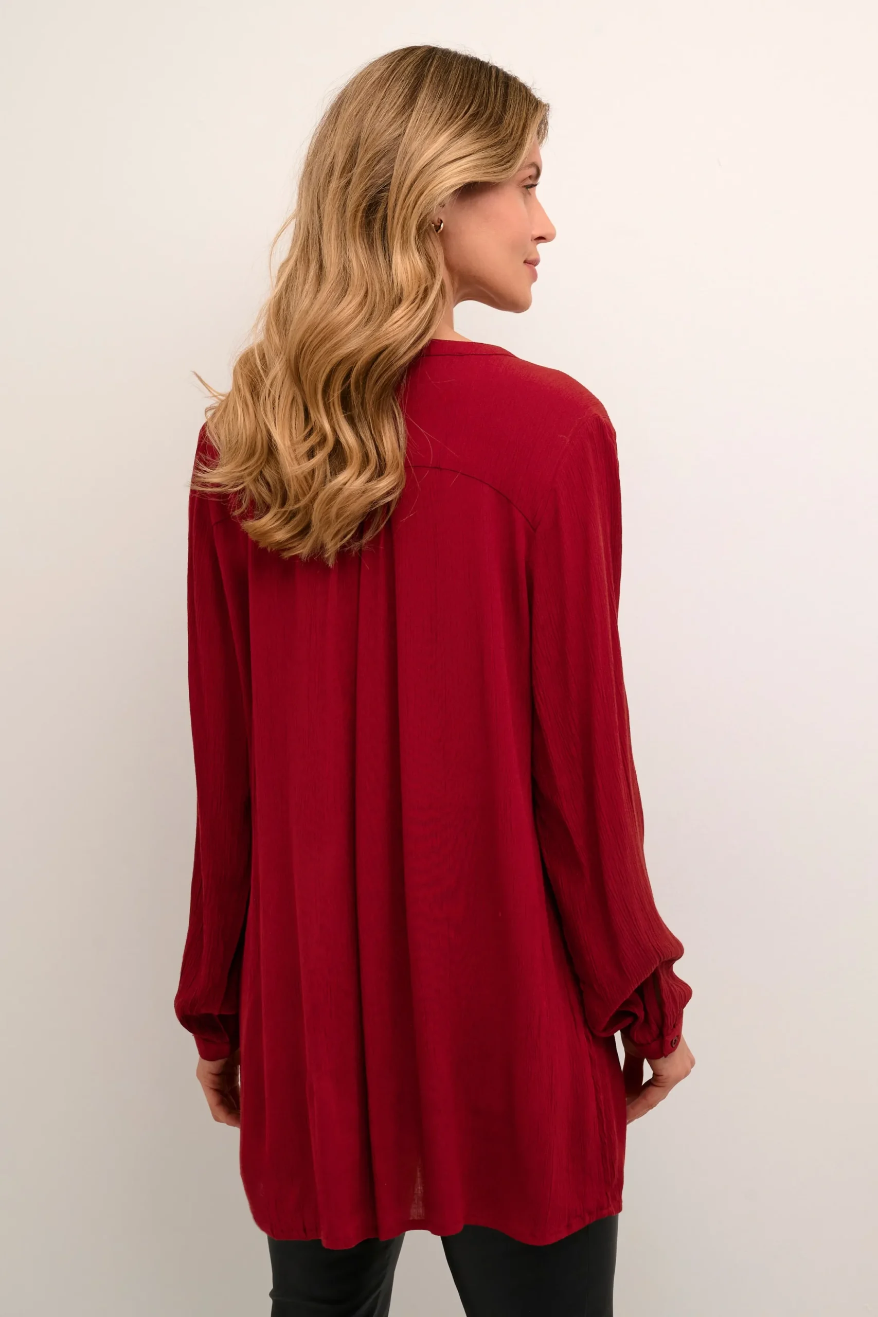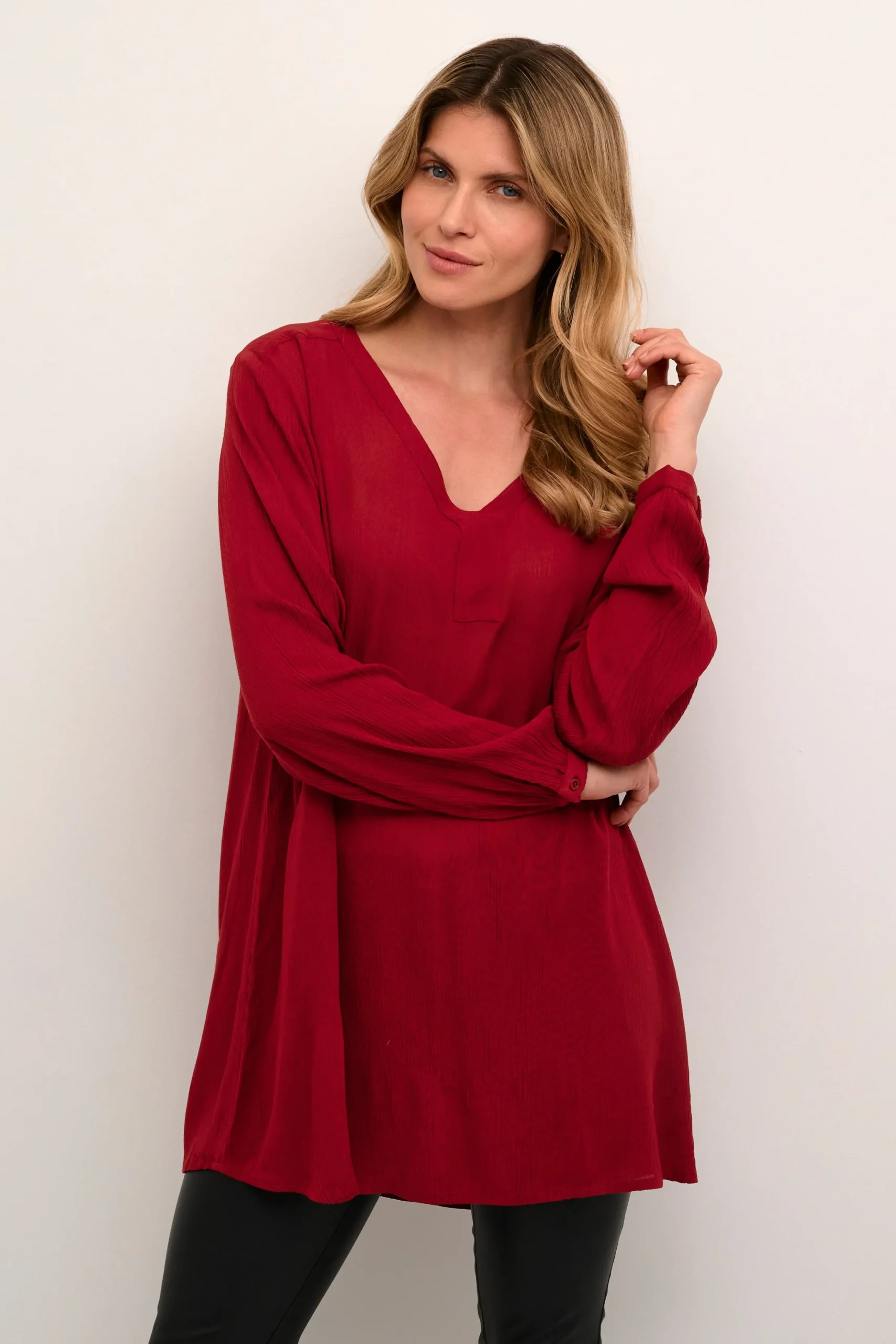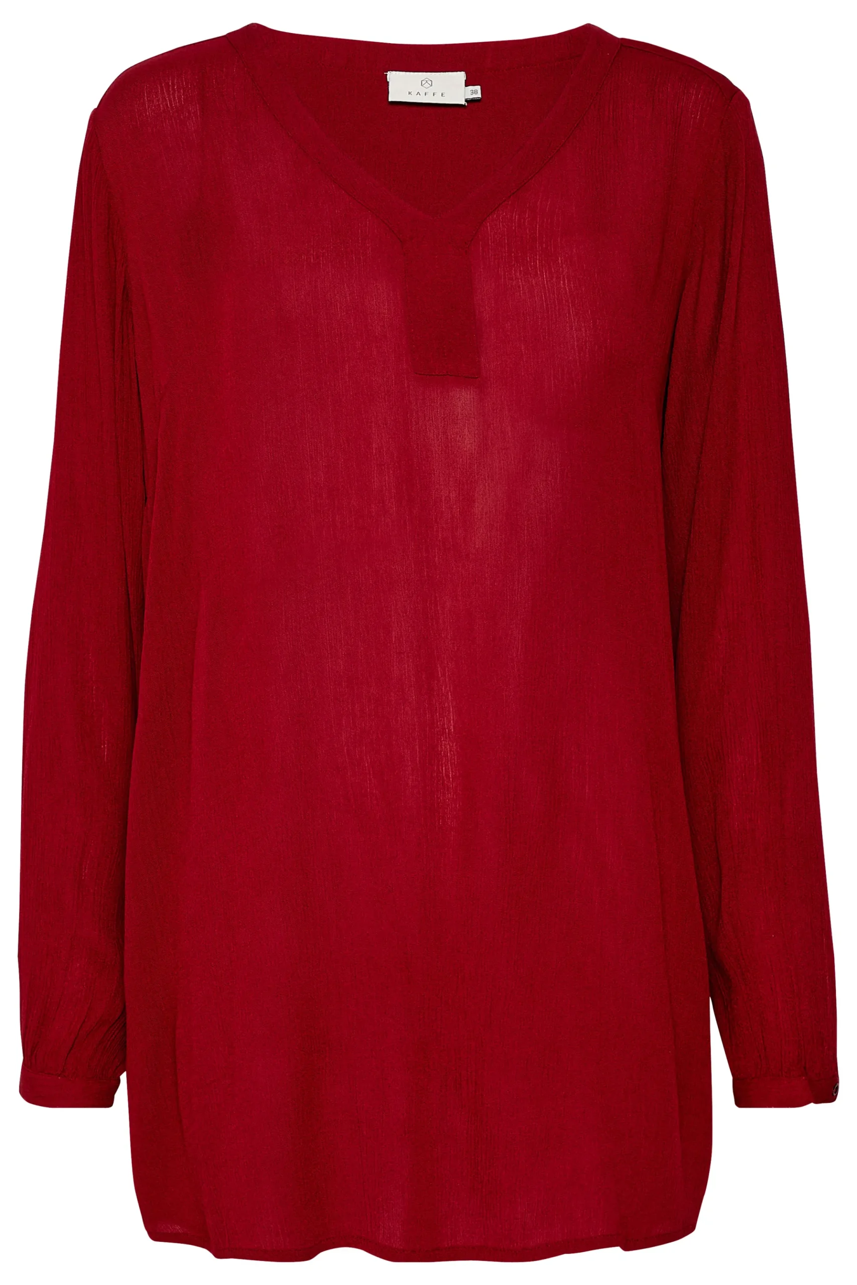 Tunika fra KAFFE med V-hals. Lange ærmer med manchet og knap. Vævet kvalitet. Normal pasform.