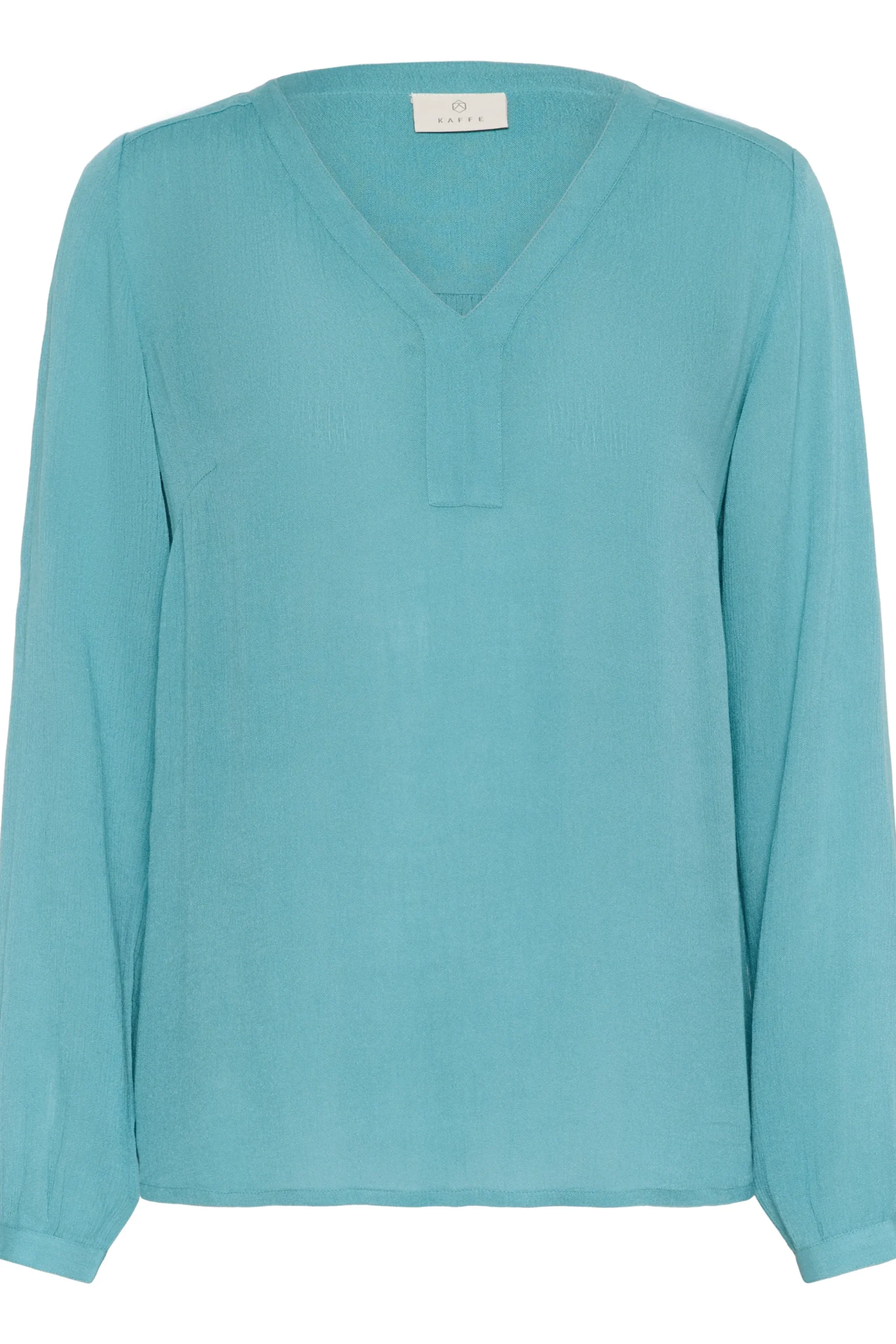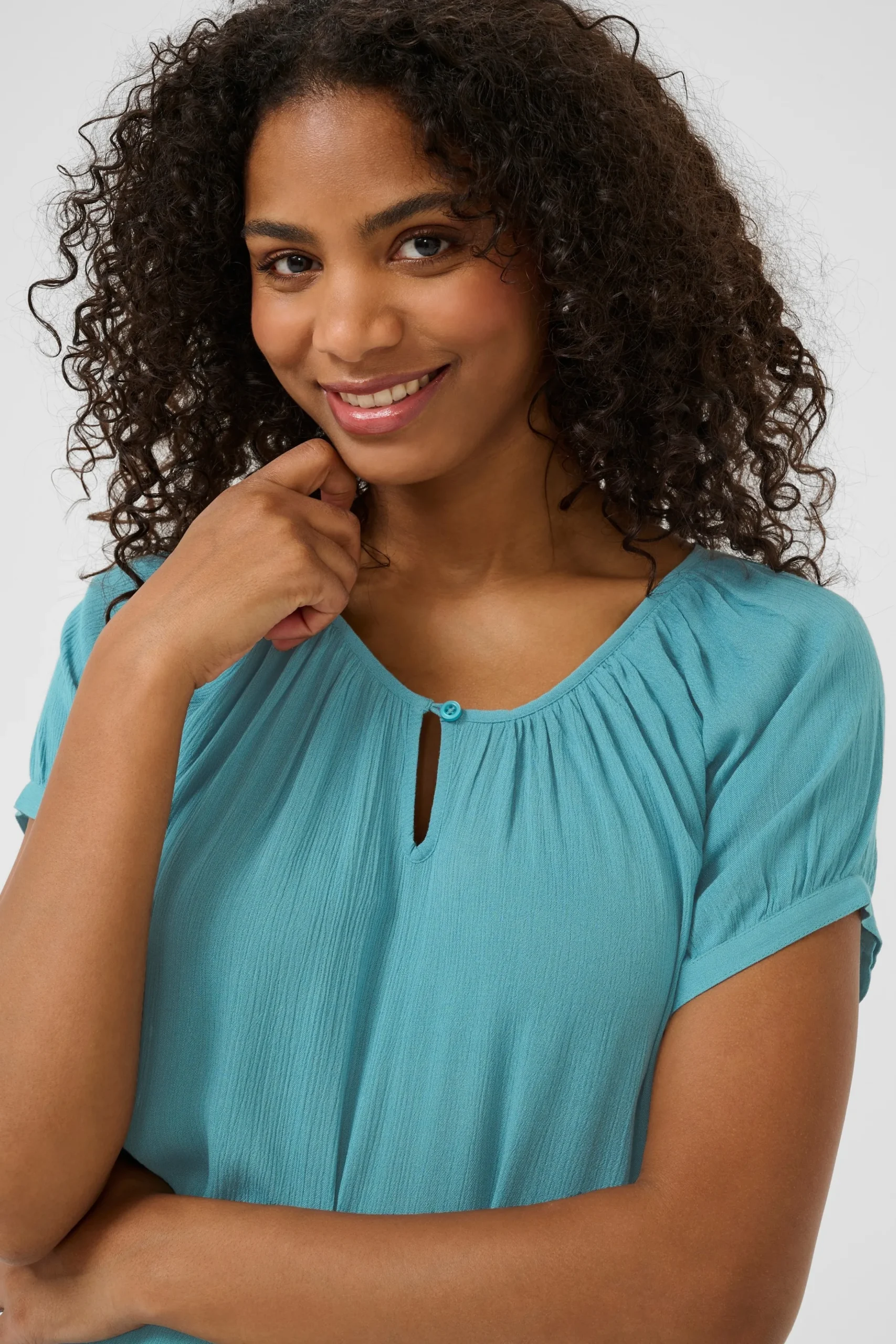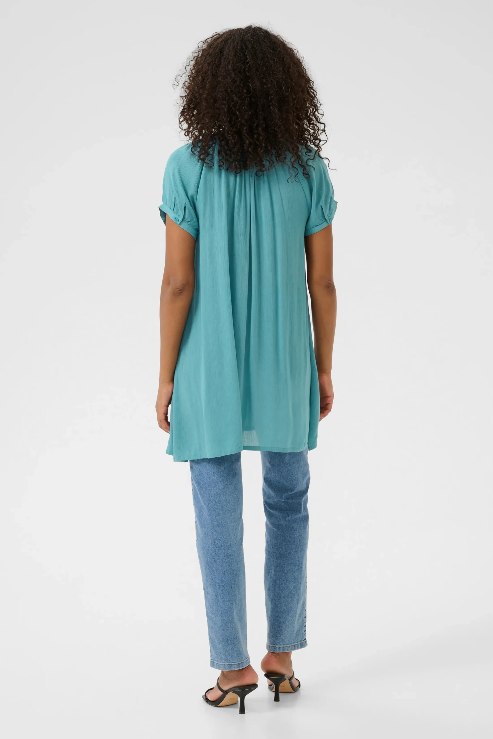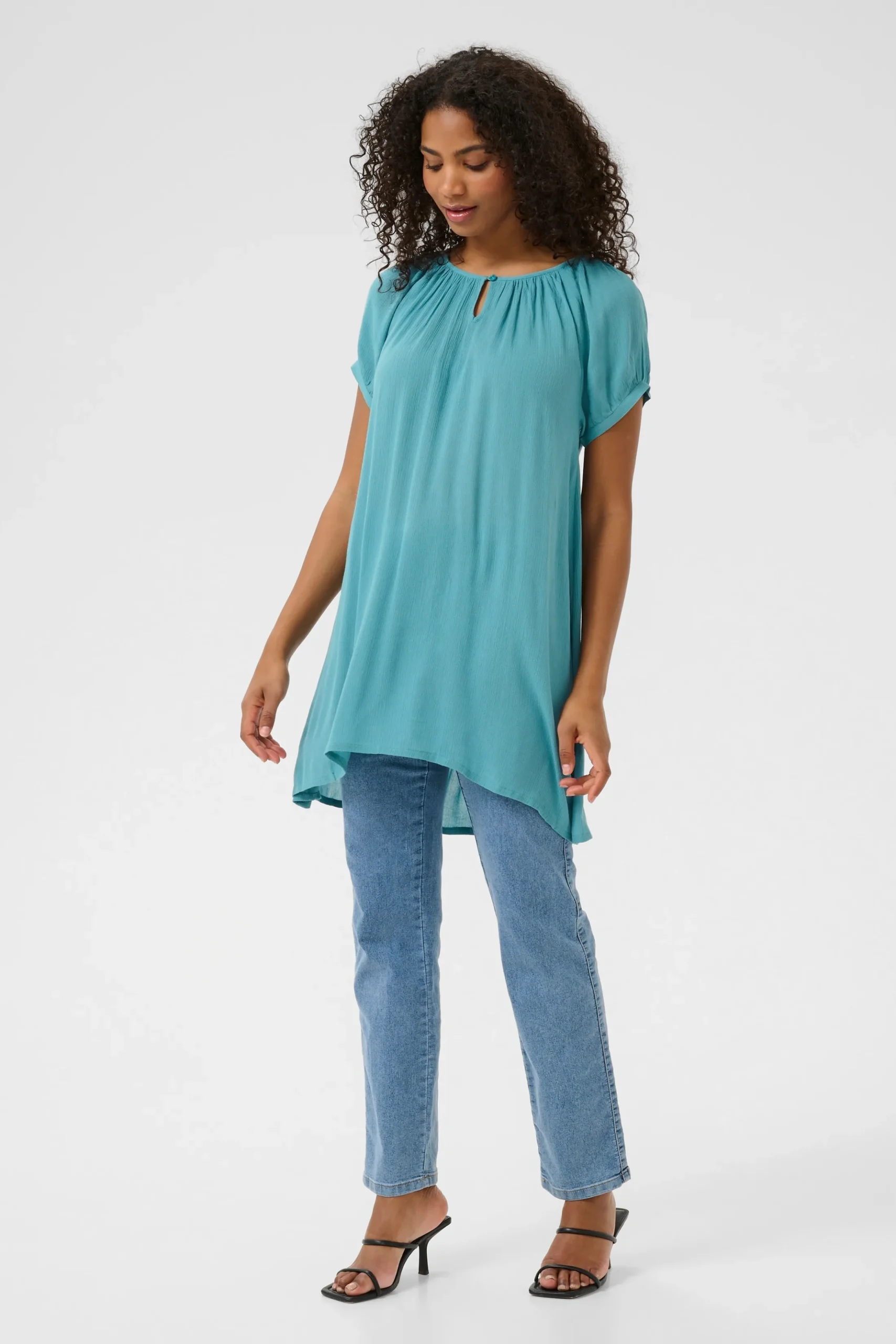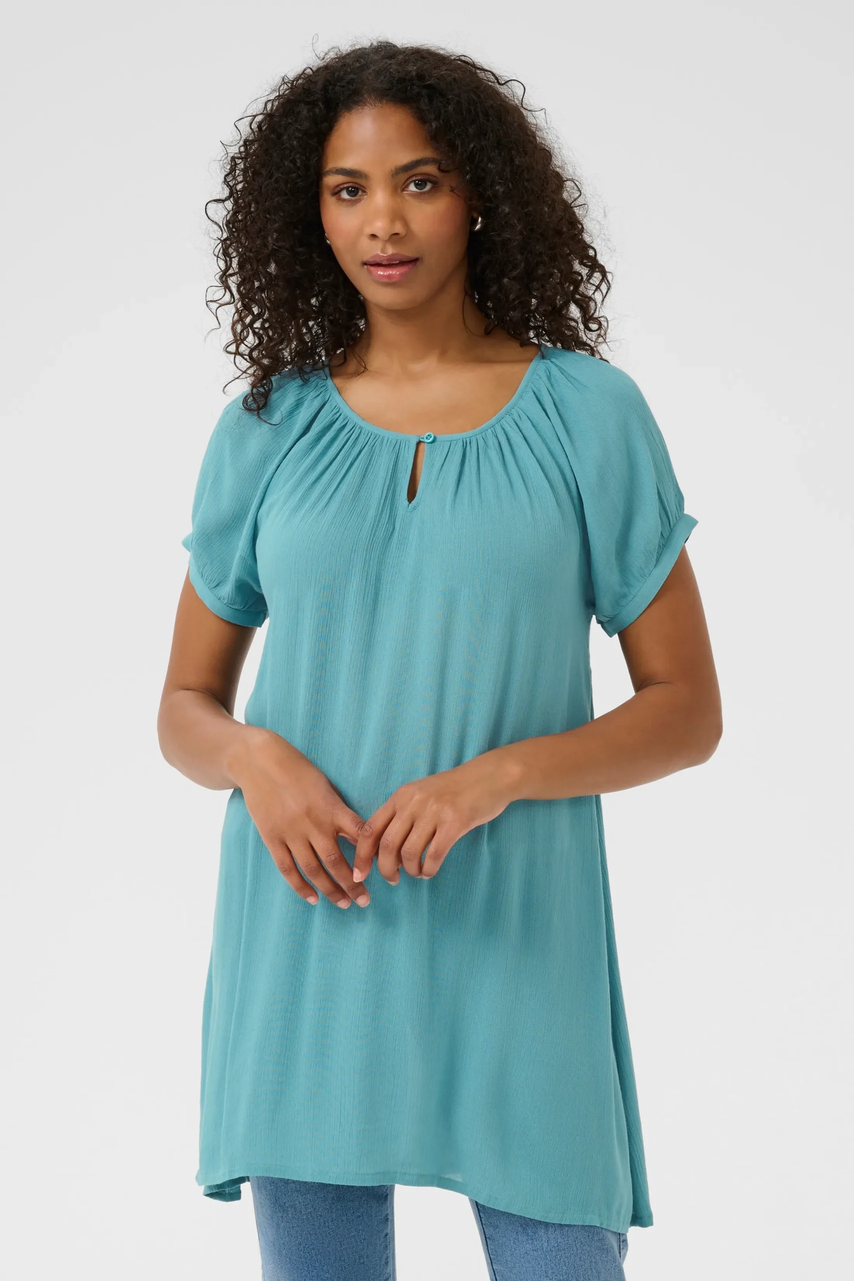 Tunika fra KAFFE med rund hals. Korte ærmer med slids, manchet og knap. Slids i hals med knap. Vævet crepekvalitet. Tunikaen fra KAFFE har normal pasform.