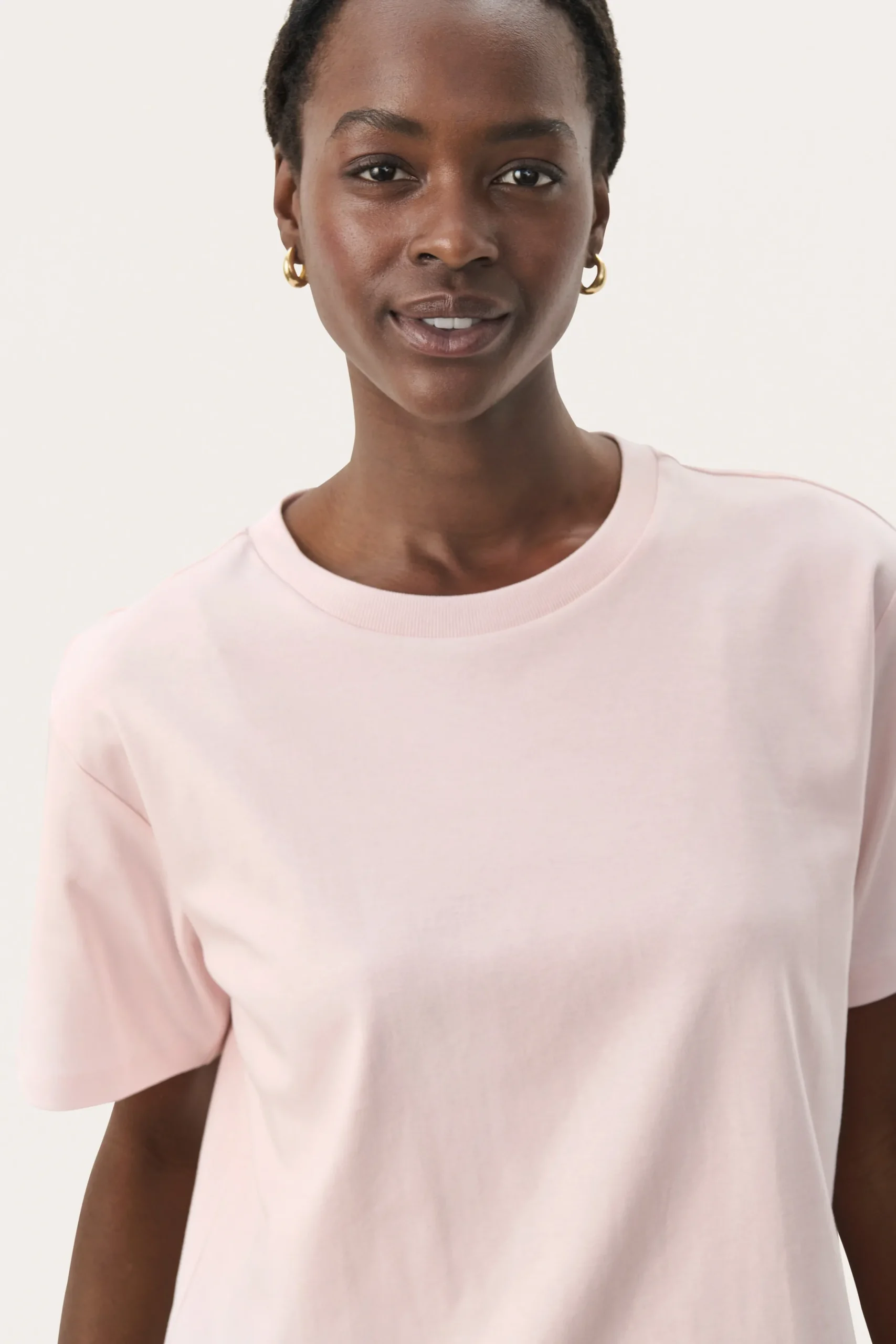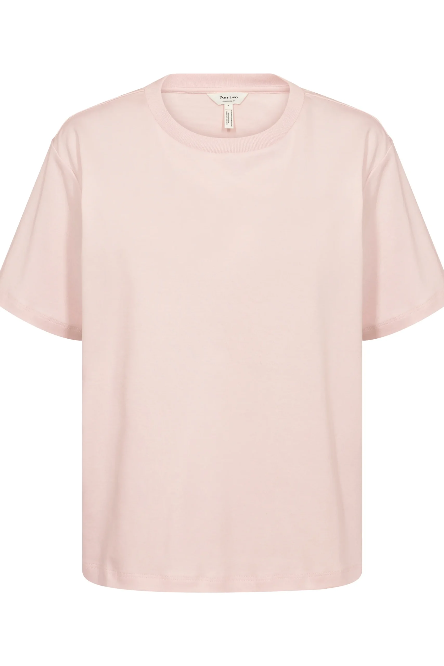 Modellen er 180 cm høj og er iført en størrelse M.\\n\\nDenne klassiske T-shirt i en blød lyserød nuance er et must-have i din basisgarderobe. Med sin runde halsudskæring og afslappede pasform tilbyder den både komfort og stil. Perfekt alene eller som en del af et lag-på-lag-look.\\n\\n