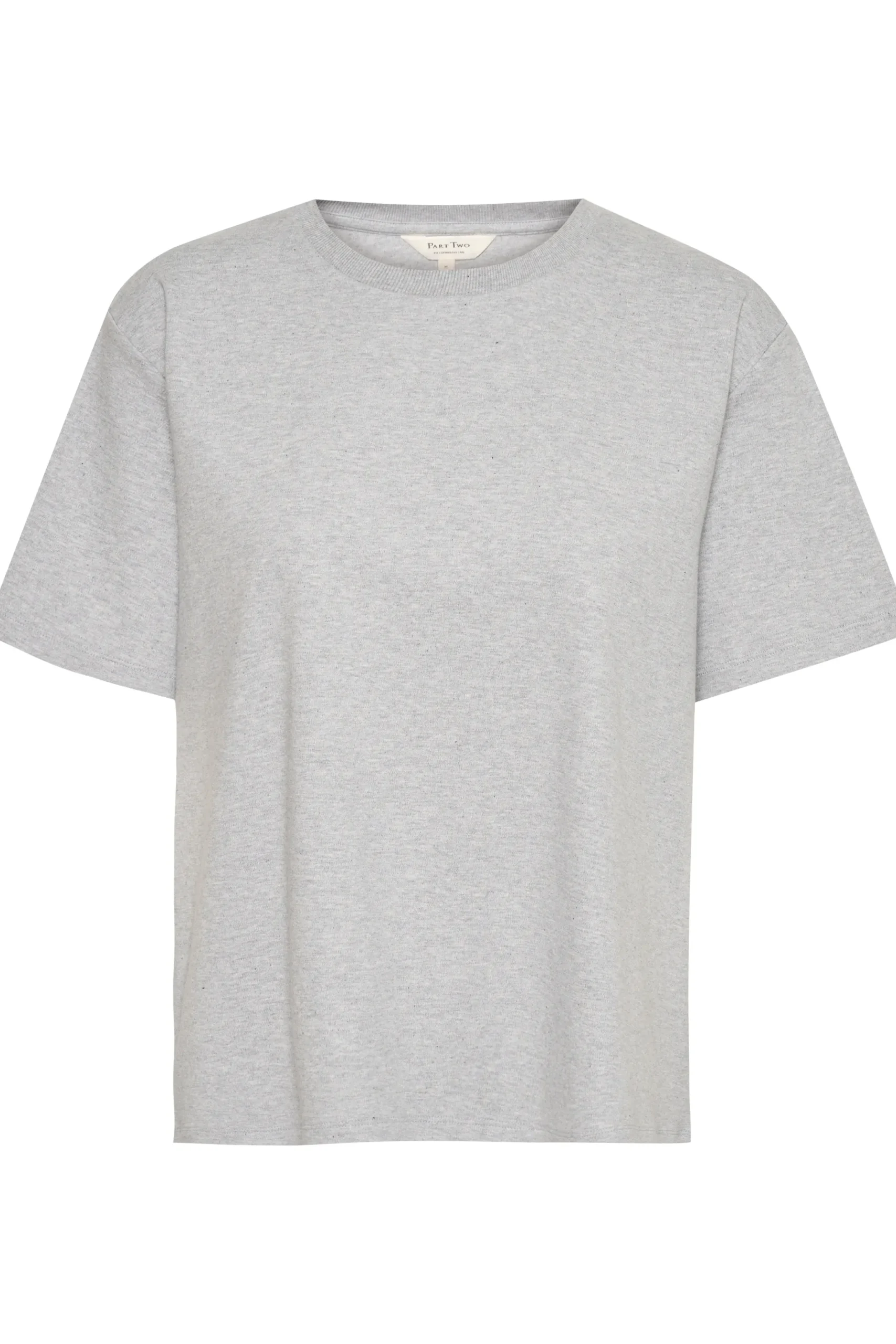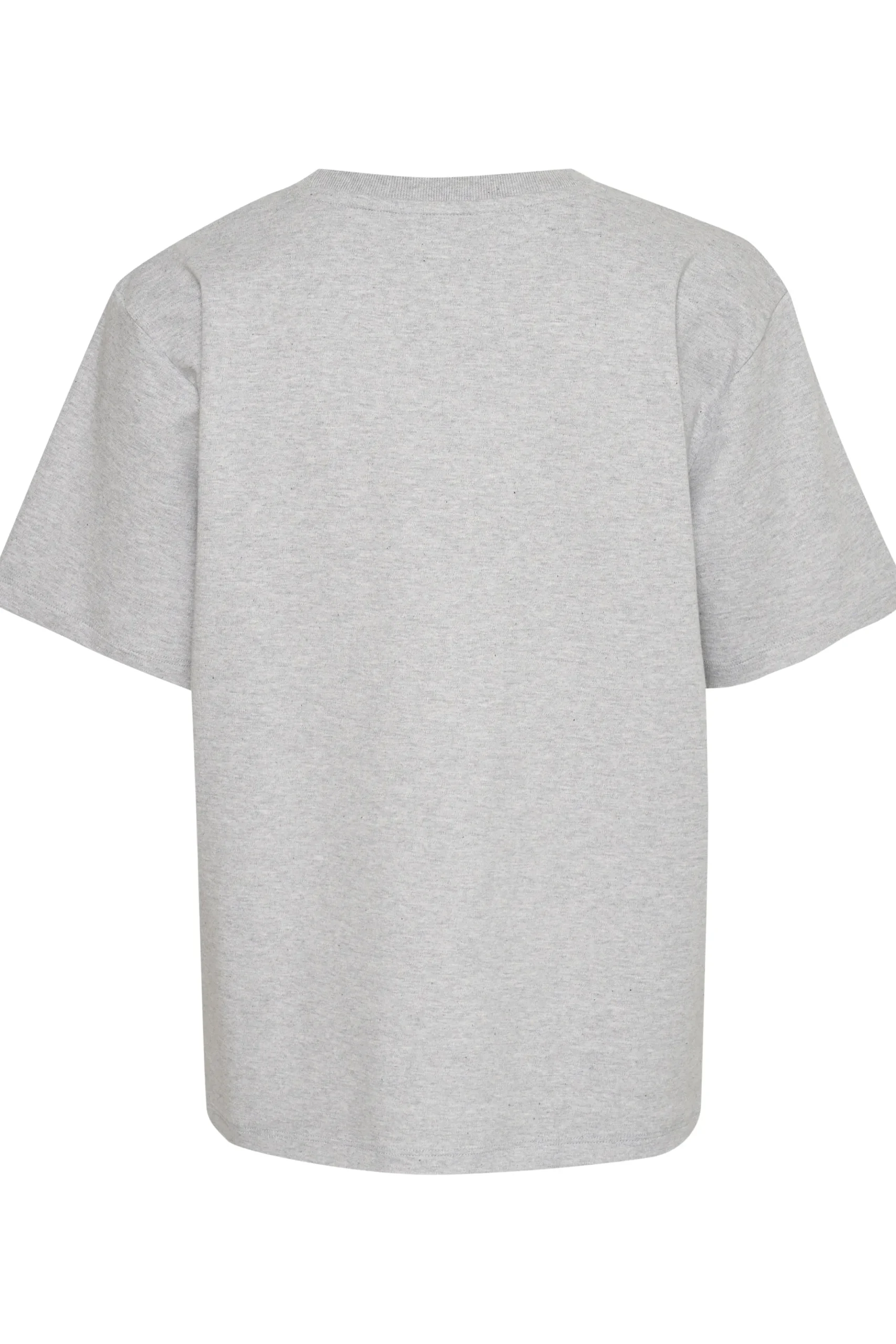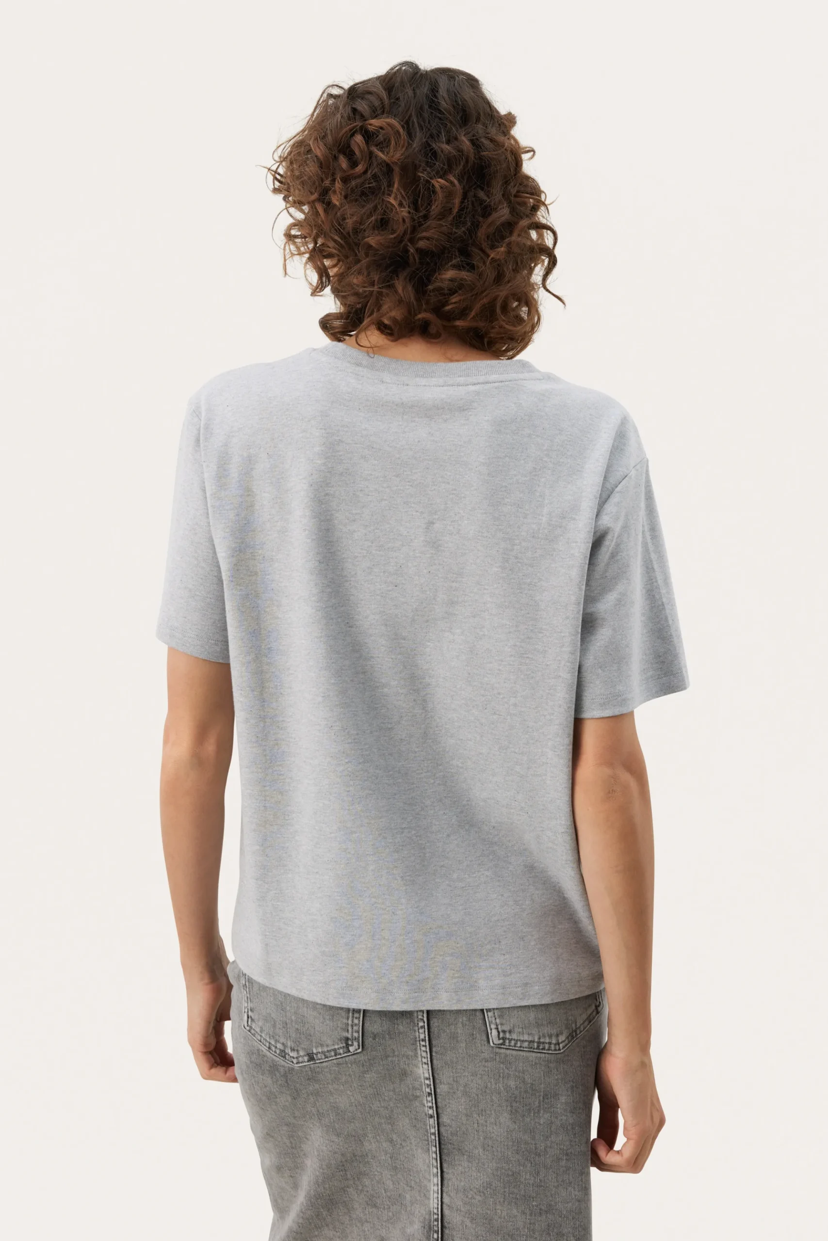 Modellen er 178 cm høj og er iført en størrelse M.\\n\\nDenne minimalistiske grå T-shirt er et essentielt stykke i enhver garderobe. Med dens rene linjer og løse pasform tilbyder den ubesværet komfort og stil, der nemt kan kombineres med enhver underdel fra stramme jeans til løstsiddende bukser. En perfekt basisvare for både et afslappet og et mere opdressed look.