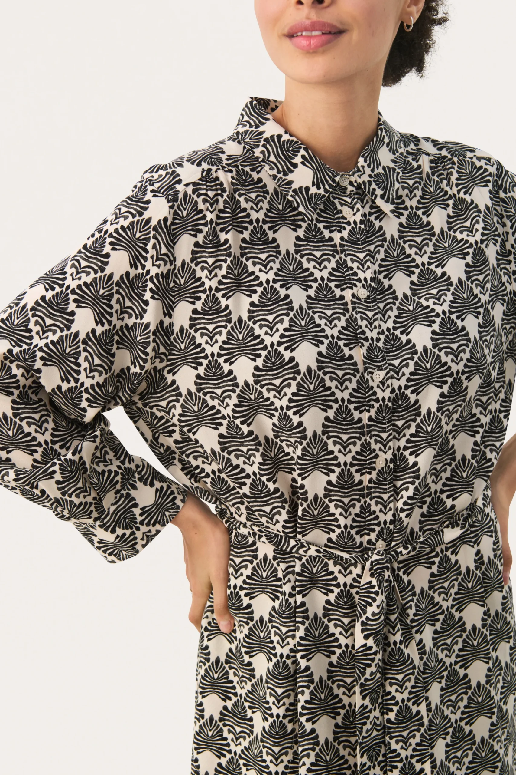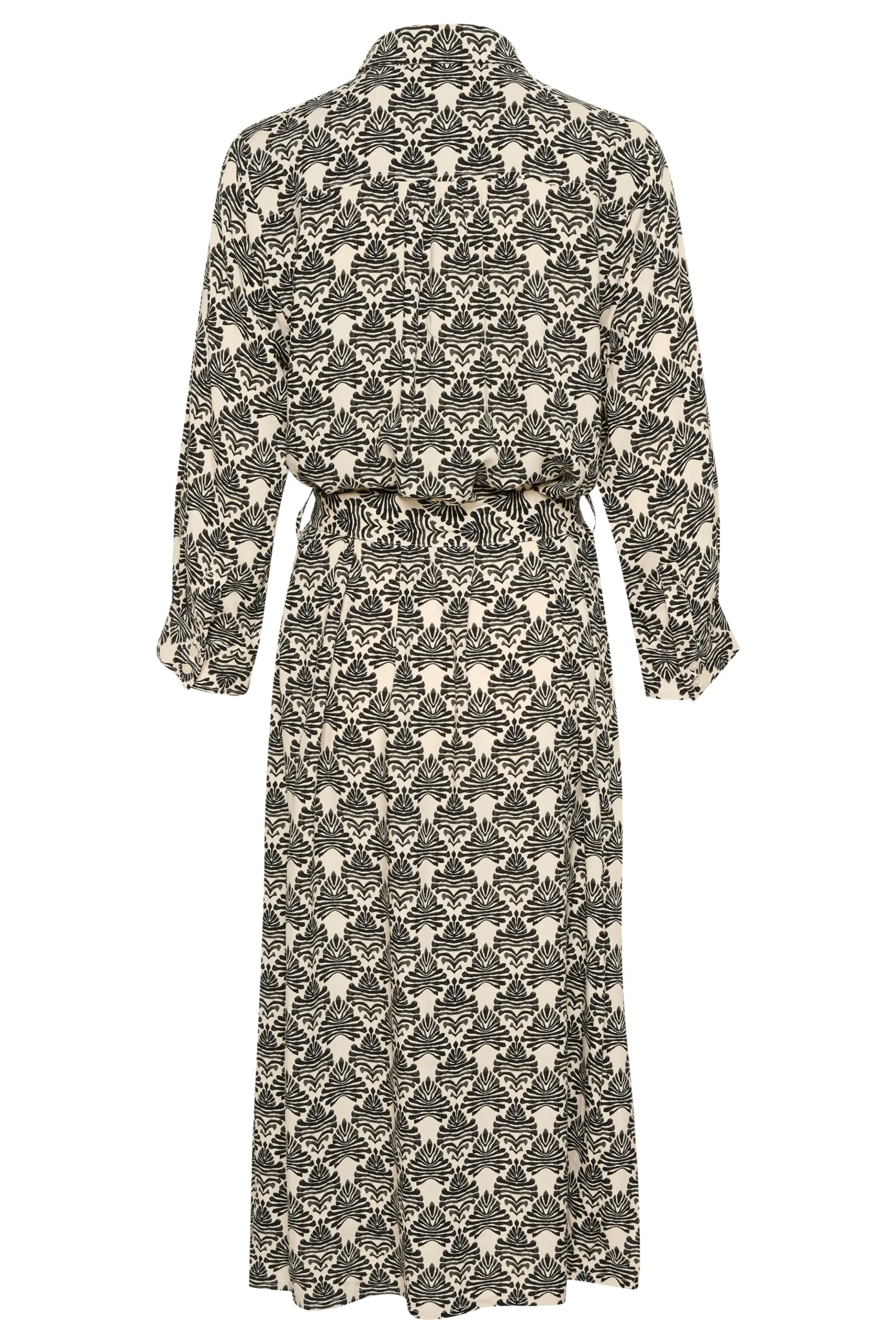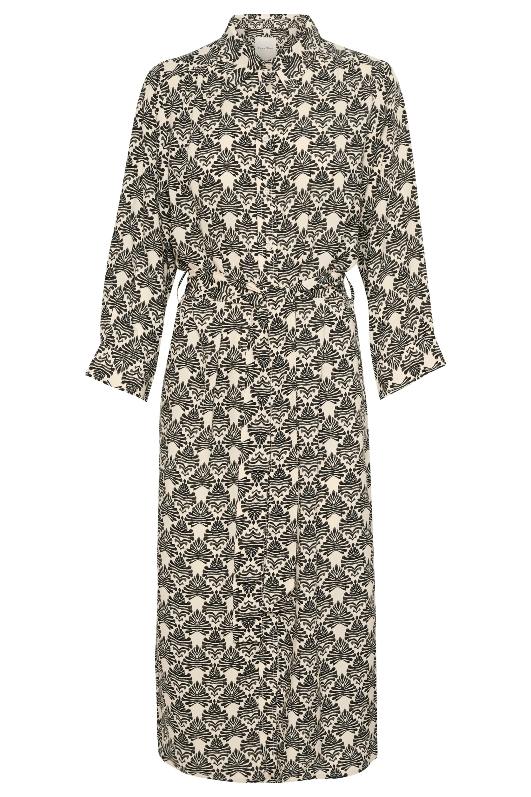 Modellen er 174 cm høj og er iført en størrelse 36.\\n\\nDenne mønstrede skjortekjole er både stilfuld og alsidig. Med sin løse pasform og bløde materiale er den perfekt til enhver lejlighed. Brug den alene for et elegant look eller over bukser for en mere afslappet stil.