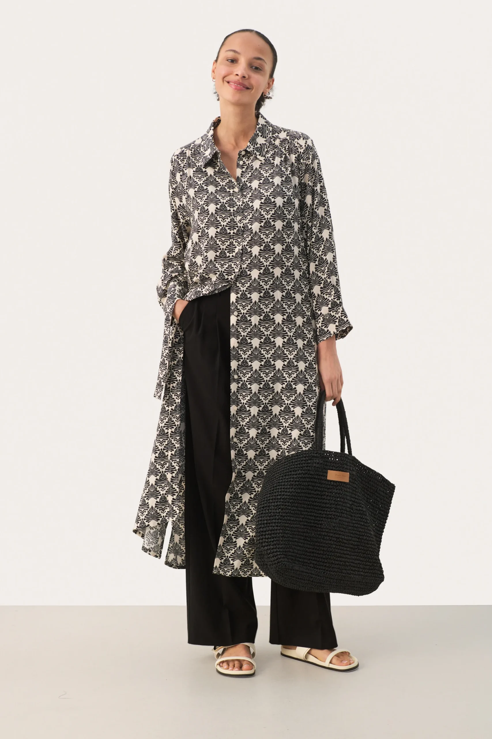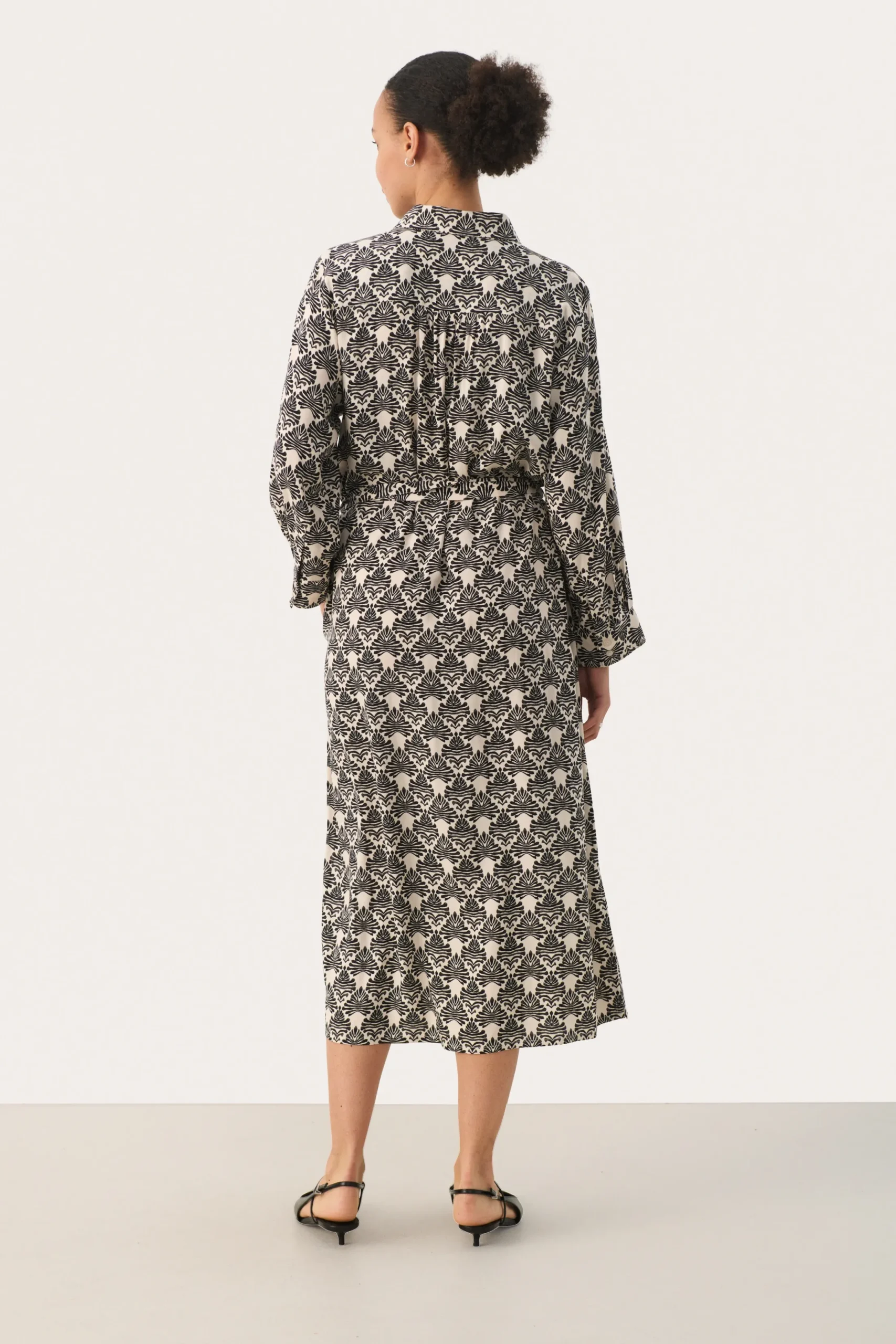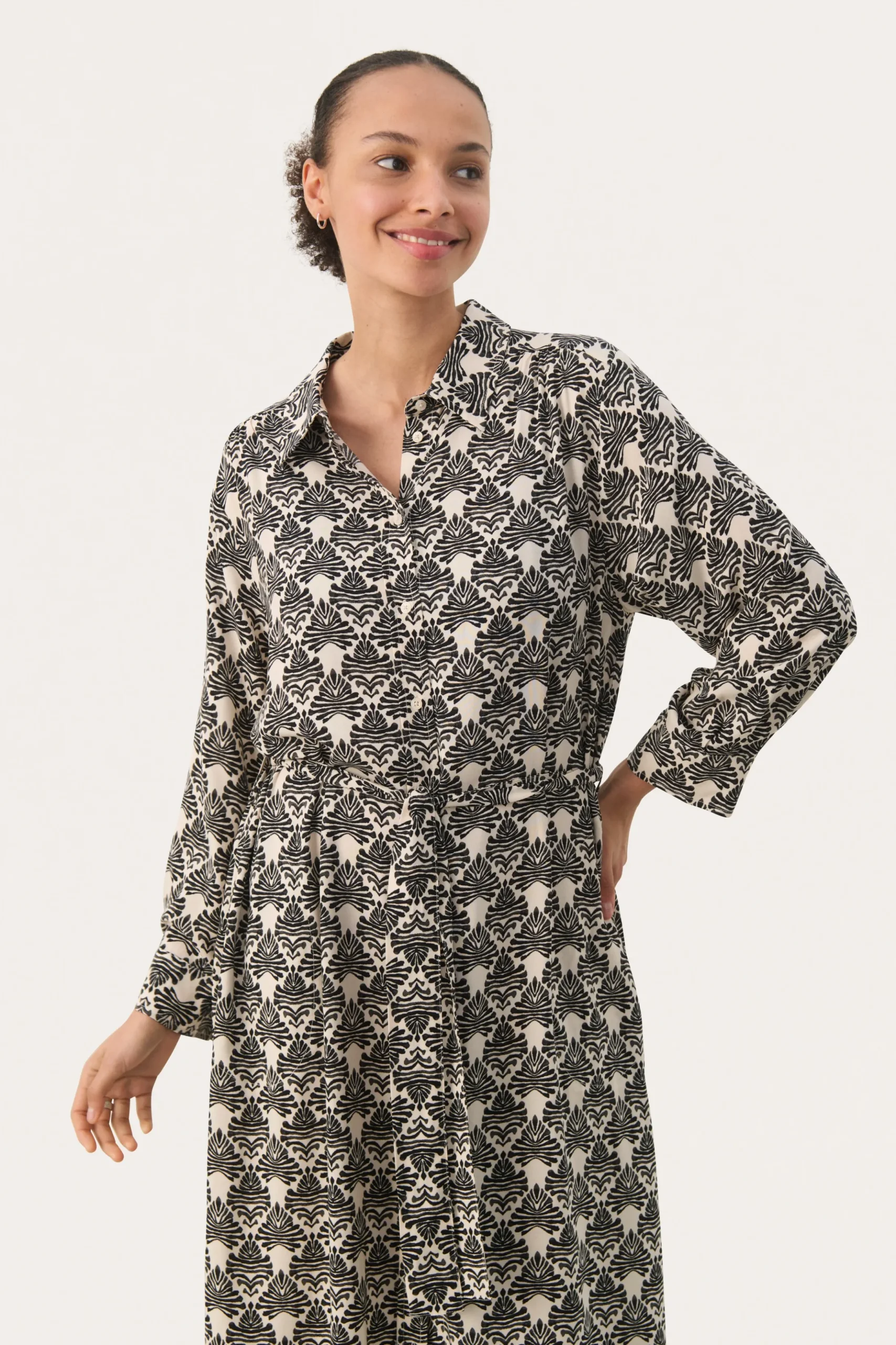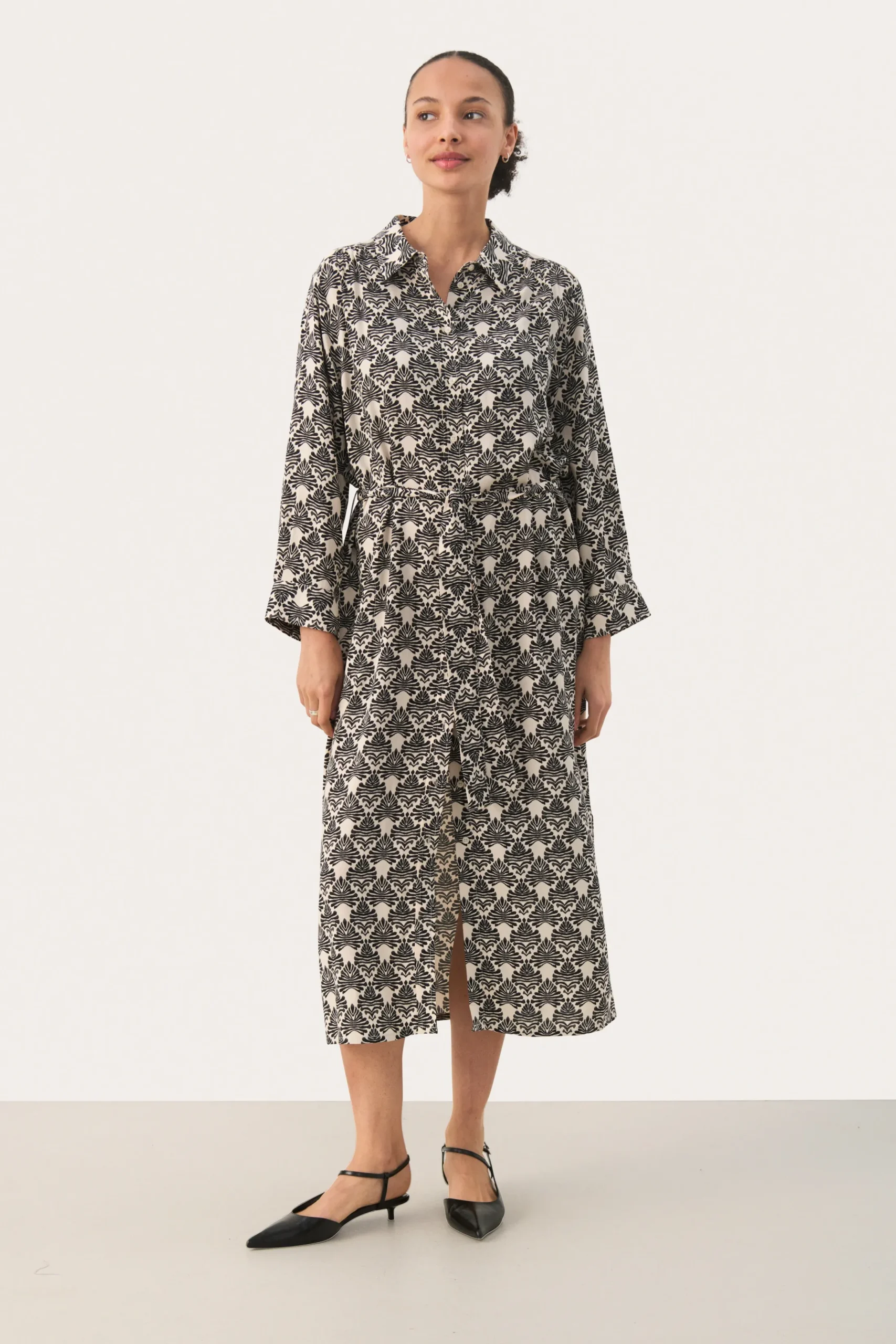 Modellen er 174 cm høj og er iført en størrelse 36.\\n\\nDenne mønstrede skjortekjole er både stilfuld og alsidig. Med sin løse pasform og bløde materiale er den perfekt til enhver lejlighed. Brug den alene for et elegant look eller over bukser for en mere afslappet stil.