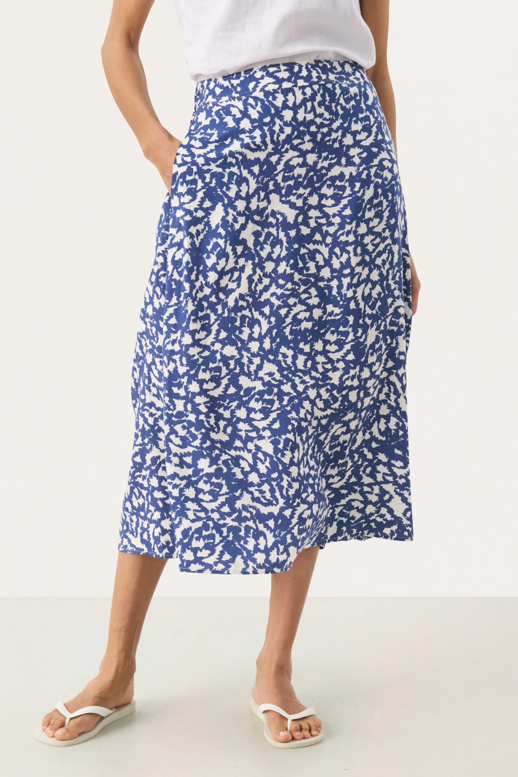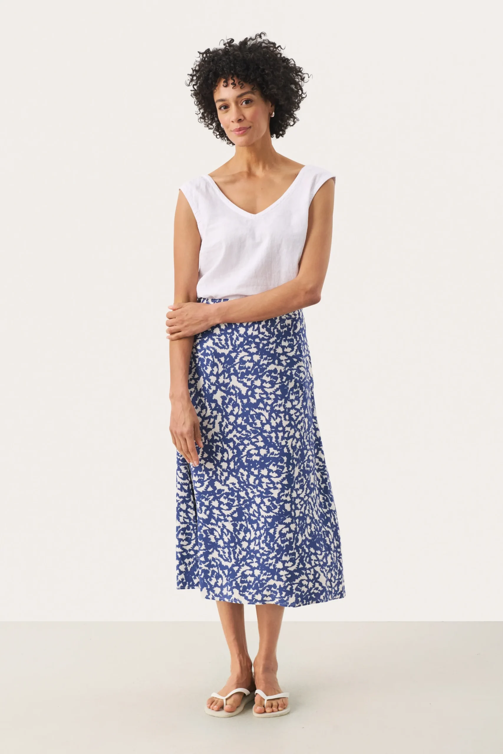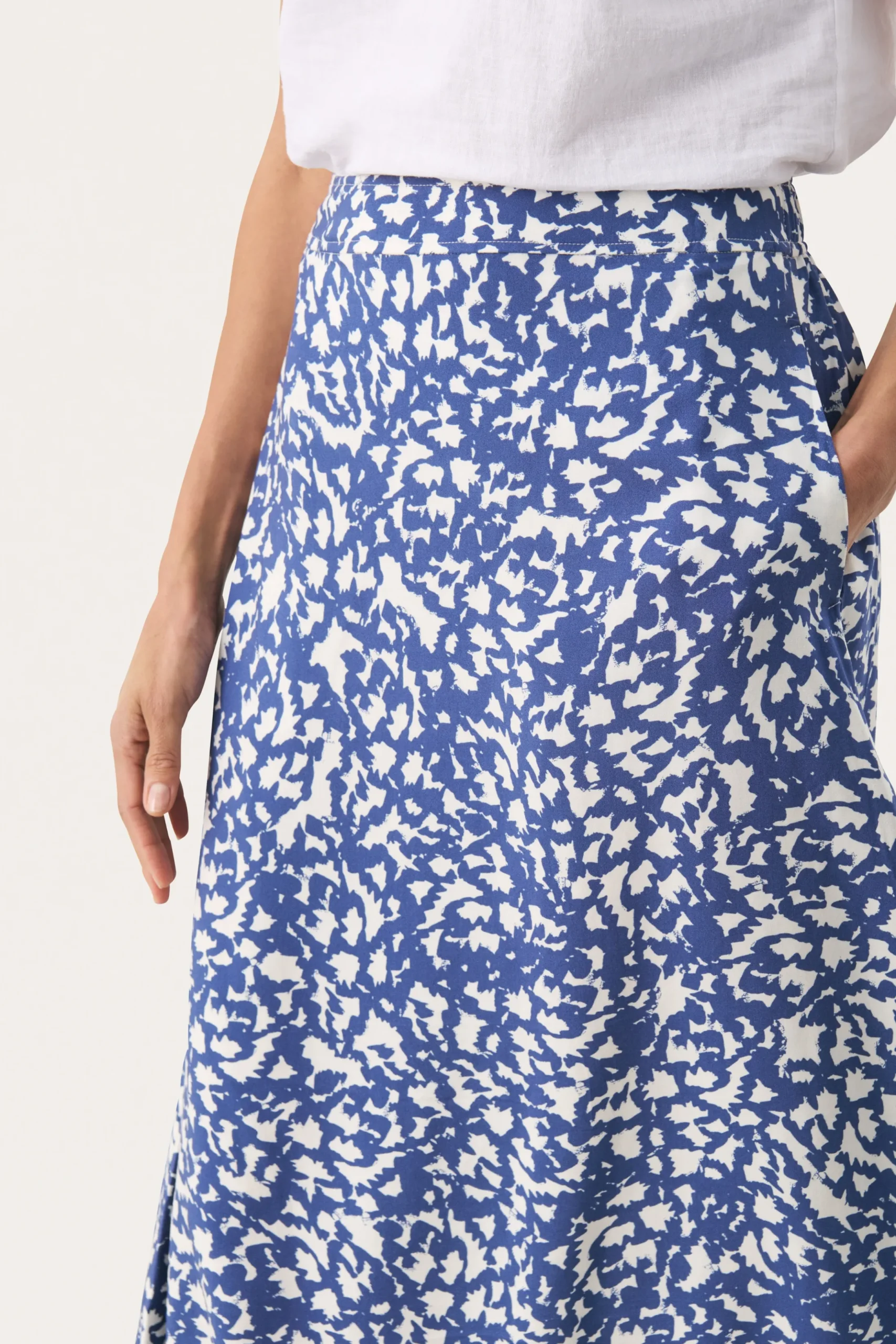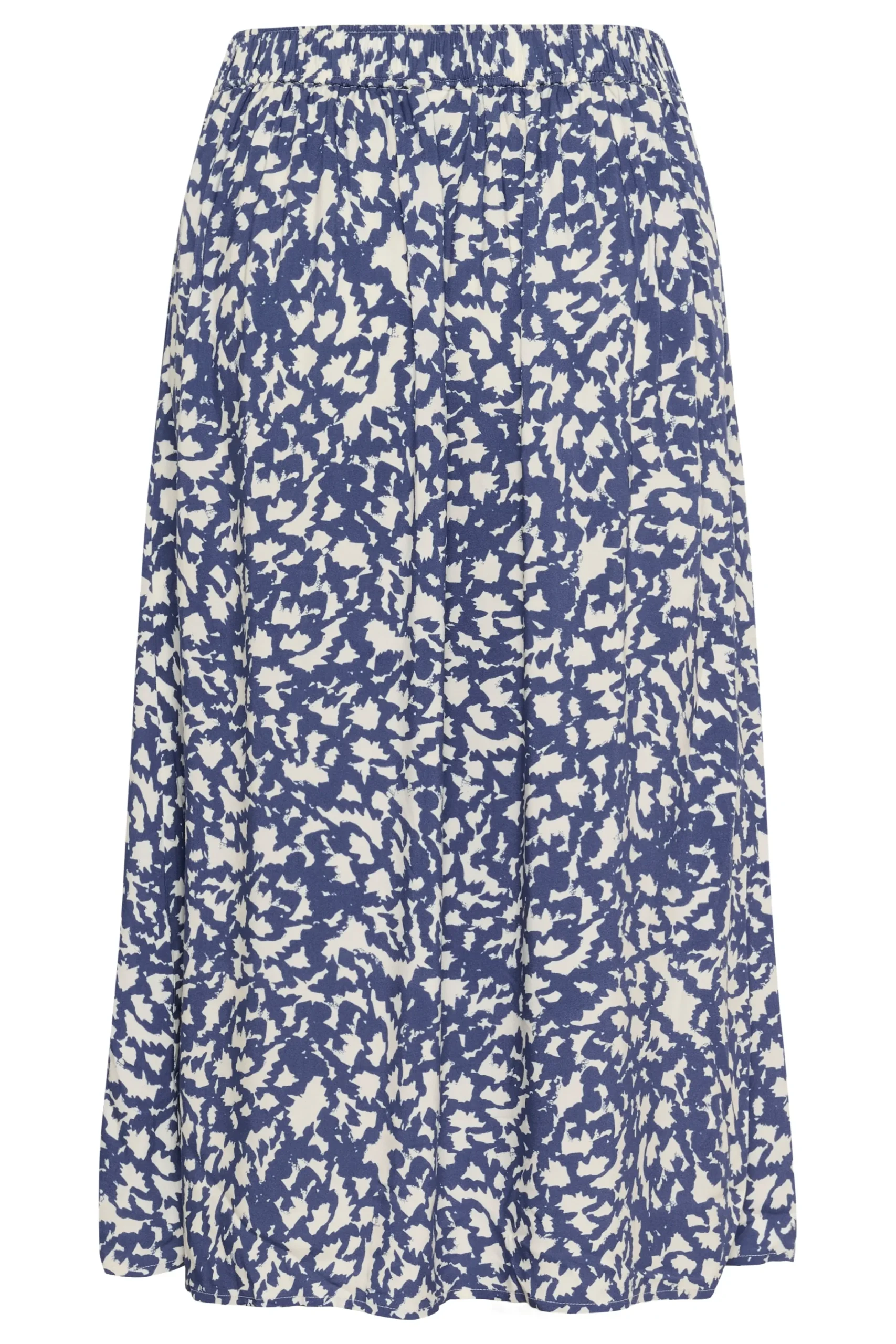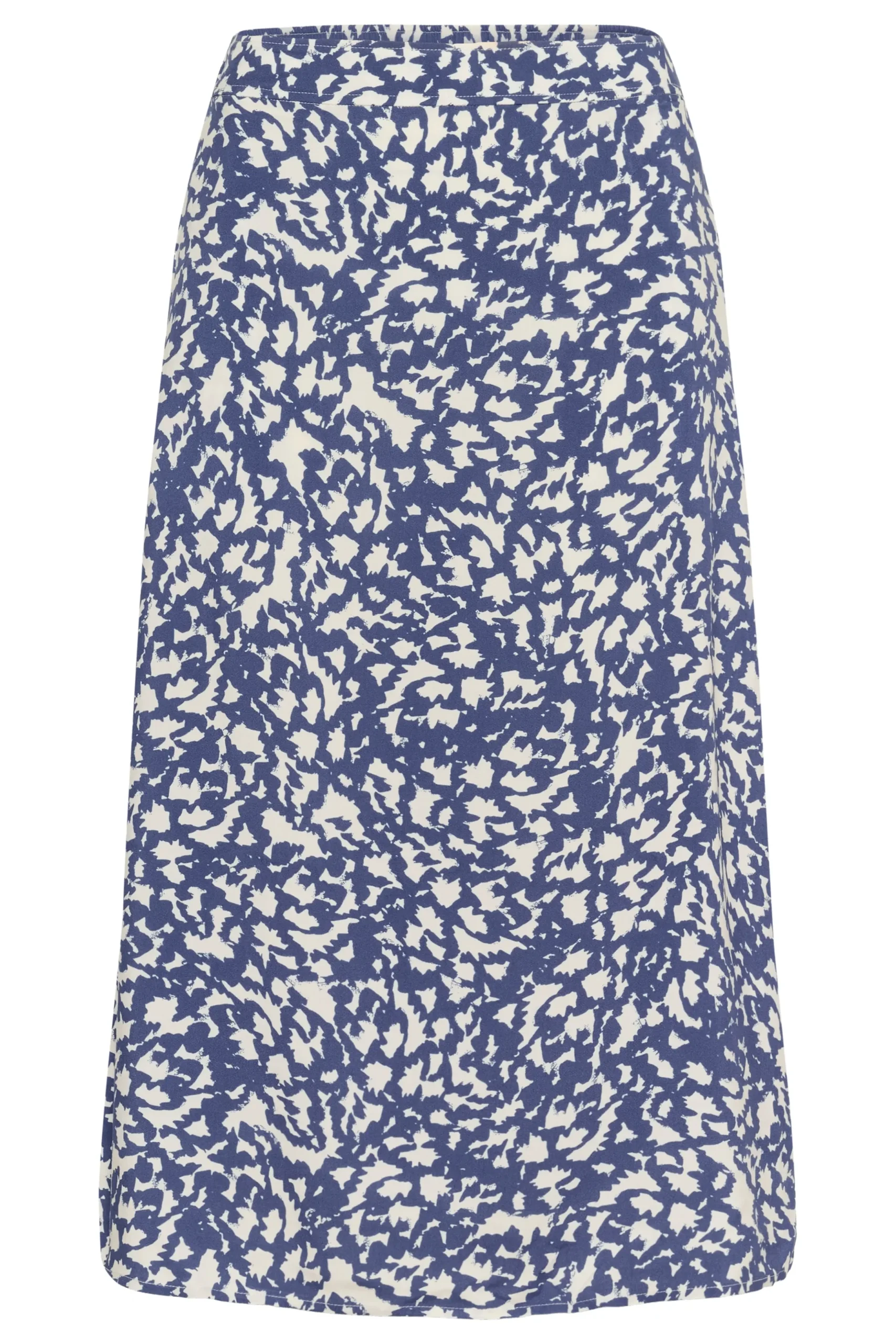 Modellen er 177 cm høj og er iført en størrelse 36.\\n\\nDette lette A-formede skørt har et smukt, abstrakt mønster i blå og hvid. Den midi-lange længde og bløde silhuet giver et elegant udtryk 窶åde hverdag og feriestemning. Style med en enkel top og sandaler.\\n\\n