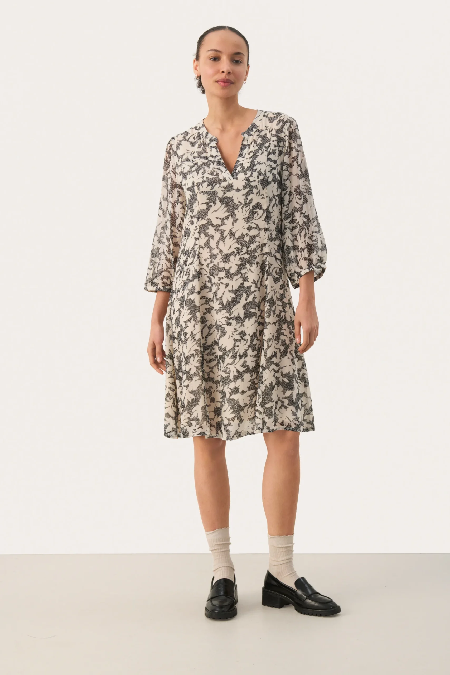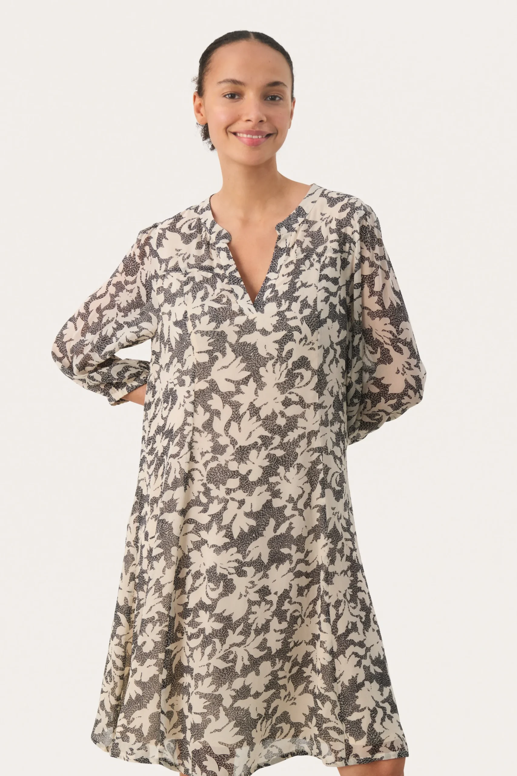 Modellen er 174 cm høj og er iført en størrelse 36.\\n\\nDenne lette kjole med et delikat blomsterprint tilbyder en afslappet og feminin stil. Med dens løse pasform og V-hals er den både flatterende og komfortabel. Ideel til sommerdage eller som et stilfuldt valg til afslappede sammenkomster. Kombiner den med flade sandaler eller hæle for et komplet look.