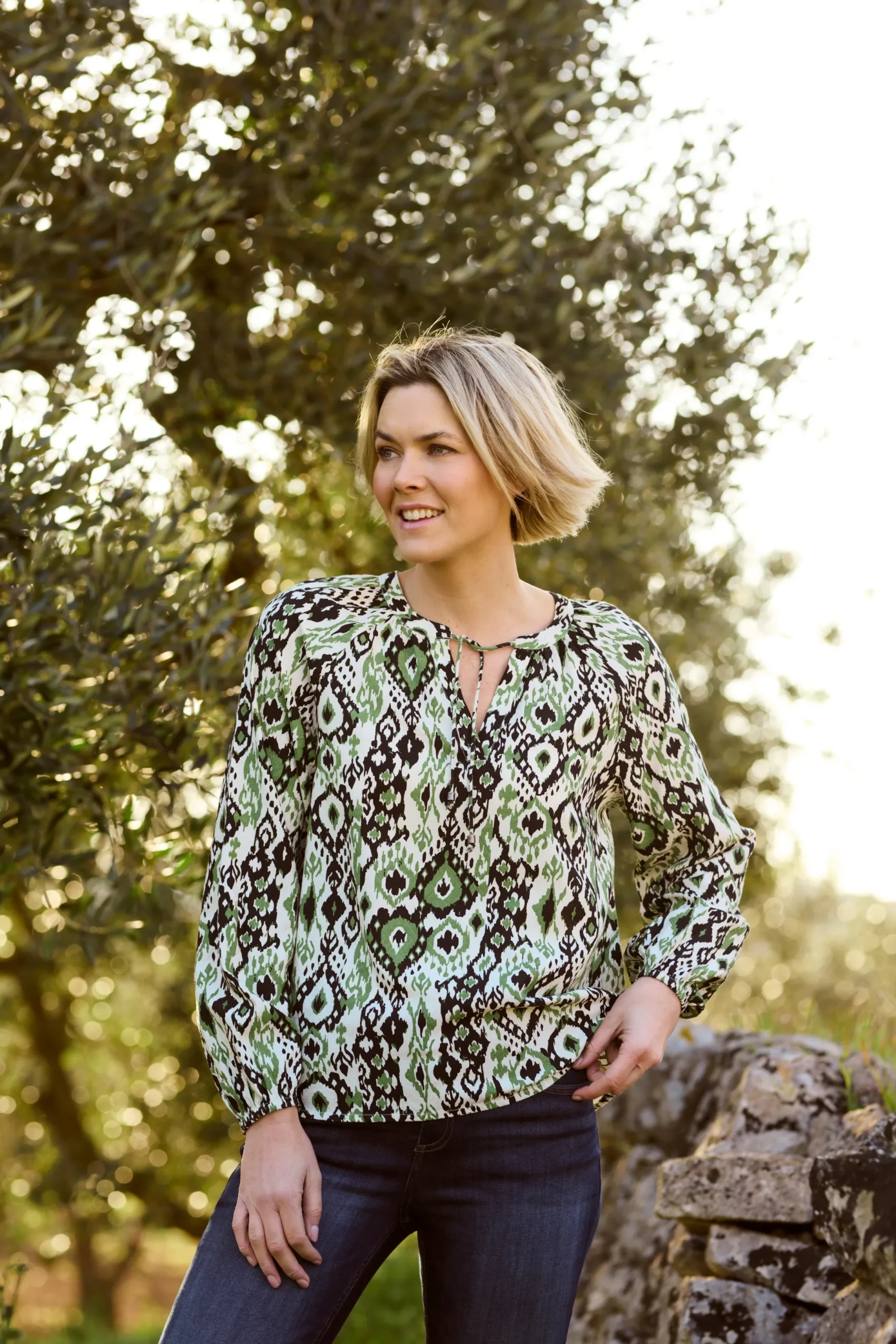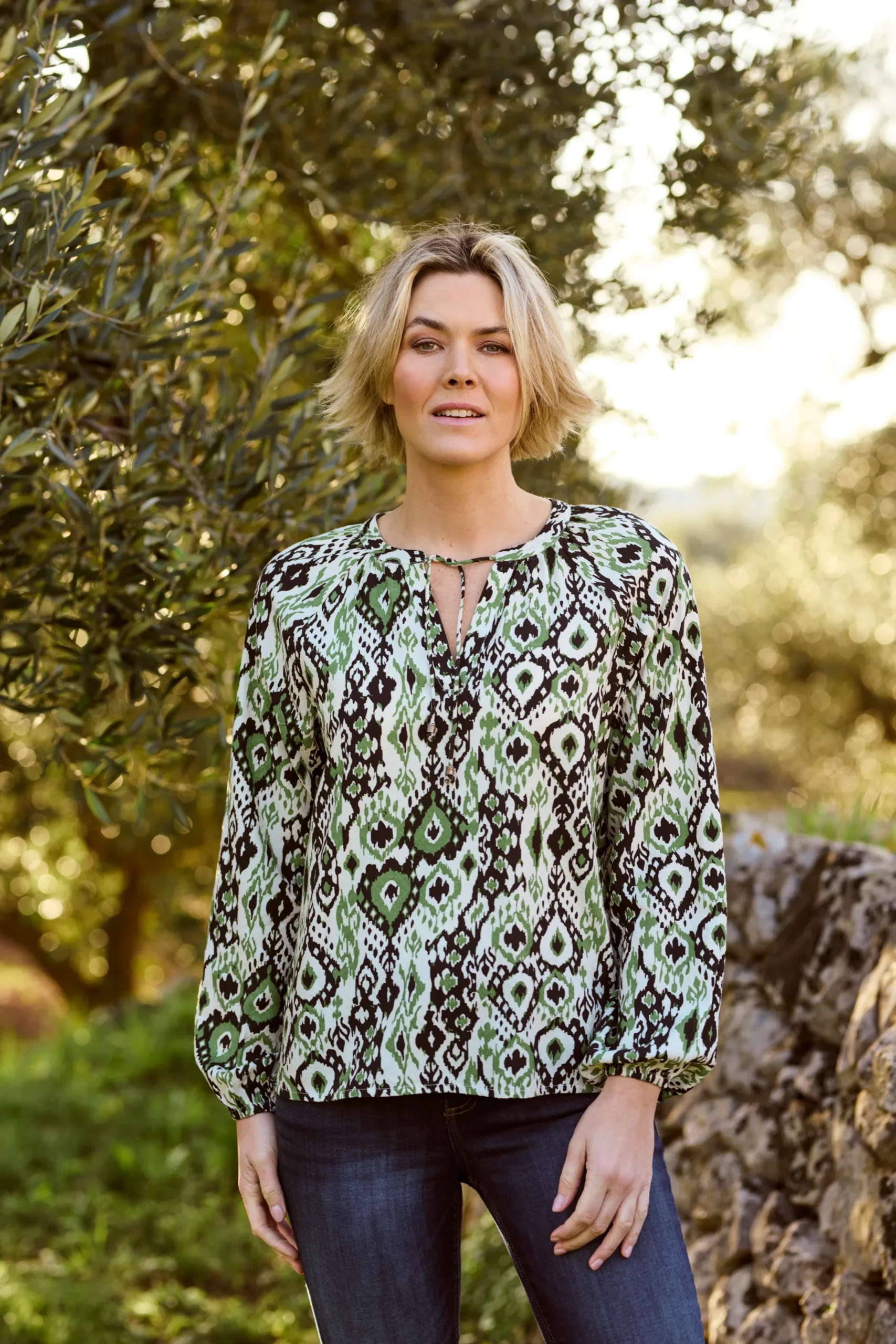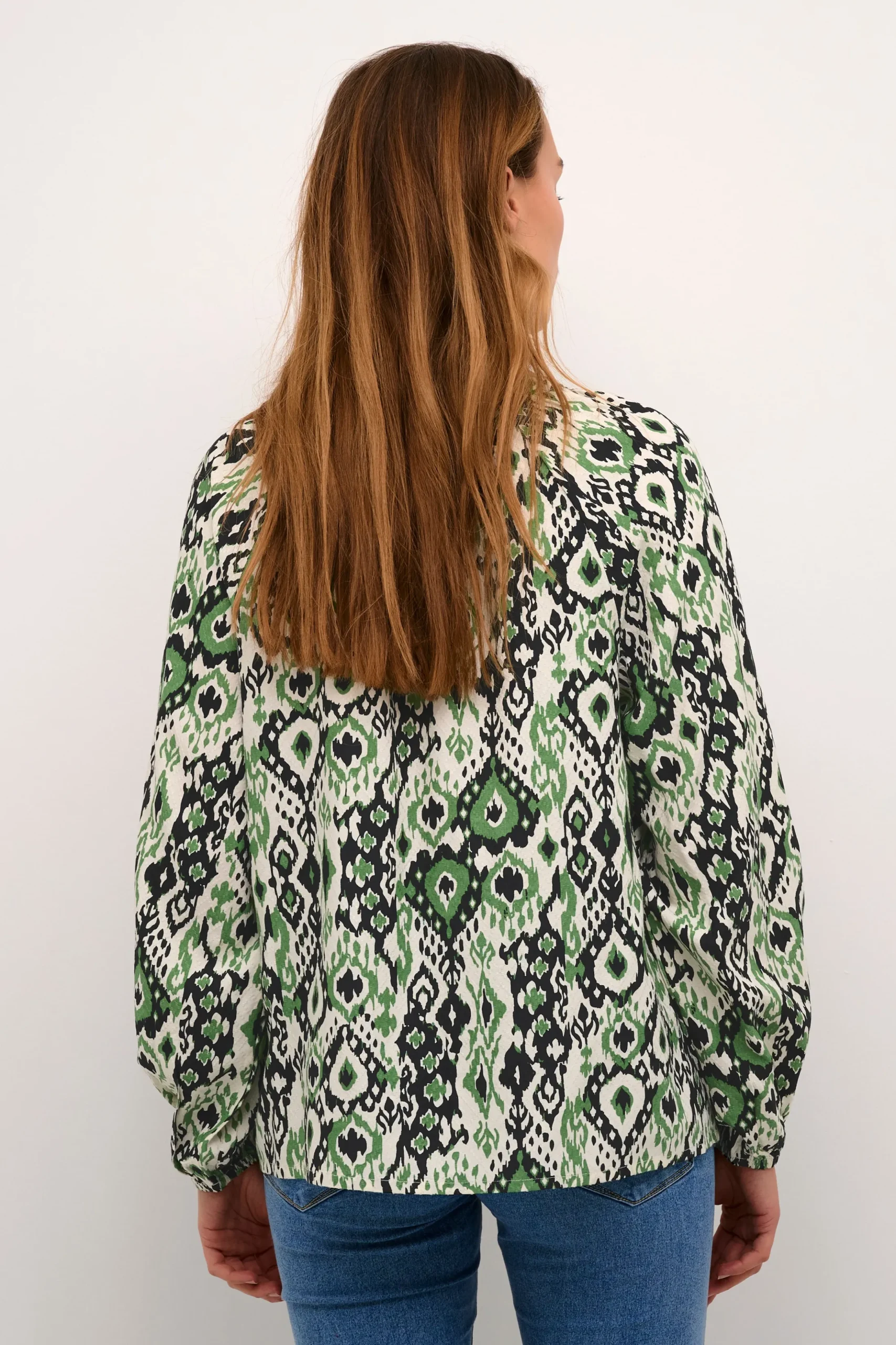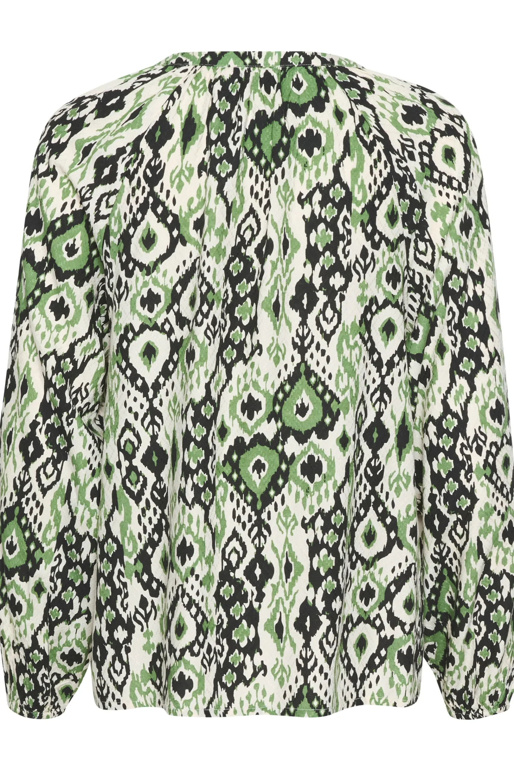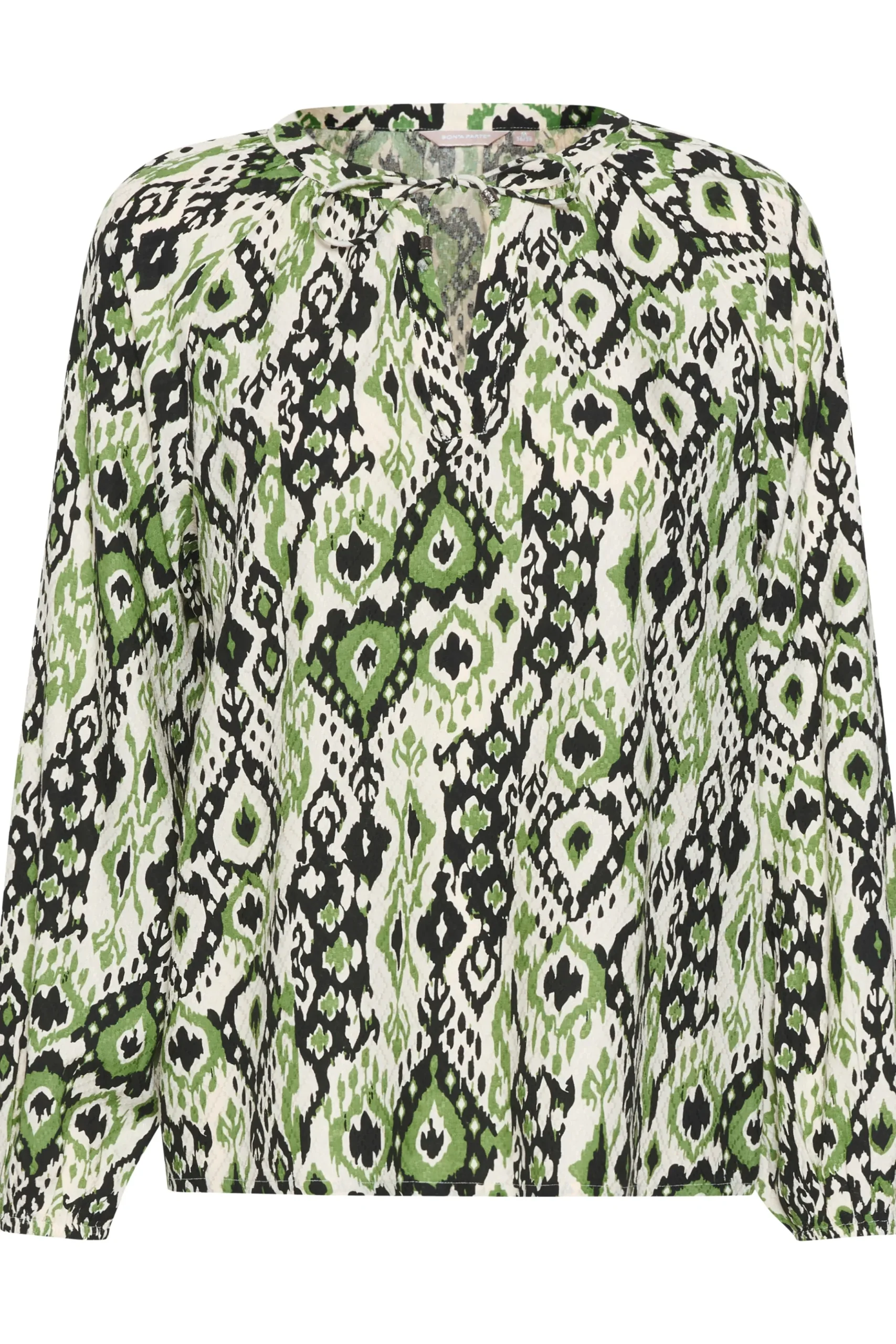 Forvandl din garderobe med denne etniske print bluse fra Bon’A Parte. Denne bluse er designet i en løs pasform, som passer perfekt til både casual og formelle lejligheder. Fremstillet af 100% viskose, er det blødt mod huden og holdbart for langvarig brug. Kvaliteten af vævet stof giver et ekstra touch af elegance, mens dens regulære længde og lange ærmer giver alsidighed til dit outfit valg. Par den med en matchende nederdel for et sofistikeret look eller skinny jeans for en mere afslappet vibe.\\n\\nFor det fulde look, kan du kombinere denne bluse med en strukturert jakke og pumps for kontoret, eller et par flade sko og en cardigan for en mere afslappet weekend. Denne bluse vil helt sikkert blive en uundværlig del af din garderobe.