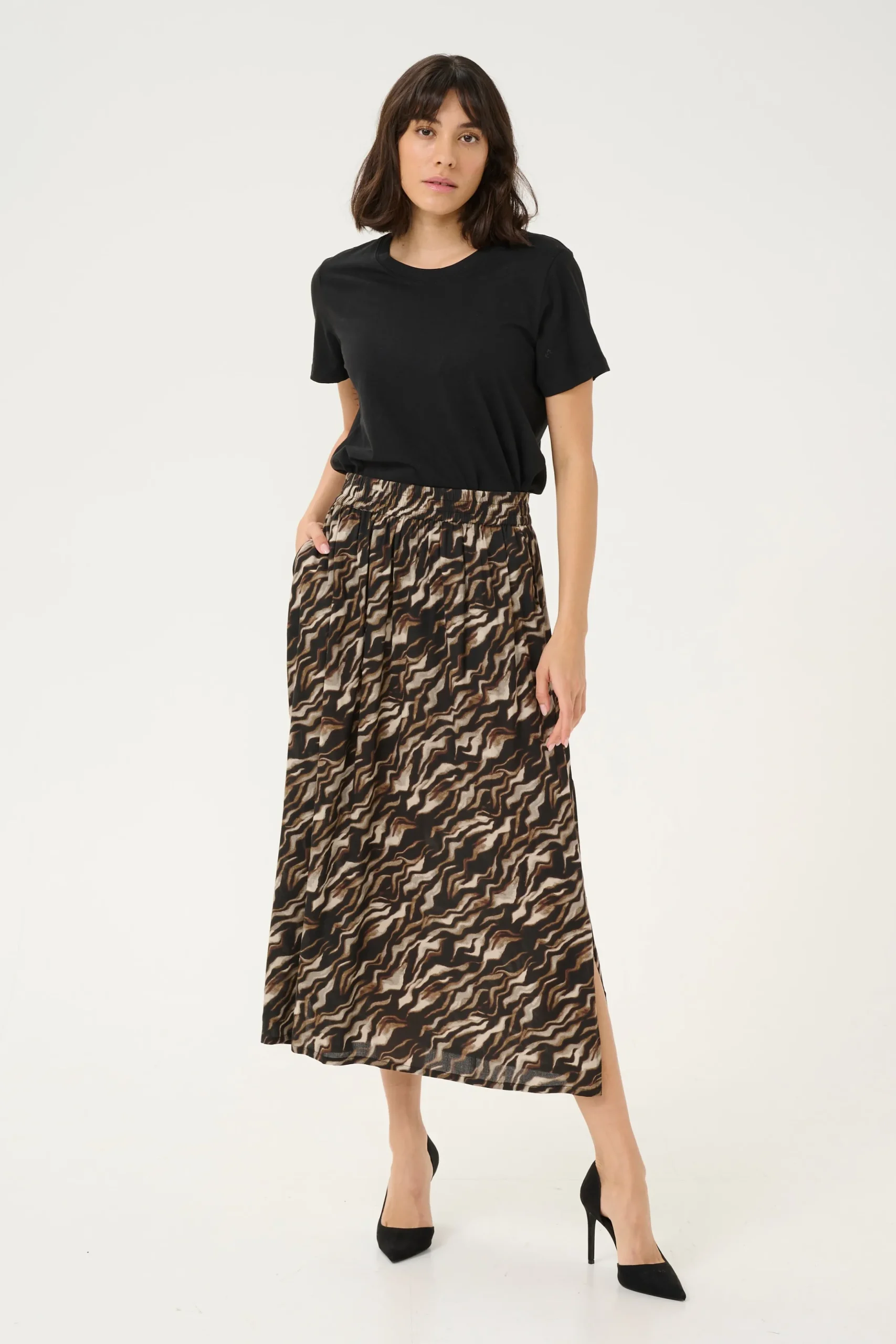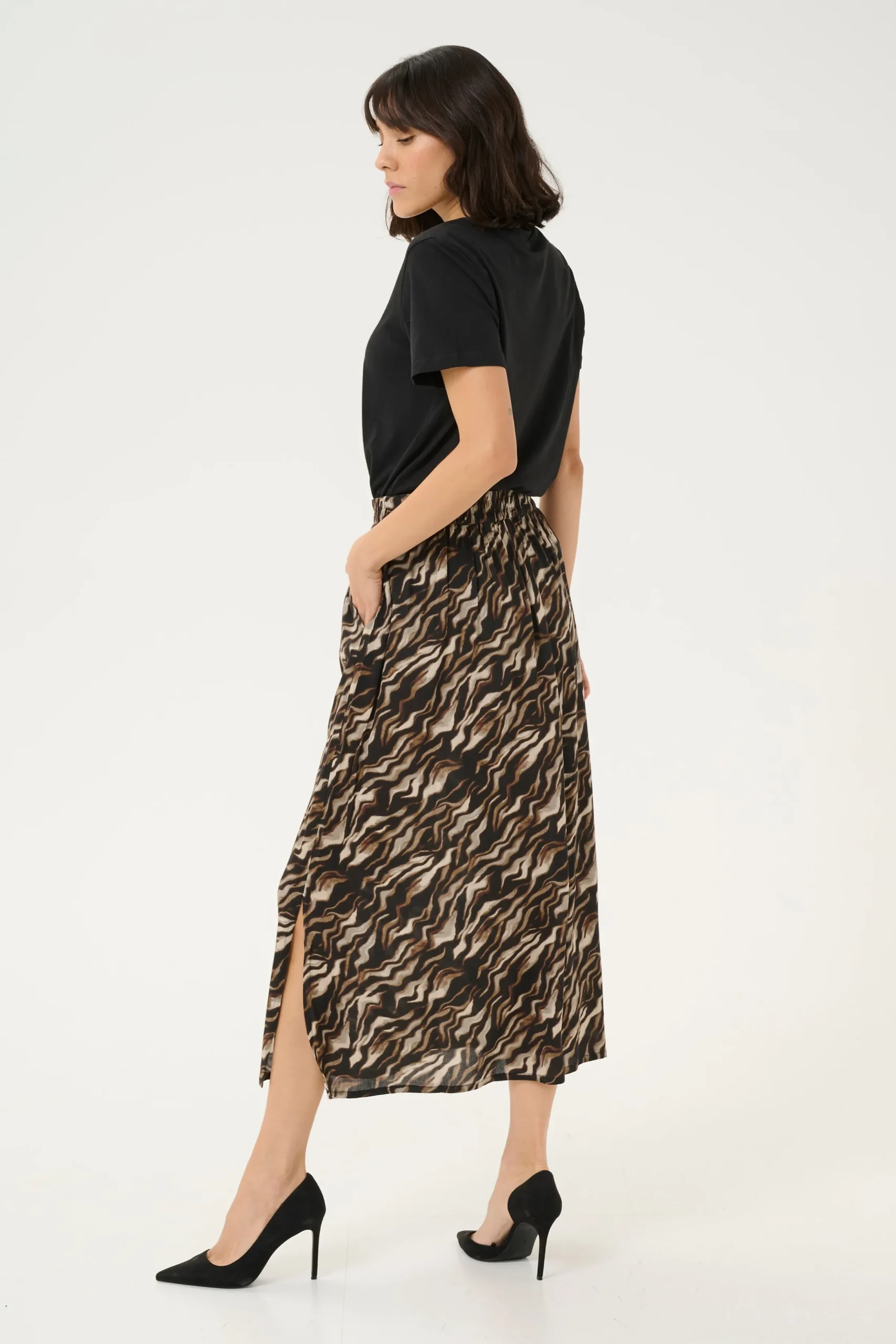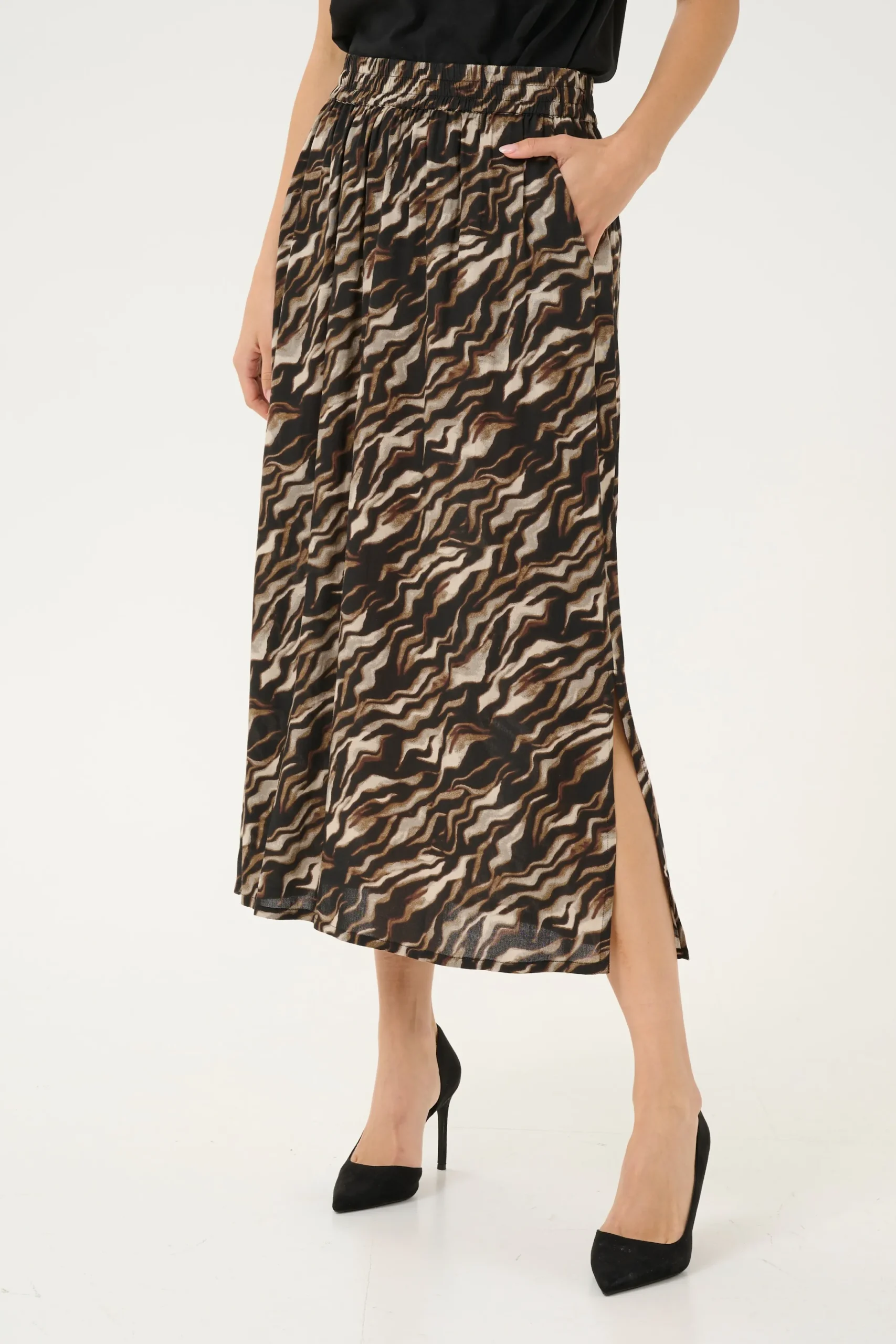Med Bon’A Partes vævede nederdel bliver din stil både praktisk og stilsikker. Denne A-formede nederdel har elastik i taljen, hvilket sikrer en behagelig pasform gennem hele dagen. Midi længden giver et afslappet look, mens materialet af 100% viskose (LENZING 邃år for den høje kvalitet.