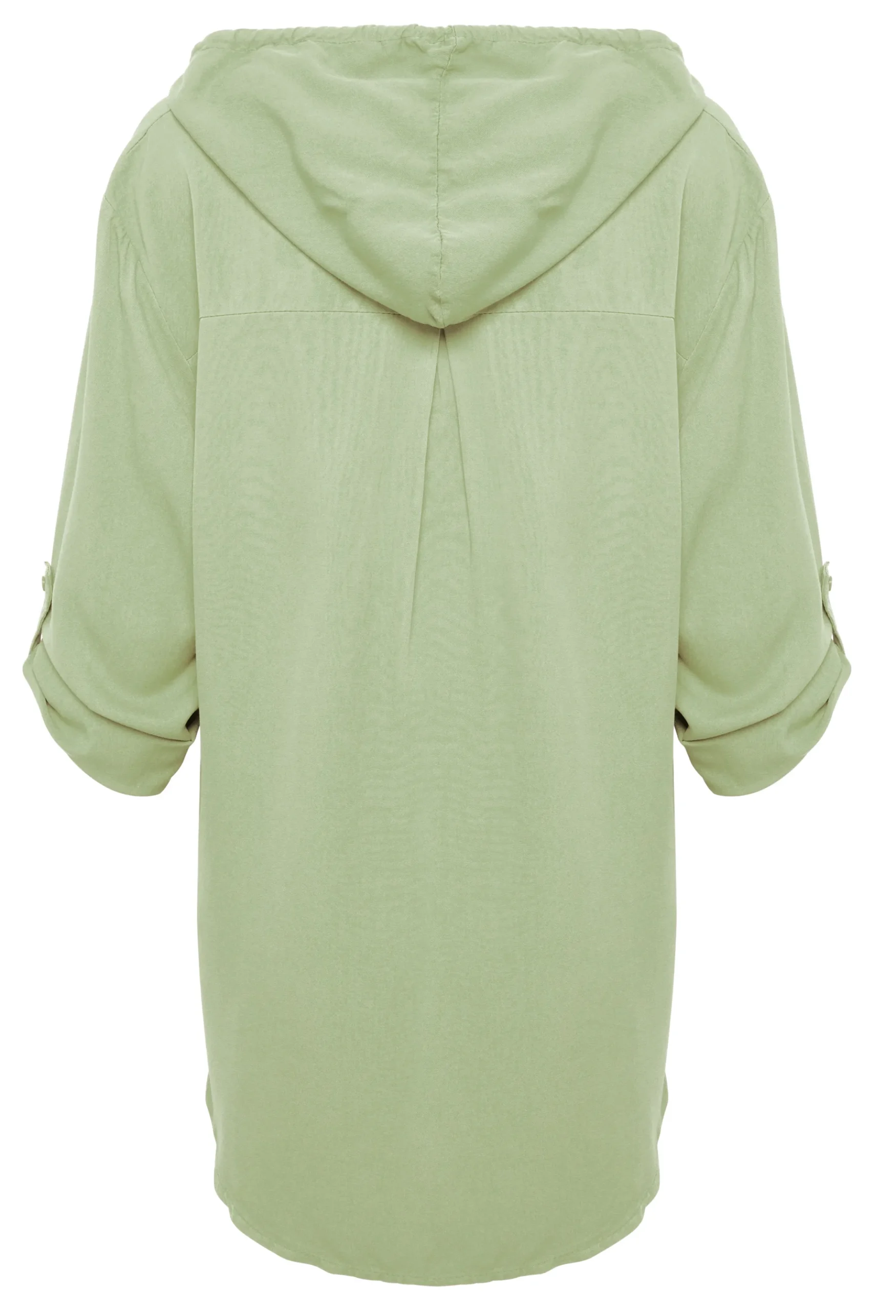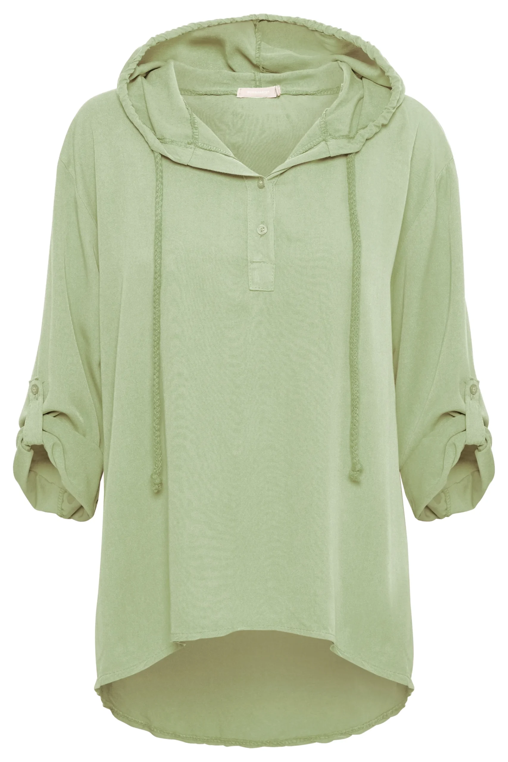 Bluse fra BON’A PARTE med hætte og snøre. Stolpelukning med knapper. Vævet kvalitet. Normal pasform.