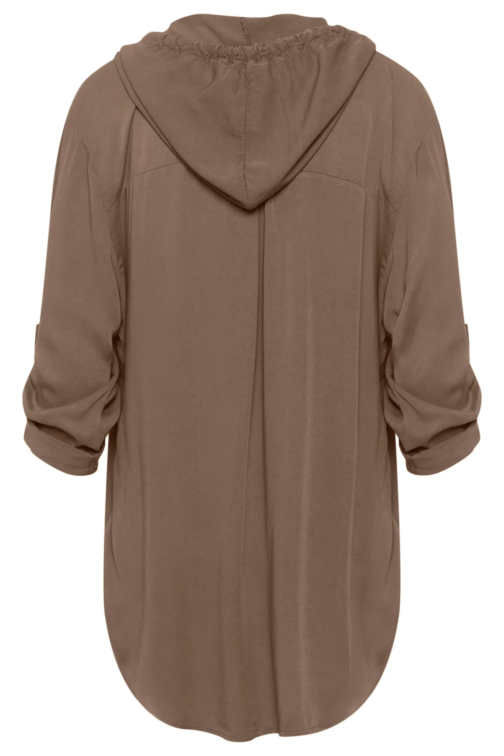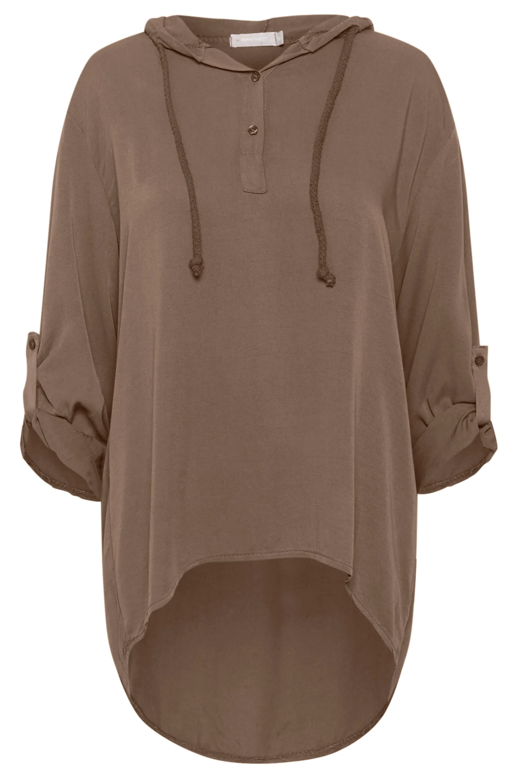 Bluse fra BON’A PARTE med hætte og snøre. Stolpelukning med knapper. Vævet kvalitet. Normal pasform.