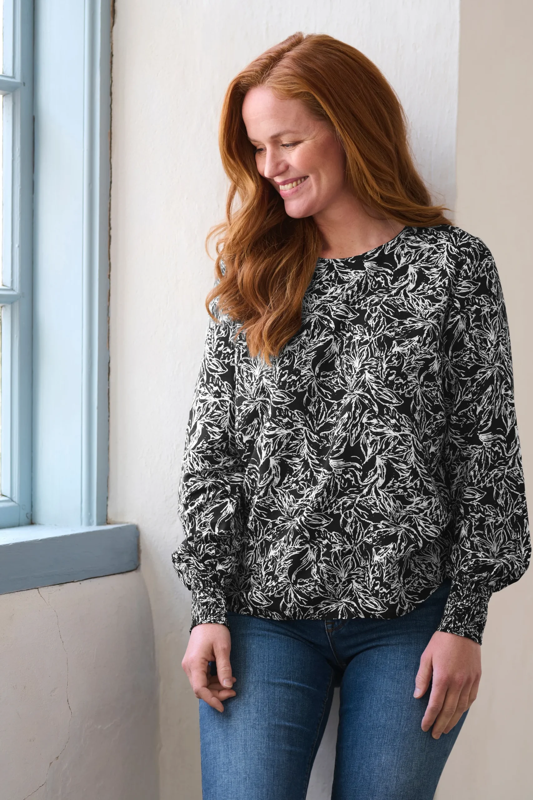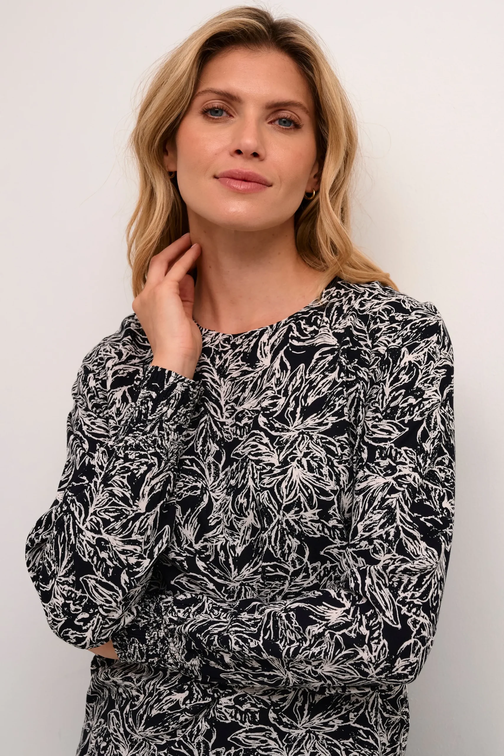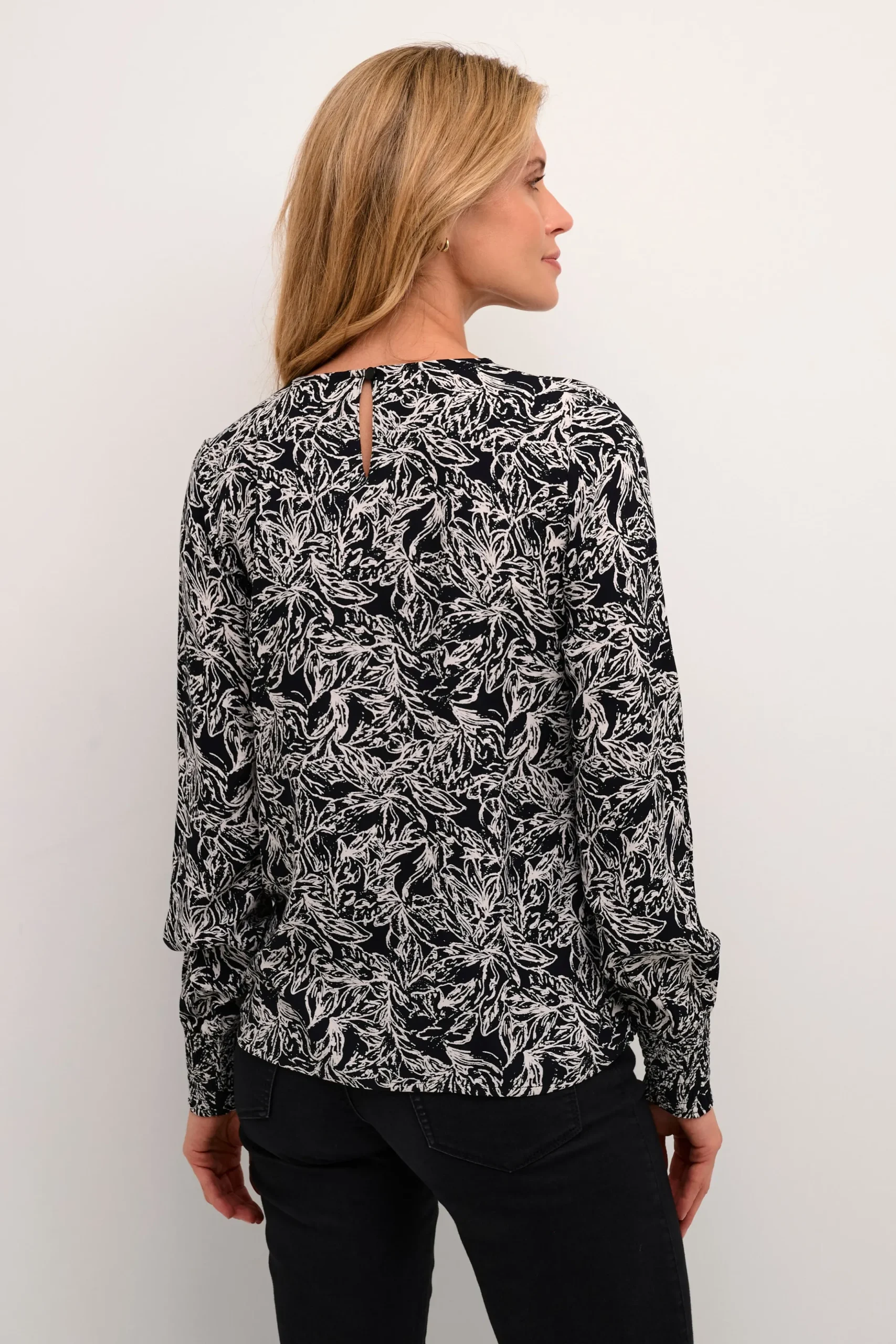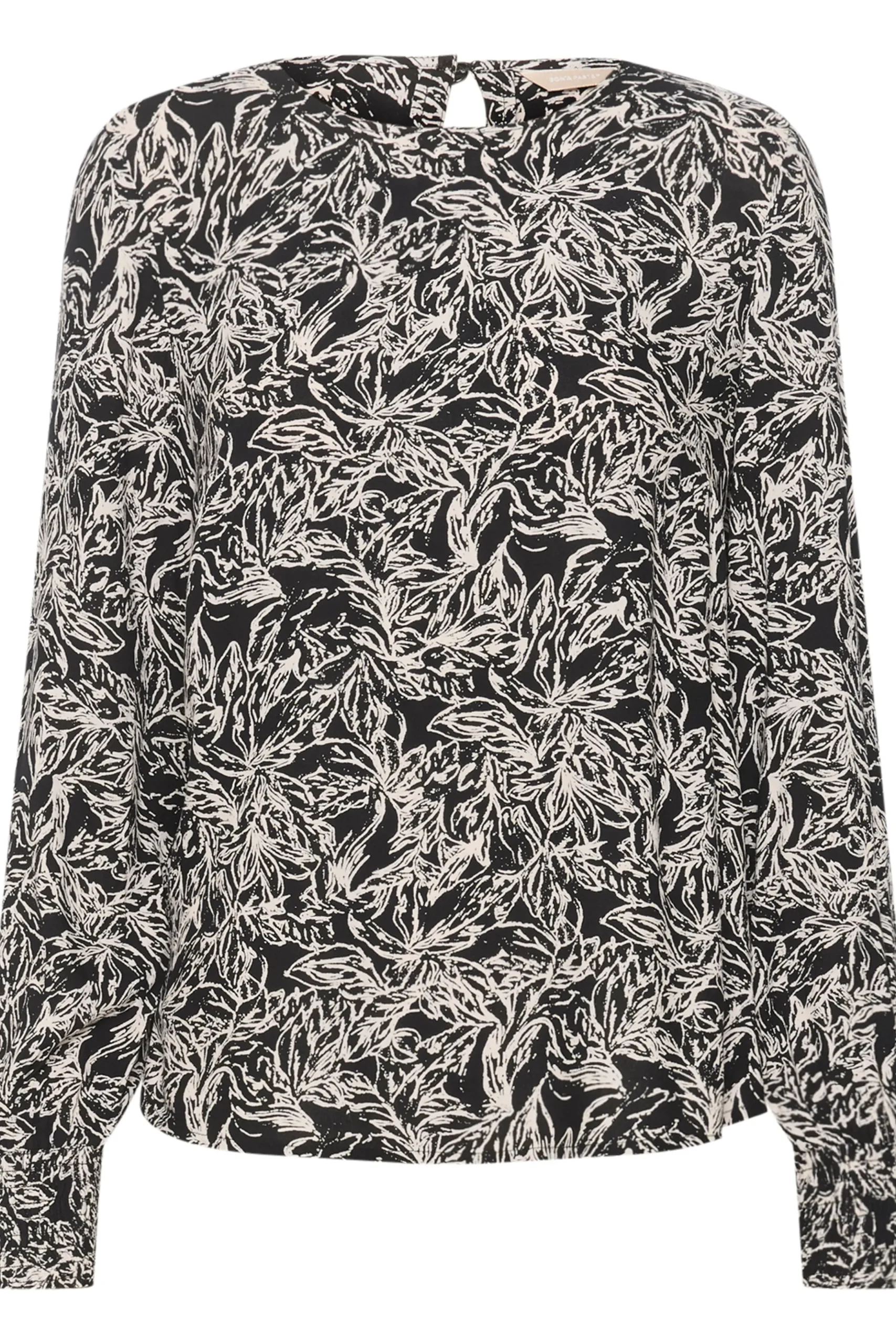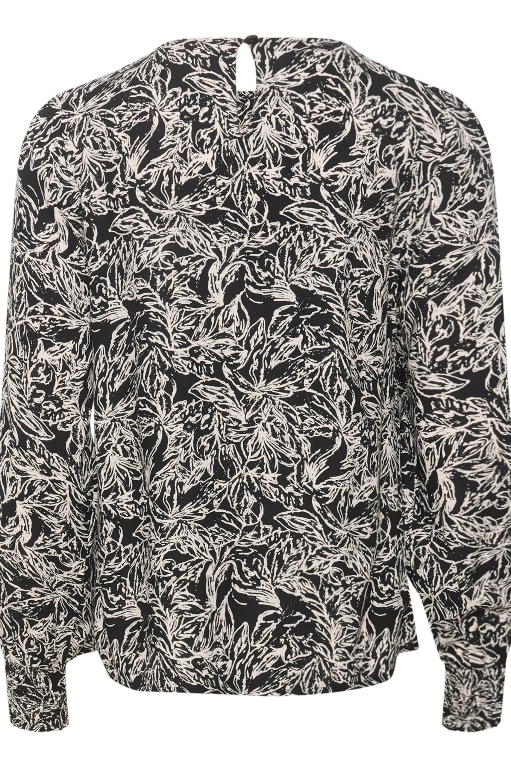 Bluse fra BON’A PARTE med rund hals. Lange ærmer med smockkant. Slids i nakke med knap. All-over print. Vævet kvalitet. Normal pasform.\\n