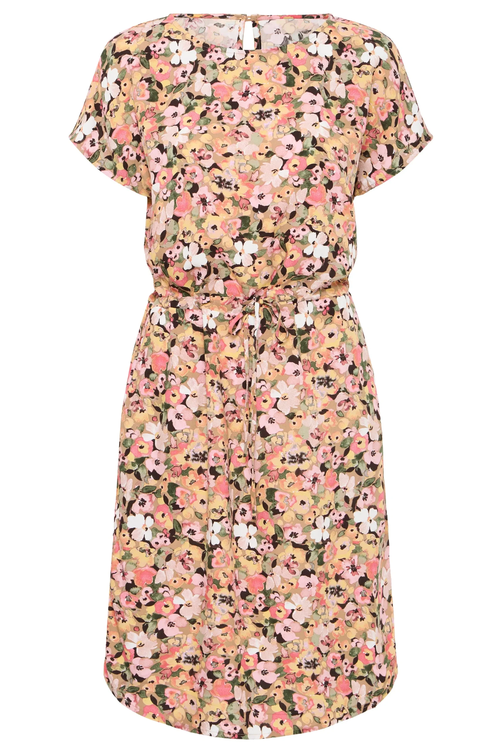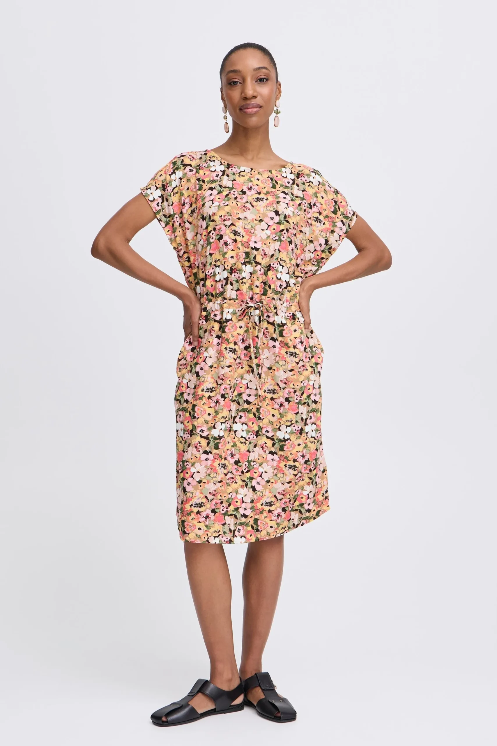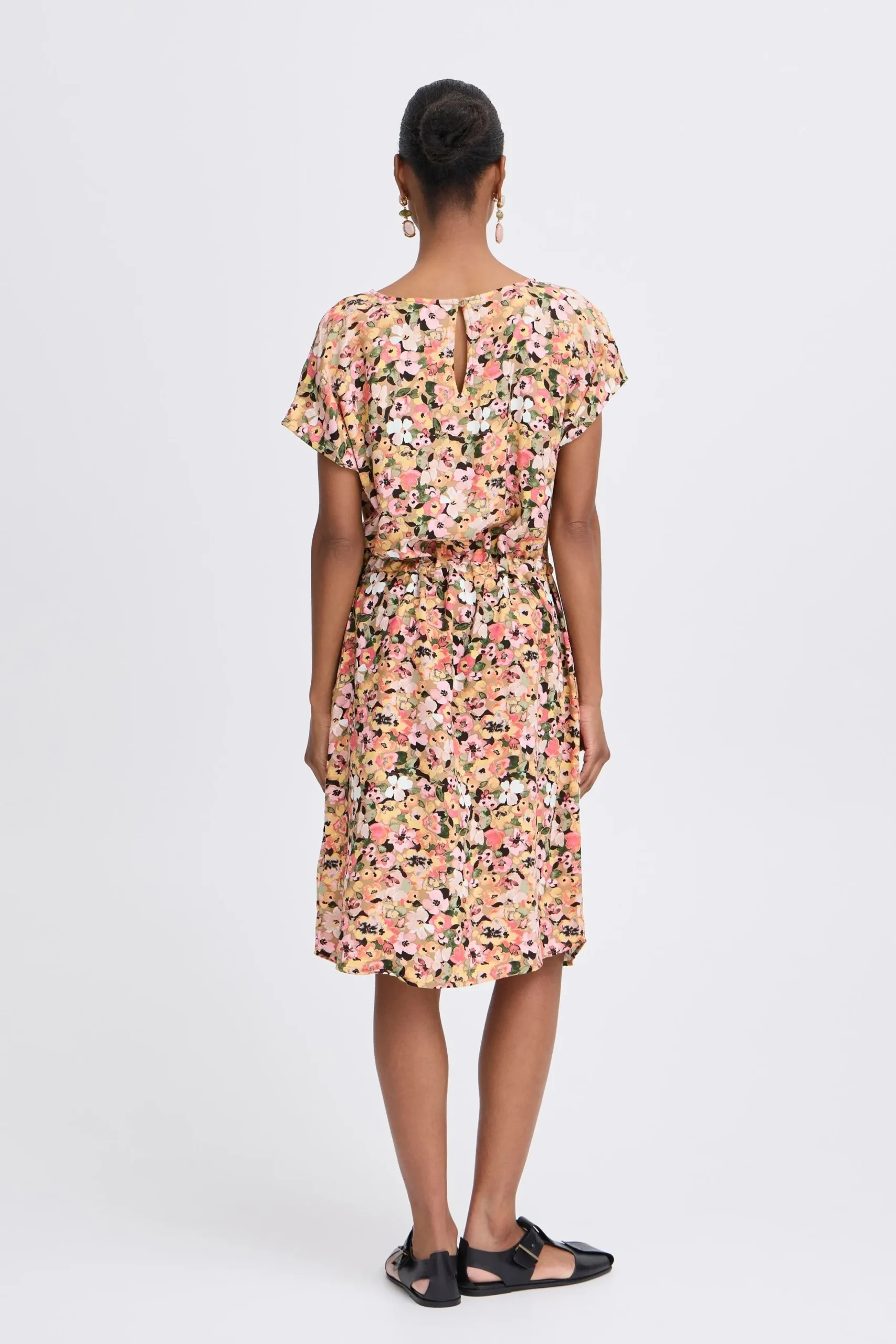 Kjole fra b.young med rund hals. Korte vingeærmer. Slids i nakke med knap. Overskæring samt bindebånd i taljen. Sidelommer. Let vævet kvalitet. Kjolen fra b.young har normal pasform.
