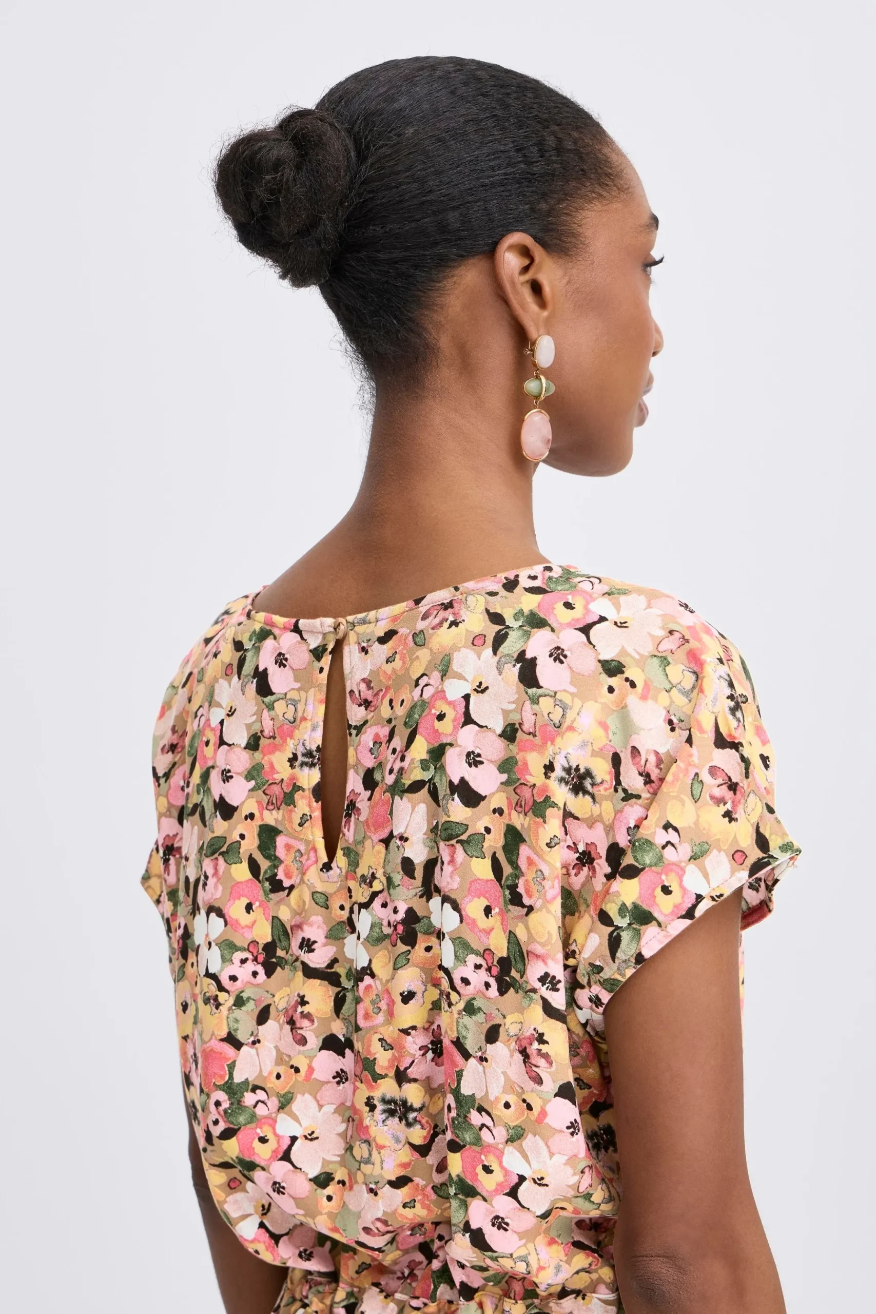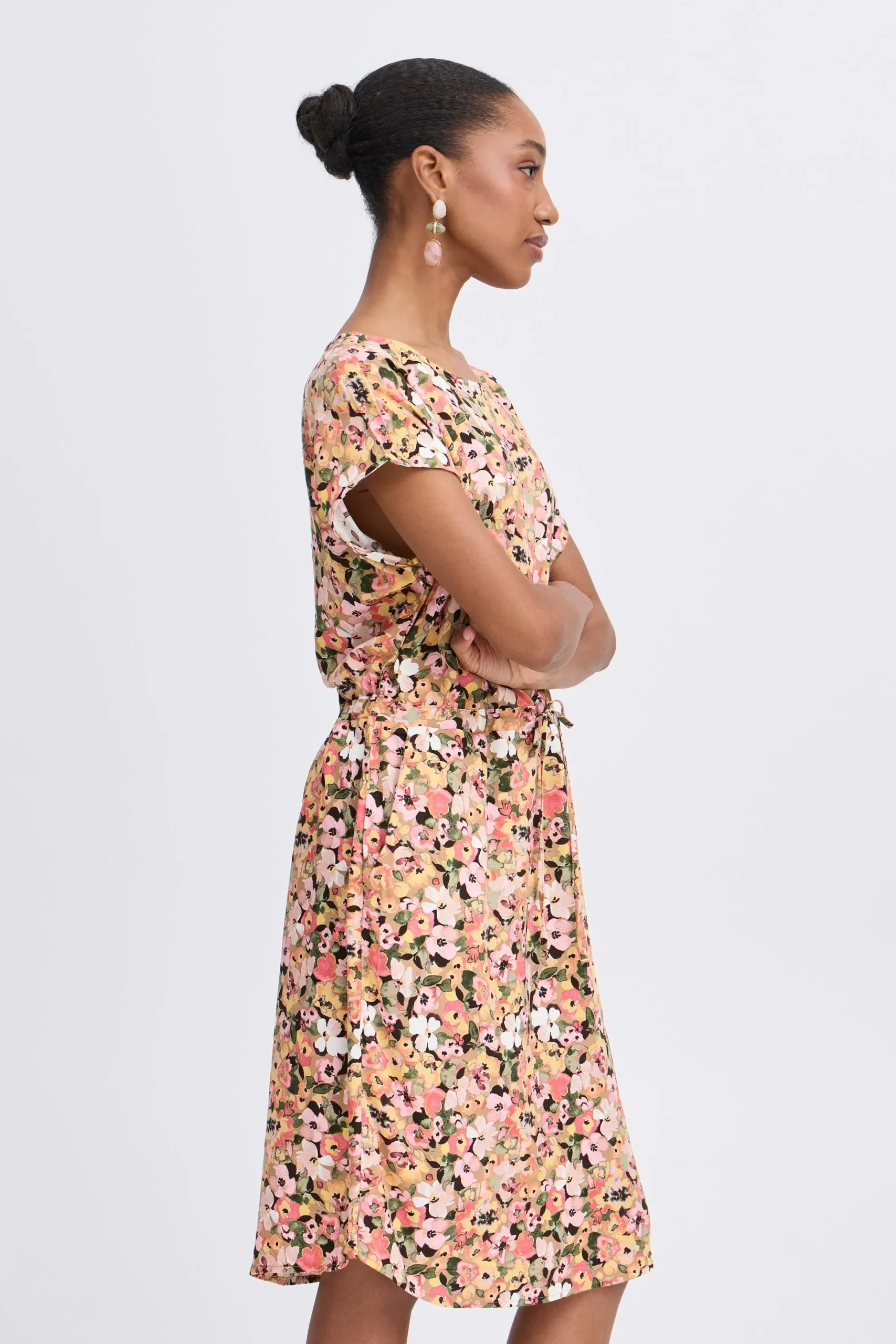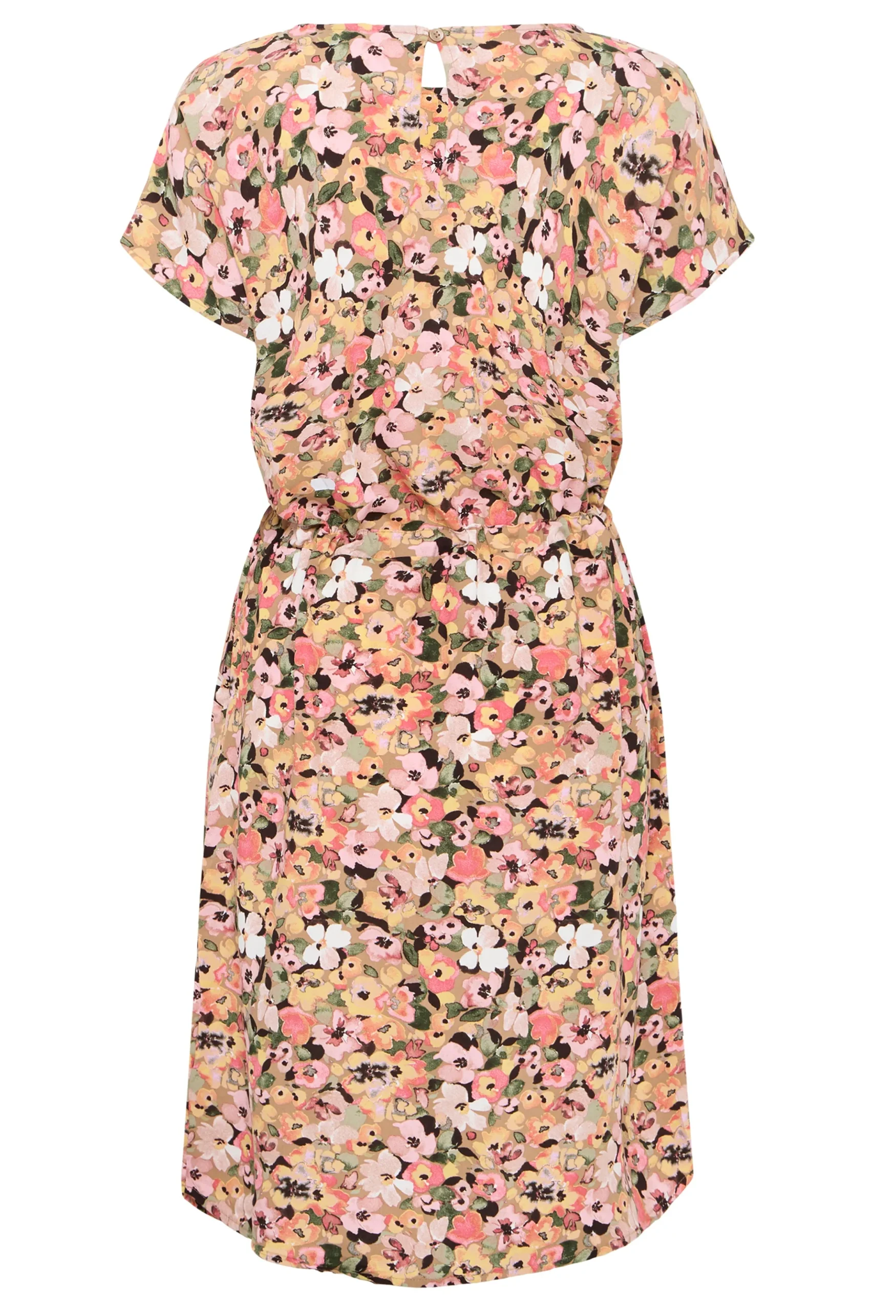 Kjole fra b.young med rund hals. Korte vingeærmer. Slids i nakke med knap. Overskæring samt bindebånd i taljen. Sidelommer. Let vævet kvalitet. Kjolen fra b.young har normal pasform.