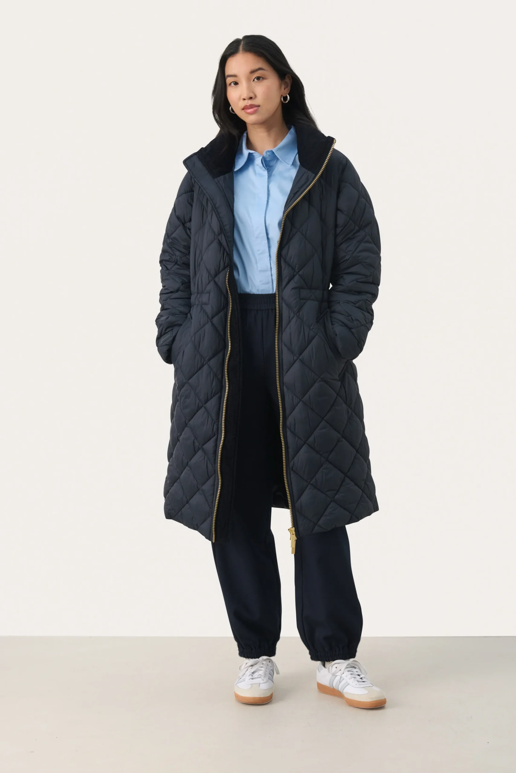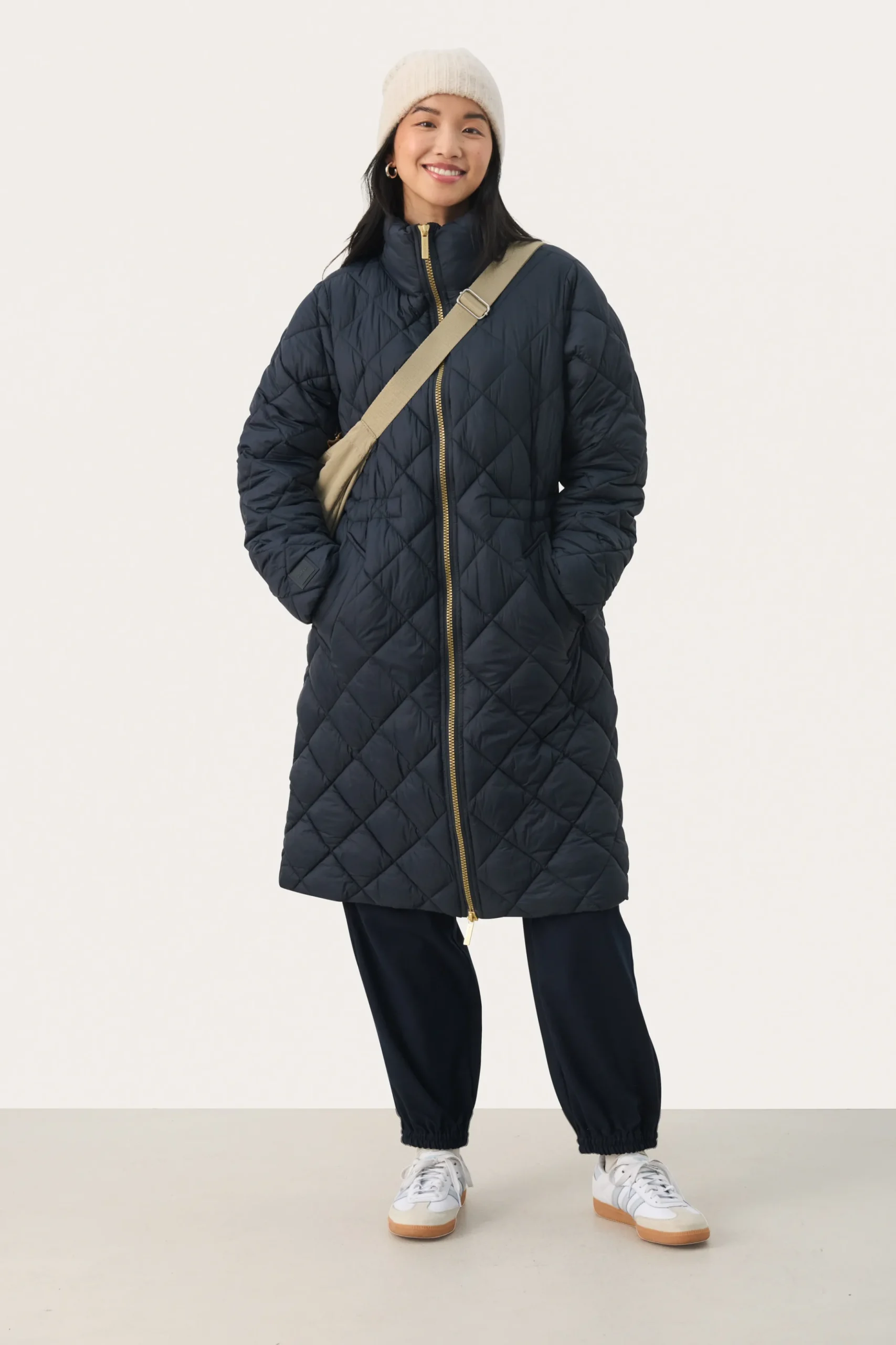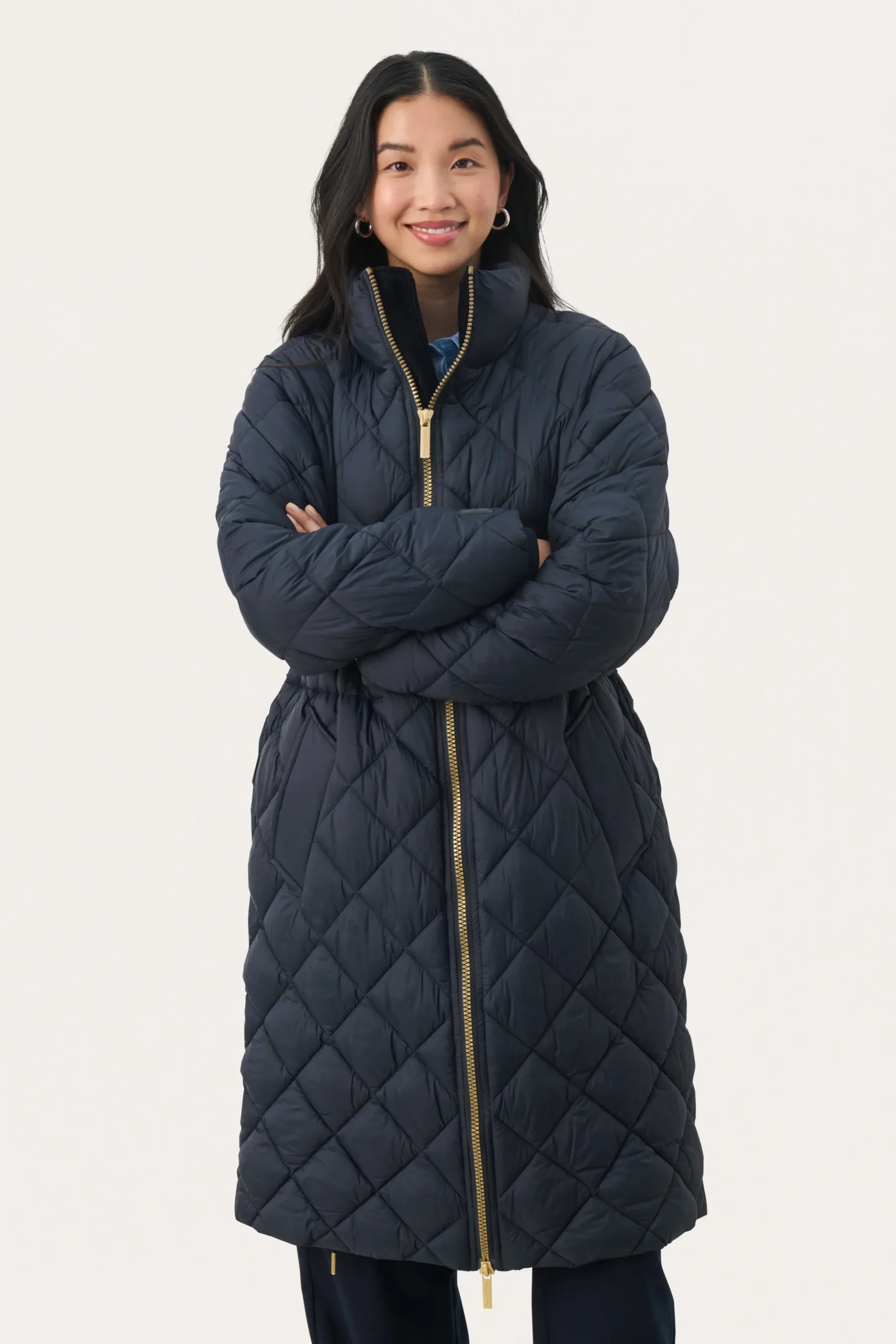 Modellen er 174 cm høj og er iført en størrelse 36.\\n\\nVores lange quiltede jakke er designet til at holde dig varm og stilfuld. Den har en rummelig pasform, høj krave og praktiske sidelommer. Fremstillet af letvægtsmaterialer, der sikrer komfort hele dagen. Perfekt til både hverdagsbrug og særlige lejligheder i de kolde måneder.