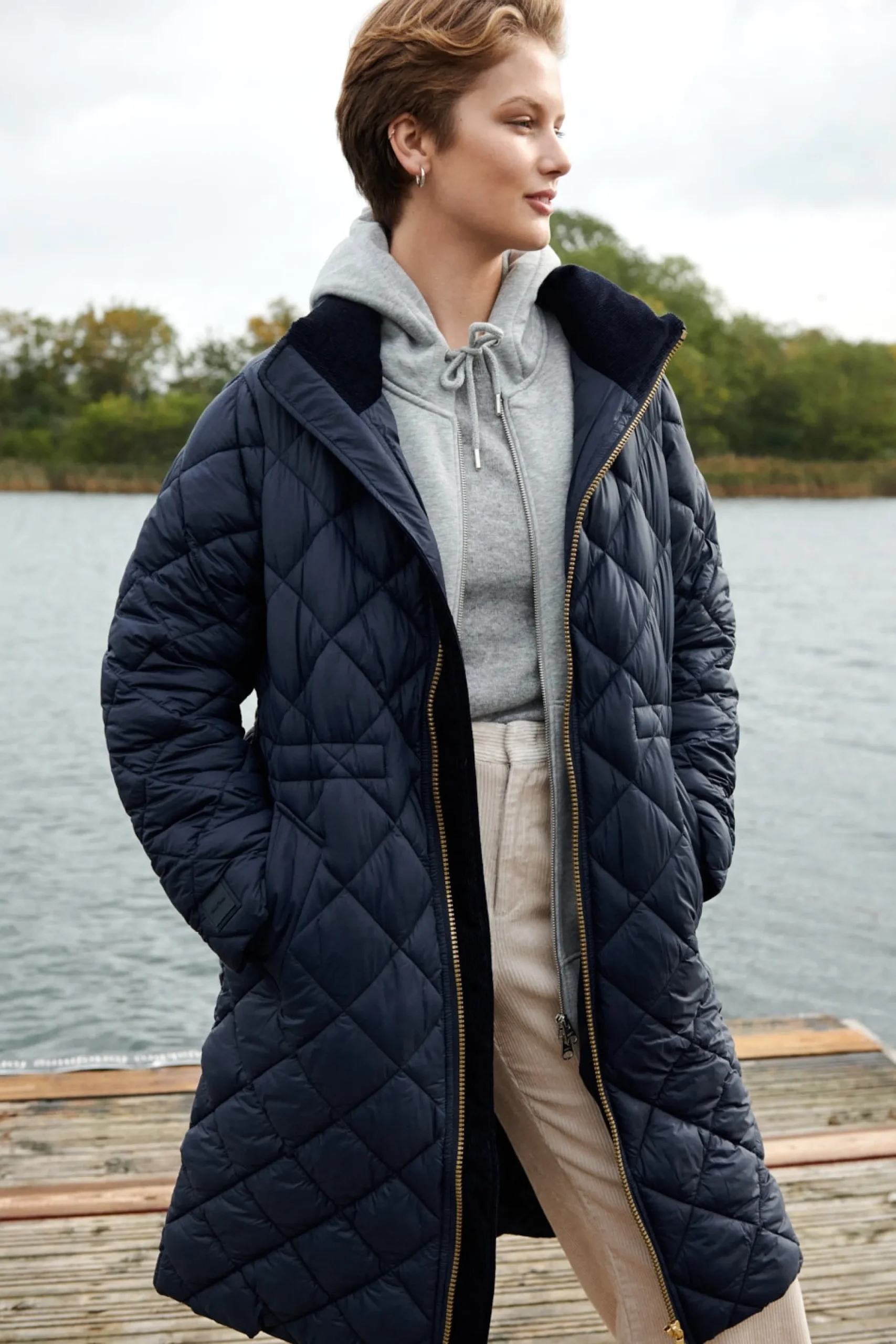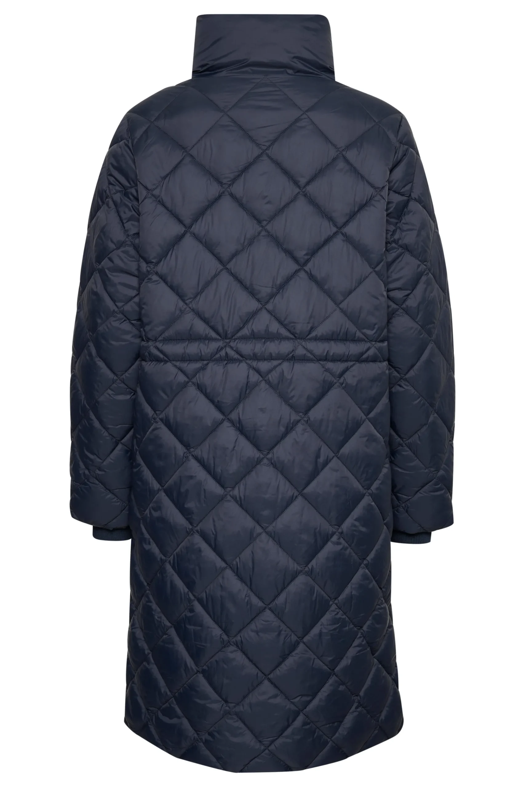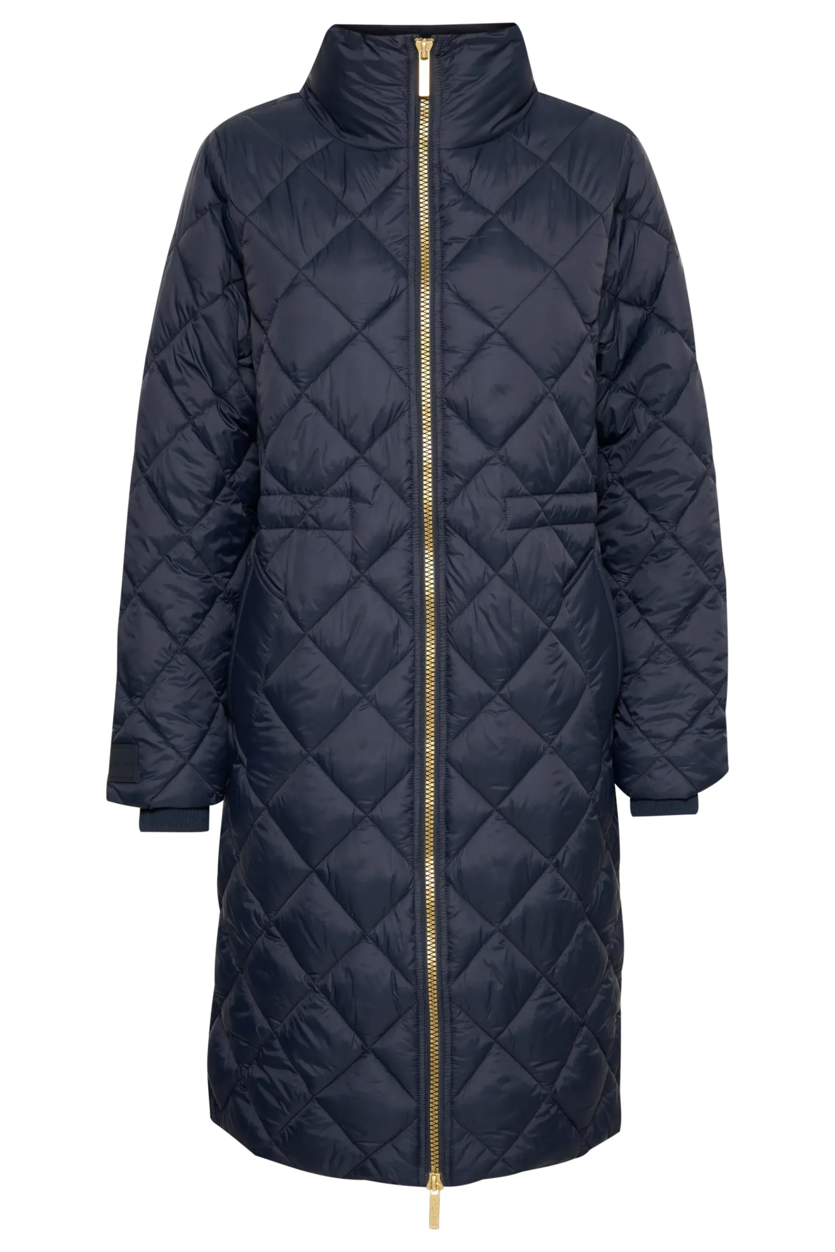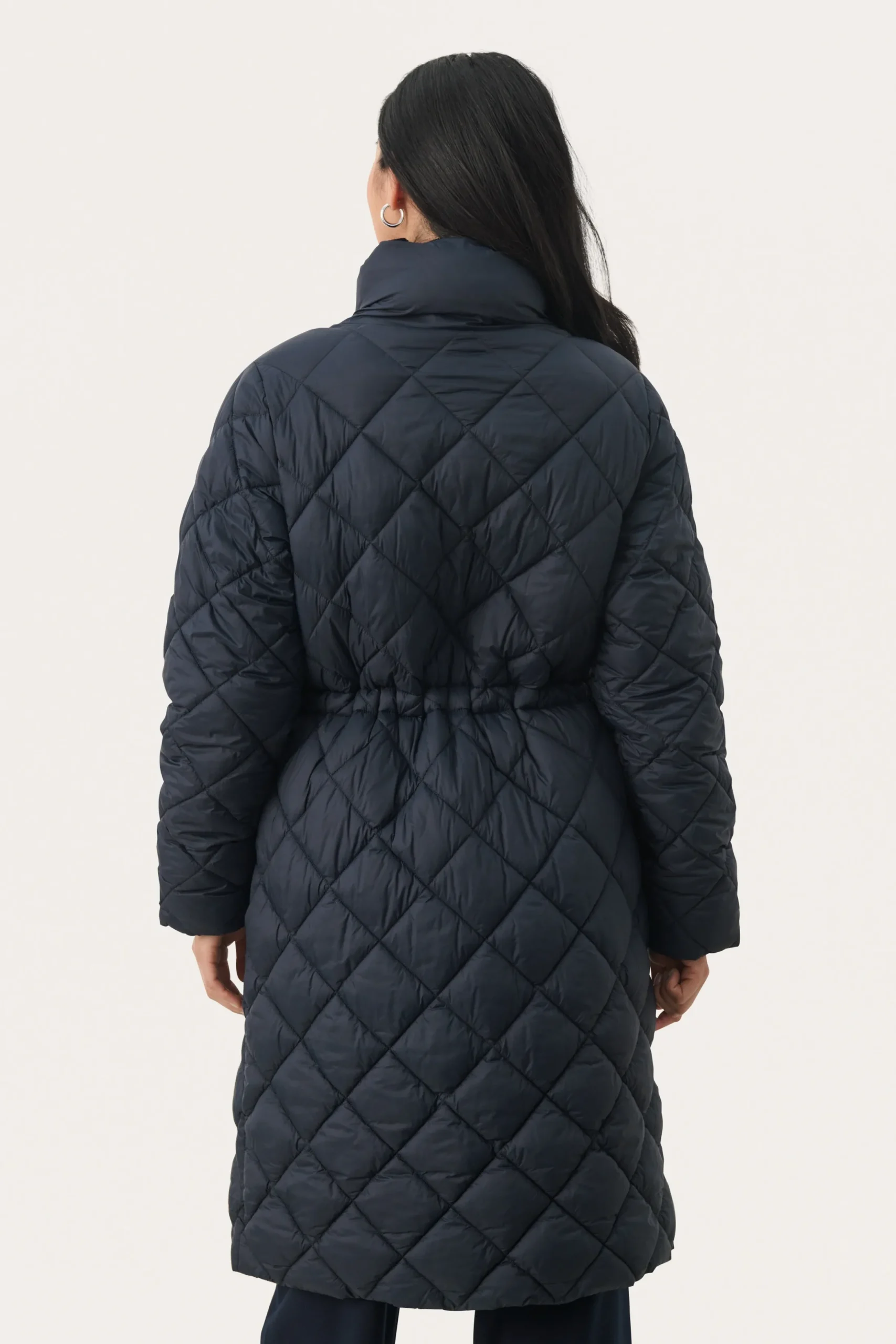 Modellen er 174 cm høj og er iført en størrelse 36.\\n\\nVores lange quiltede jakke er designet til at holde dig varm og stilfuld. Den har en rummelig pasform, høj krave og praktiske sidelommer. Fremstillet af letvægtsmaterialer, der sikrer komfort hele dagen. Perfekt til både hverdagsbrug og særlige lejligheder i de kolde måneder.