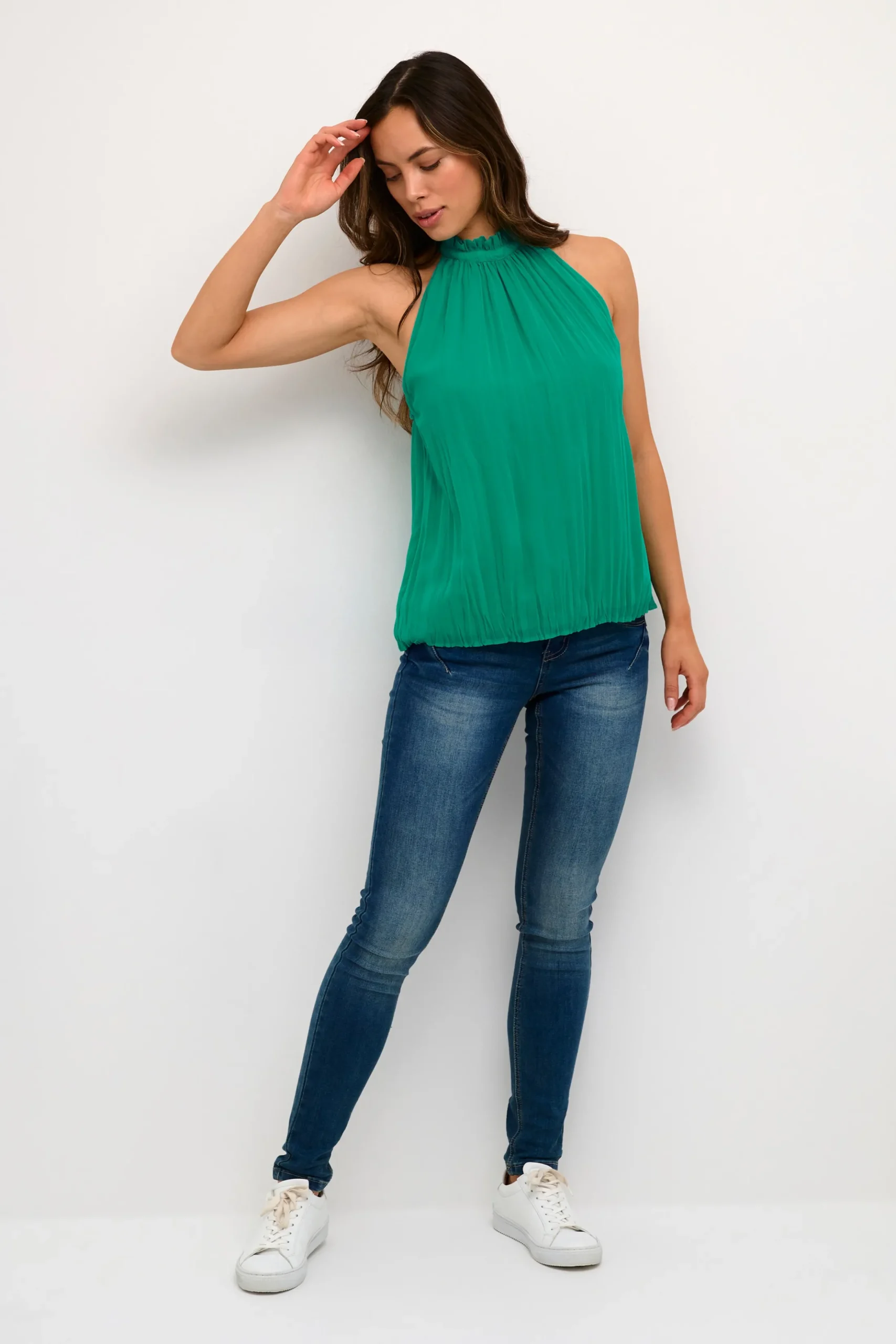 Top fra cream med rund flæsehals. Bindebånd i nakken. Vævet crinklet kvalitet. A-form.