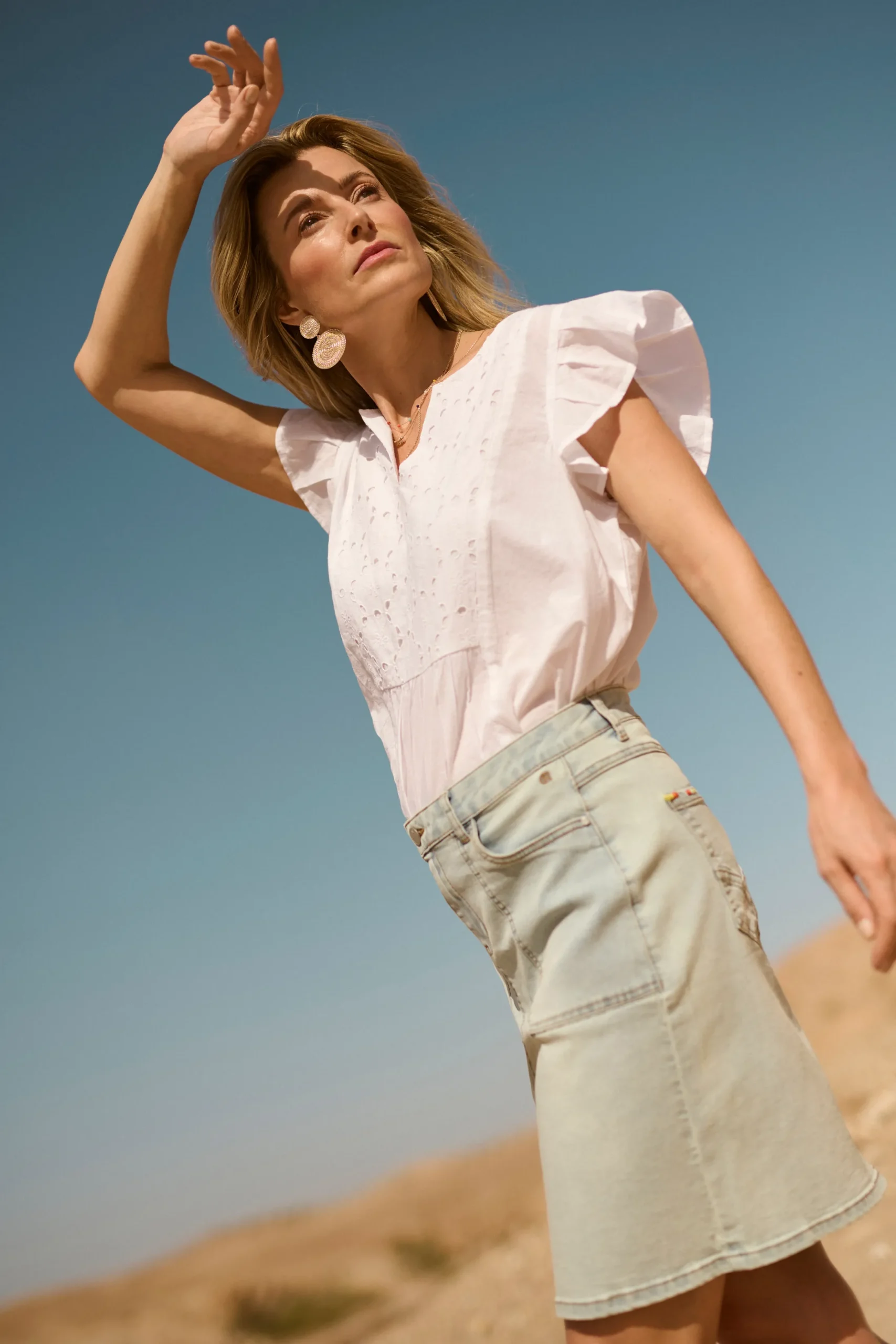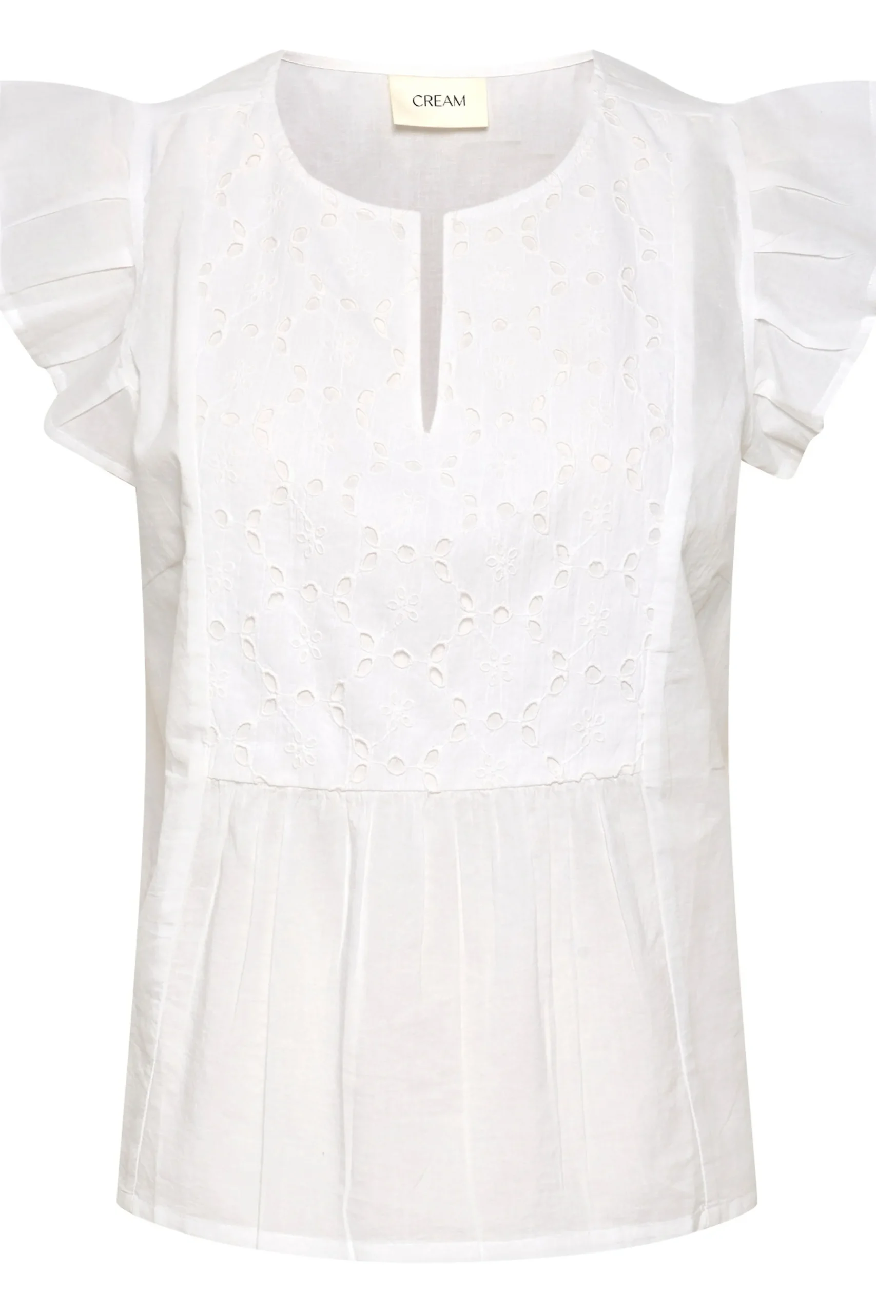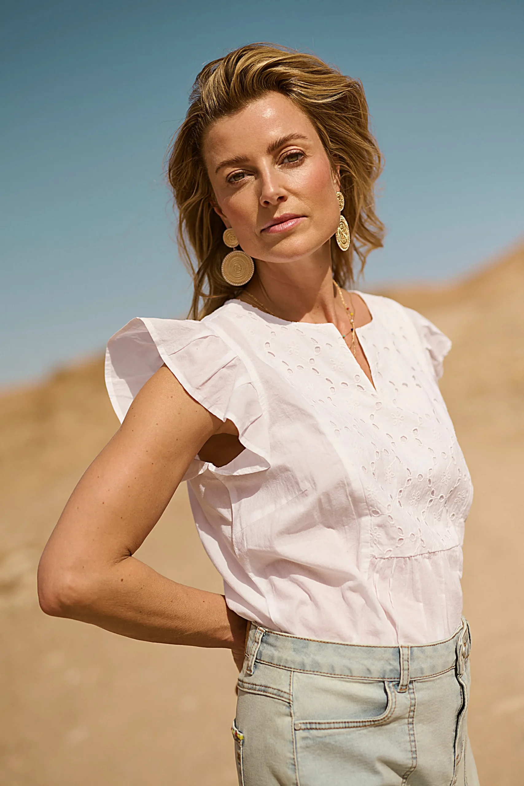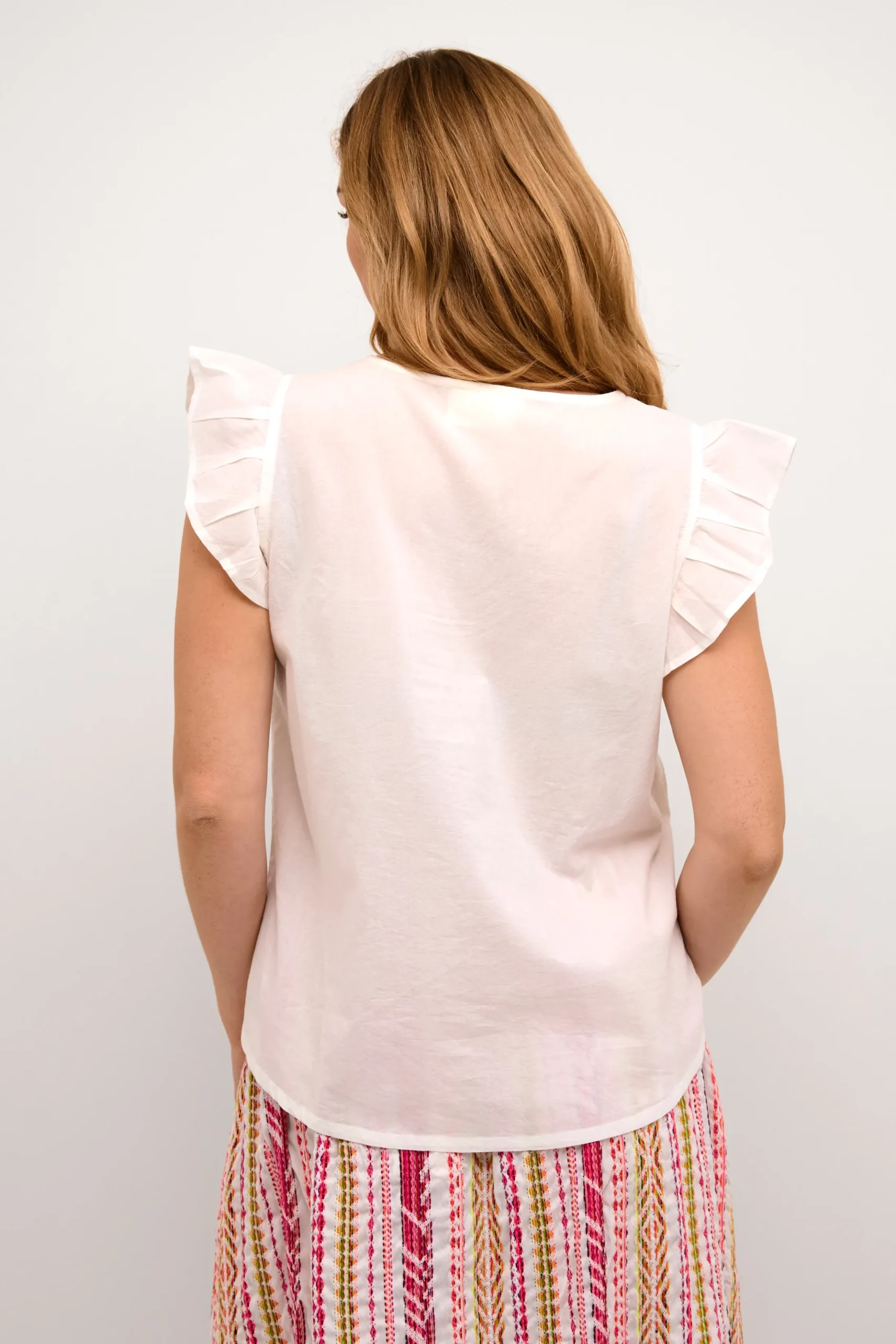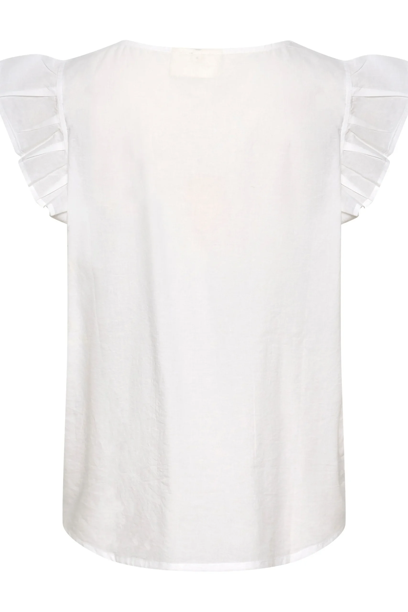 Oplev elegant stil med denne dristige ærmeløse bluse. Fremstillet i vævet kvalitet, har den A-form og hip længde, der giver en flatterende silhuet. Ærmernes detaljer tilføjer charme og kan styles med jeans eller en højtaljet nederdel.\\n\\nModellen er 177 cm høj og er iført en størrelse 38/M.