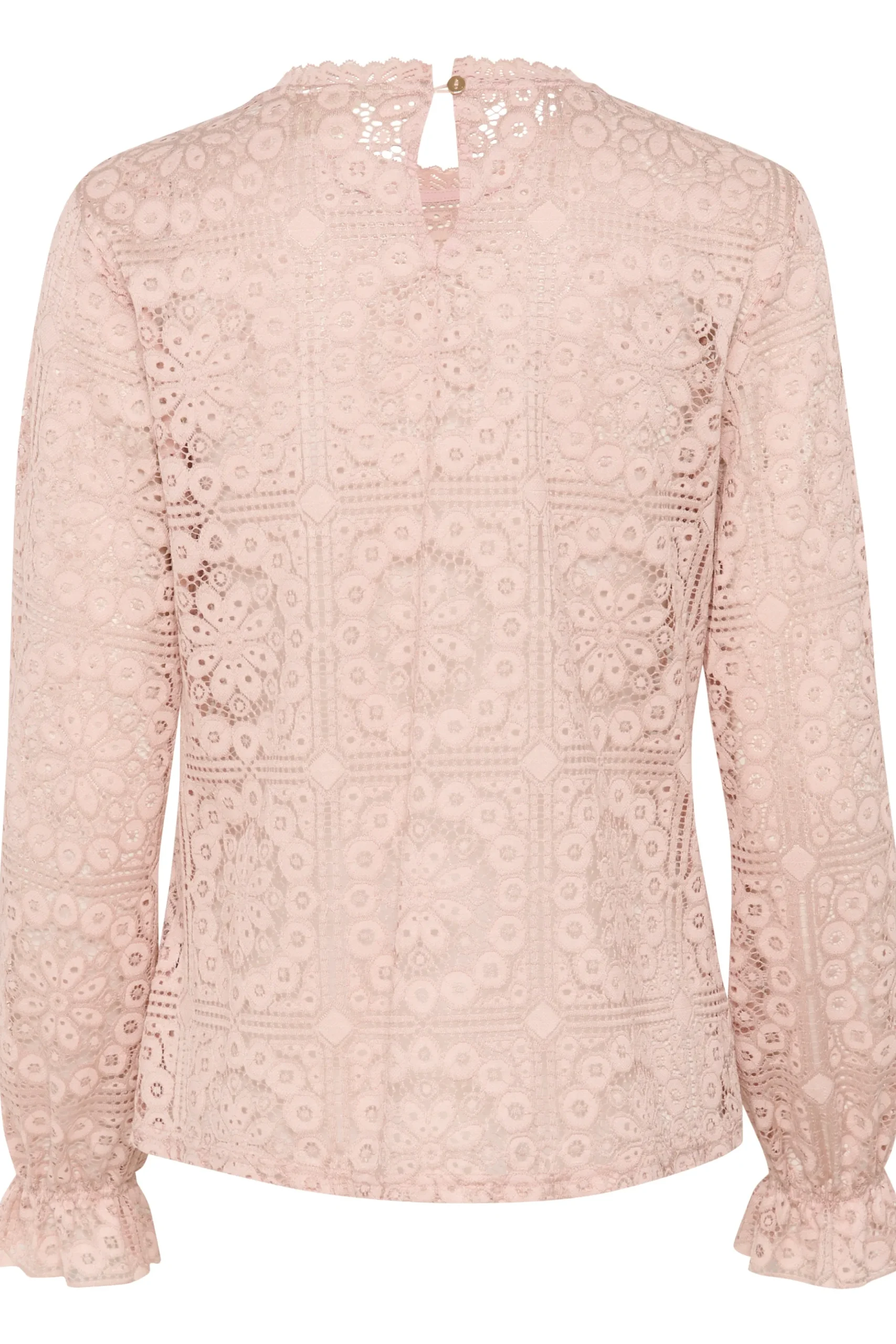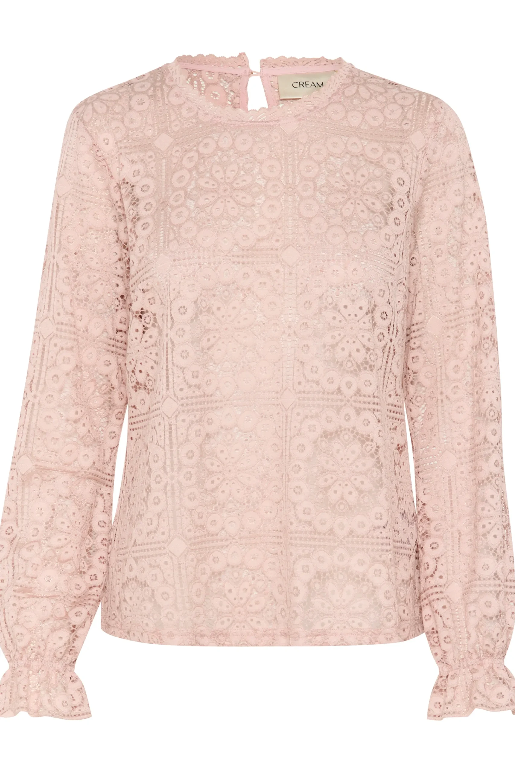 Blondebluse fra cream med rund hals. Lange ærmer med elastik og flæse. Slids i nakke med knap. Jerseykvalitet. Blondeblusen fra cream har normal pasform.