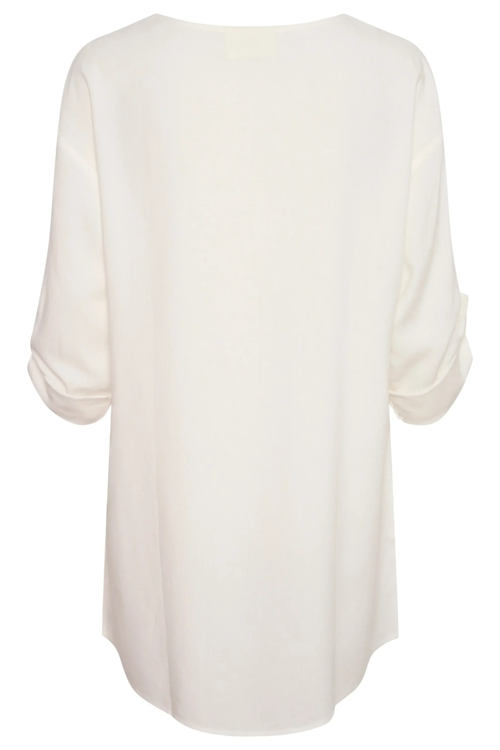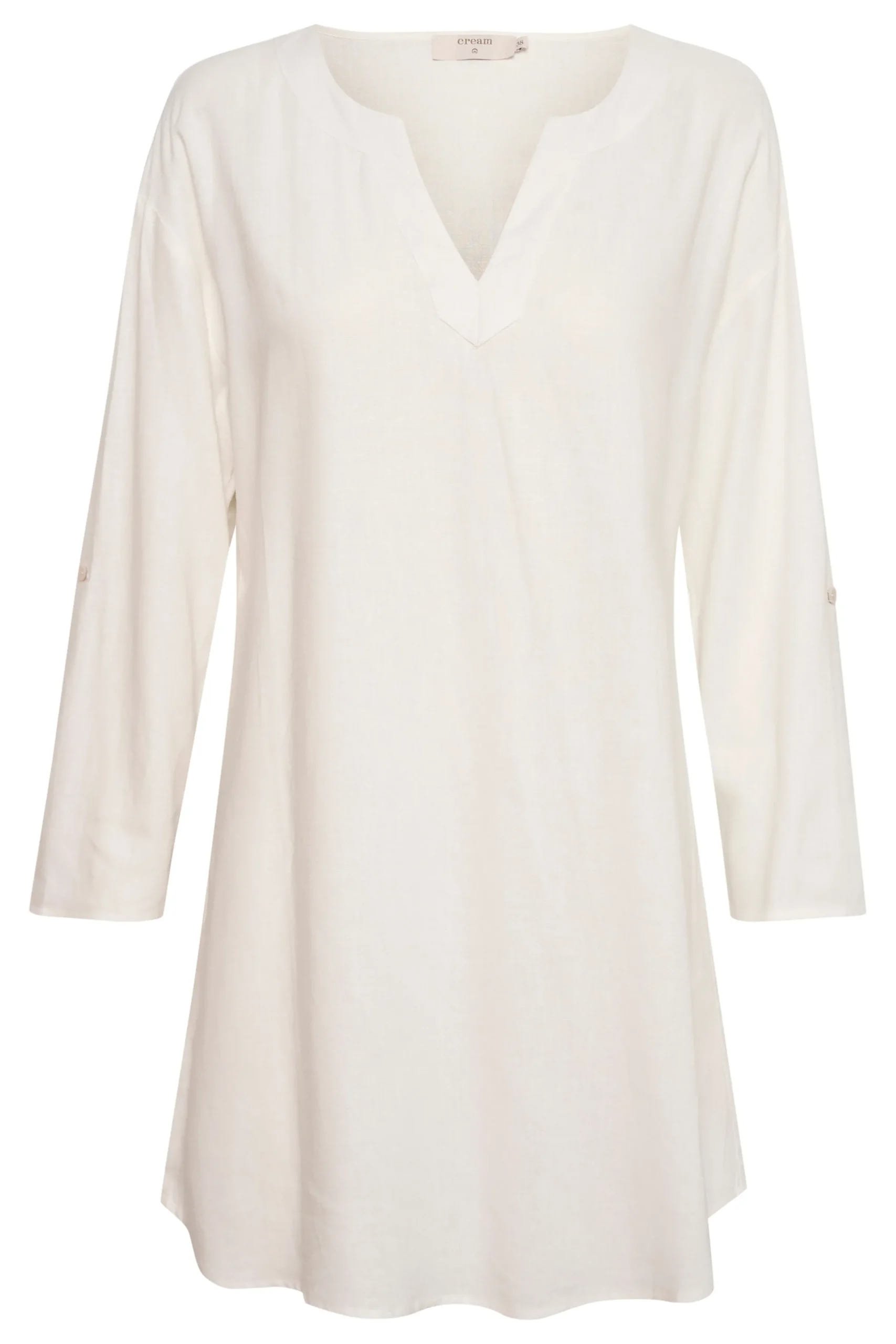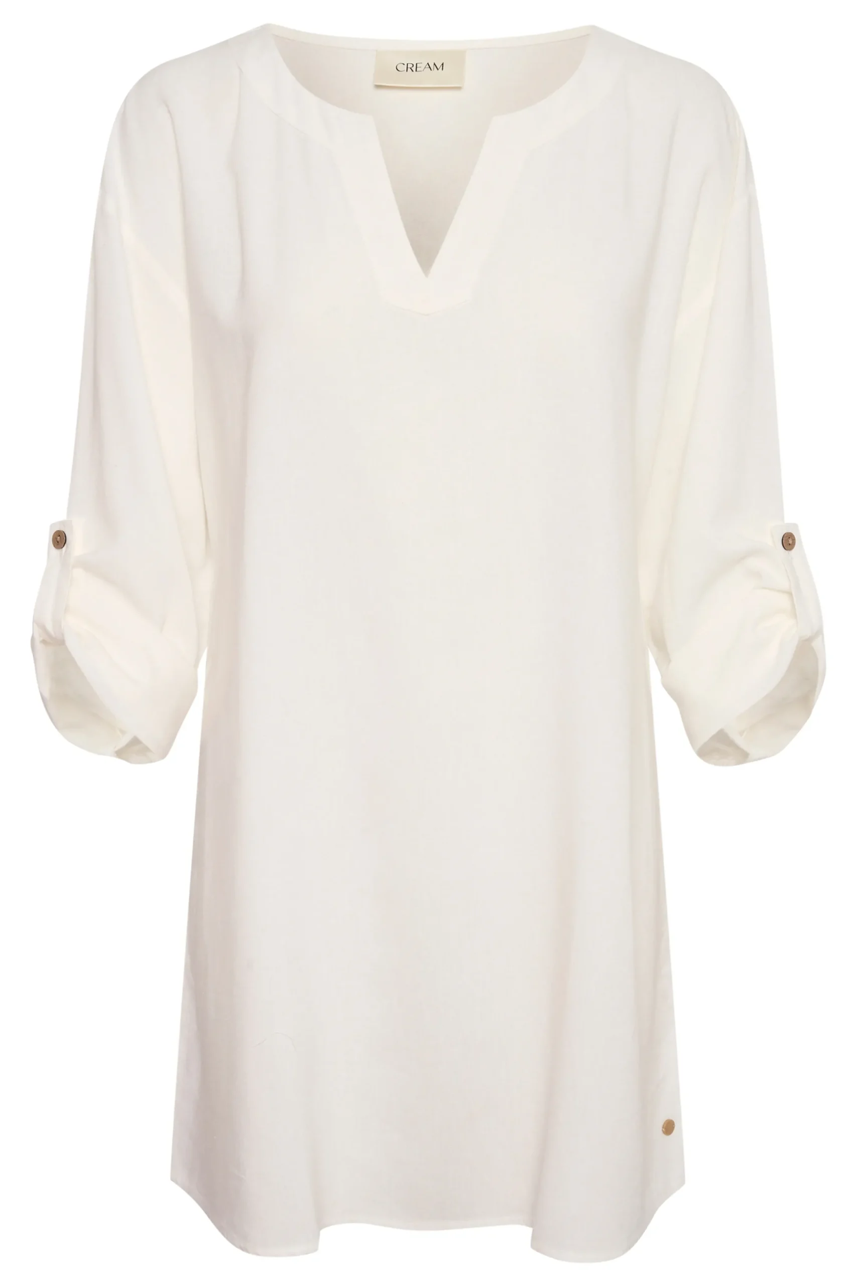 Tunika fra cream med rund hals og V-udskæring. Lange ærmer med strop og knap for opsmøg. Vævet kvalitet. Tunikaen fra cream har løstsiddende pasform.