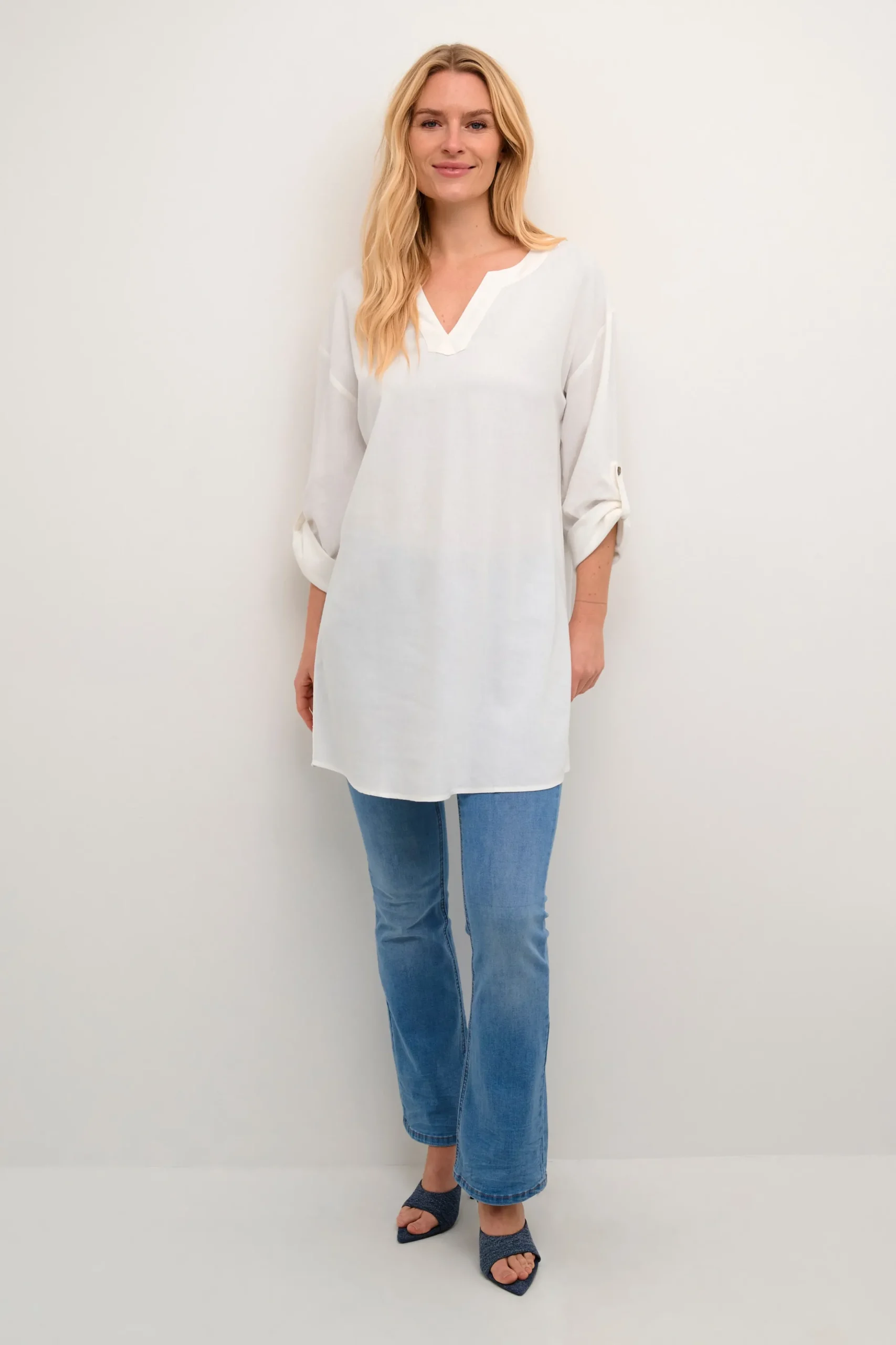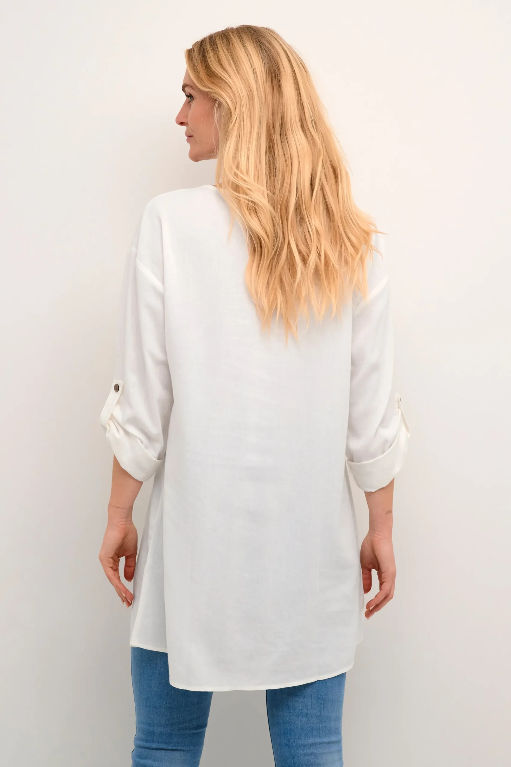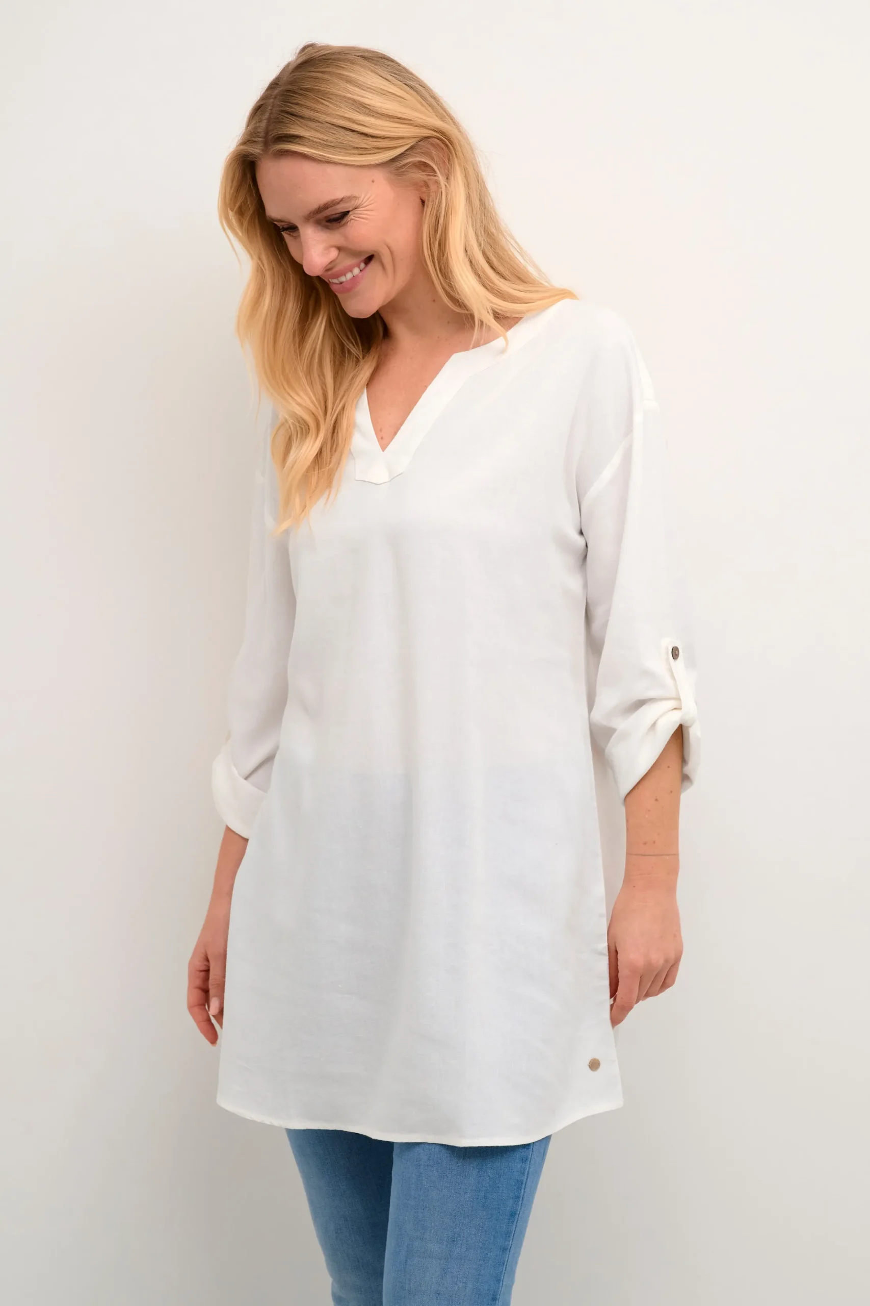 Tunika fra cream med rund hals og V-udskæring. Lange ærmer med strop og knap for opsmøg. Vævet kvalitet. Tunikaen fra cream har løstsiddende pasform.