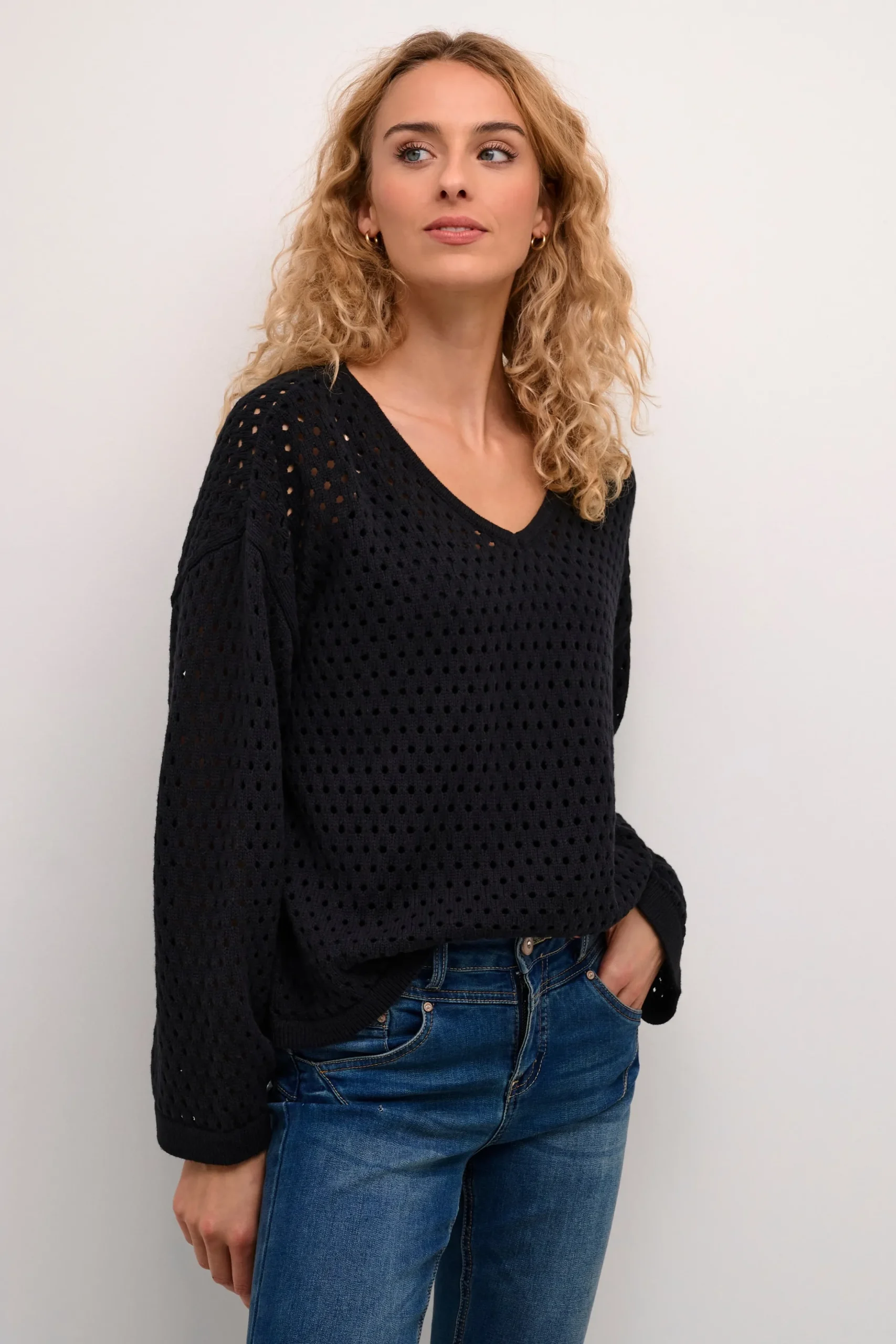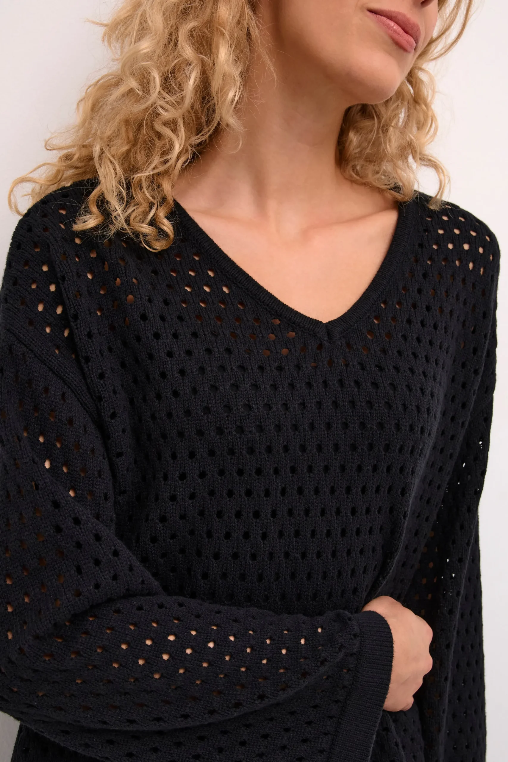 Denne strikkede pullover er ideel til hverdagens afslappede stil. Den er designet med en løs pasform, og længden skaber en slankende effekt, mens lange ærmer tilføjer ekstra varme. Materialevalget sikrer lang holdbarhed og nem vedligeholdelse.\\n\\nModellen er 178 cm høj og er iført en størrelse 36.