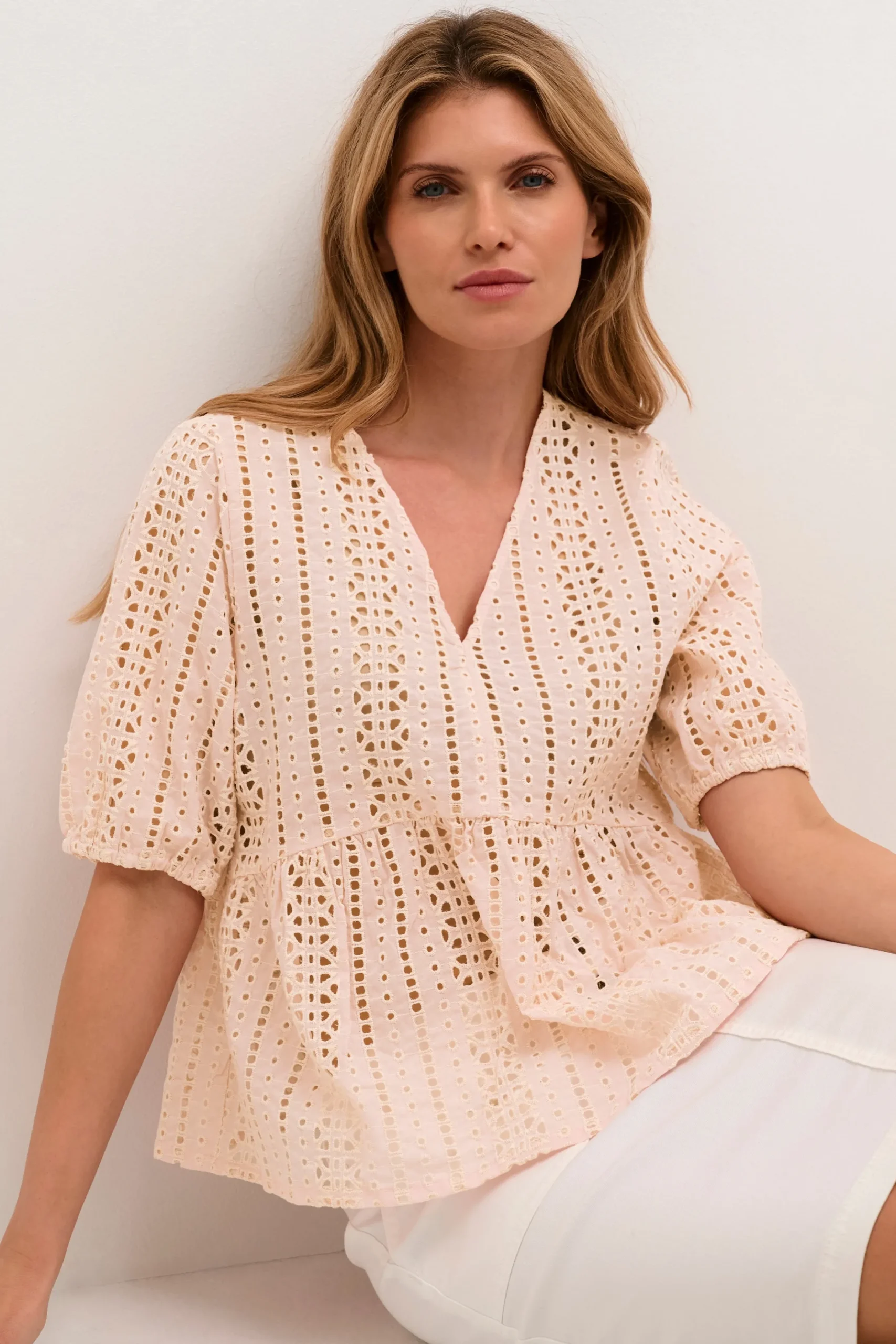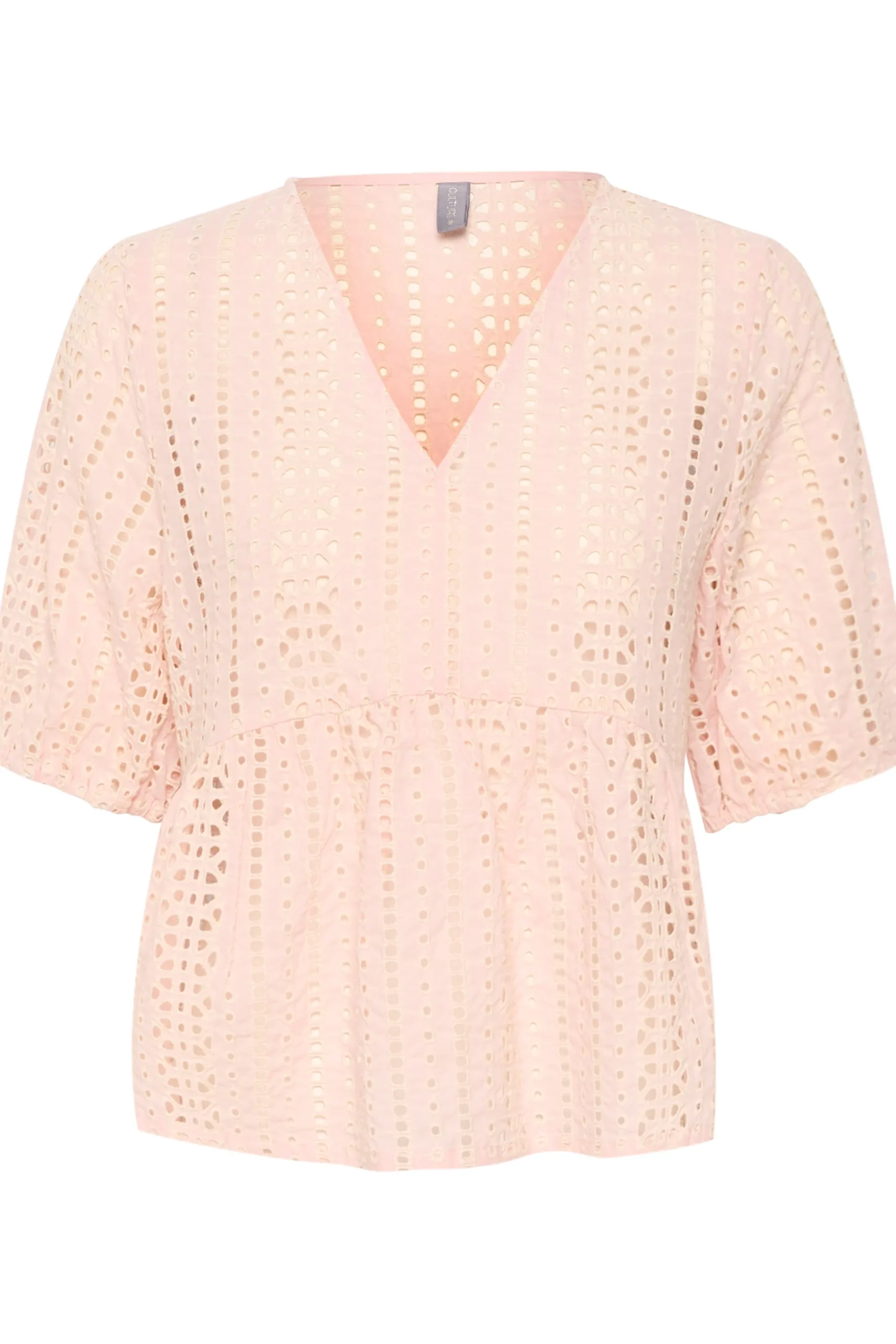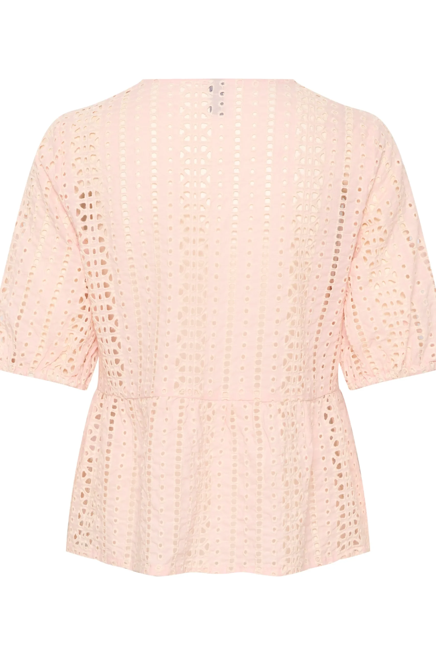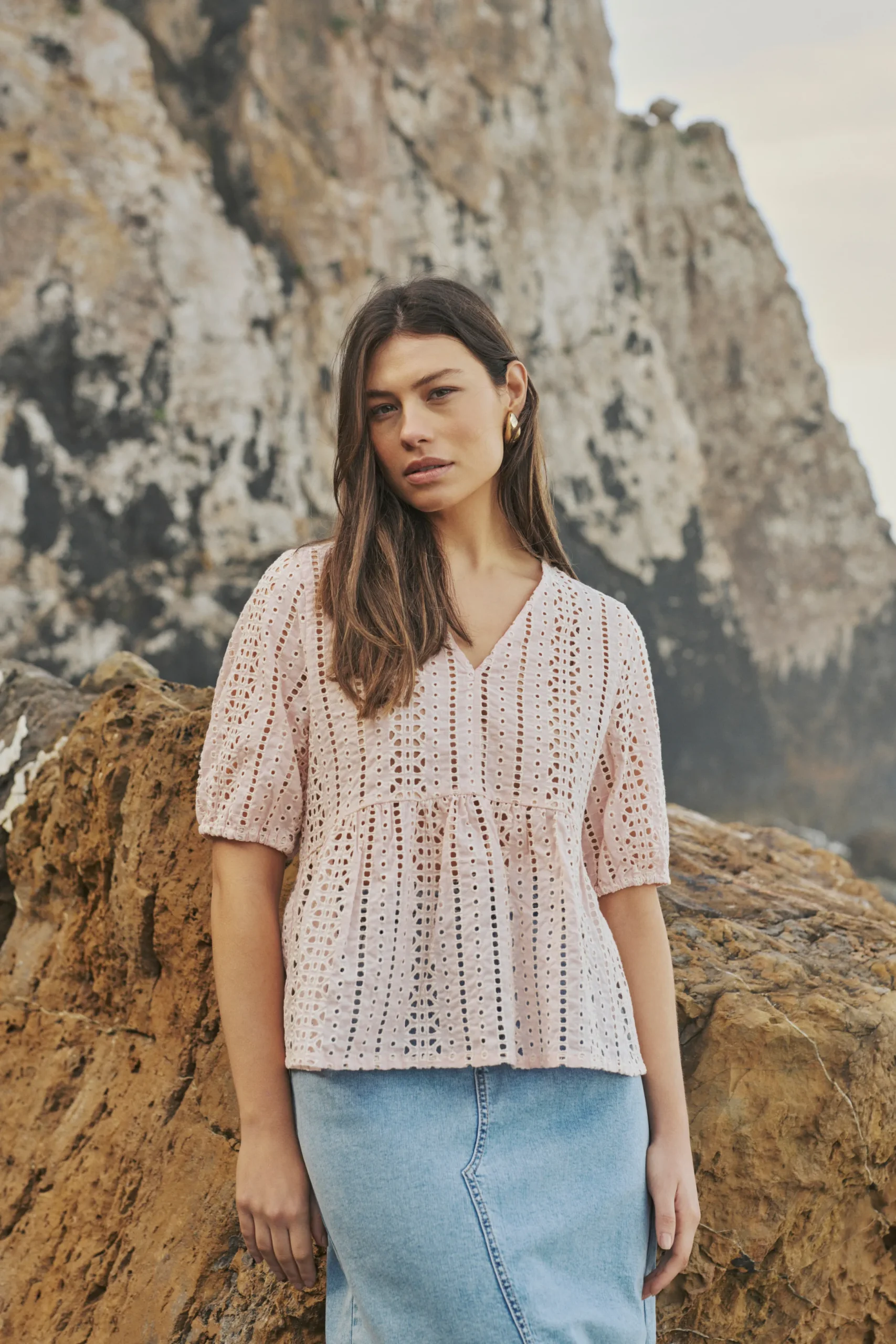 Denne feminine bluse med korte ærmer er perfekt til enhver lejlighed. Med sin længde passer den godt sammen med et par jeans eller en nederdel.