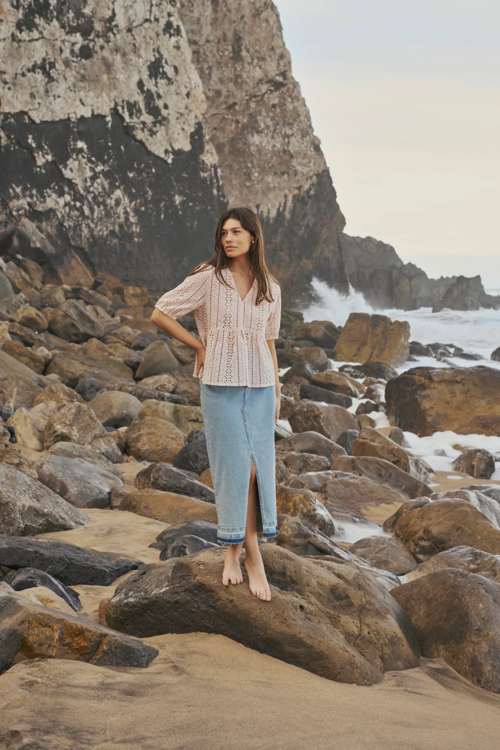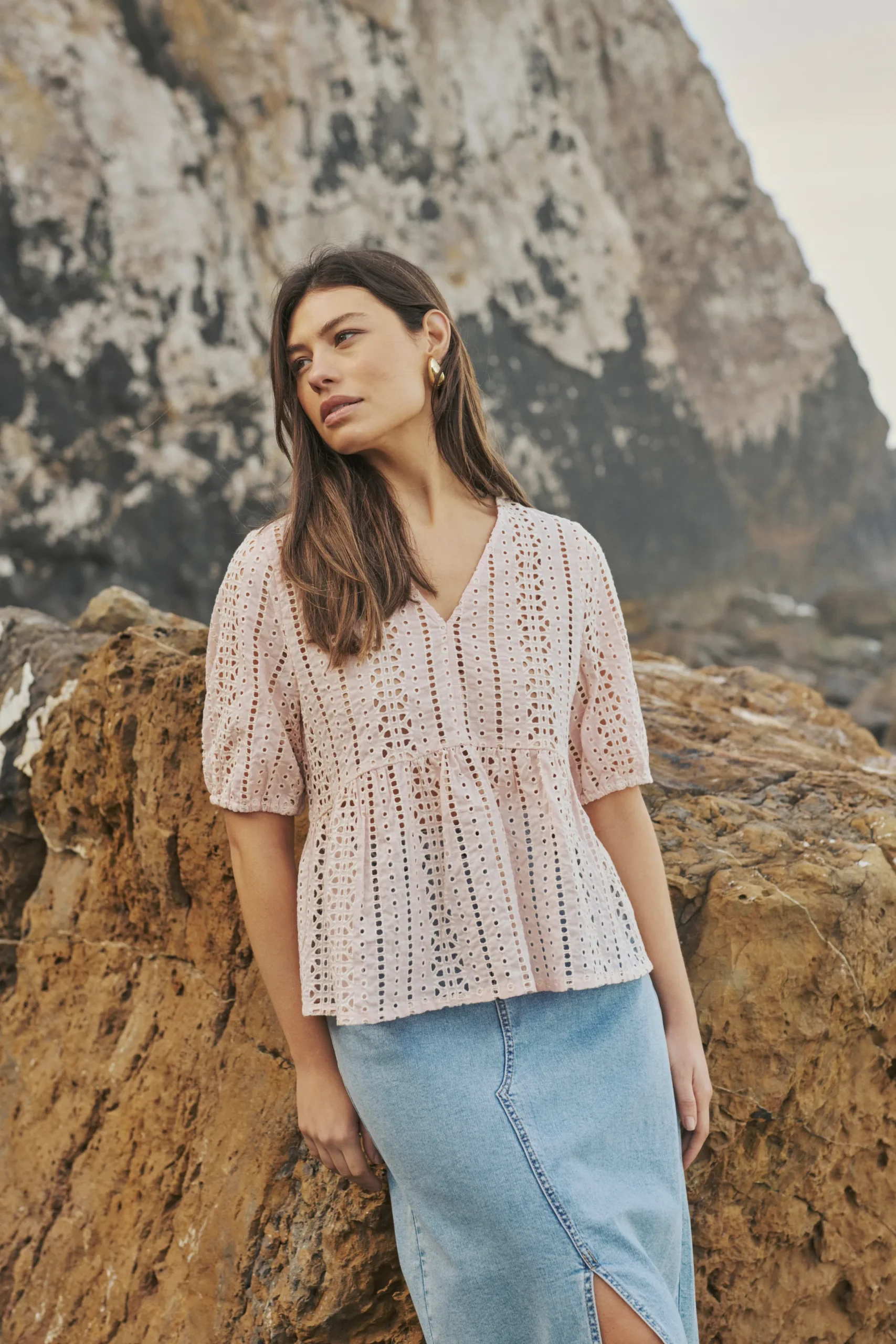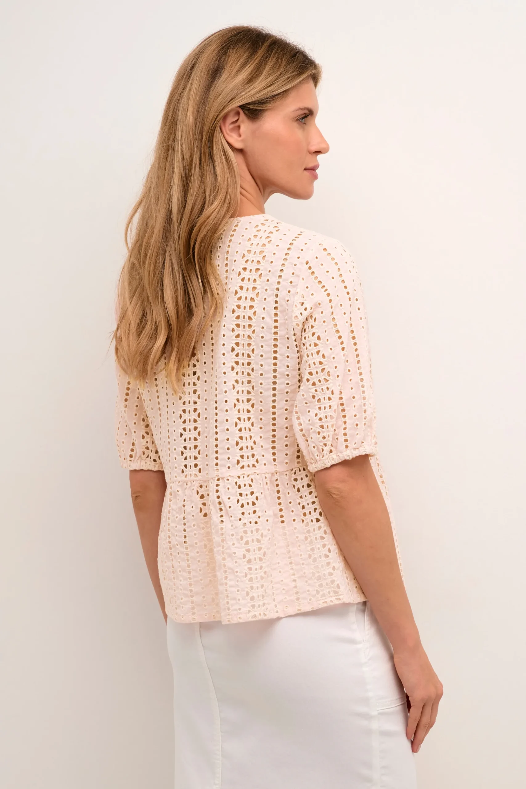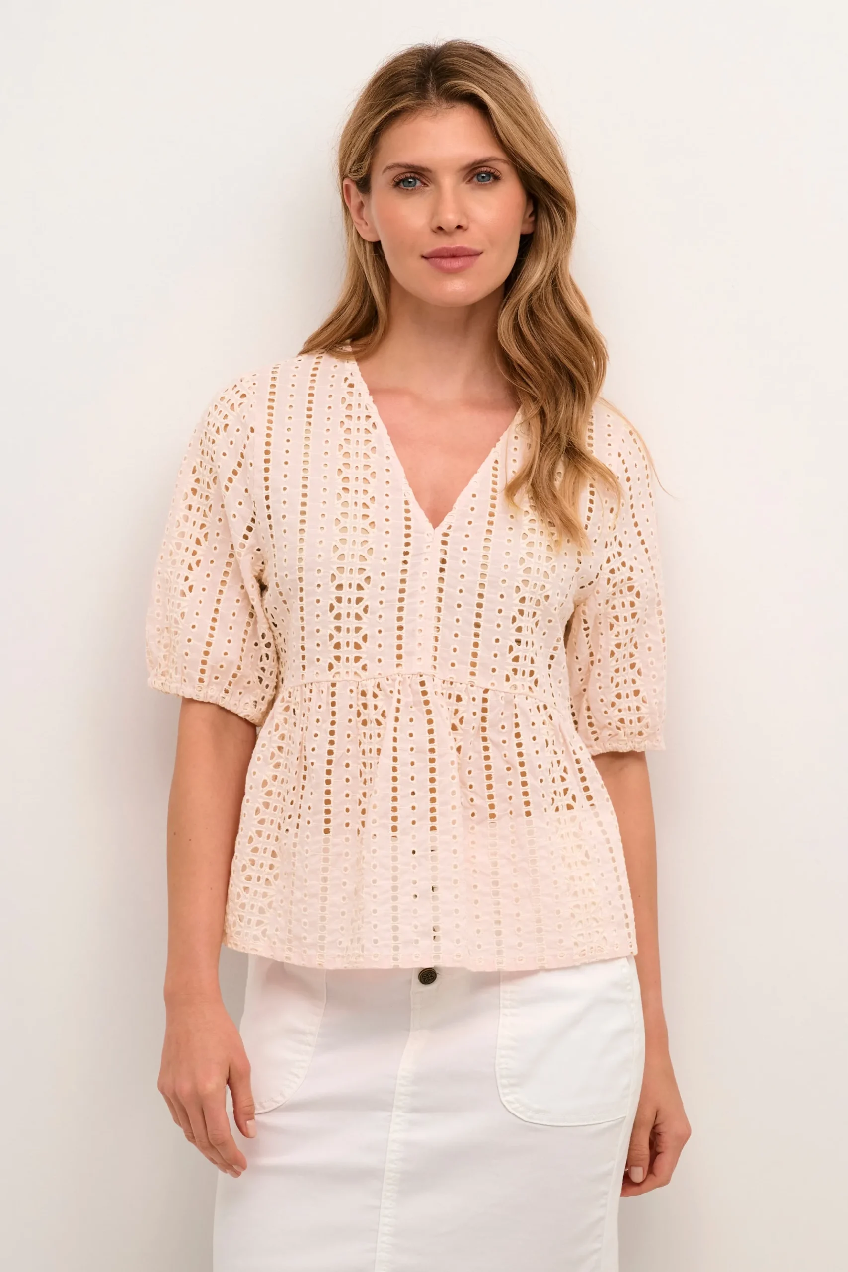 Denne feminine bluse med korte ærmer er perfekt til enhver lejlighed. Med sin længde passer den godt sammen med et par jeans eller en nederdel.