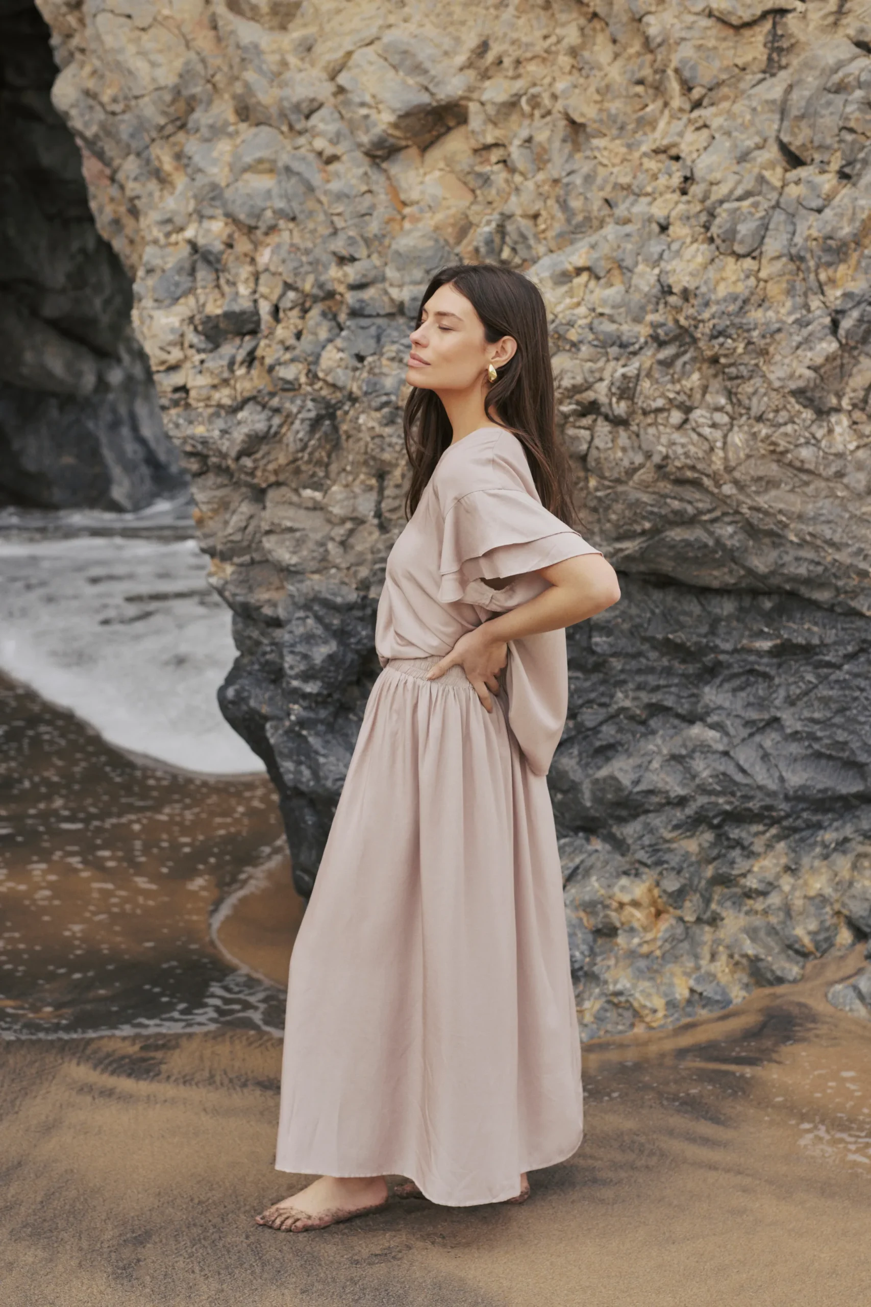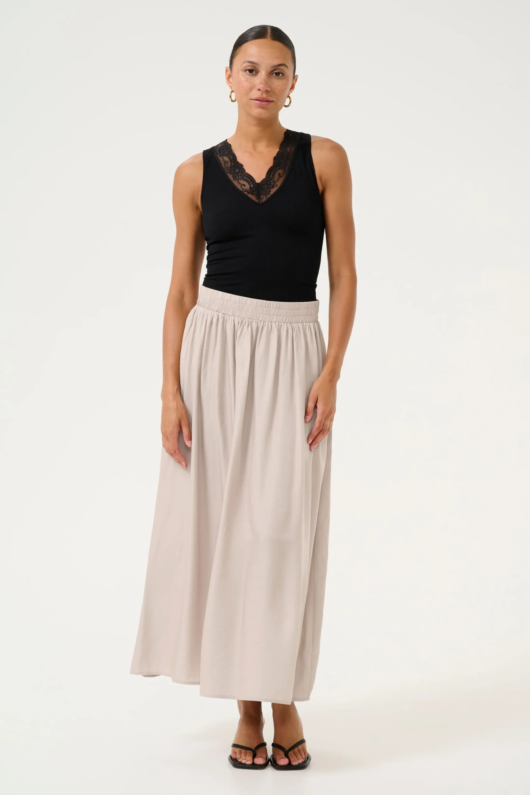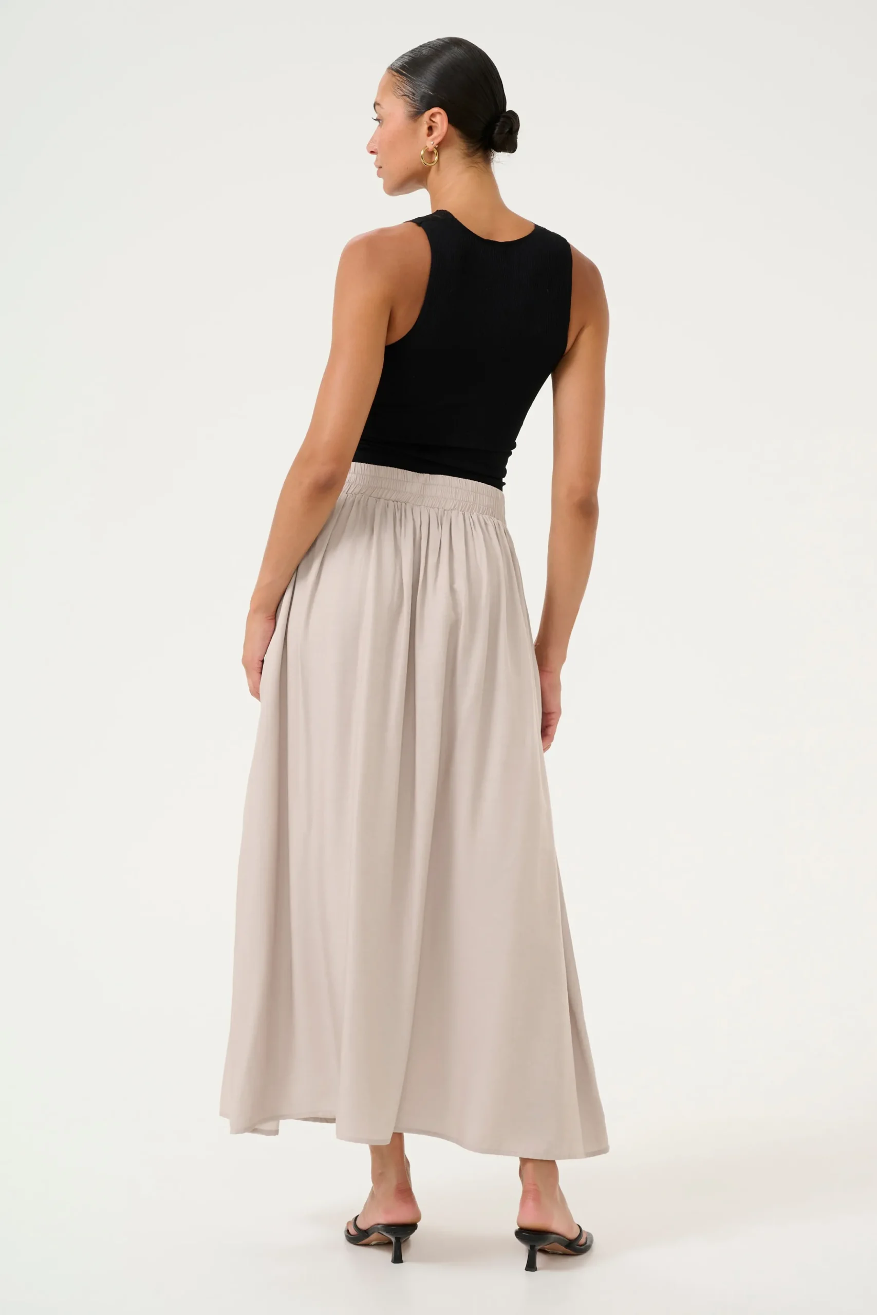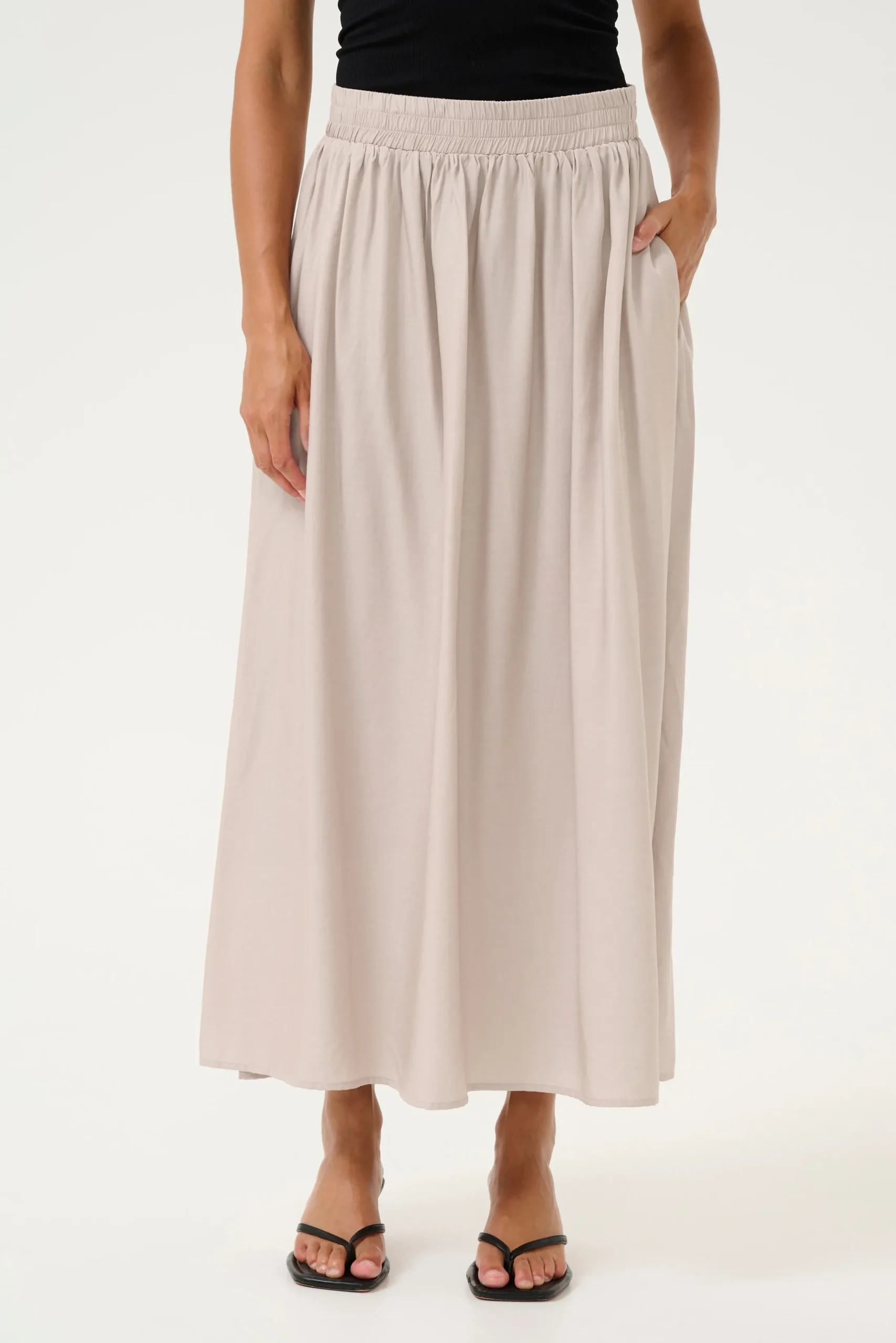 Denne A-formede nederdel er praktisk og stilfuld. Den har en elastisk talje og er fuld længde. Produktet er vævet kvalitet, lavet af 70% viskose og 30% polyester. Perfekt til både hverdagsbrug og særlige lejligheder.
