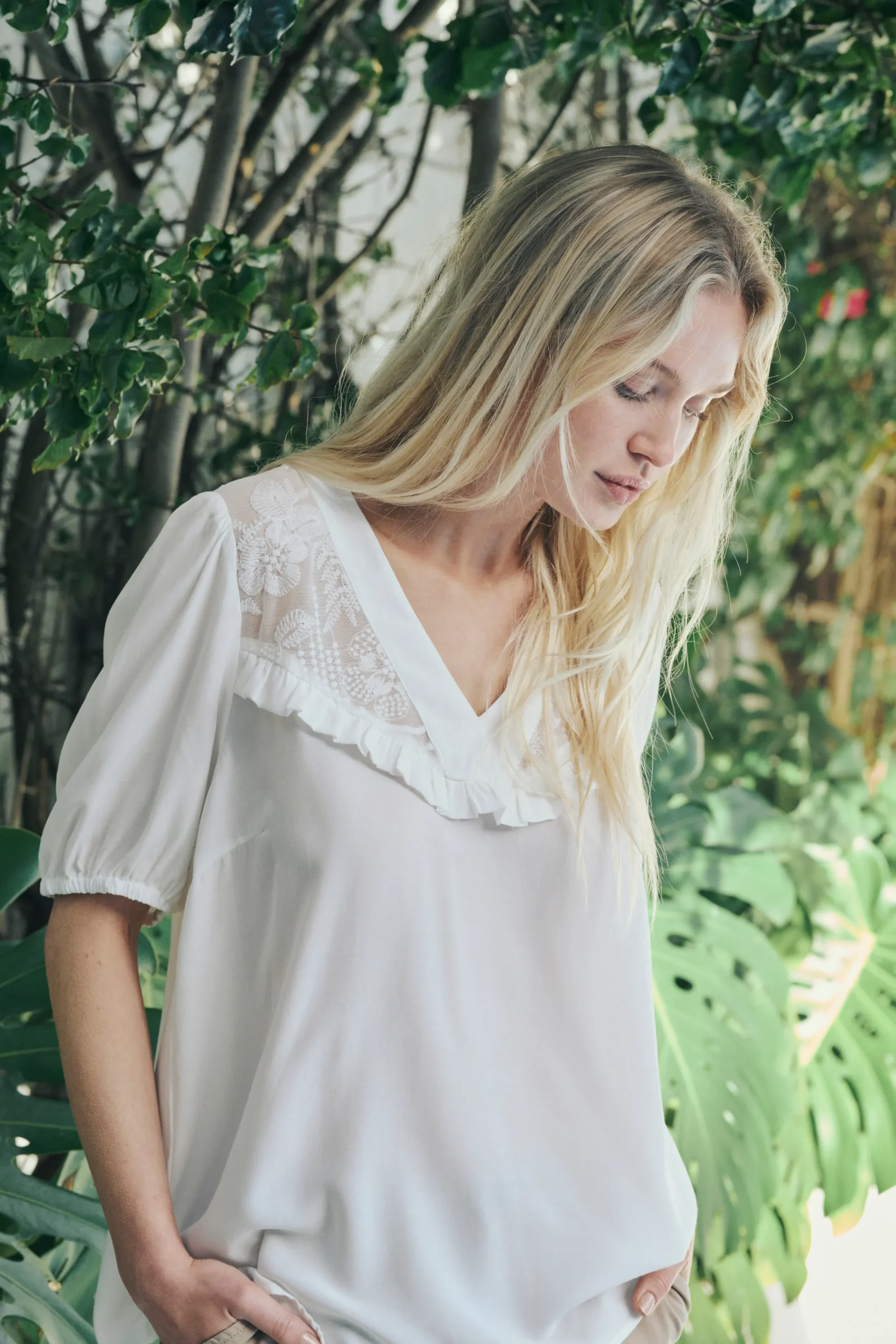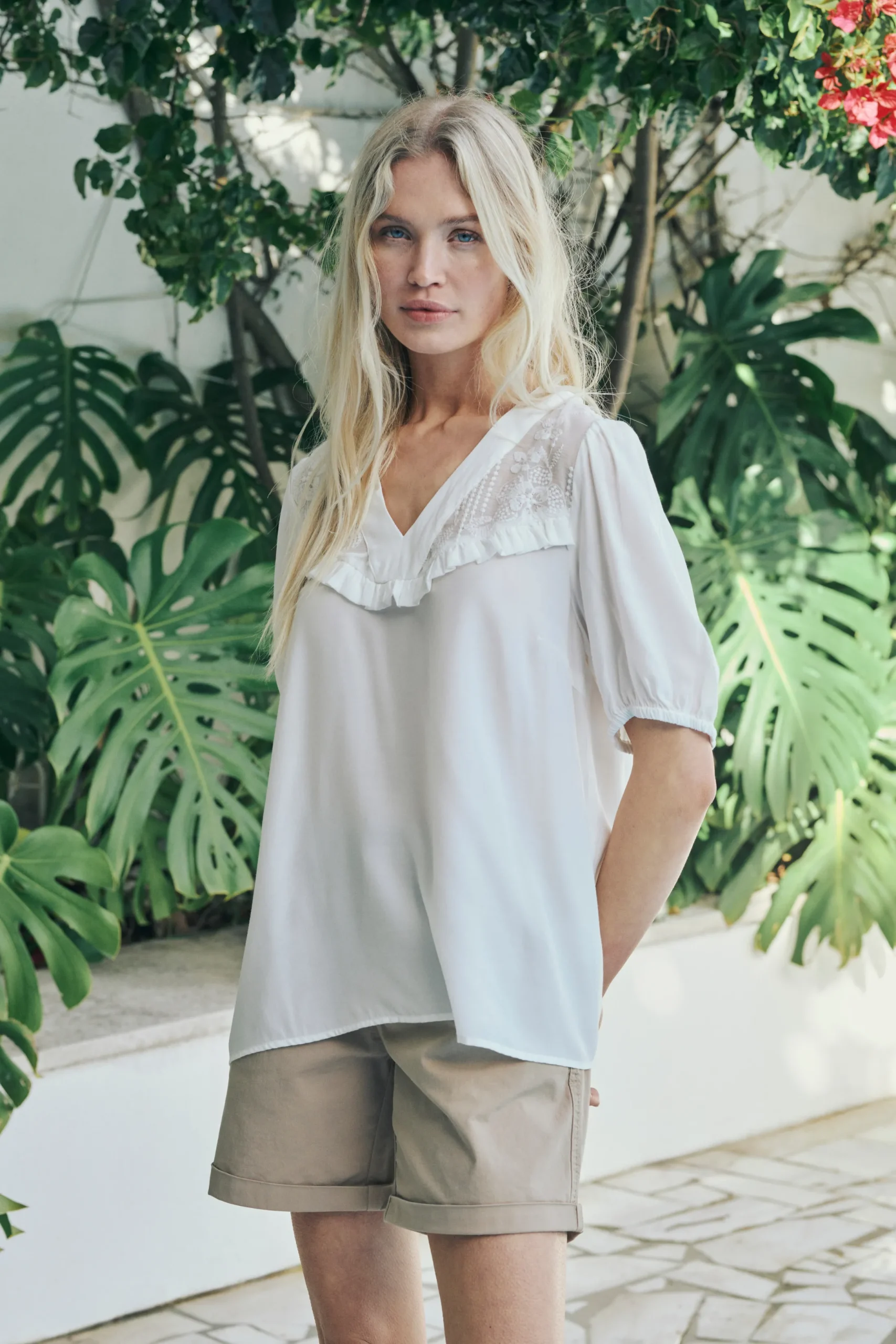 Bluse med detaljer som broderi, flæser og elastik i kanten. Perfekt til enhver anledning.