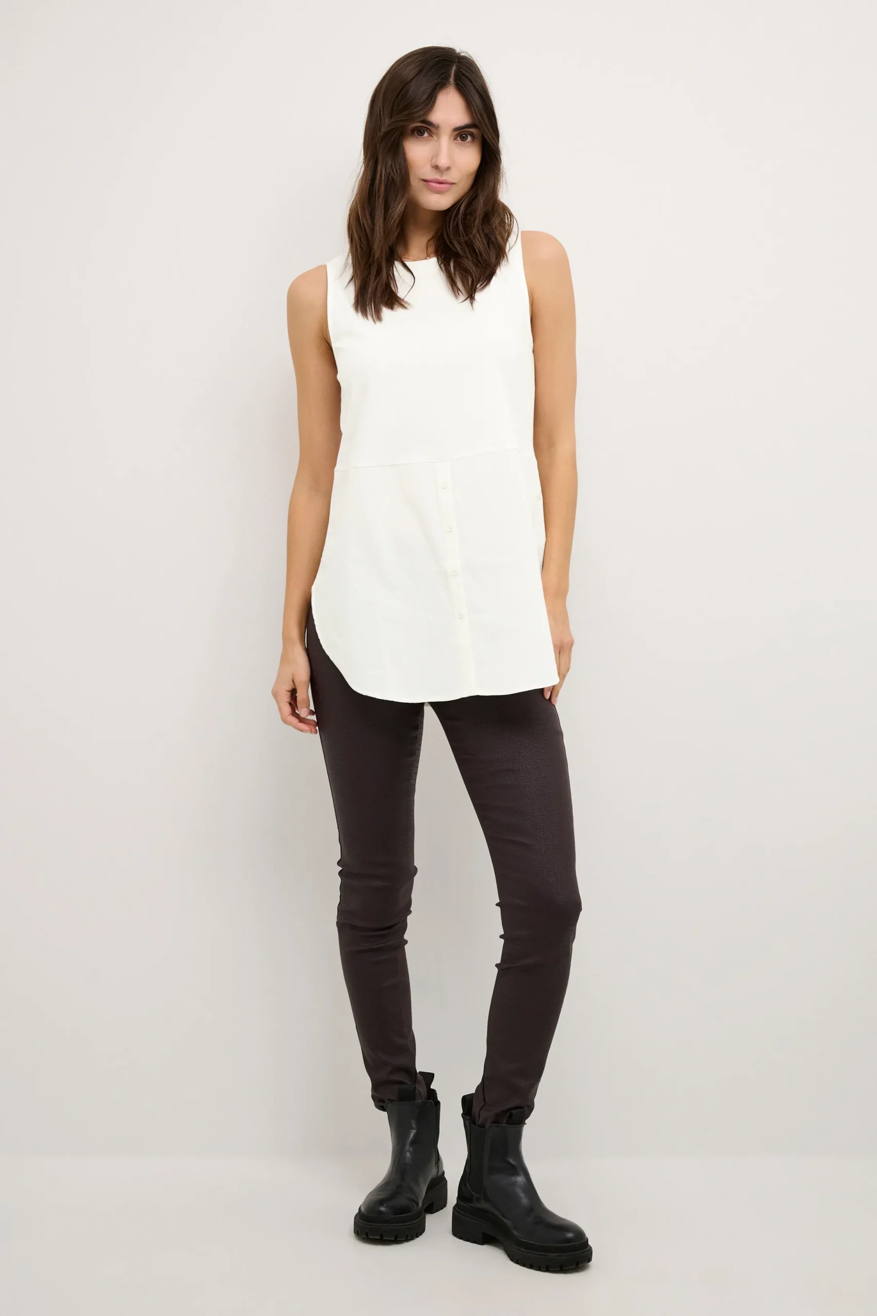 Denne top fra Culture er det perfekte valg til et afslappet og komfortabelt look. Den er lavet af høj kvalitet, strikket bomuld og har en klassisk, ærmeløs stil. Med sin casual pasform og medium lår længde er den ideel til at have under din strik eller vest. Kombiner den med dine yndlingsjeans eller en flot nederdel for et stilfuldt outfit.