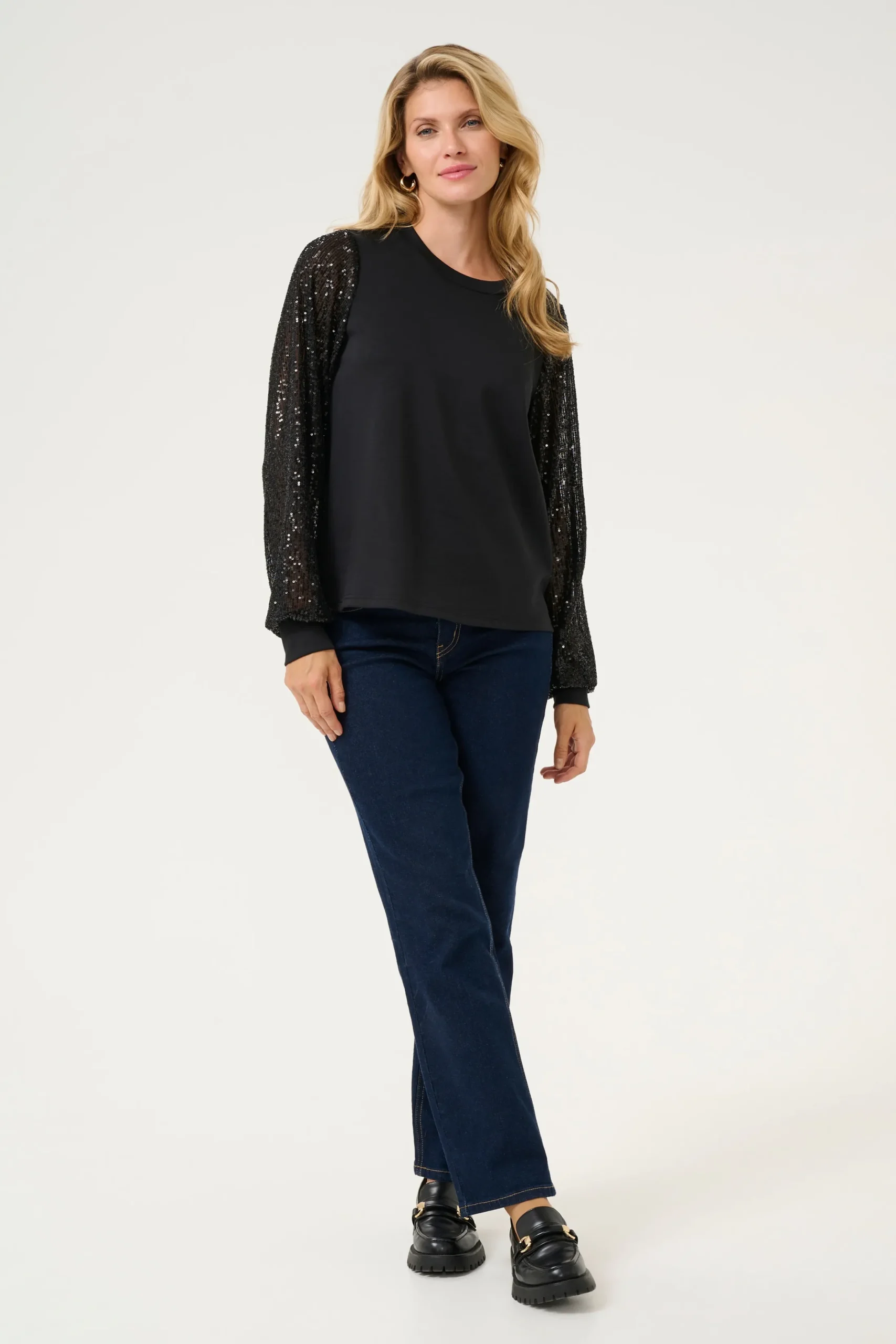 Denne klassiske og tidløse bluse er et elegant valg til enhver garderobe. Med lange ærmer og fine detaljer i form af pailletter på ærmerne, kombinerer den enkelthed med et strejf af glamour. Blusen er alsidig og kan styles til både hverdagsbrug og særlige anledninger, hvilket gør den til en uundværlig favorit.\\n\\nModellen er 177 cm høj og er iført en størrelse M.