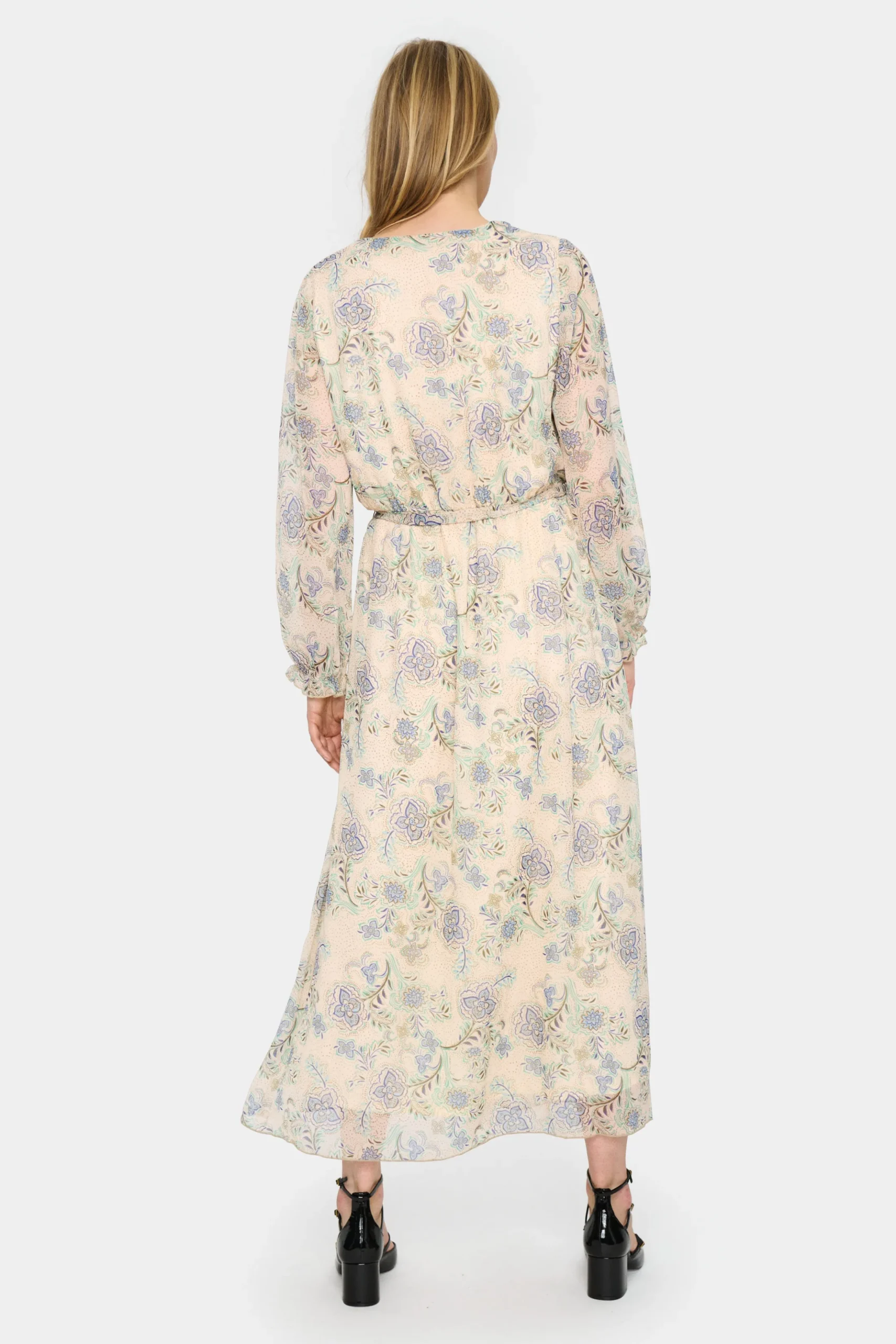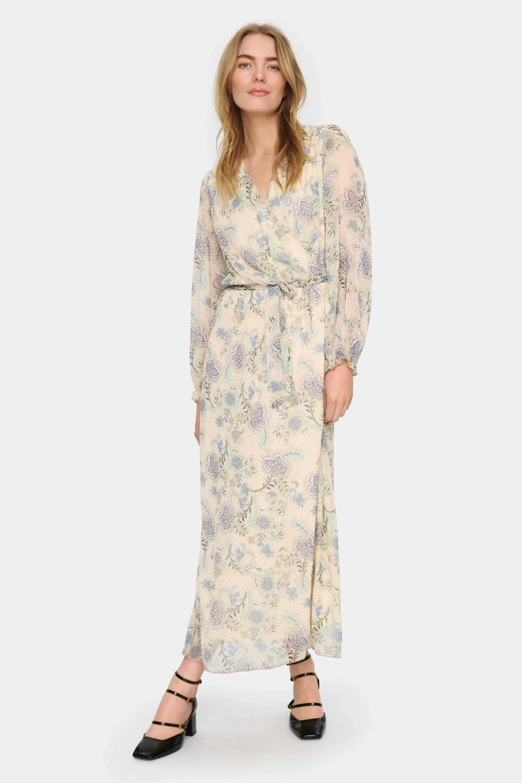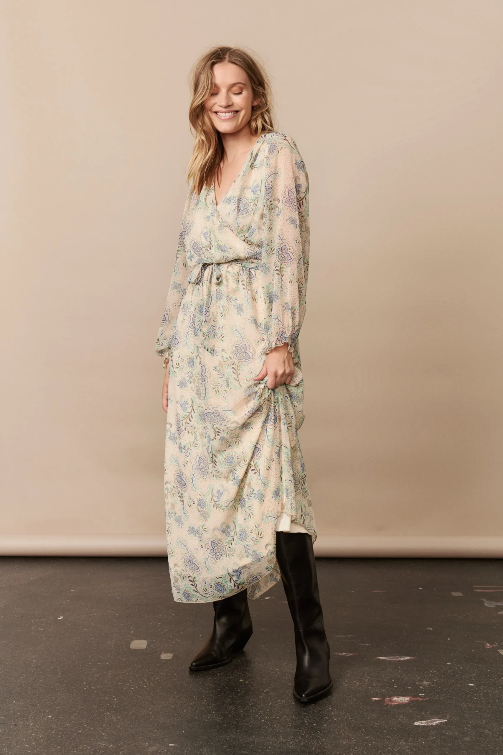 Blomstret maxi kjole med lange ærmer, V-udskæring, justerbart bindebånd i taljen samt elastik forneden af ærmerne. \\nModellen er 176 cm høj og iført størrelse M