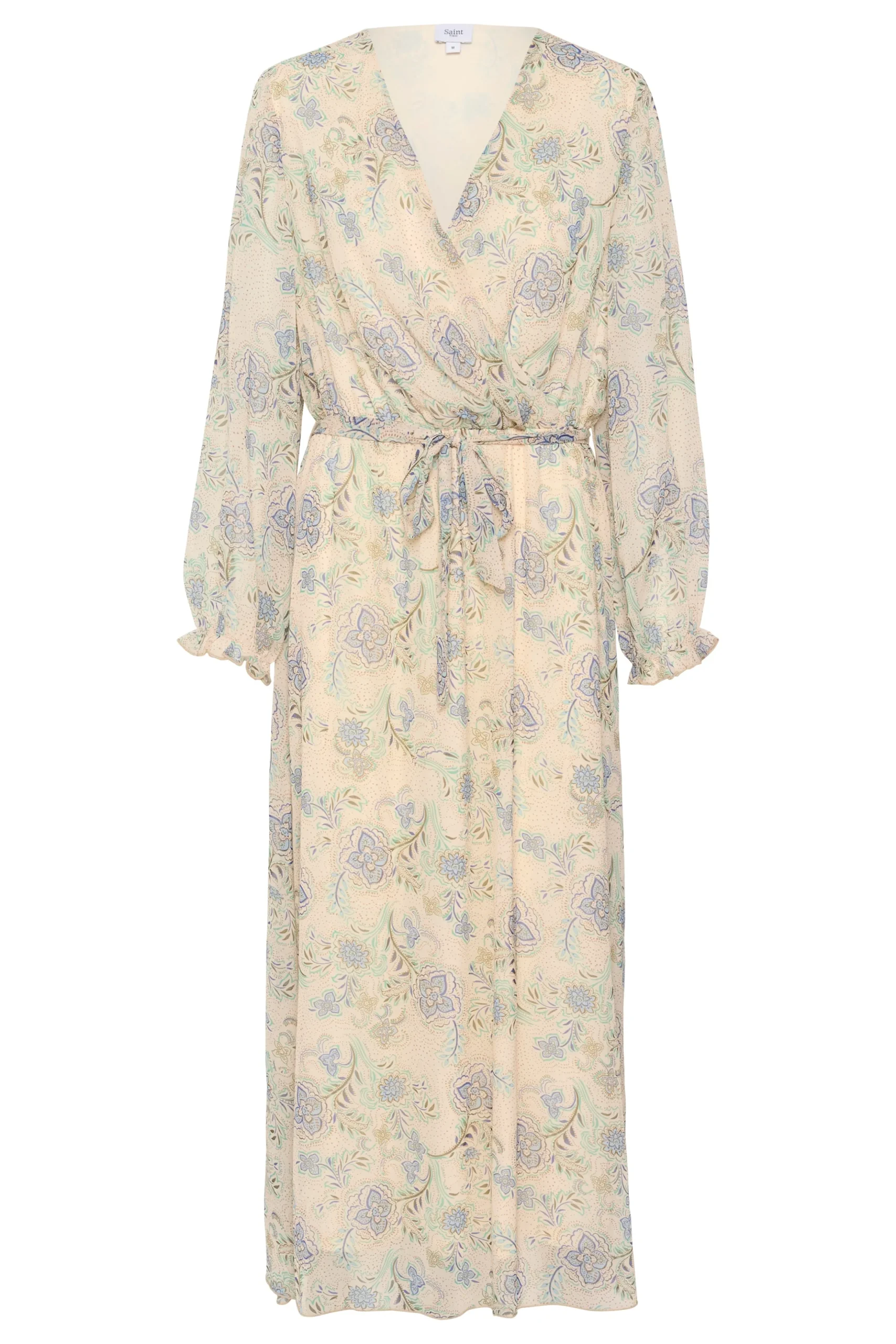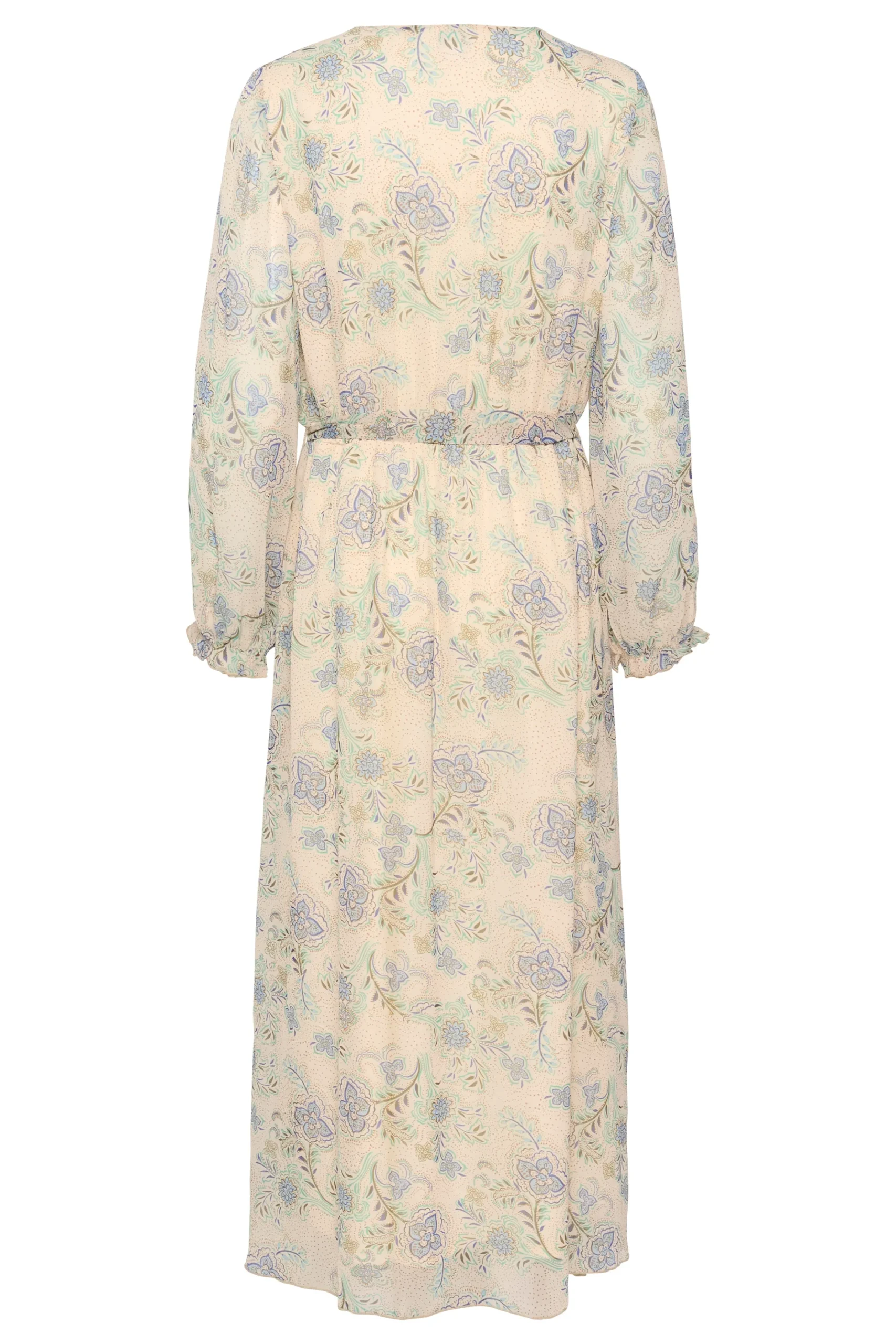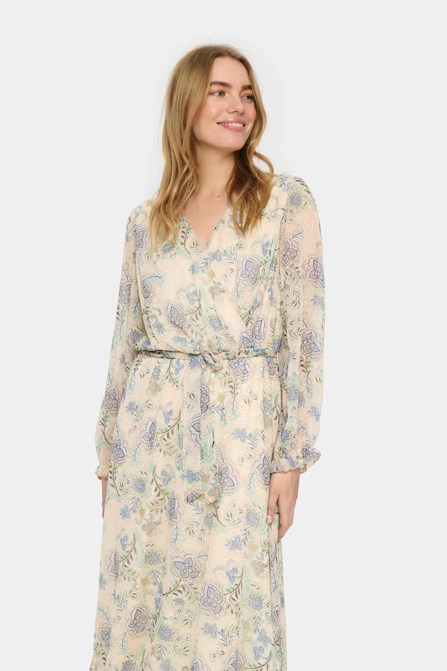 Blomstret maxi kjole med lange ærmer, V-udskæring, justerbart bindebånd i taljen samt elastik forneden af ærmerne. \\nModellen er 176 cm høj og iført størrelse M