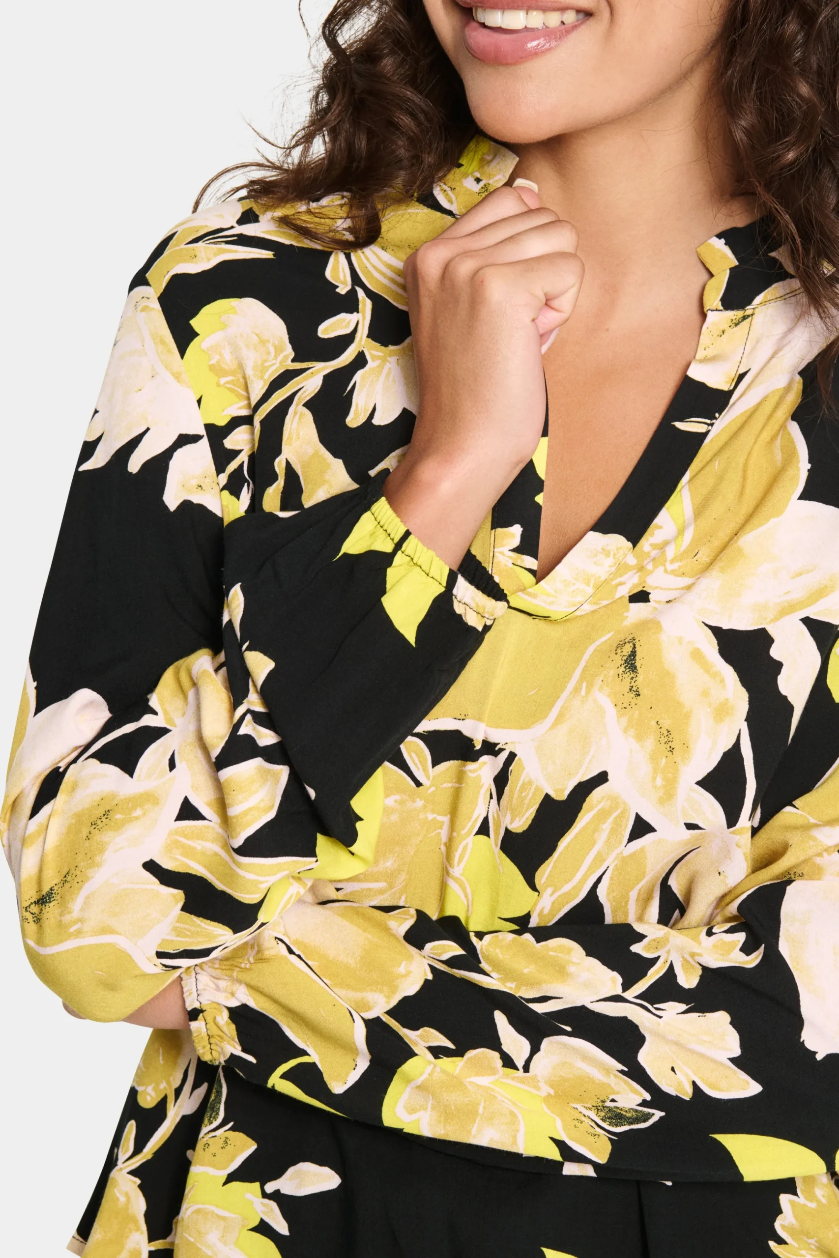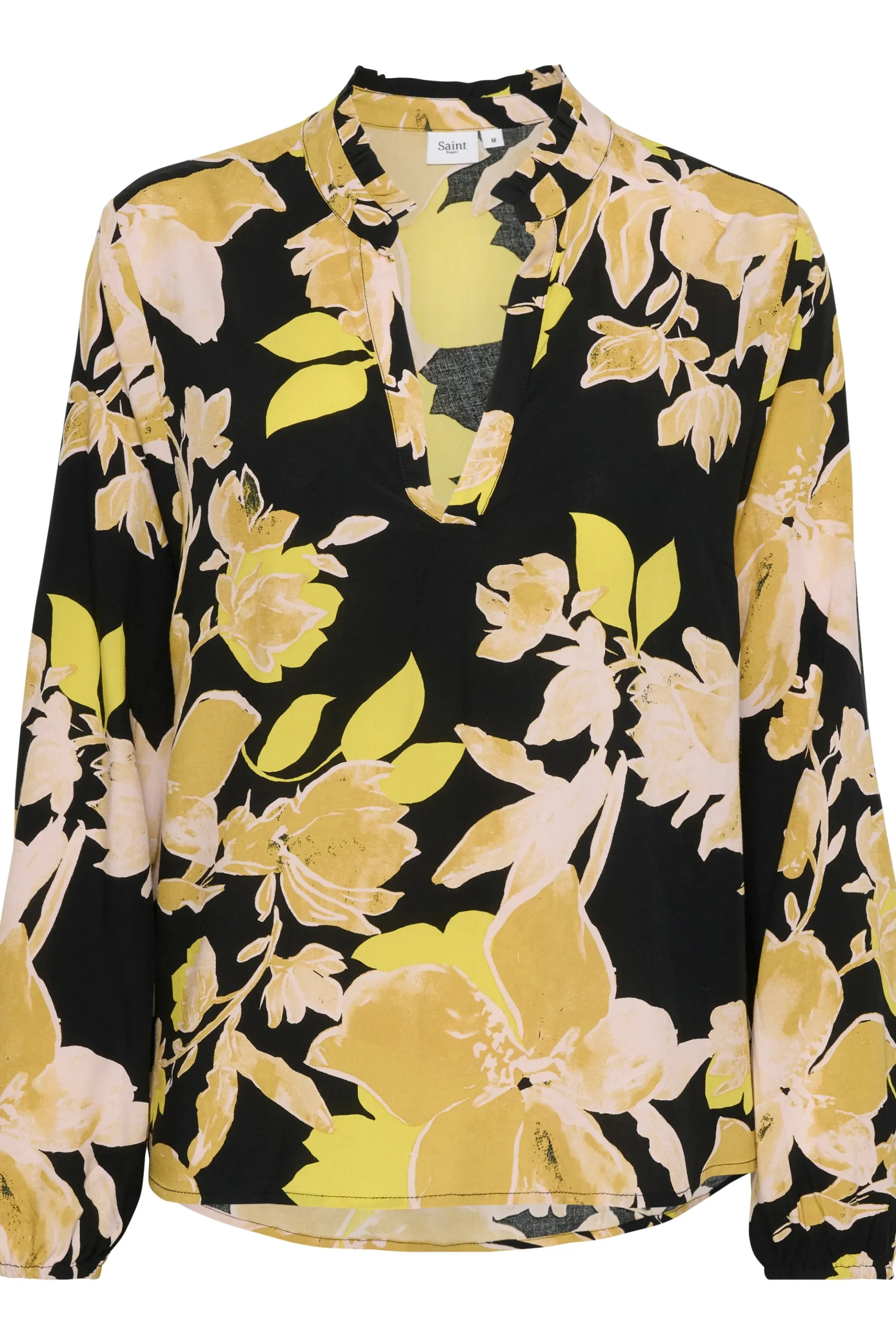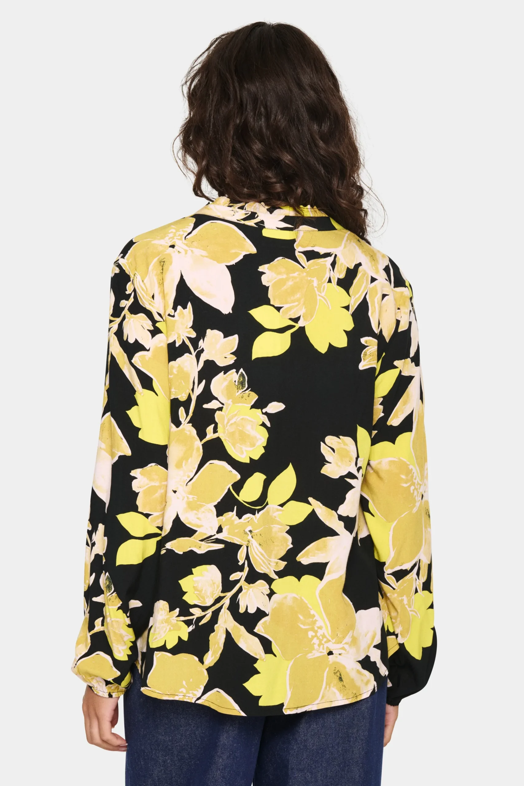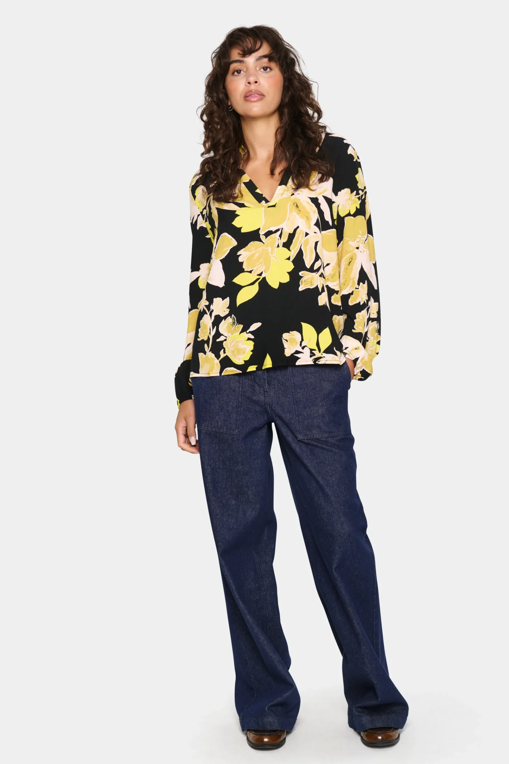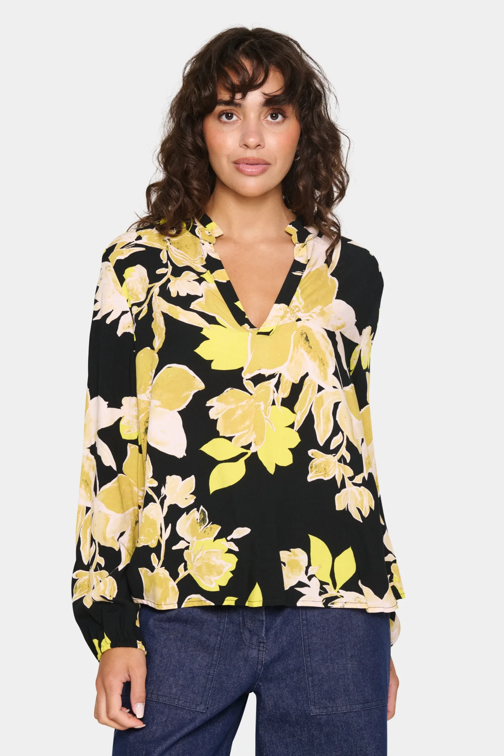 Denne bluse har et iøjnefaldende blomstermønster i nuancer af gul og creme på en sort baggrund. Blusen har en afslappet pasform, v-hals og lange ærmer med elastiske manchetter, hvilket gør den ideel til både hverdag og festlige lejligheder. \\n\\nModellen er 176 cm høj og er iført en str. M.