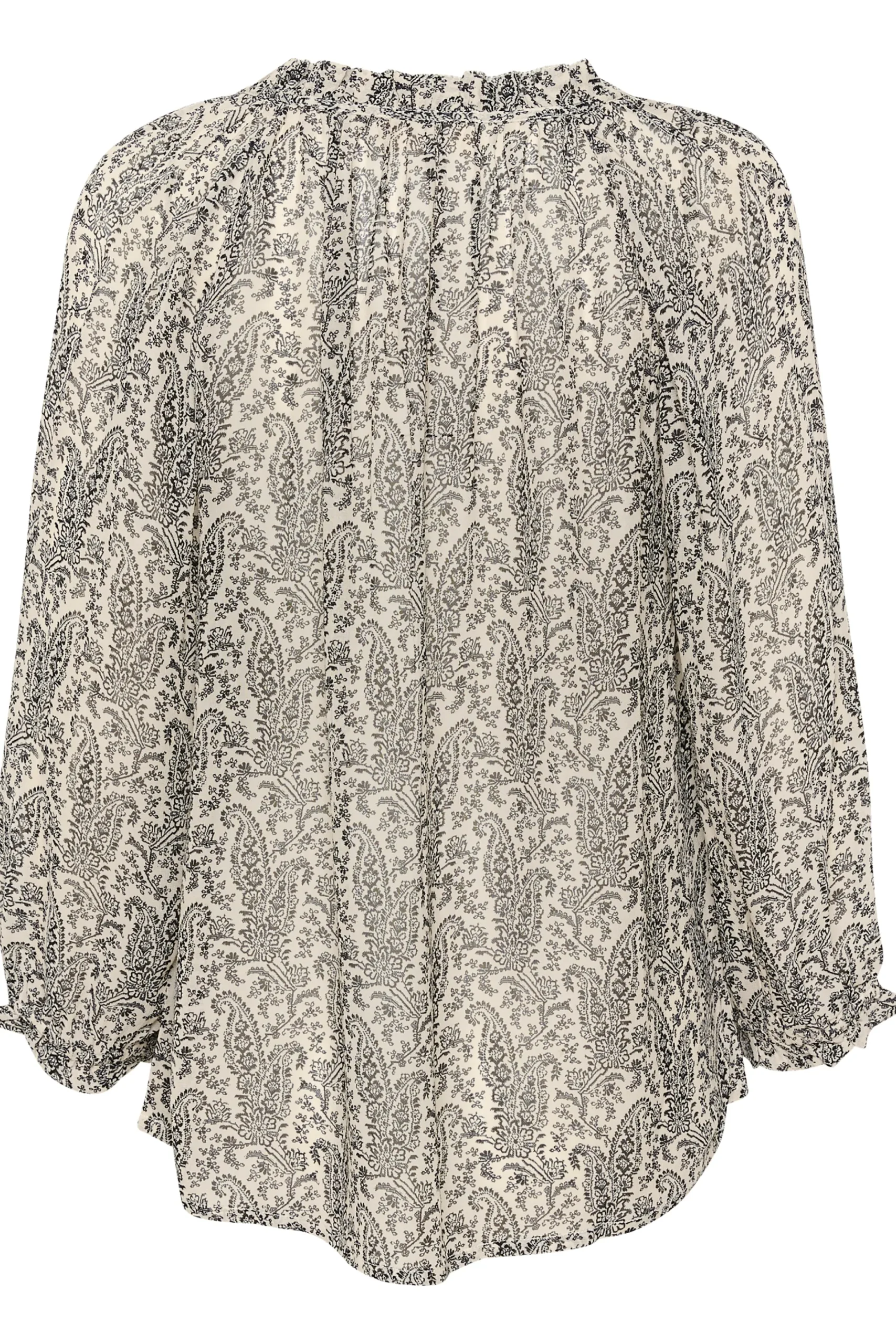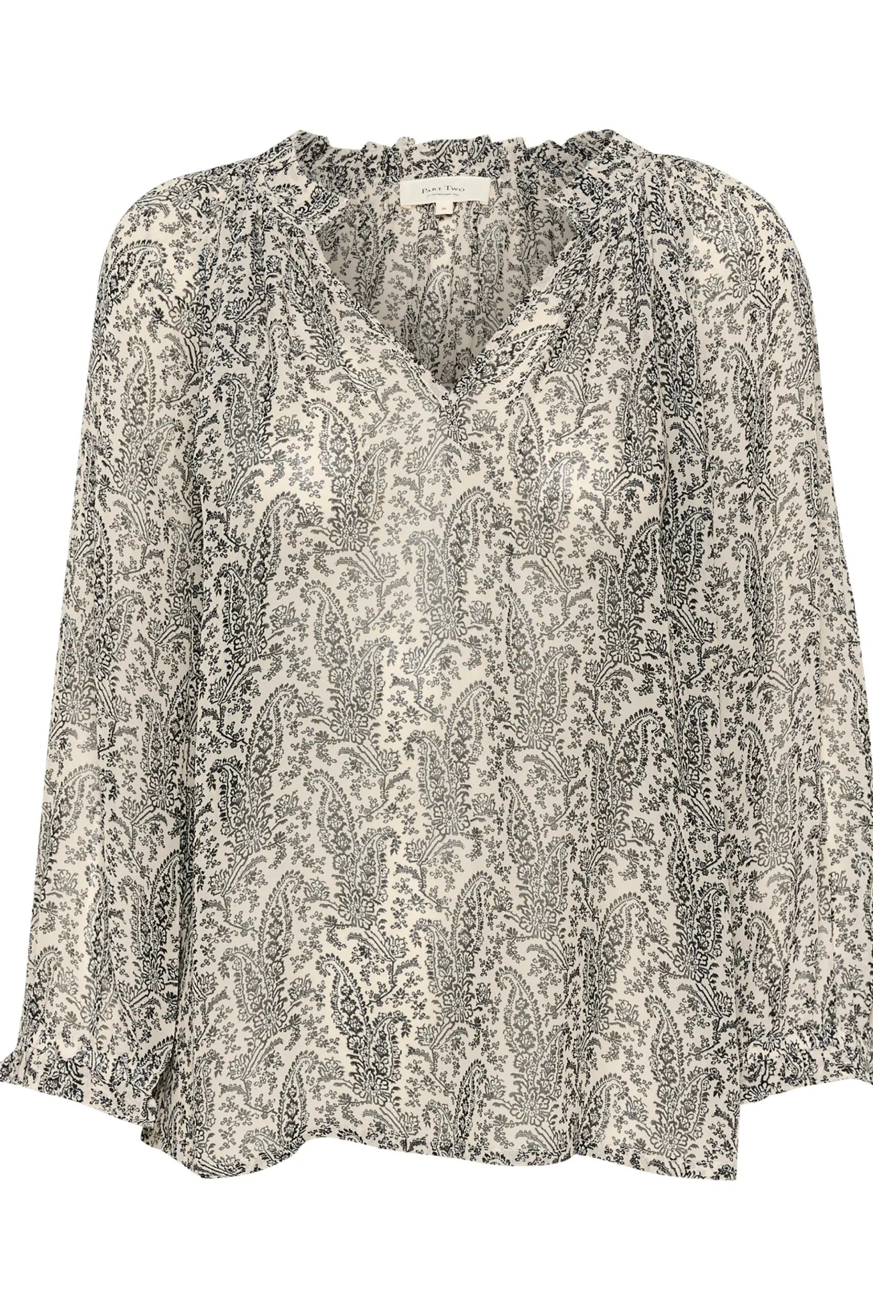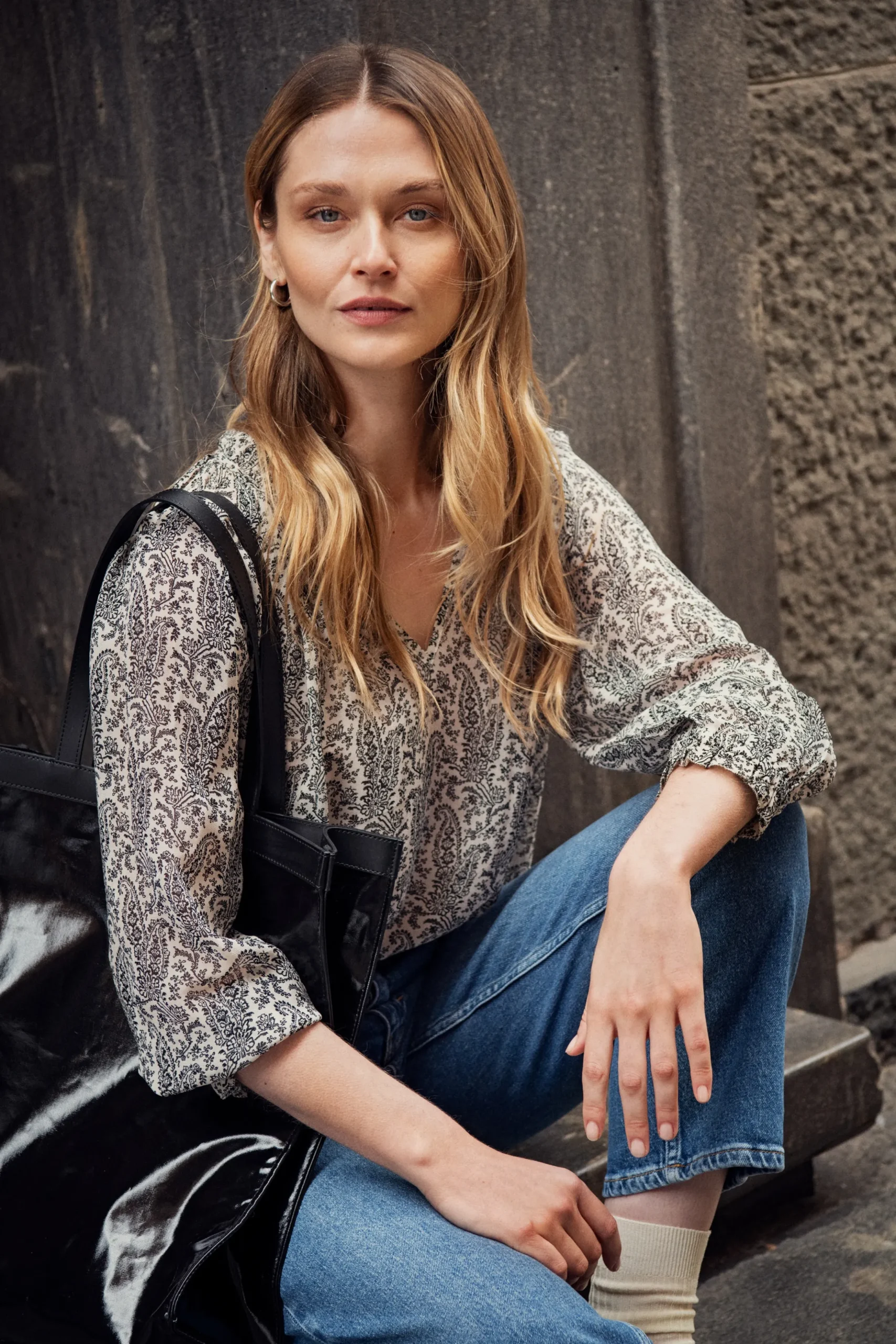 Modellen er 180 cm høj og er iført en størrelse 36.\\n\\nForbedr din garderobe med denne elegante printede bluse. Lavet af let og åndbart stof, har den en flatterende V-hals, lange ærmer og en afslappet pasform. Perfekt til både arbejde og afslappede udflugter, kan den styles med skræddersyede bukser eller jeans for et sofistikeret look.