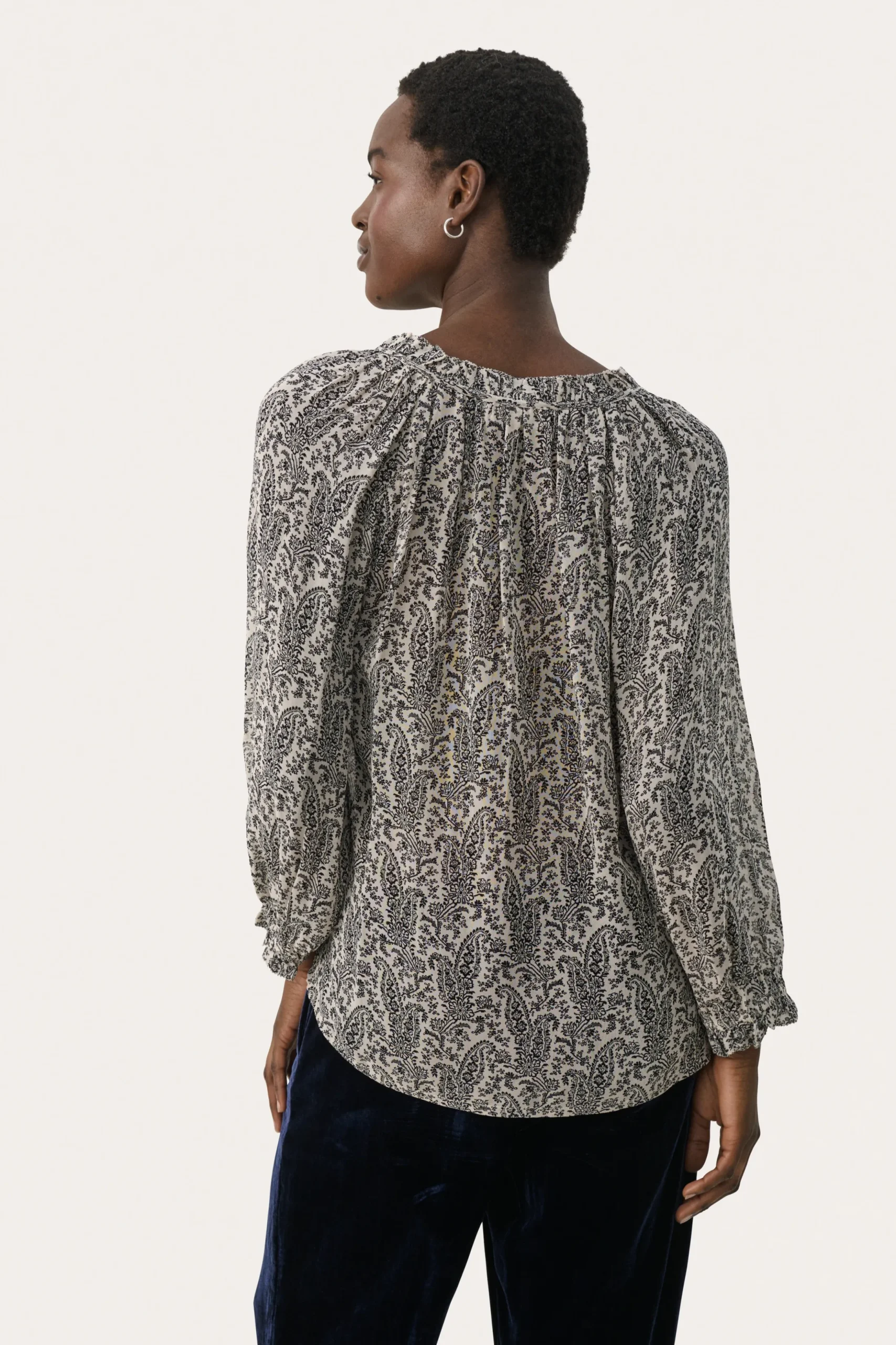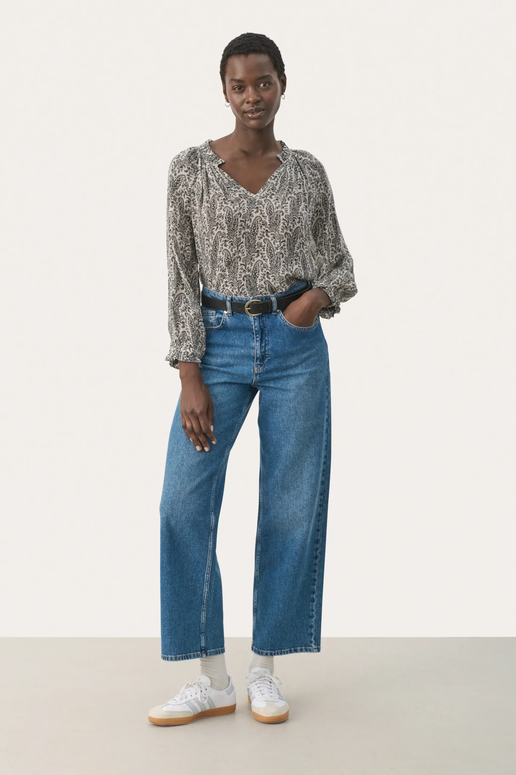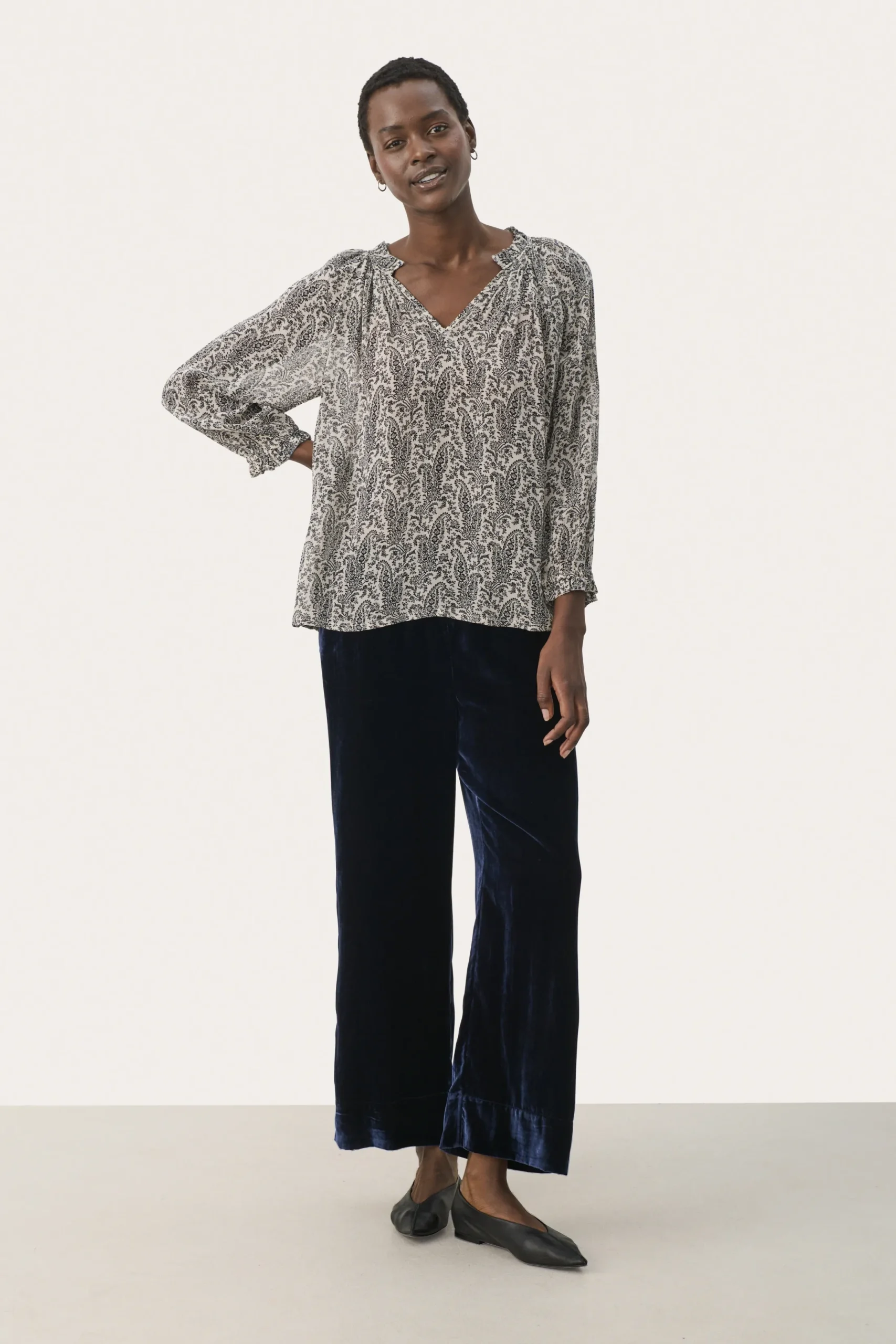 Modellen er 180 cm høj og er iført en størrelse 36.\\n\\nForbedr din garderobe med denne elegante printede bluse. Lavet af let og åndbart stof, har den en flatterende V-hals, lange ærmer og en afslappet pasform. Perfekt til både arbejde og afslappede udflugter, kan den styles med skræddersyede bukser eller jeans for et sofistikeret look.