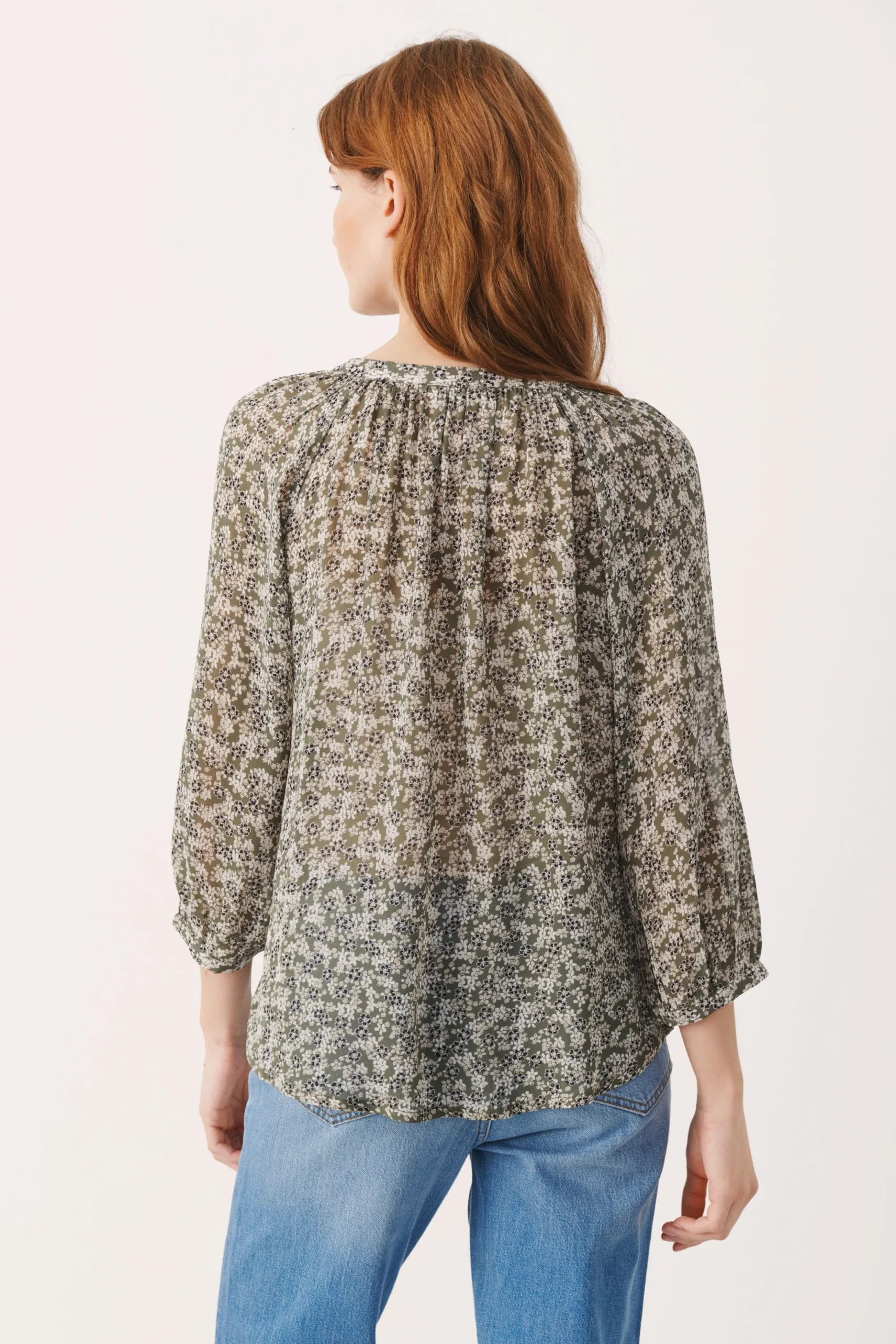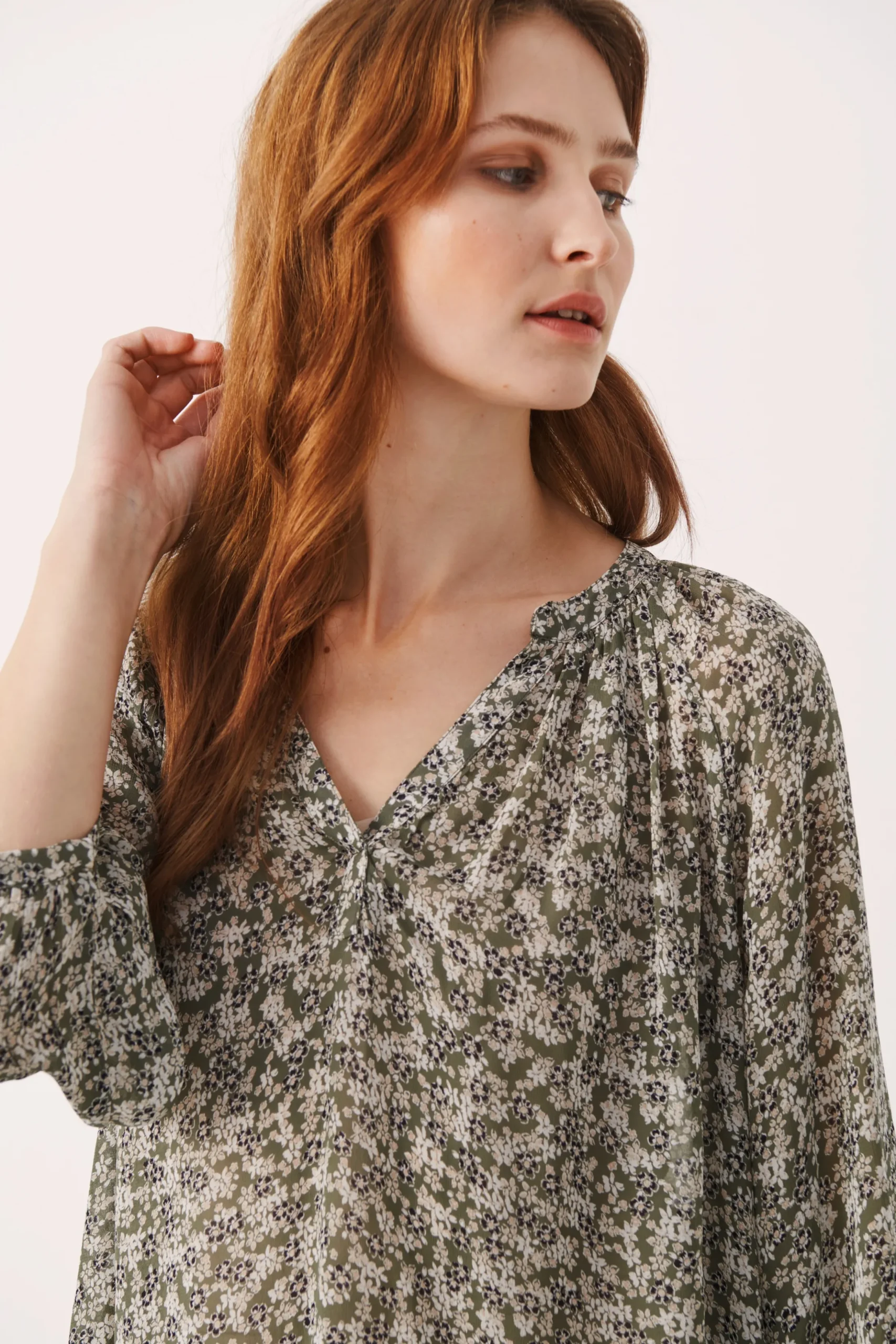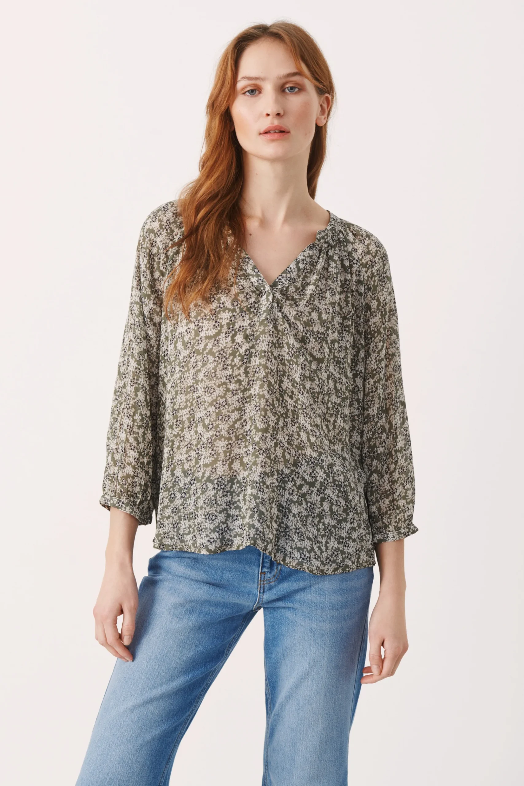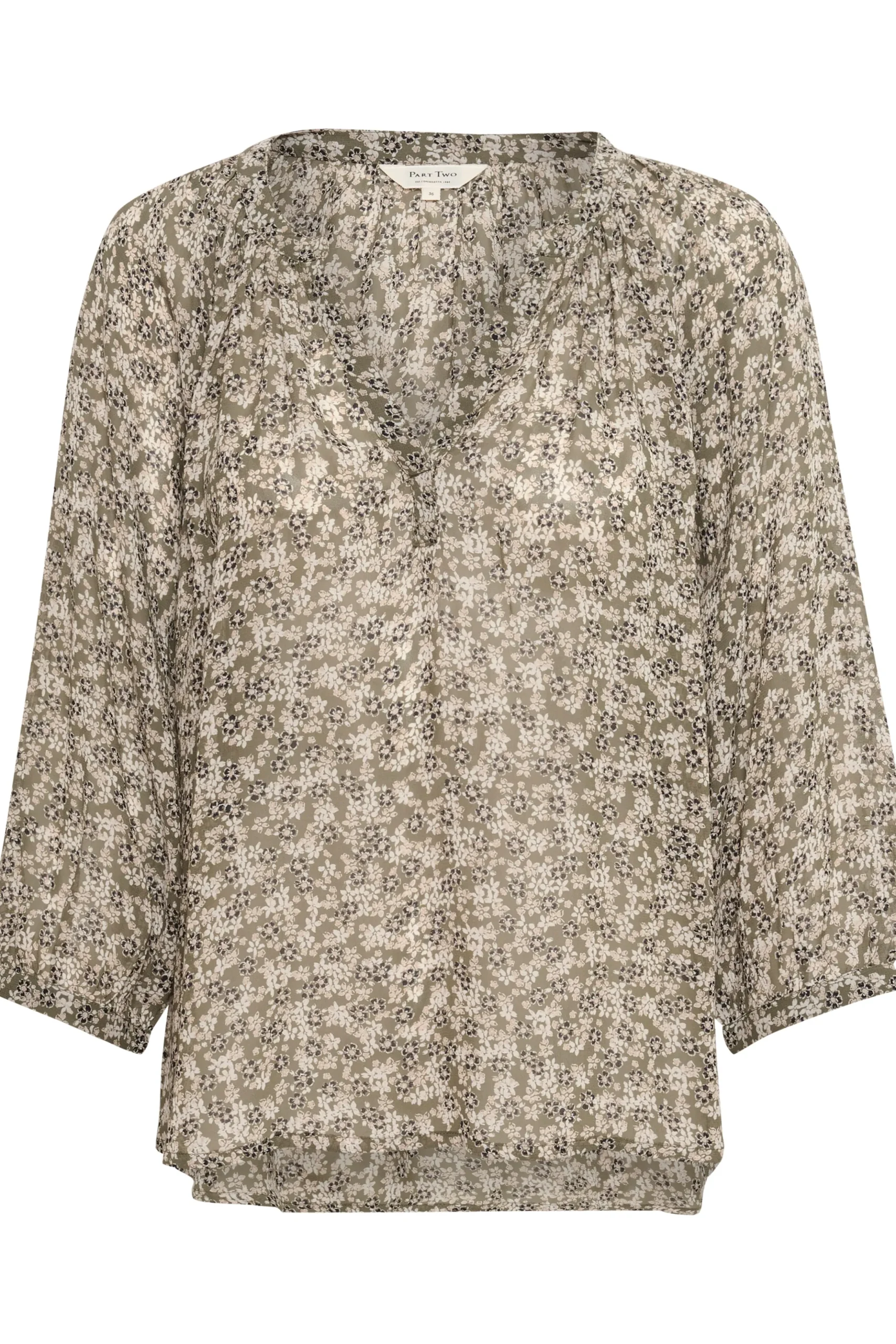 Bluse fra PART TWO med rund hals og V-udskæring. 3/4-ærmer. All-over print. Vævet kvalitet. Blusen fra PART TWO har løstsiddende pasform.