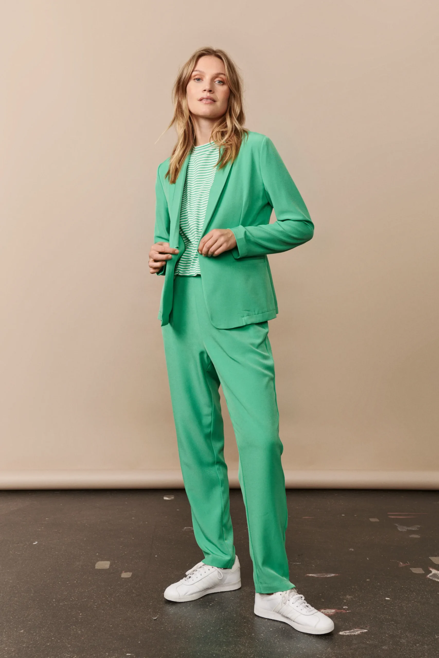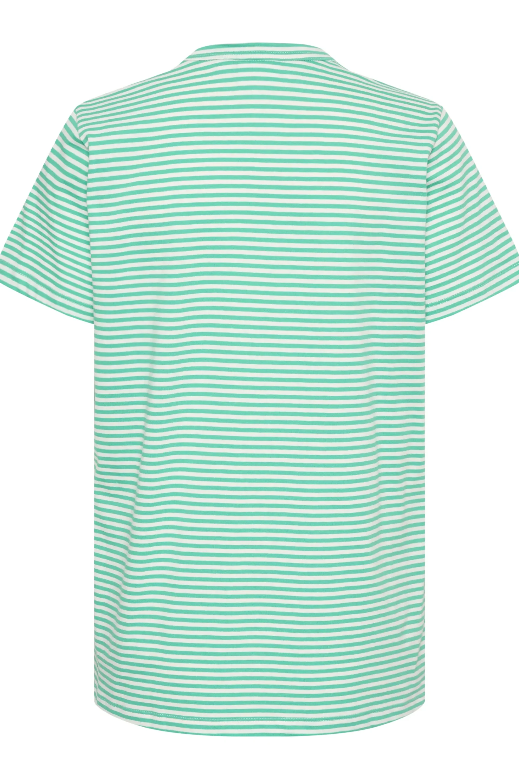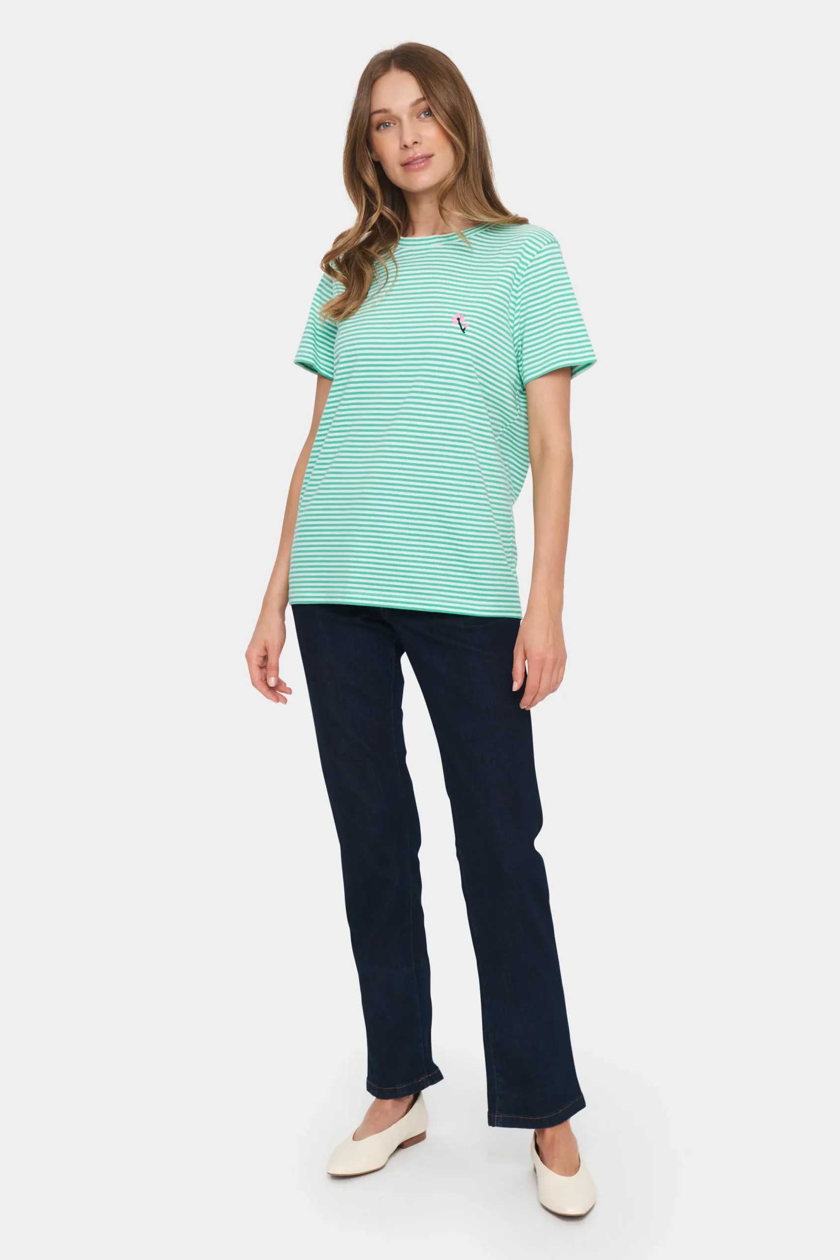 Grøn- og hvidstribet t-shirt med rund hals, afslappet pasform med korte ærmer samt lille broderet blomst på brystet. \\nModellen er 176 cm høj og iført størrelse M