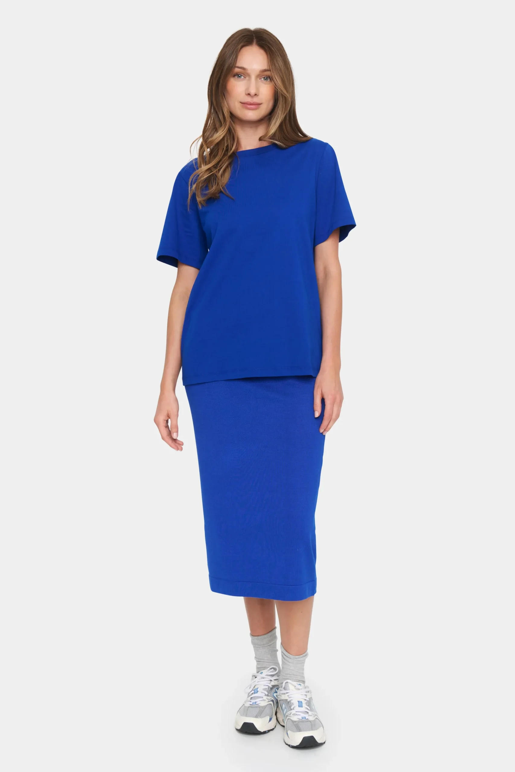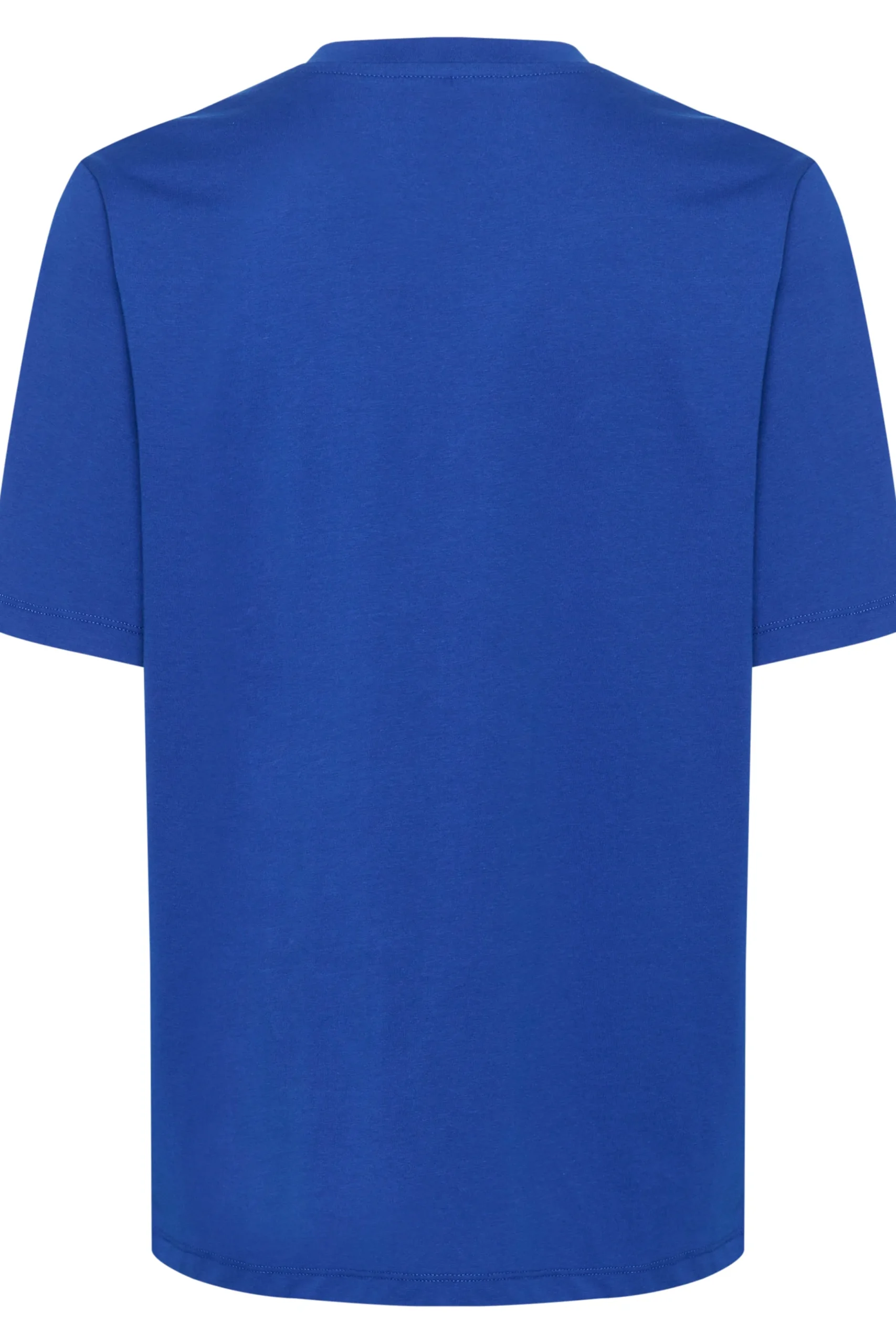 Blå tidløs t-shirt med rundhals, korte ærmer samt i afslappet pasform. \\n\\nModellen er 176 cm høj og iført størrelse M