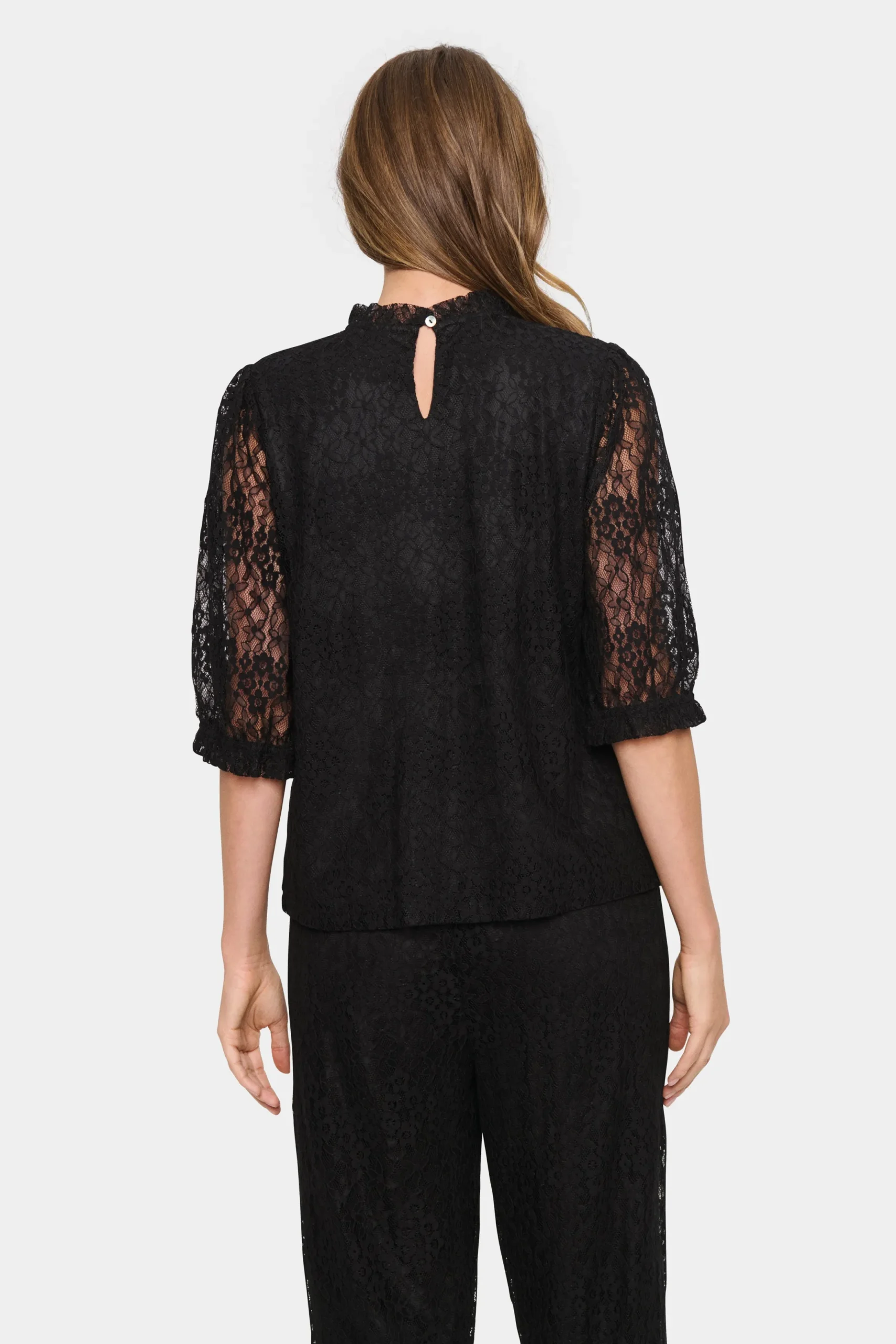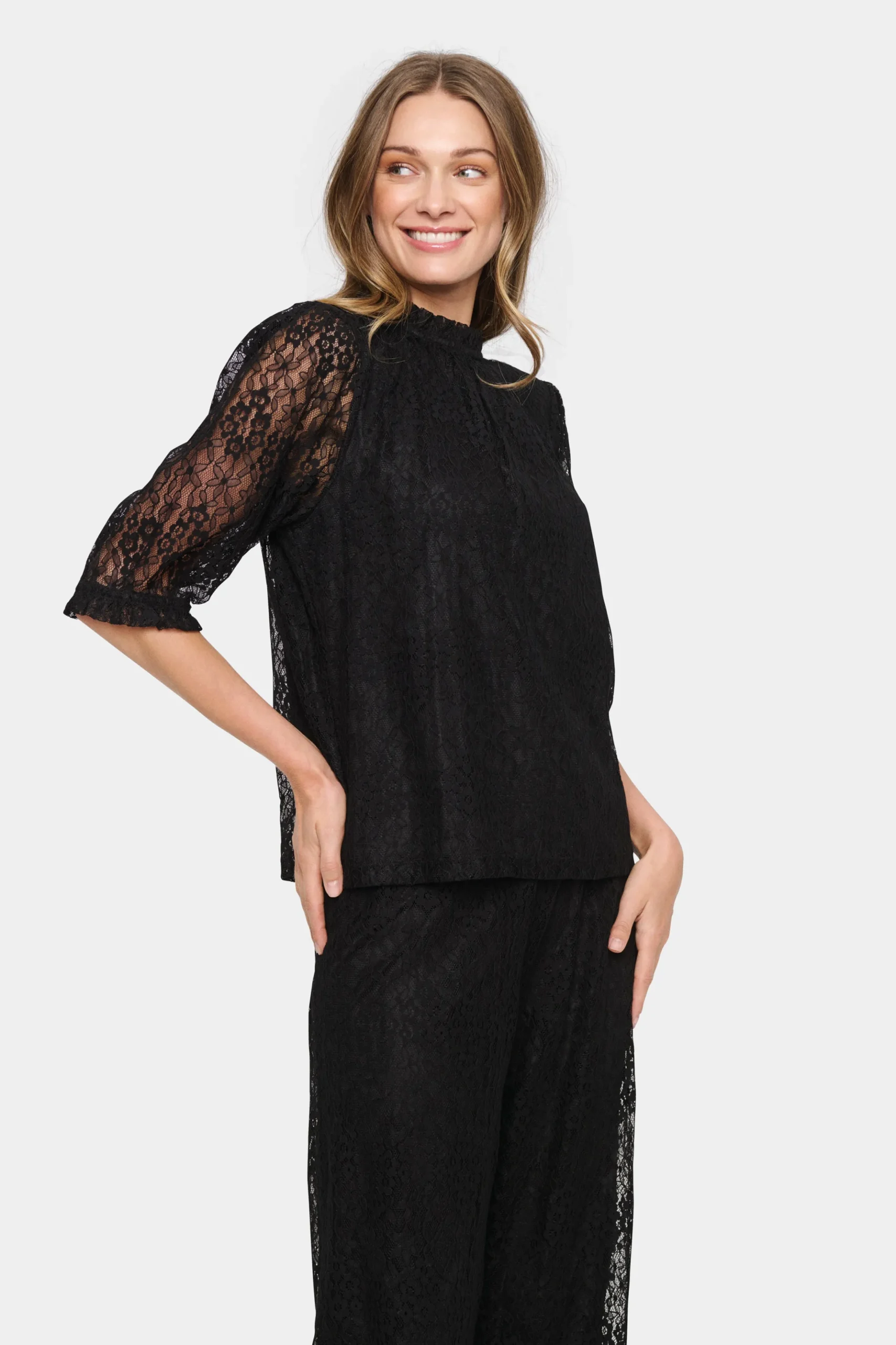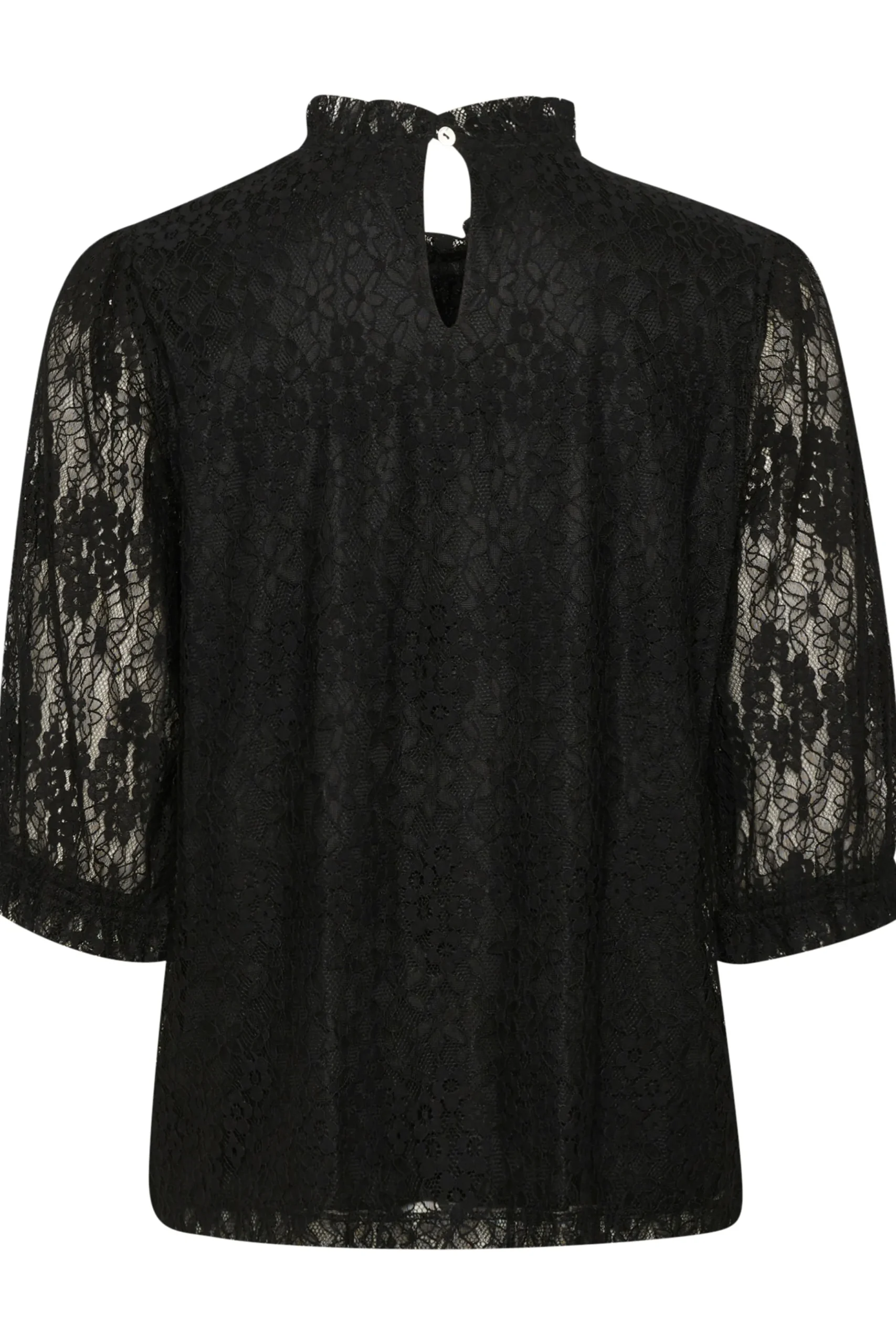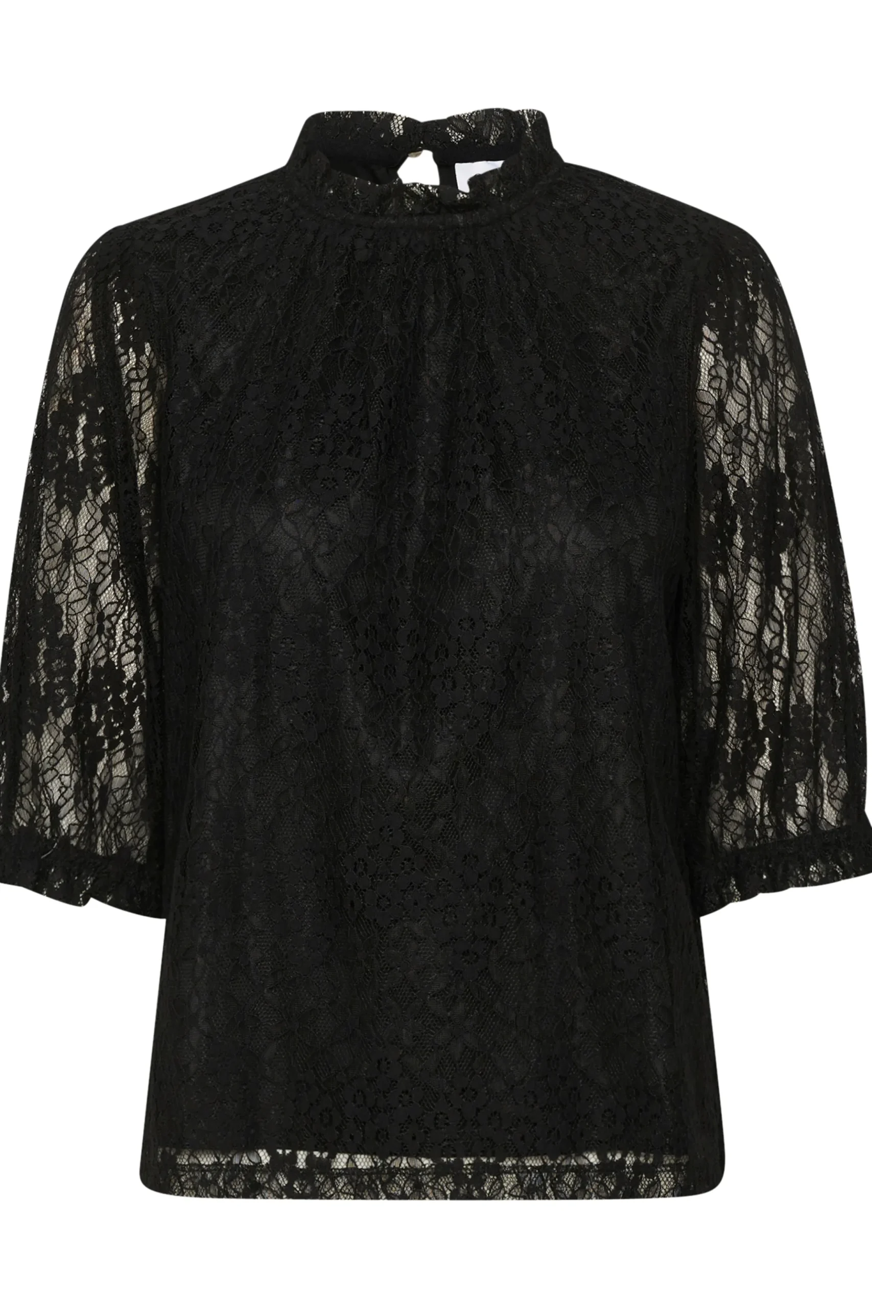 Elegant, sort bluse med fine blondesærmer og en diskret høj halsudskæring, der tilføjer et strejf af sofistikering til ethvert outfit.