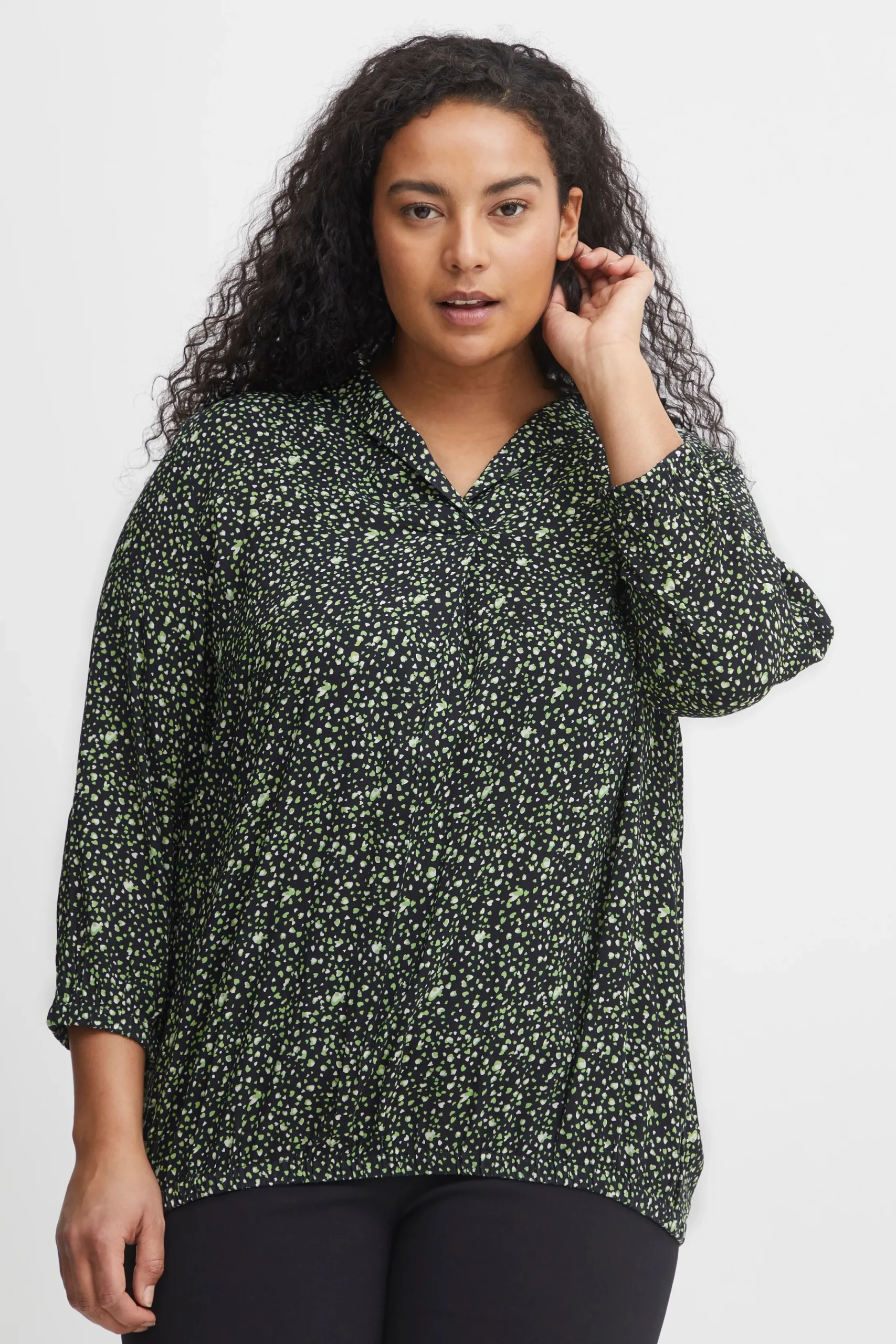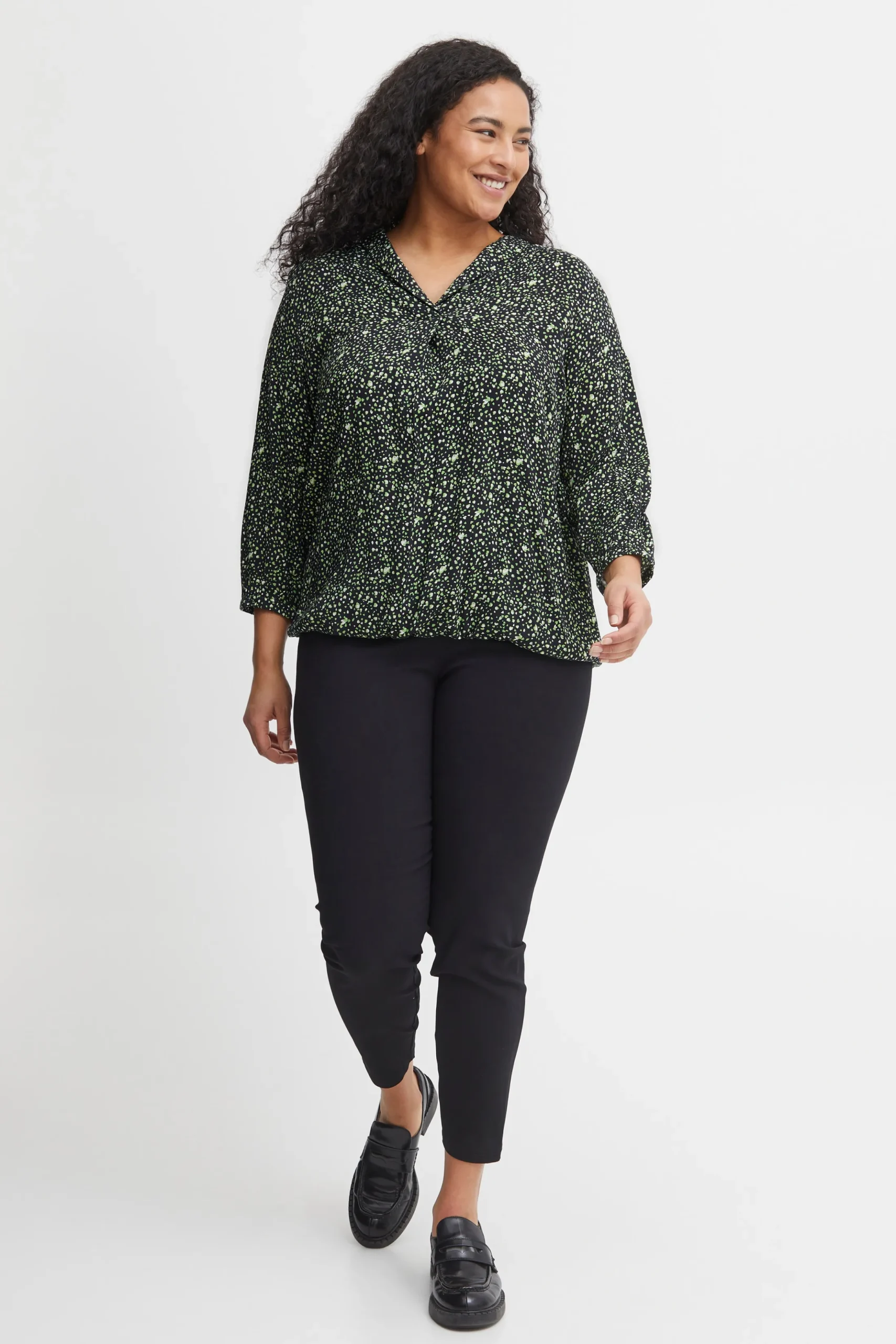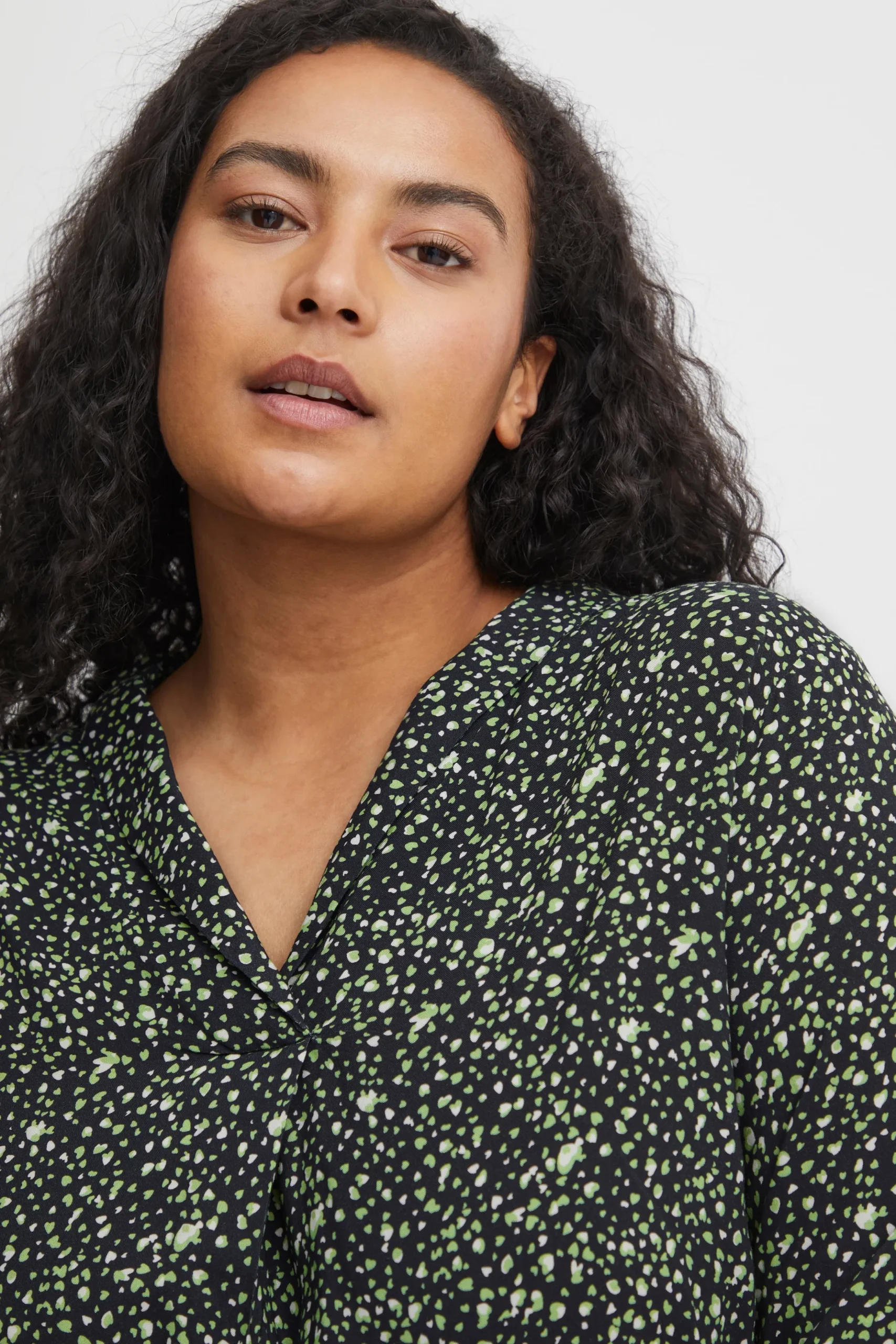 Bluse fra Fransa plus size selection med V-hals. 3/4-ærmer. Elastik i ærmer og forneden. All-over print. Vævet kvalitet. Normal pasform.