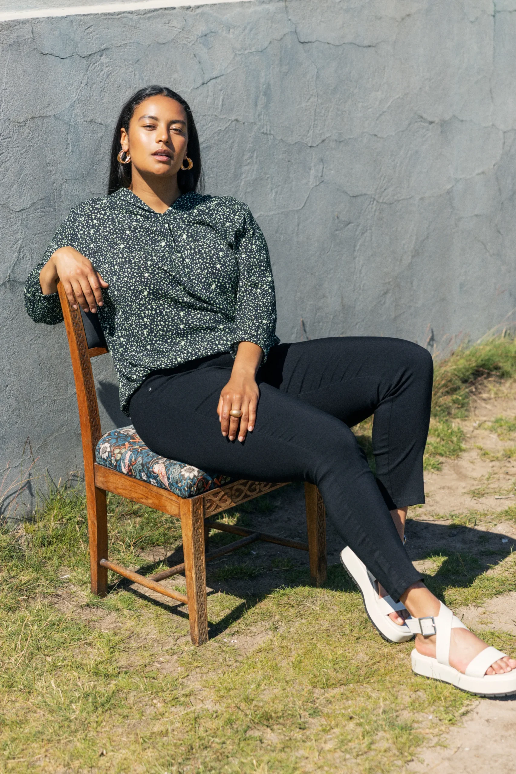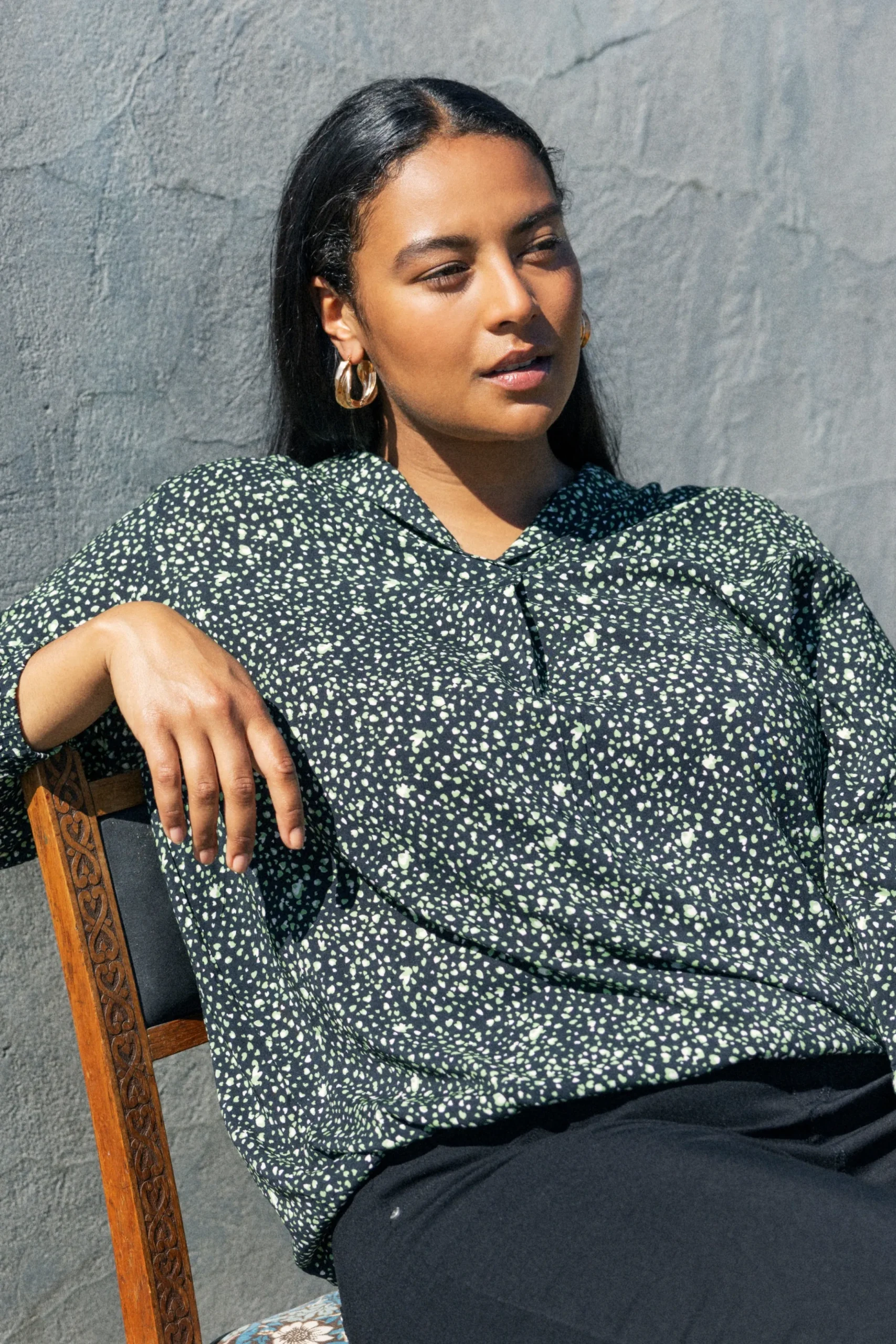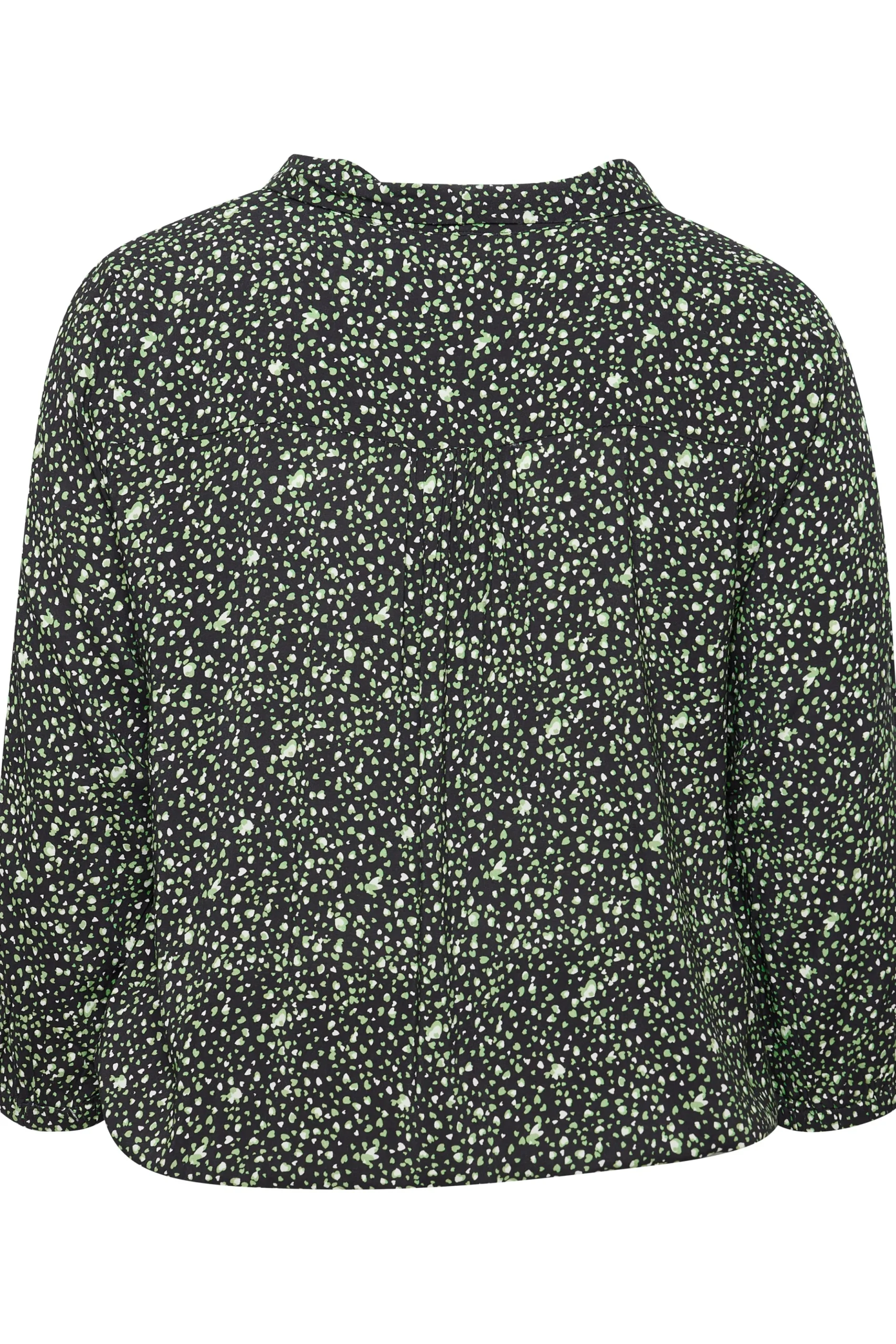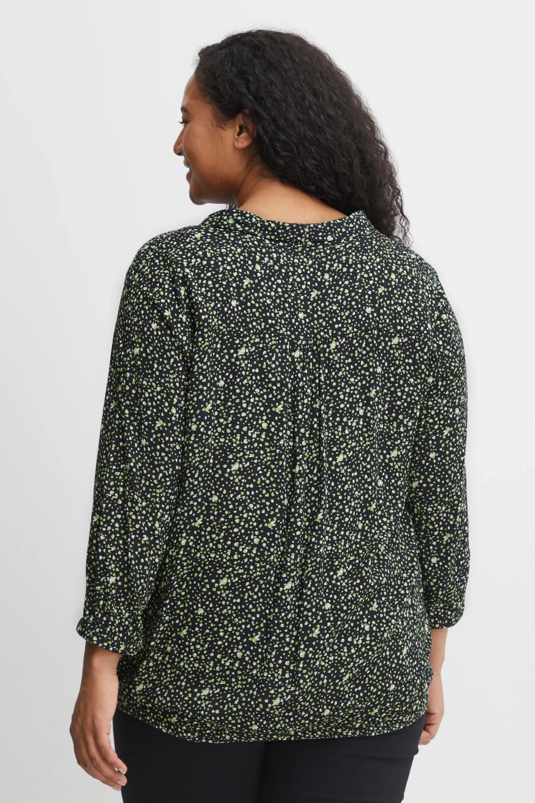 Bluse fra Fransa plus size selection med V-hals. 3/4-ærmer. Elastik i ærmer og forneden. All-over print. Vævet kvalitet. Normal pasform.