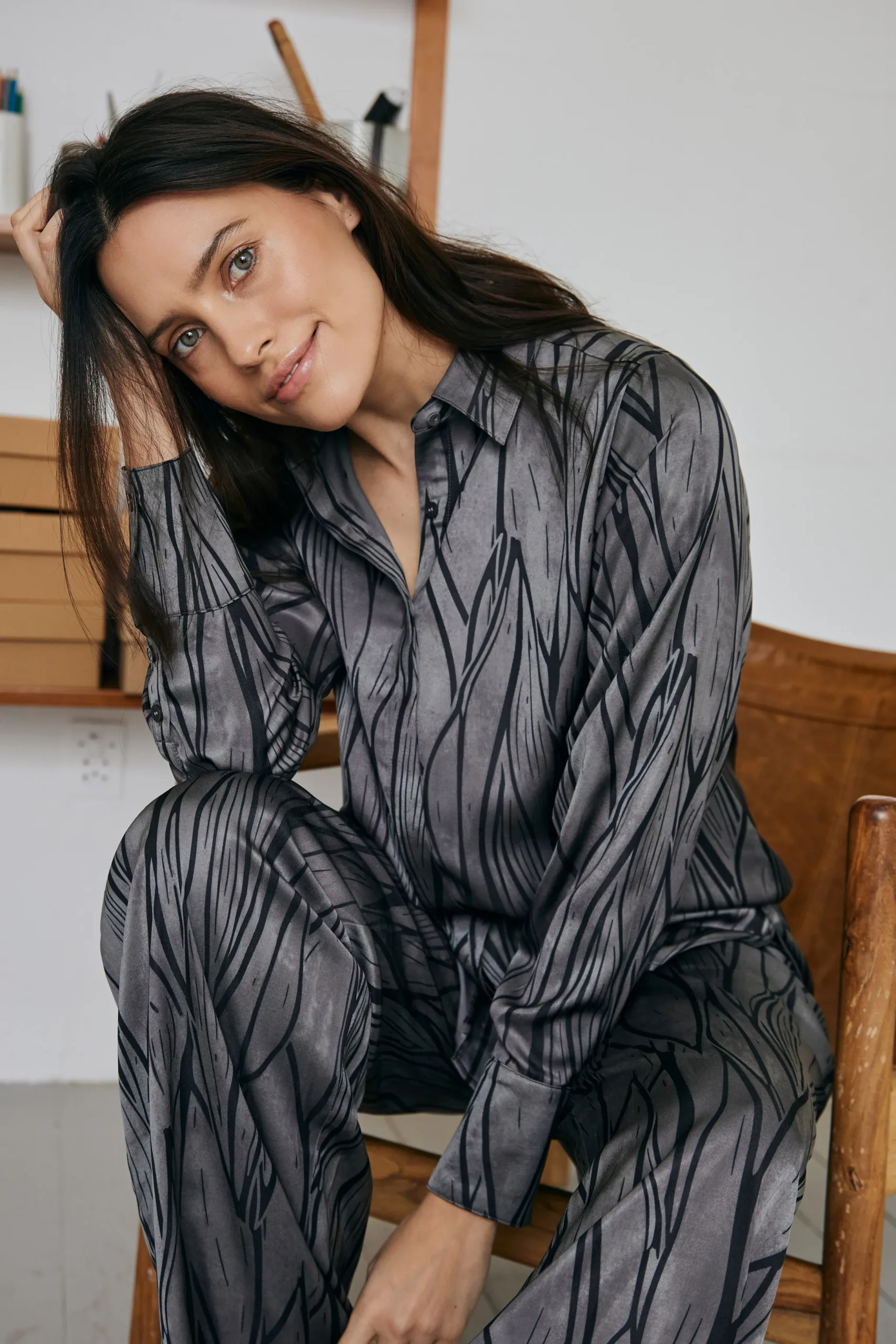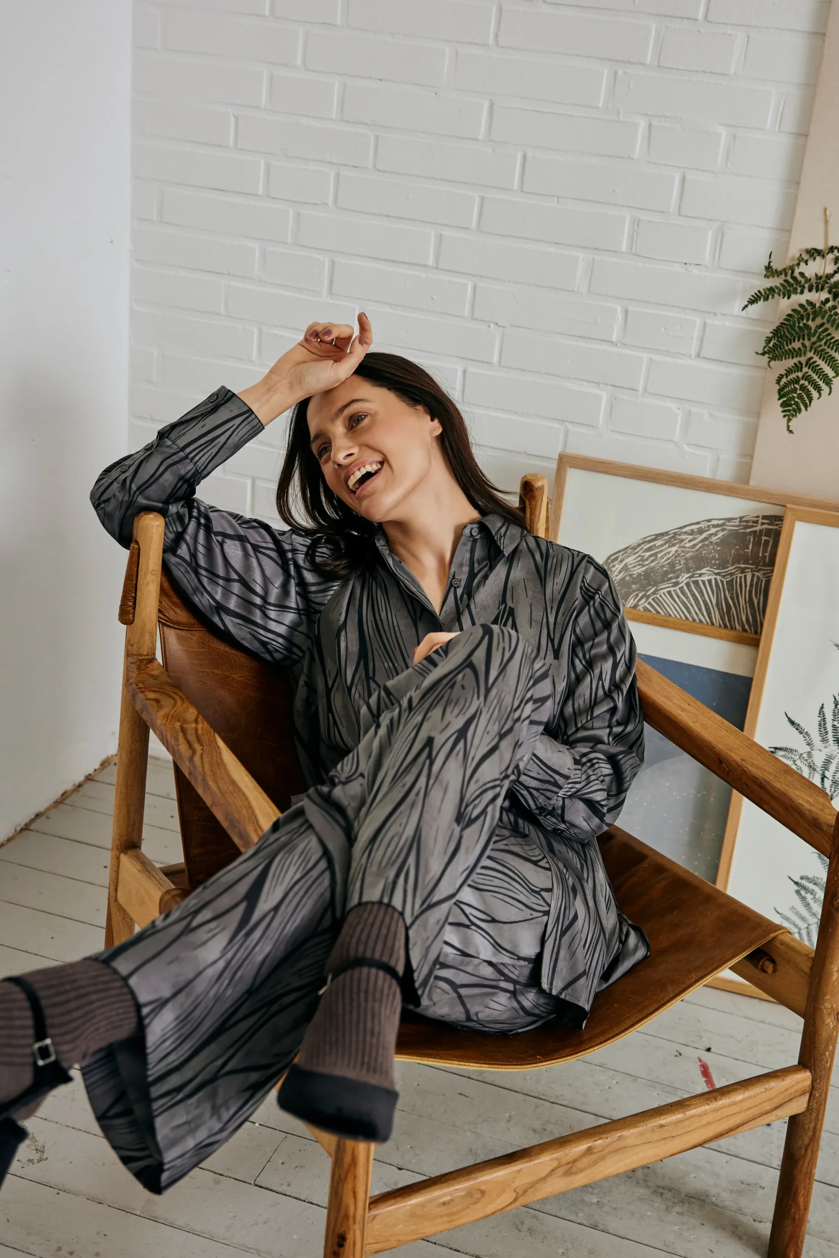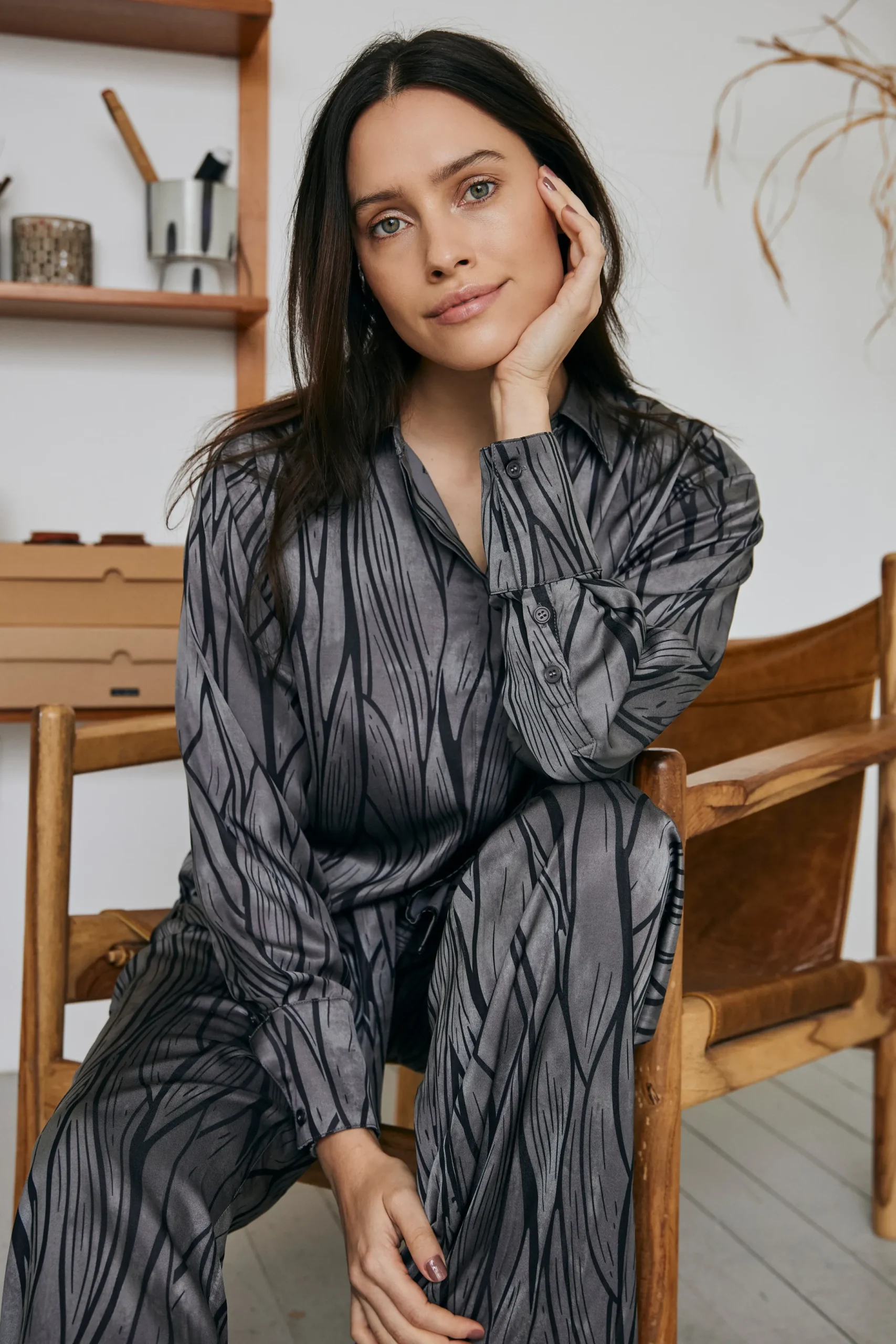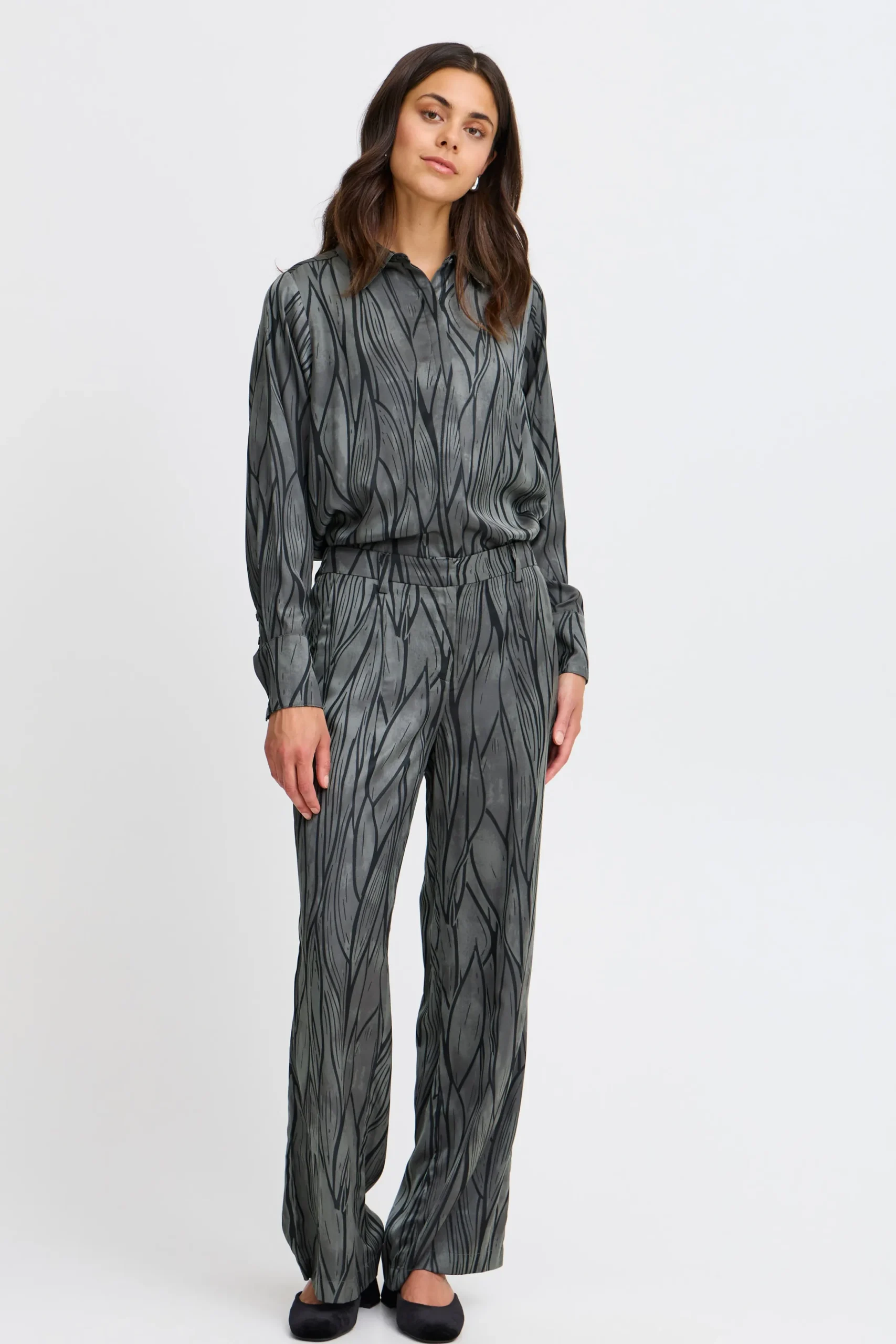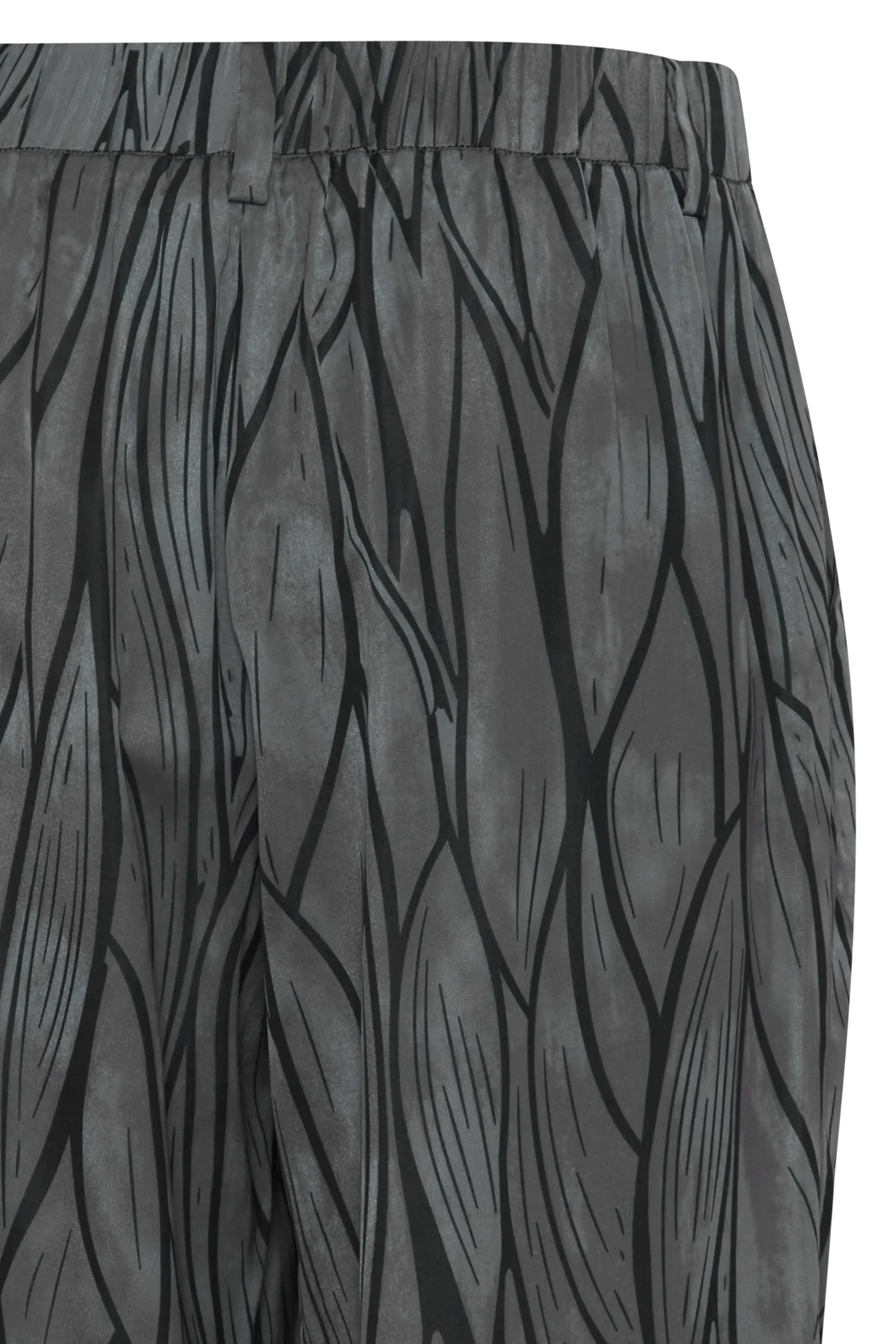 Modellen er 178 cm høj og bruger str. S/36.\\n\\nDisse afslappede bukser med fuld længde i vævet kvalitet er ideelle til hverdagsbrug, med et design, der skaber en afslappet pasform. Materialet får bukserne til at føles let og behagelige, perfekt til enhver begivenhed. Bukserne giver dig et simpelt, men stilfuldt udseende. Det smukke og unikke print er lavet i samarbejde med kunstneren Karin Harboe.