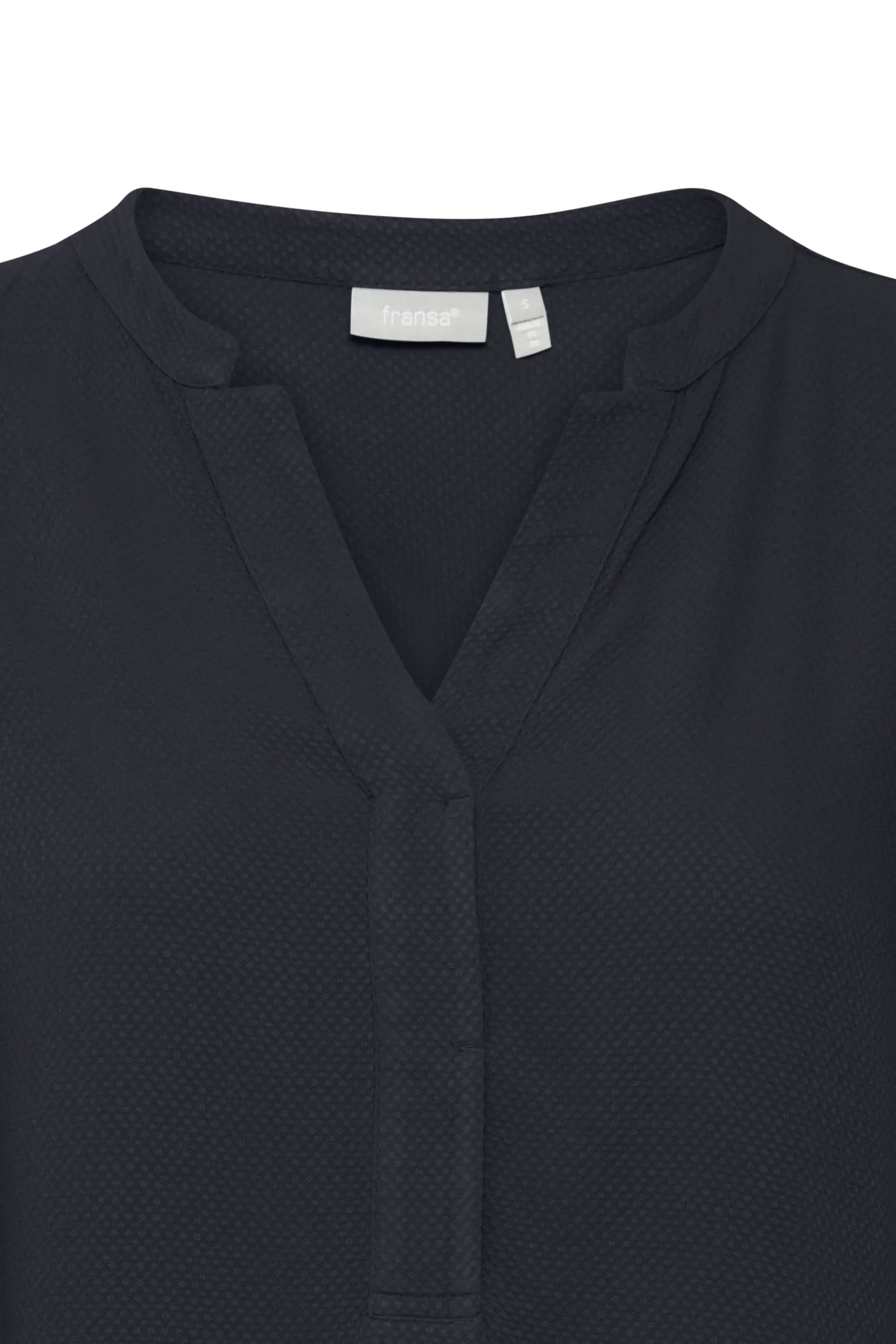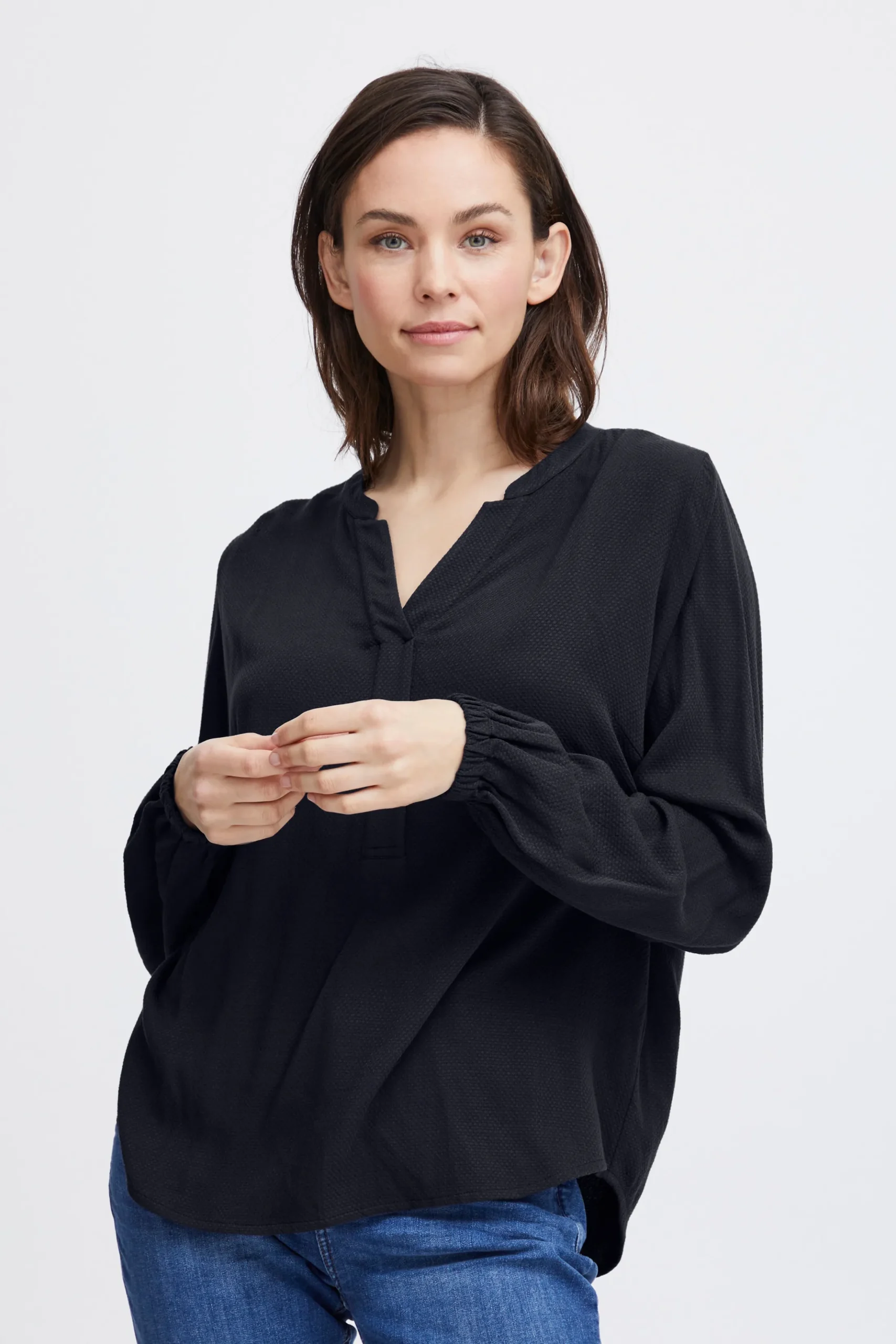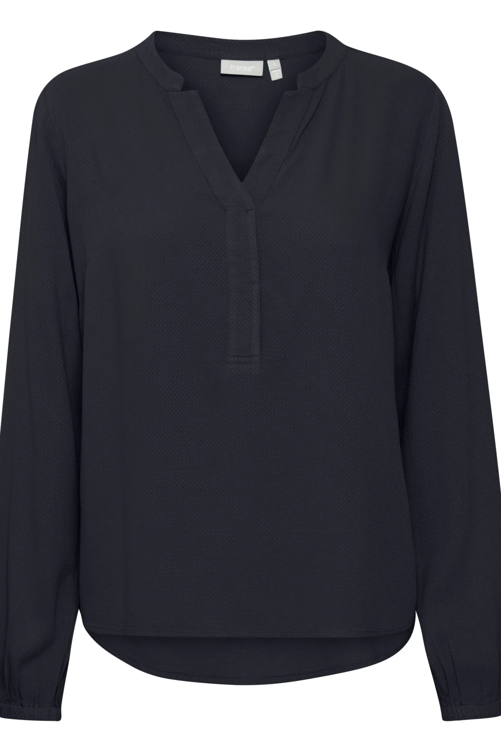 Bluse fra Fransa med rund hals og V-udskæring. Lange ærmer med elastikkant. Stolpe foran. Strukturvævet kvalitet. Normal pasform.