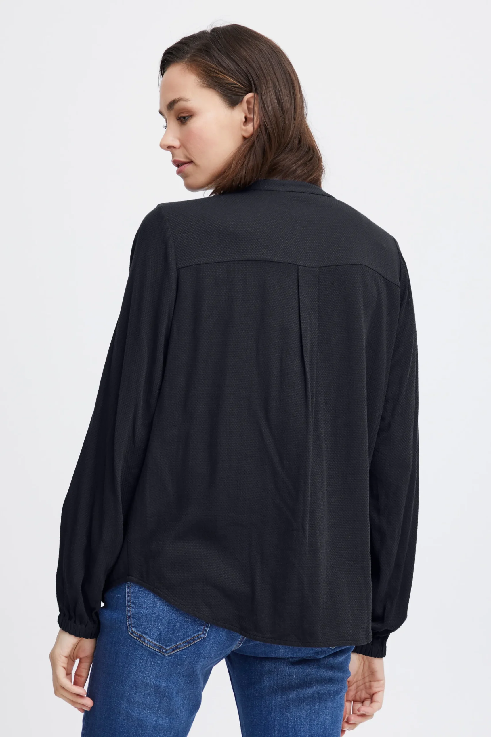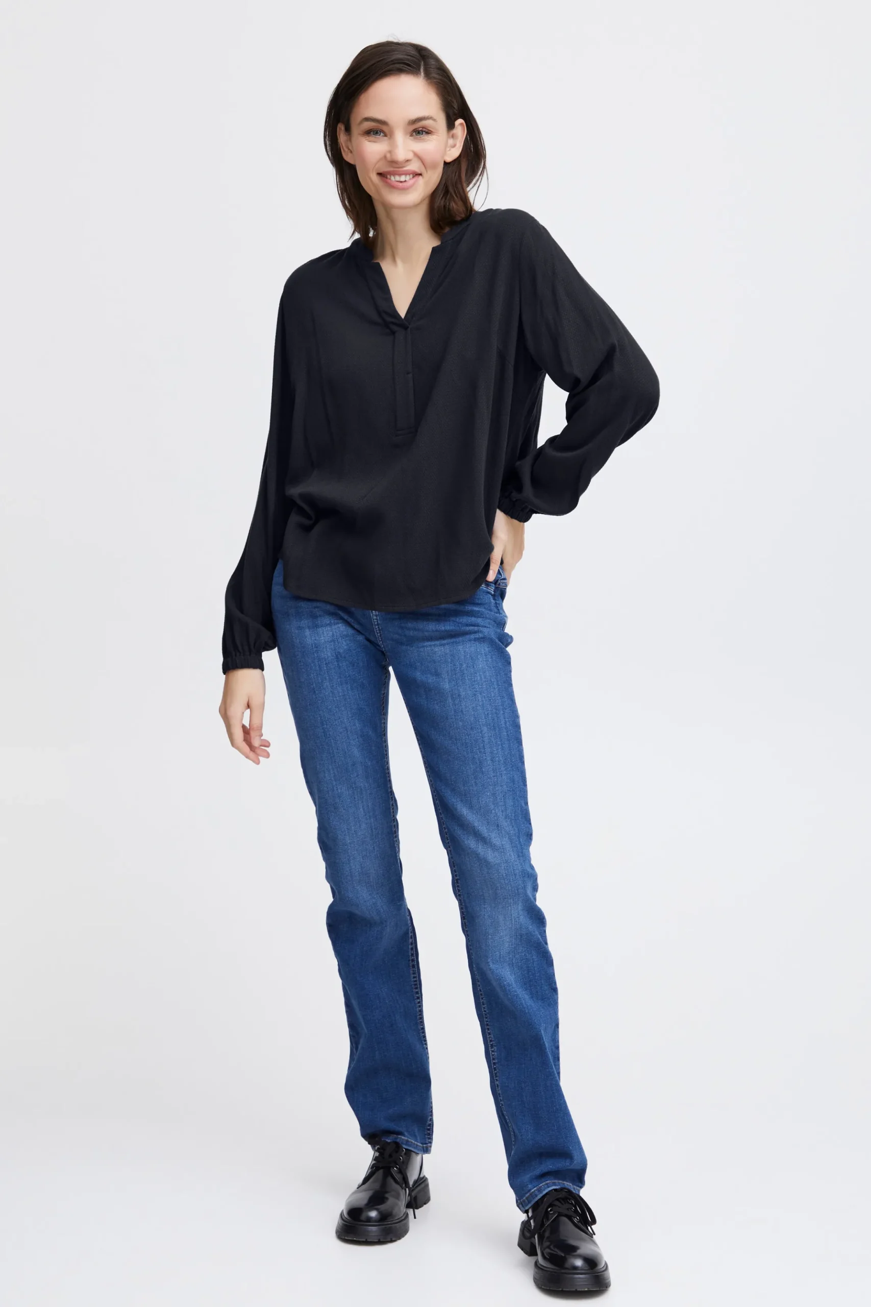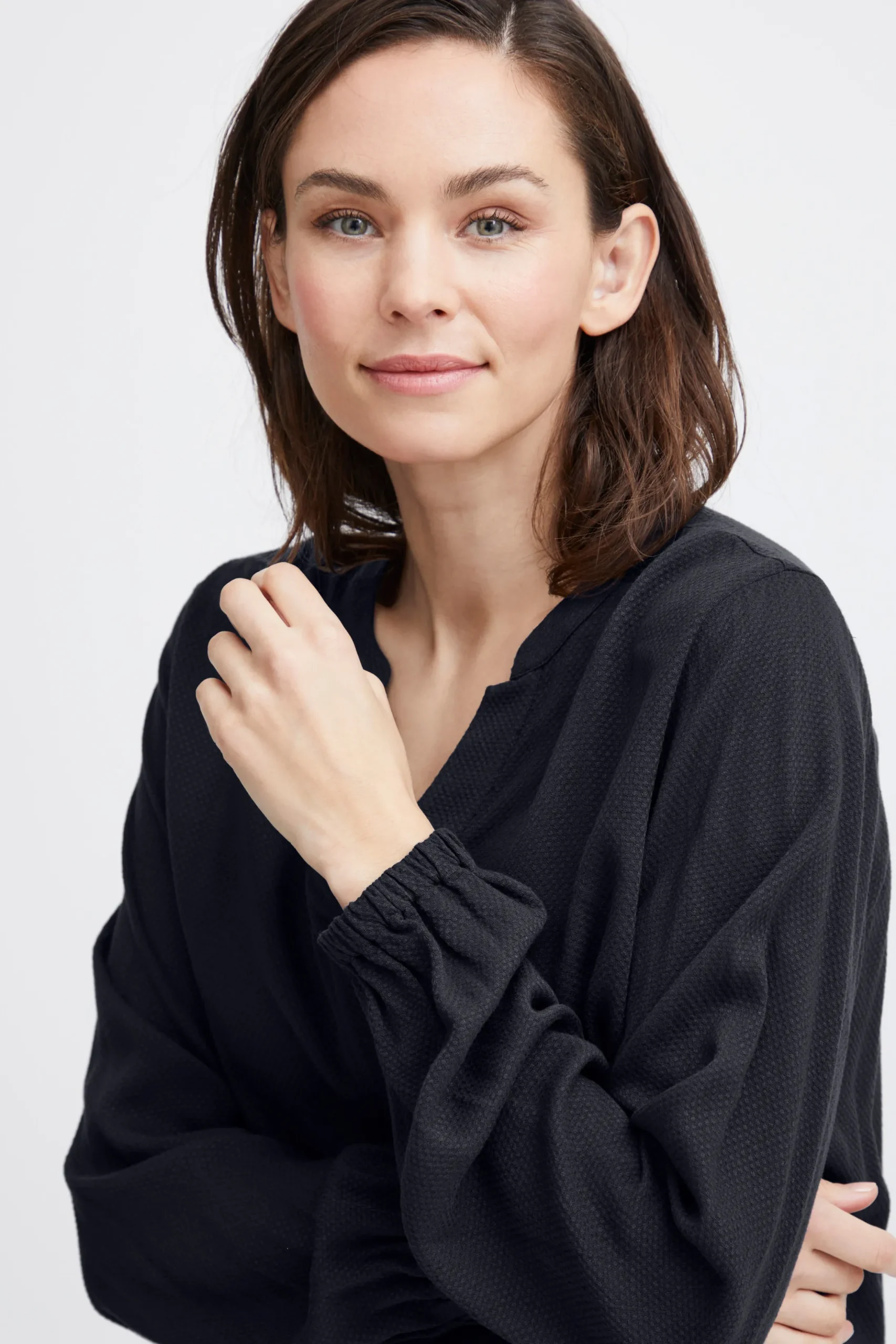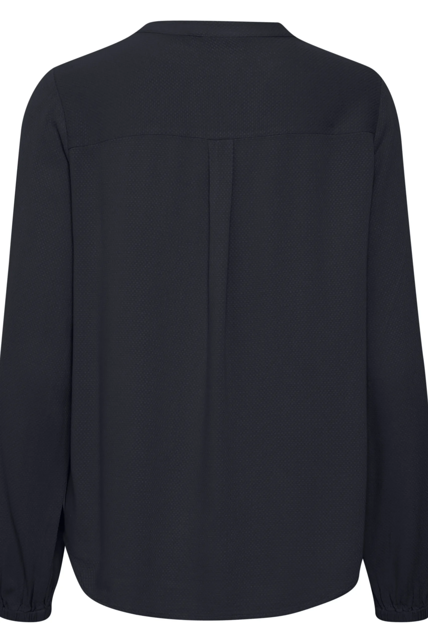 Bluse fra Fransa med rund hals og V-udskæring. Lange ærmer med elastikkant. Stolpe foran. Strukturvævet kvalitet. Normal pasform.