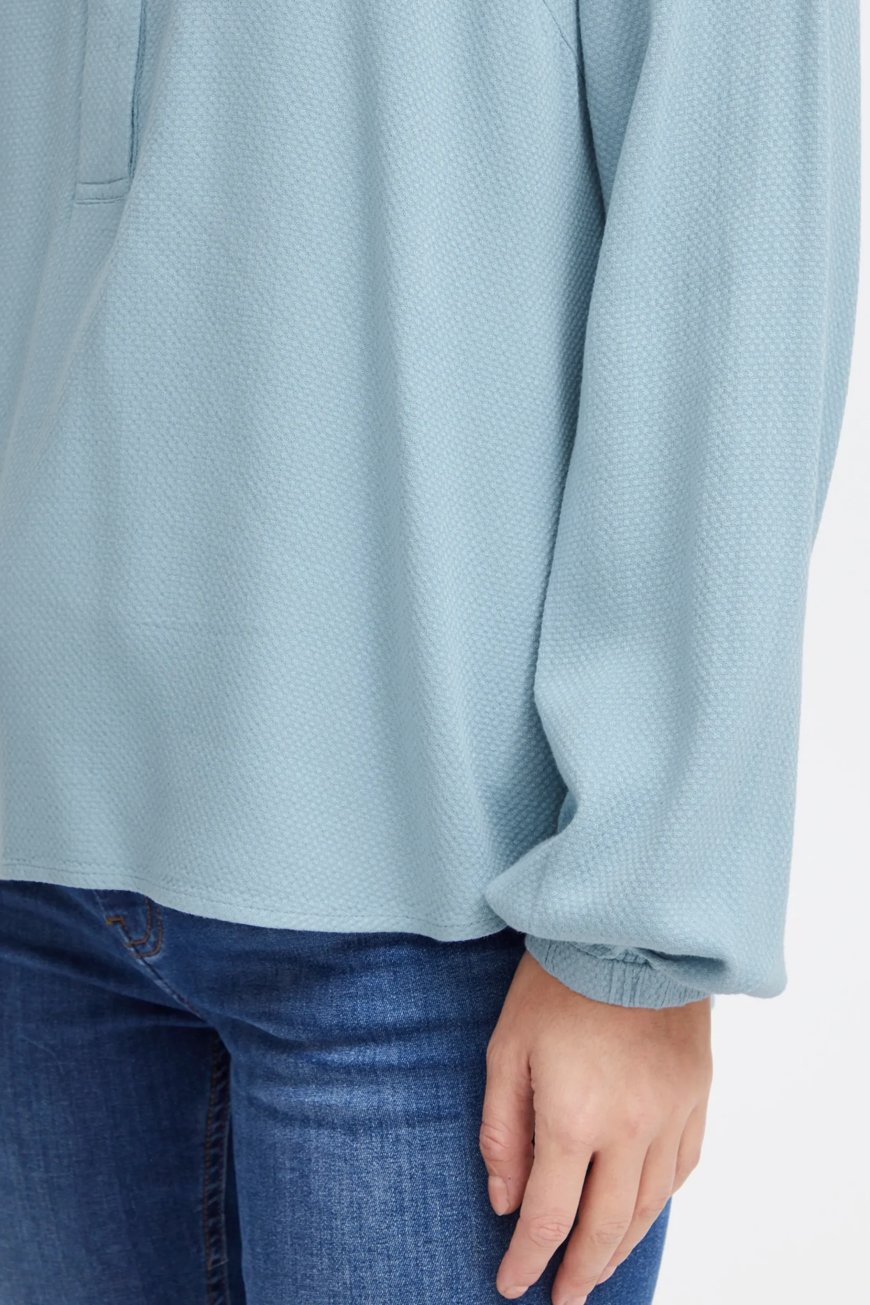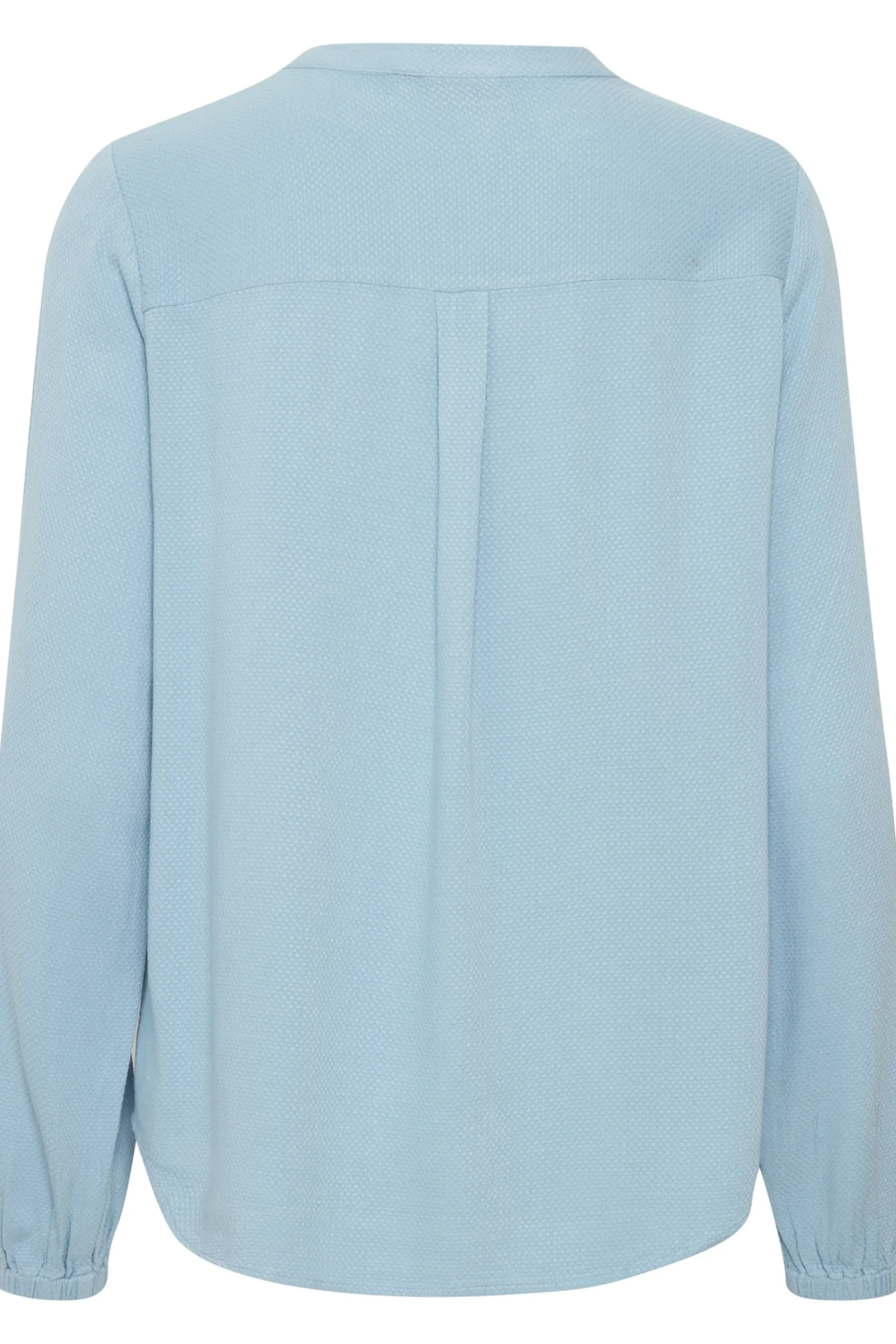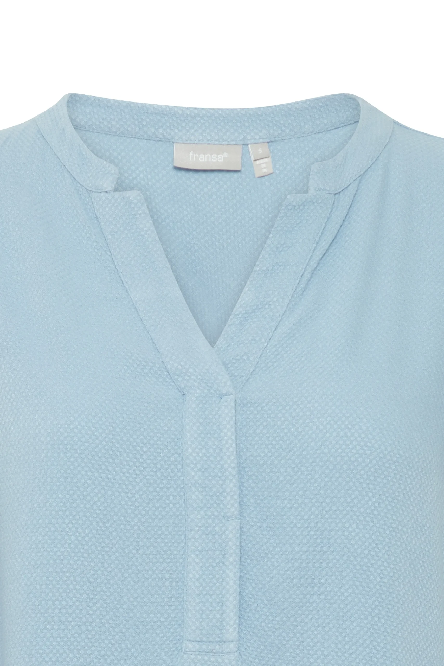 Bluse fra Fransa med rund hals og V-udskæring. Lange ærmer med elastikkant. Stolpe foran. Strukturvævet kvalitet. Normal pasform.
