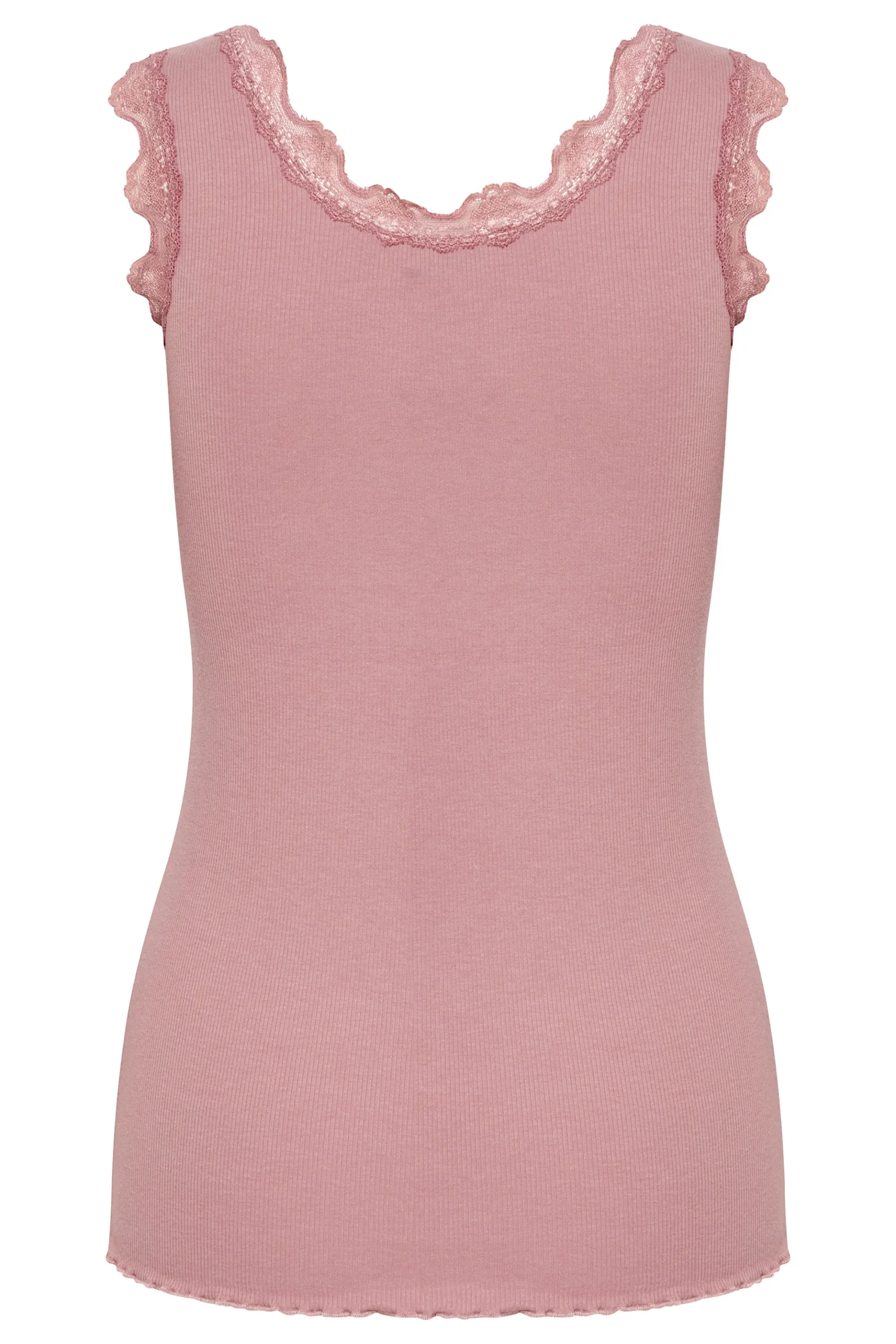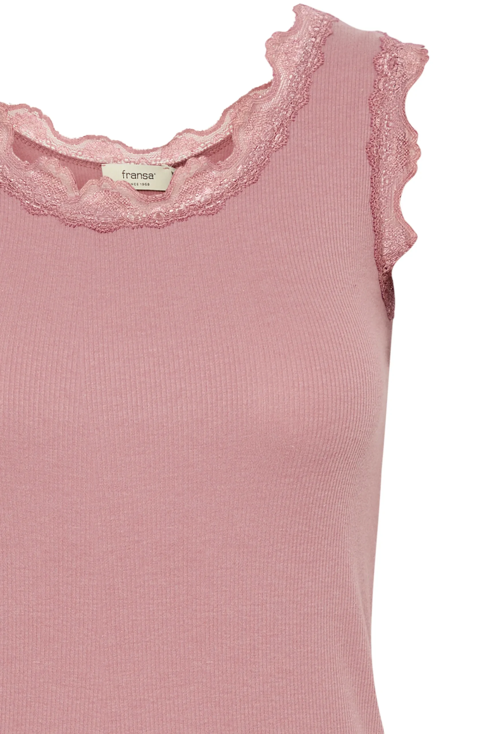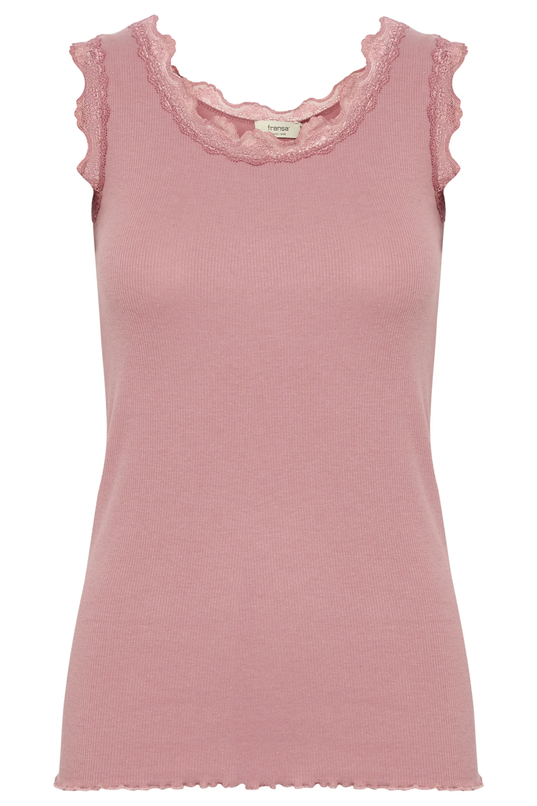 Top fra Fransa med rund hals. Blondebånd i hals og ærmegab. Jerseykvalitet. Tætsiddende pasform.