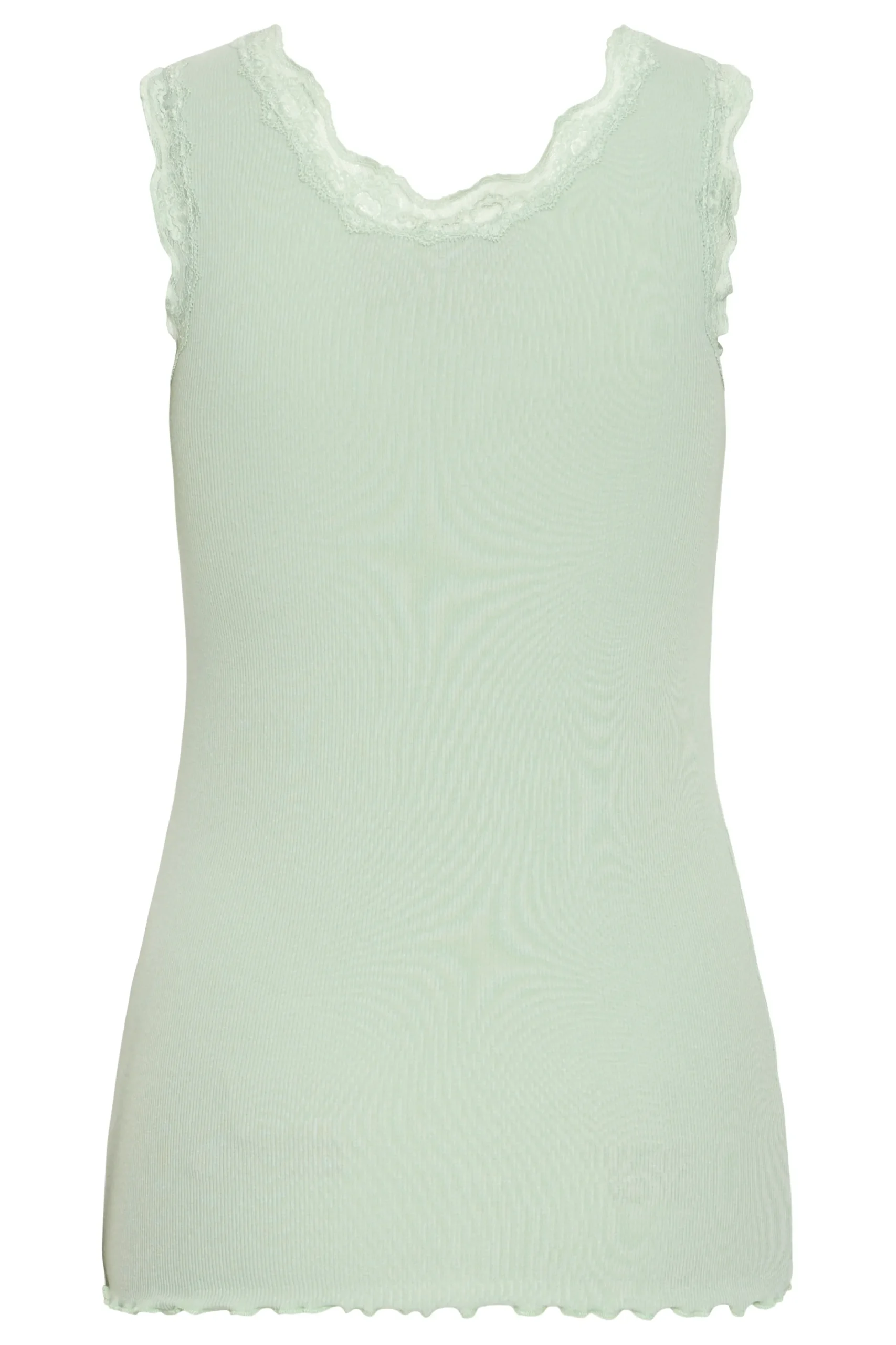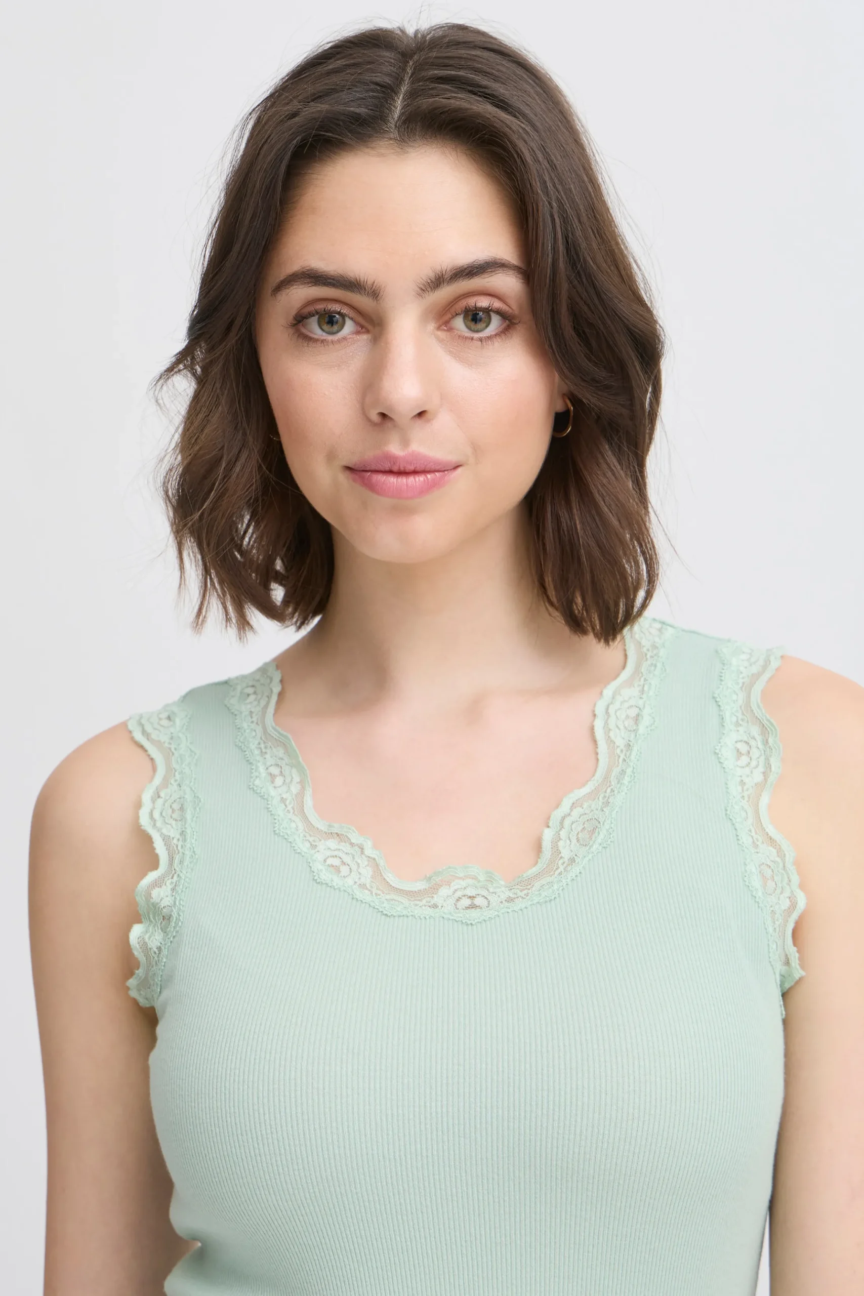 Top fra Fransa med rund hals. Blondebånd i hals og ærmegab. Jerseykvalitet. Tætsiddende pasform.