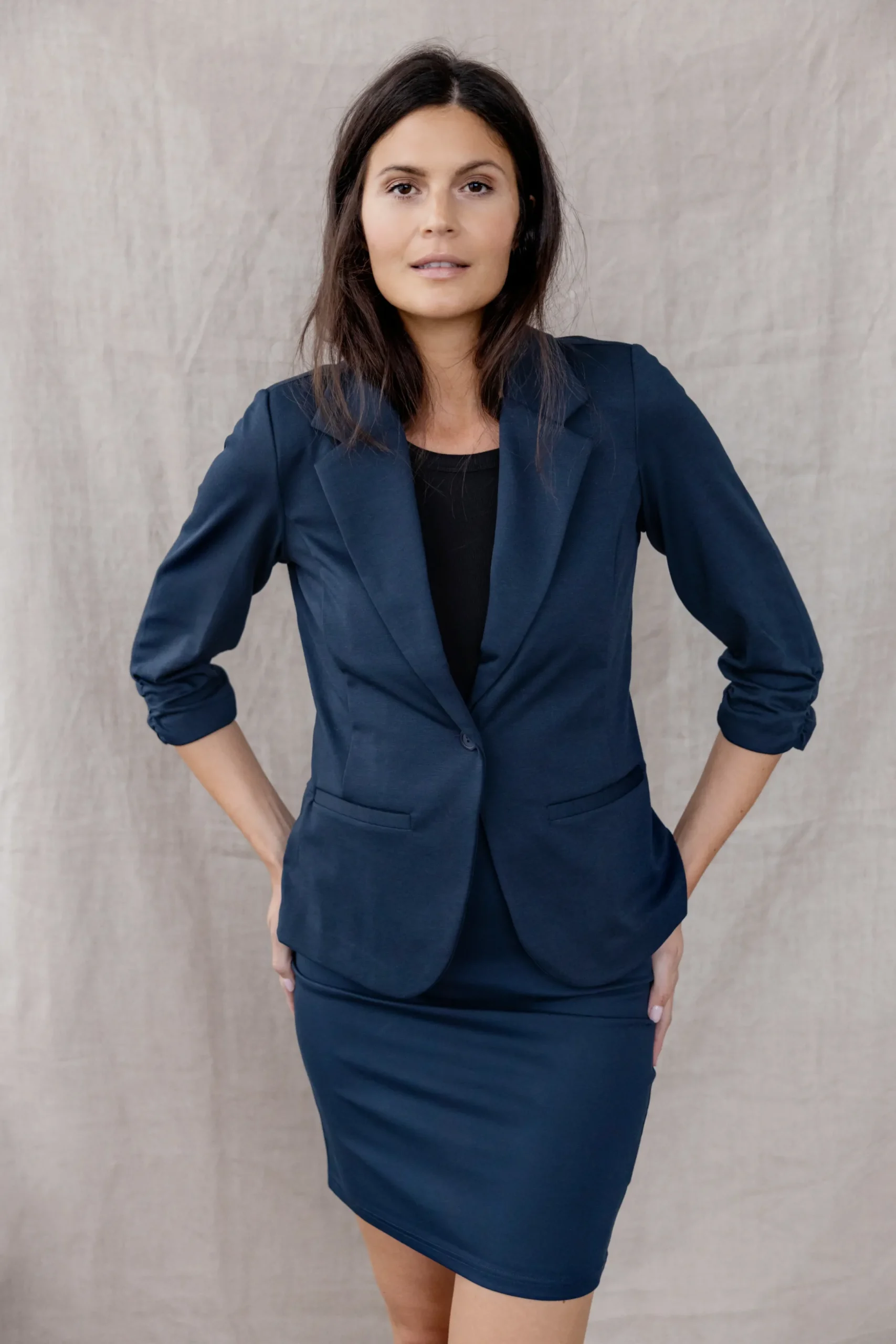 Blazer fra Fransa med 3/4 ærmer og revers. Normal pasform og stiklommer foran. Revers og enkel knaplukning foran. Fint alternativ til dine cardigans – brug den til jeans, nederdel eller et par løse bukser.