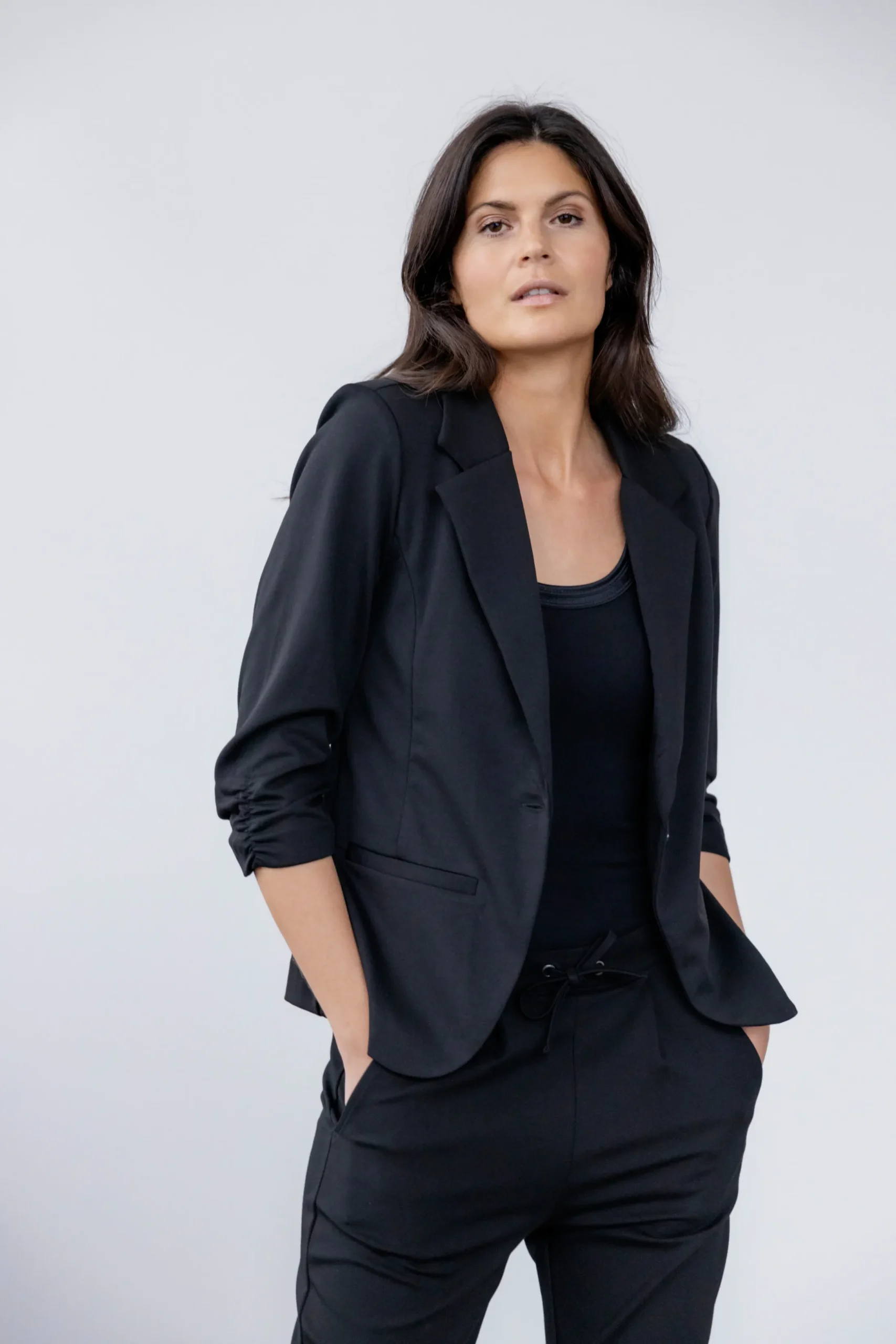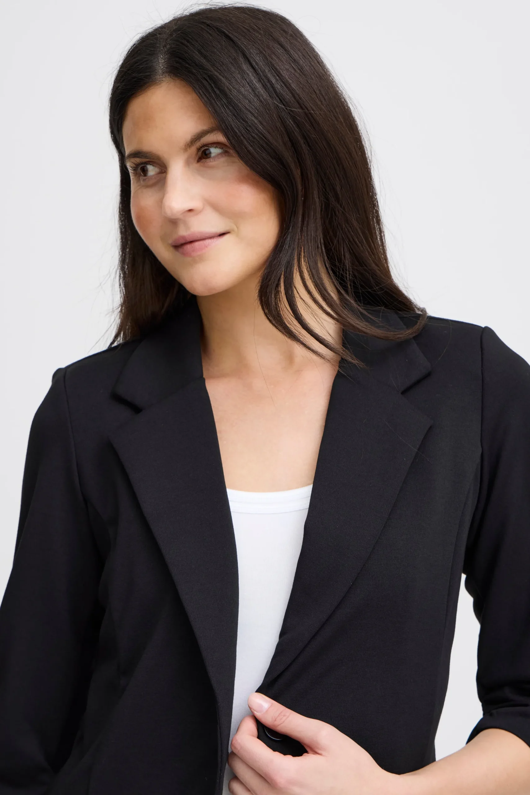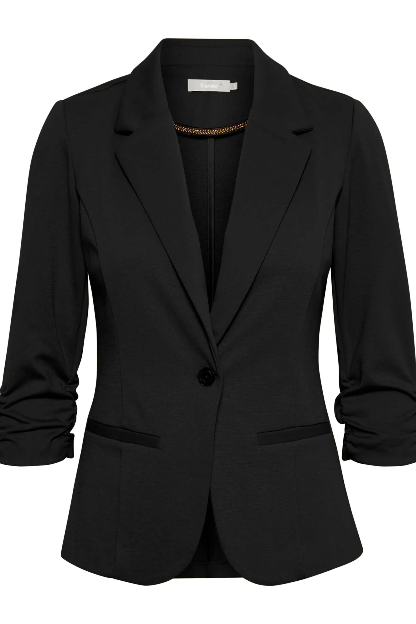 Blazer fra Fransa med 3/4 ærmer og revers. Normal pasform og stiklommer foran. Revers og enkel knaplukning foran. Fint alternativ til dine cardigans – brug den til jeans, nederdel eller et par løse bukser.